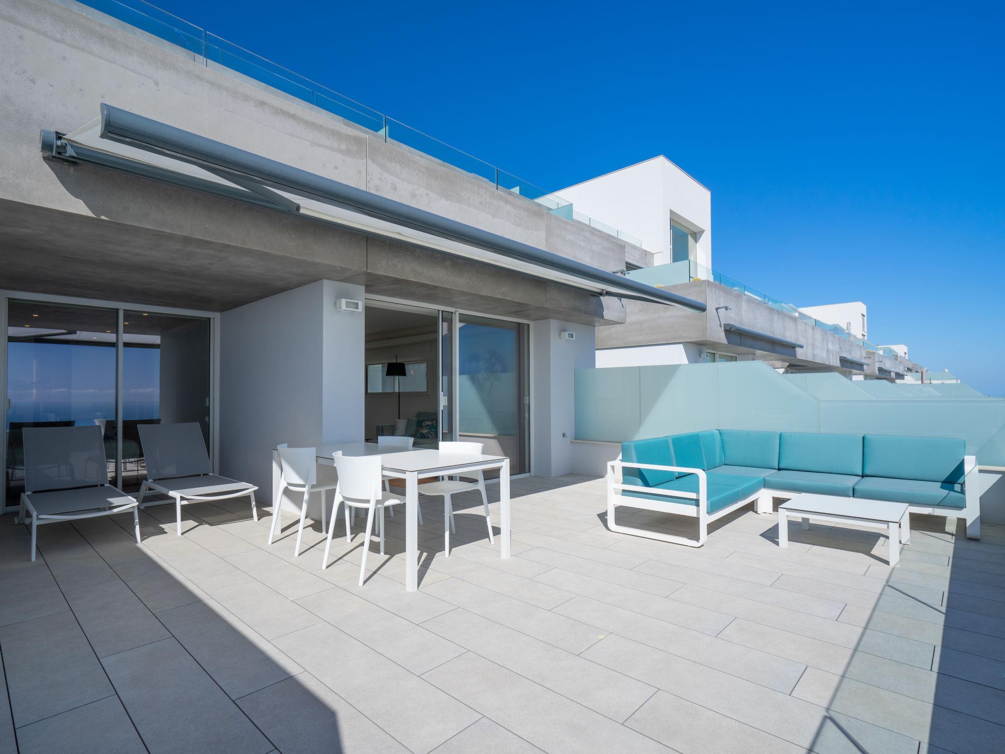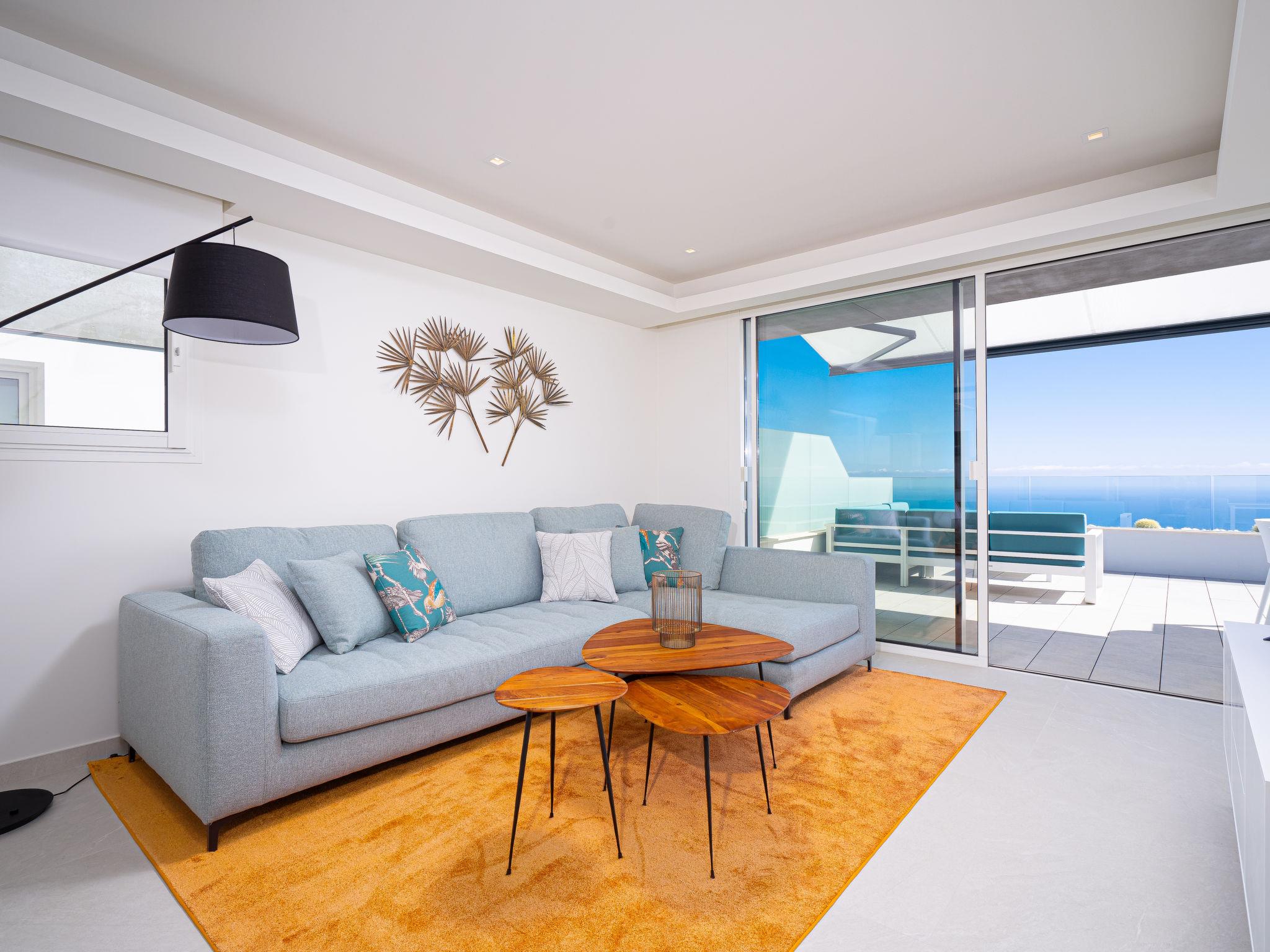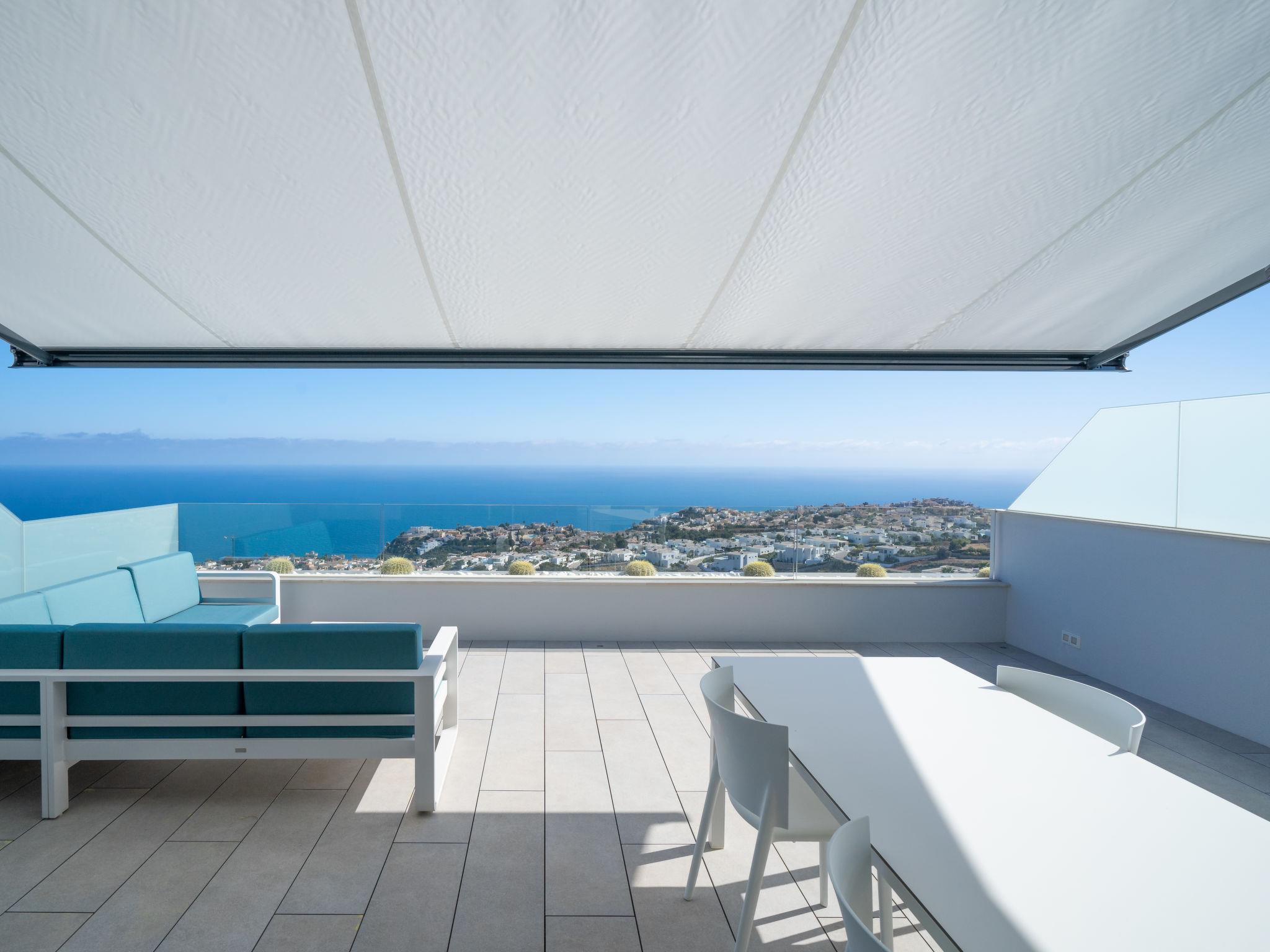 Cumbre del Sol: Very modern, beautiful apartment block "Blue Infinity 1", built in 2021. In the resort 6 km from the centre of Moraira, in a sunny, elevated position on top of a hill, traffic calmed area, 2 km from the sea, 2 km from the beach. For shared use: property (fenced), swimming pool (seasonal availability: 01.Jan. - 31.Dec.) with internal staircase. Shower/WC in the pool area, terrace. In the house: sauna, fitness room, solarium, hamam, lift. Grocery 2 km, supermarket 2 km, bus stop "Benitachell" 4.8 km, railway station "Teulada" 8.4 km, ferry "Denia" 23.7 km, sandy beach "Playa de la Ampolla" 6 km, rocky beach "Cala Moraig" 2 km. Sports harbour 6 km, marina 6 km, golf course (18 hole) 9 km. Nearby attractions: Aqualandia, Mundomar, Terra Mítica, Terra Natura, Benidorm Palace (Benidorm), Les Fonts de l'Algar, Castillo de Guadalest. The owner does not accept any youth groups.