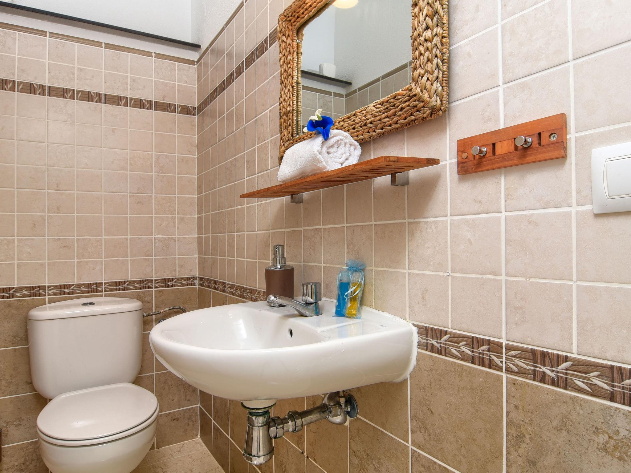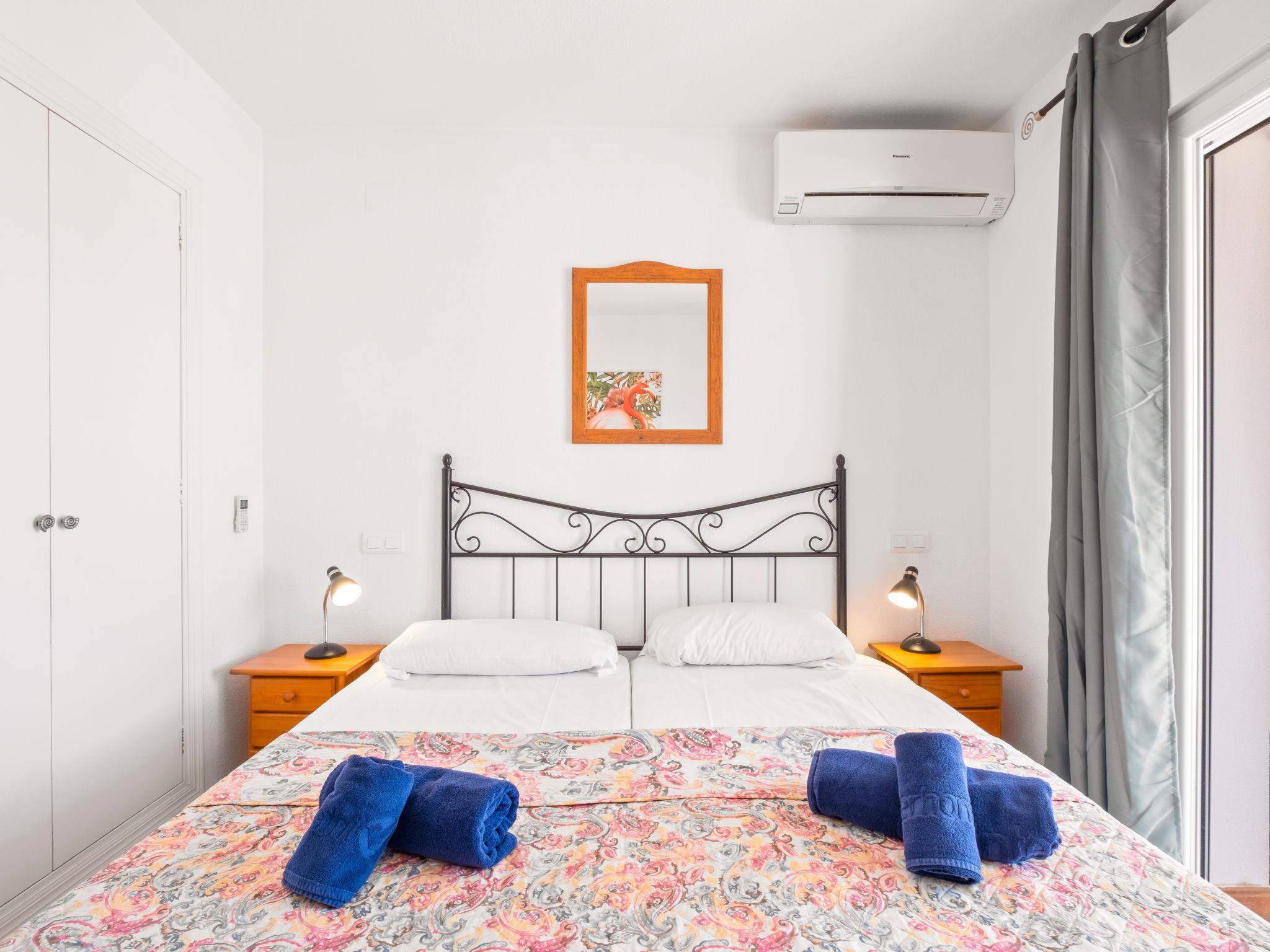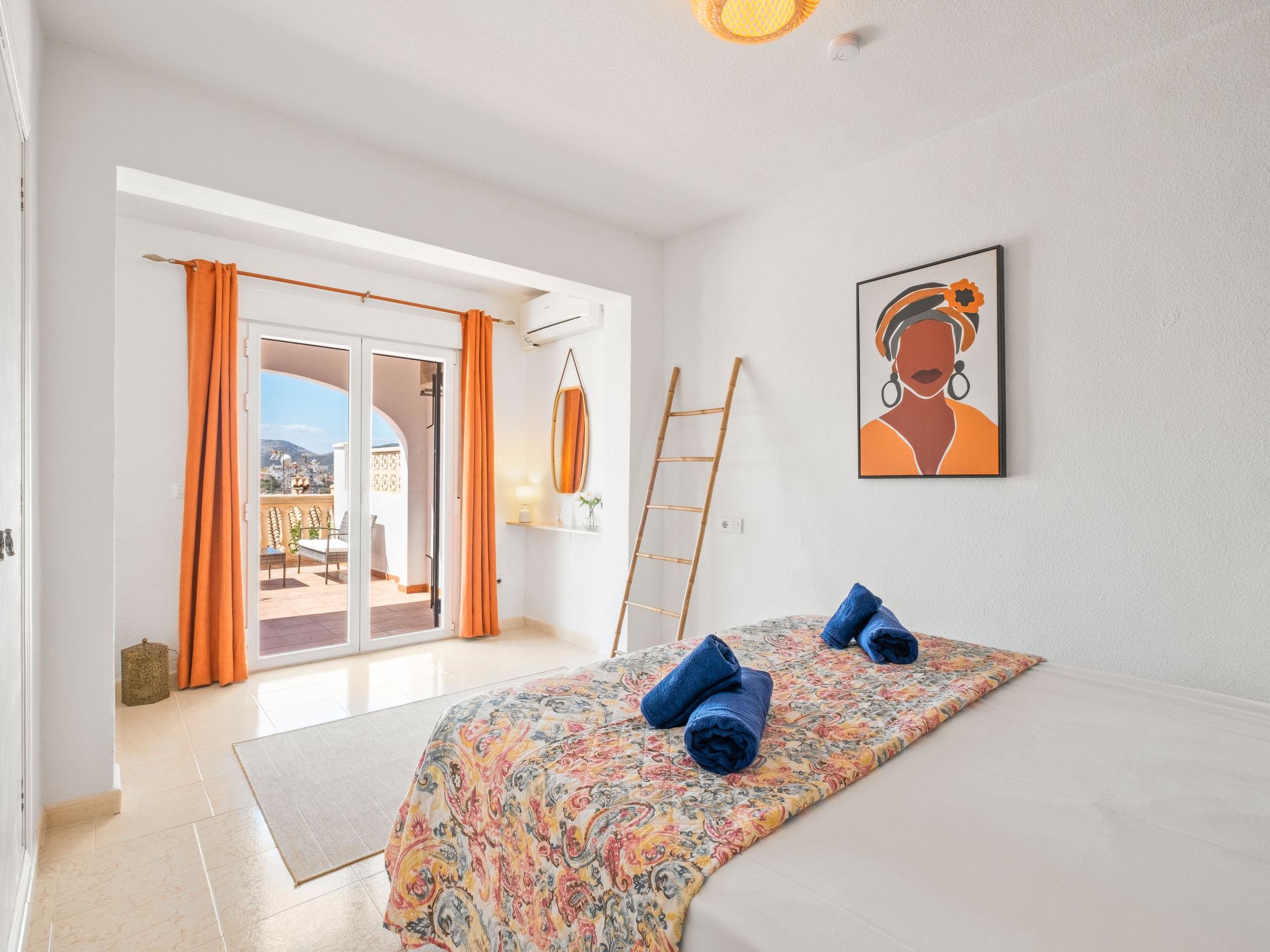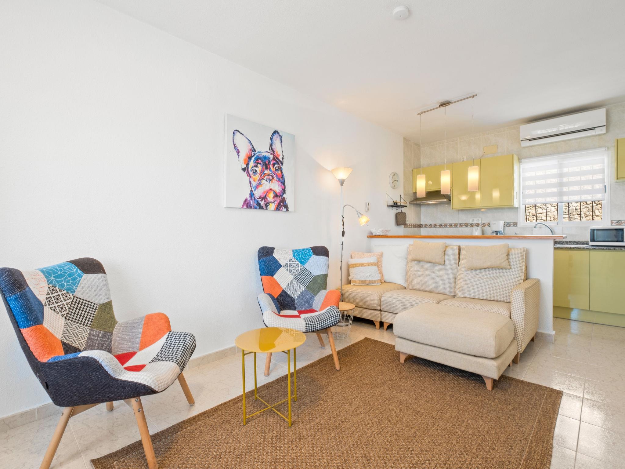 "Las Mimosas", 3-room bungalow 110 m2. Bright, comfortable and cosy furnishings: open living/dining room with digital TV, air conditioning and forced-air heating. Exit to the terrace. Small, open kitchen (oven, 4 ceramic glass hob hotplates, toaster, kettle, microwave, electric coffee machine). Bath/WC, sep. WC. On the lower ground floor: 1 room with 1 french bed (1 x 180 cm, length 190 cm), air conditioning and forced-air heating. Exit to the terrace. 1 room with 1 french bed (160 cm, length 200 cm), air conditioning and forced-air heating. Exit to the terrace. Terrace. Terrace furniture, deck chairs. Very beautiful view of the countryside and the resort. Facilities: washing machine, iron, hair dryer. Internet (WiFi, free). Please note: non-smoking house. TV only DE. VT-481203-A // Reg. Nr.: ESFCTU00000303800002700700000000000000000VT-481203-A9