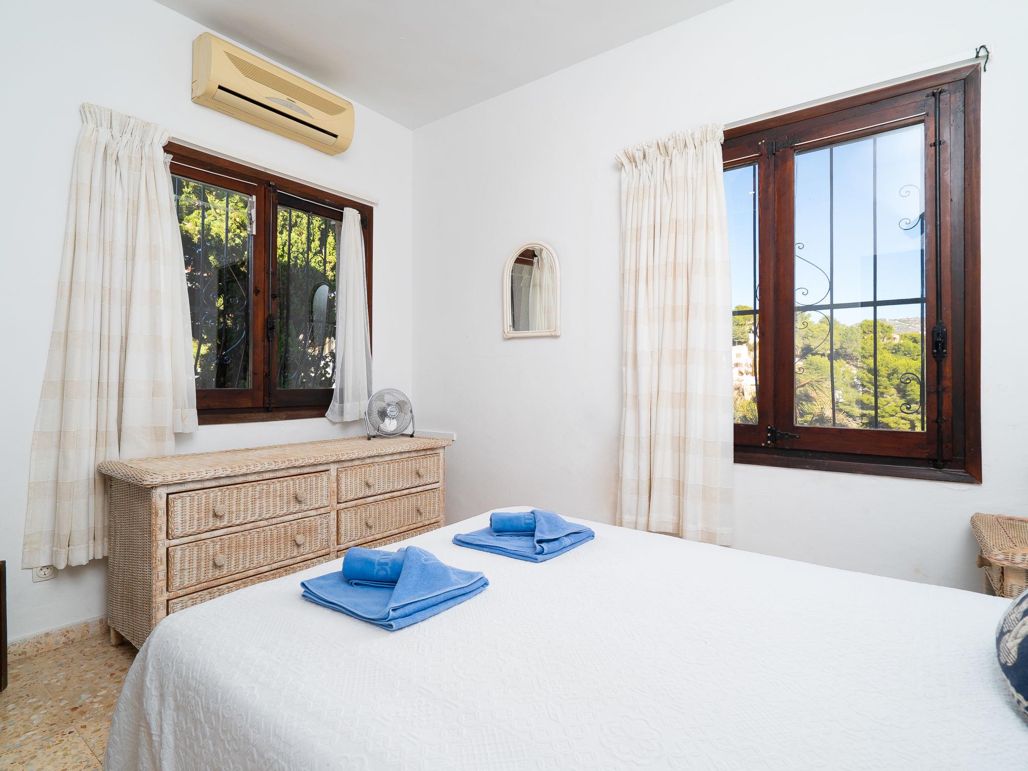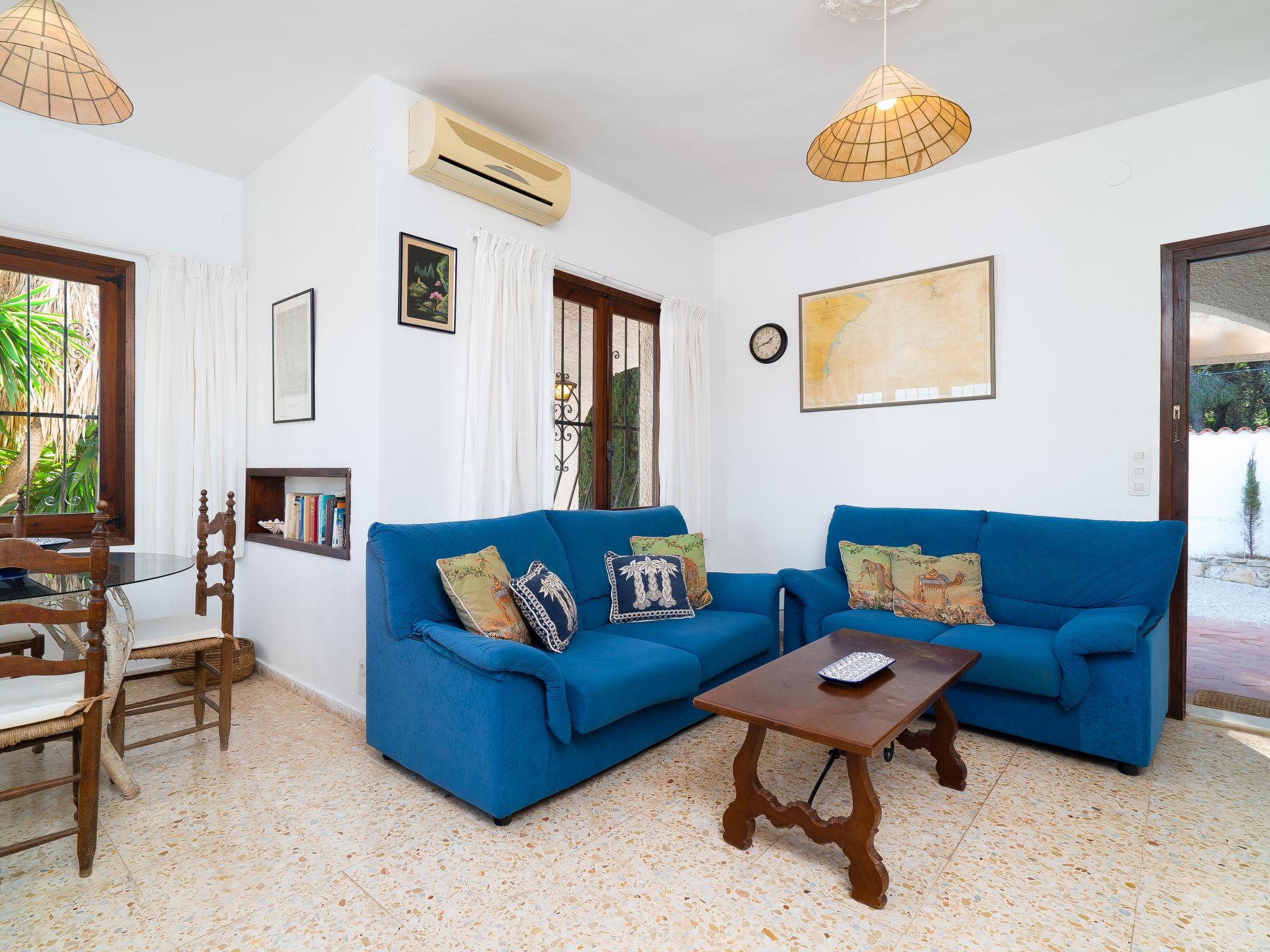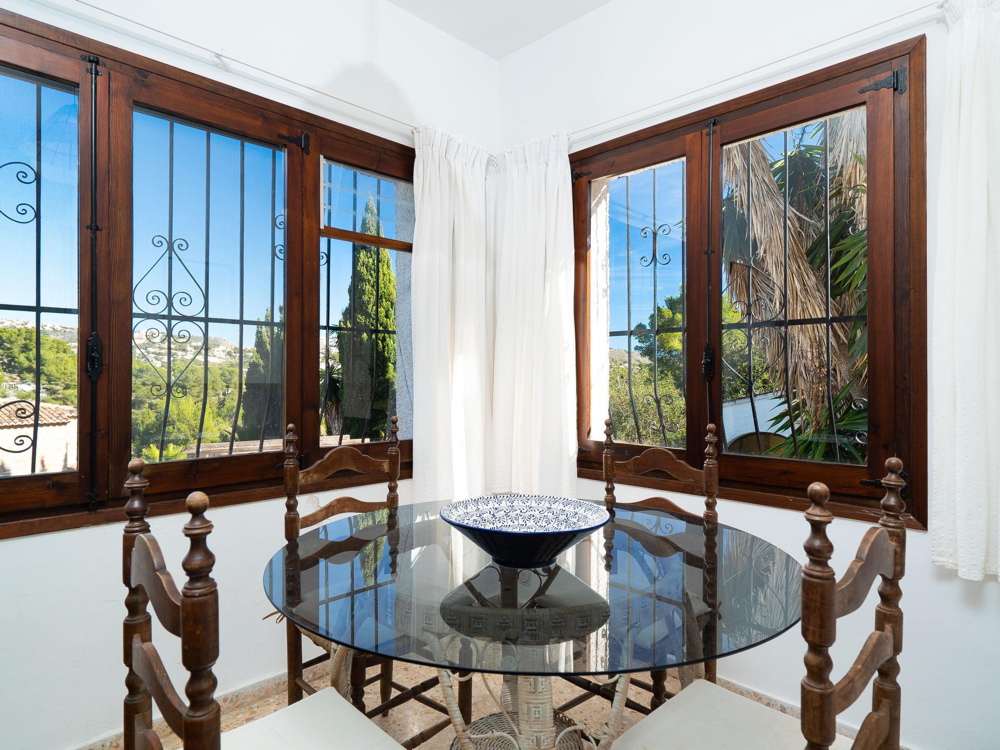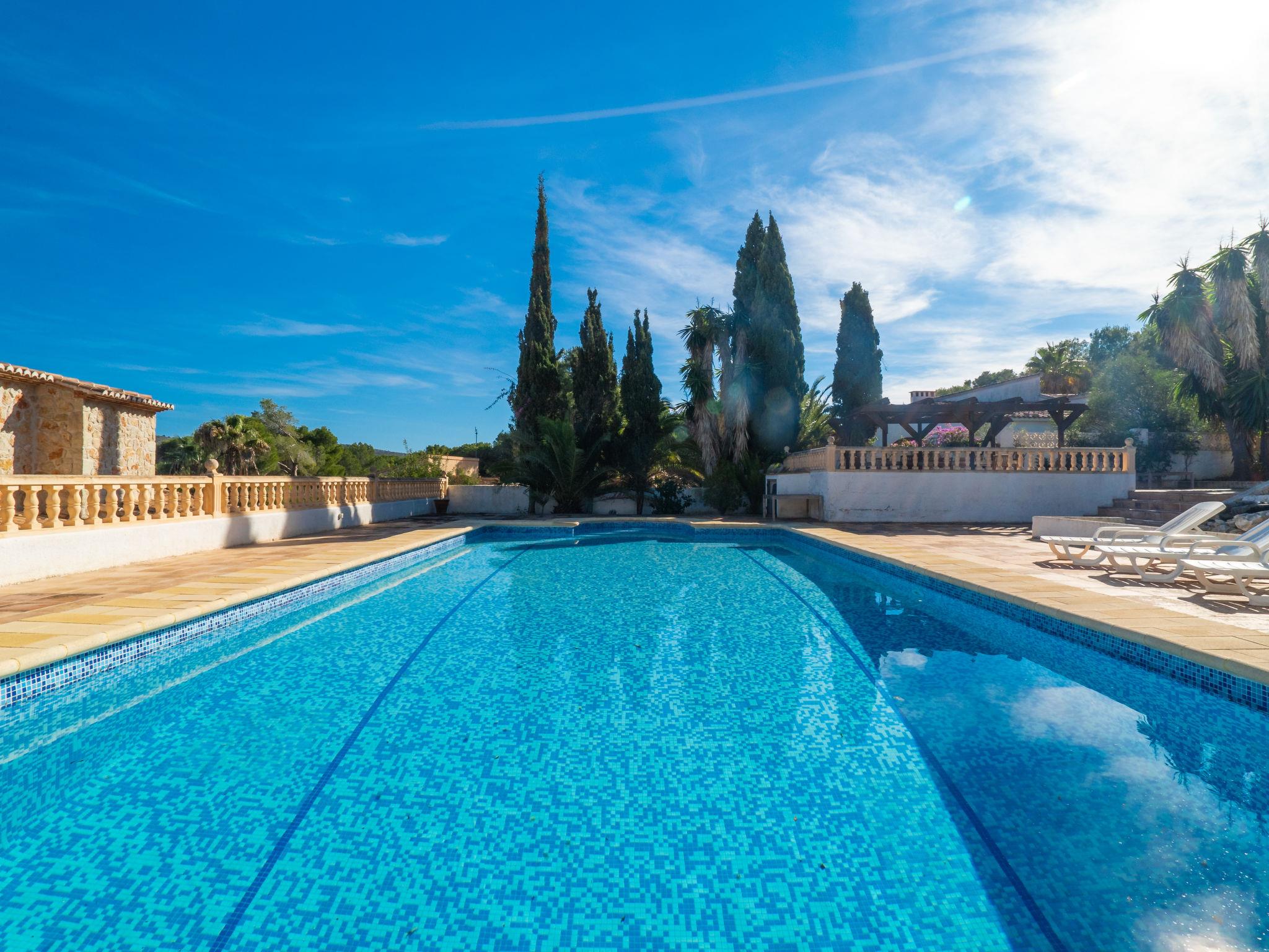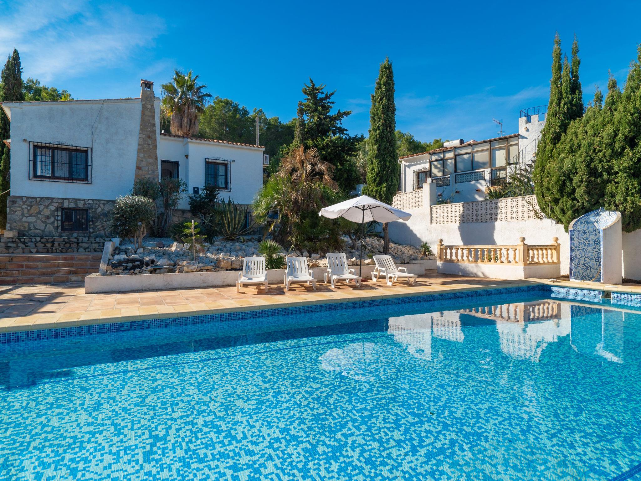 Cosy, rustic house "Sunshine", 2 storeys. 1.5 km from the centre of Moraira, in a quiet, sunny position in the residential district, 1.5 km from the sea, 1.5 km from the beach, in a cul-de-sac. Private: property 900 m2 (fenced), garden wildlife garden and flowers, swimming pool angular (9 x 11 m, seasonal availability: 01.Jan. - 31.Dec.) with internal staircase. Outdoor shower, barbecue. In the house: sun terrace, air conditioning. Parking on the premises. Shop 1.5 km, supermarket 1.5 km, restaurant 500 m, bar 900 m, bus stop "Moraira" 1.4 km, railway station "Teulada" 6.9 km, ferry "Denia" 2.5 km. Please note: suitable for families, suitable for seniors. The owner does not accept any youth groups.