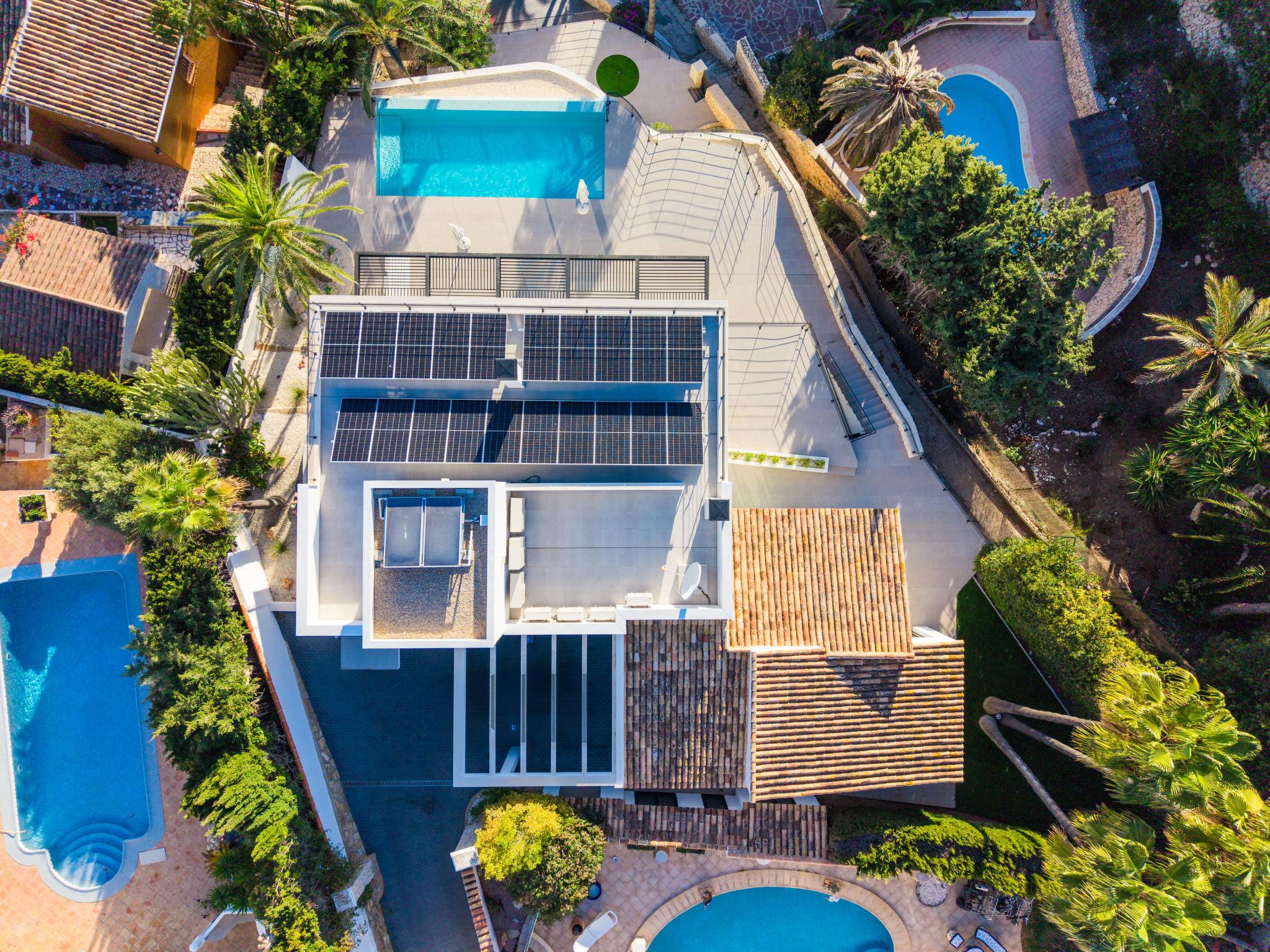 Very modern, beautiful villa "Cabo de Gata", 3 storeys. 3 km from the centre of Moraira, 11 km from the centre of Calpe, in a quiet, sunny position residential area (villas), traffic calmed area, 150 m from the sea, 150 m from the beach. Private: property (fenced), well-kept garden, swimming pool (9 x 4 m, seasonal availability: 01.Jan. - 31.Dec.). Outdoor shower, terrace, garden furniture, barbecue. In the house: roof terrace, washing machine, tumble dryer. Parking on the premises. Grocery, supermarket 750 m, restaurant 650 m, bus stop 750 m, sandy beach "Playa L'Ampolla" 3 km, rocky beach "Cala Punta Estrella", swimming bay 140 m. Sports harbour 4 km, marina 4 km, golf course (18 hole) 2 km. Nearby attractions: Aqualandia, Mundomar, Terra Mítica, Terra Natura, Benidorm Palace (Benidorm), Les Fonts de l'Algar, Castillo de Guadalest. Please note: suitable for families. The owner does not accept any youth groups.
