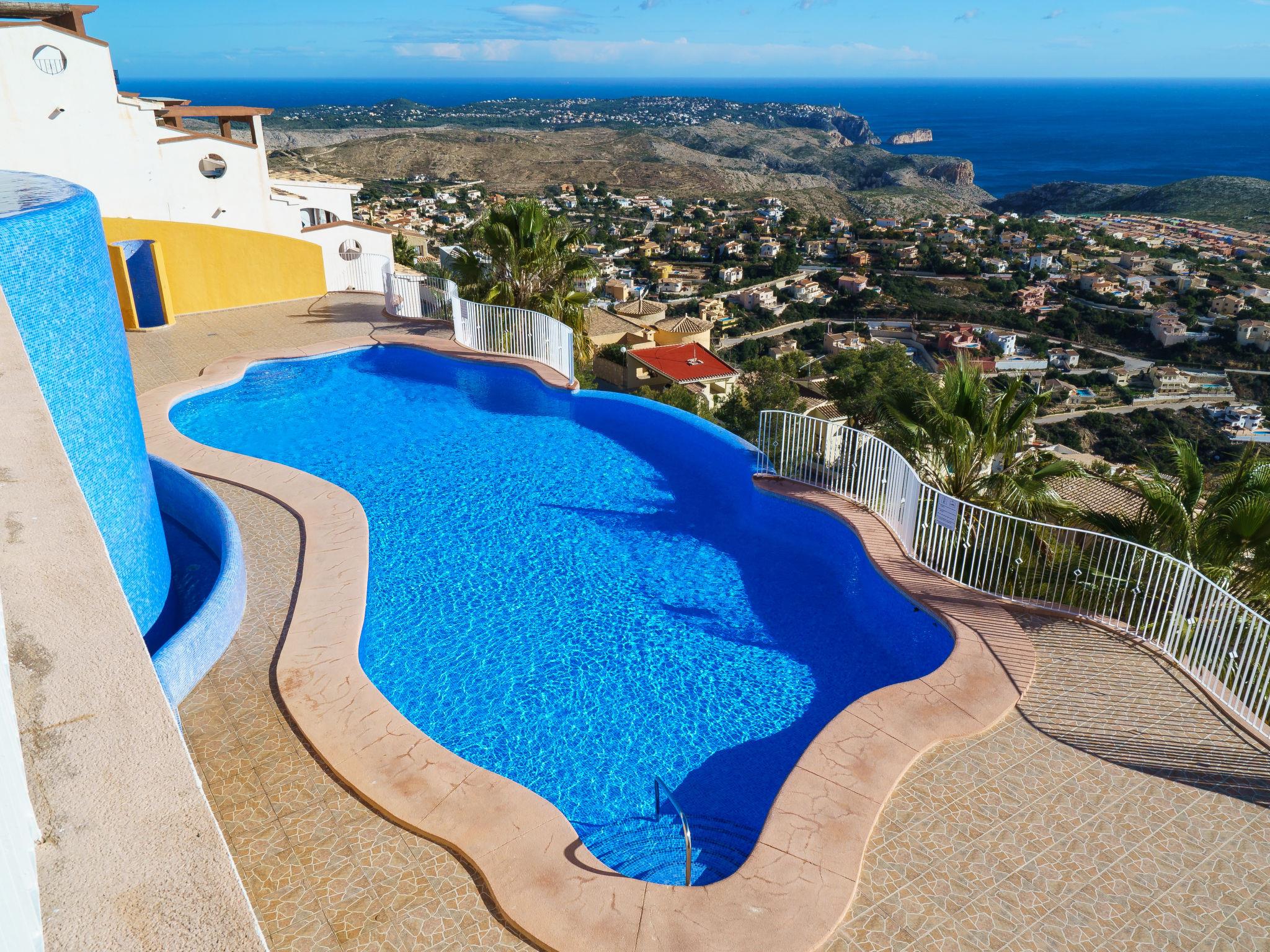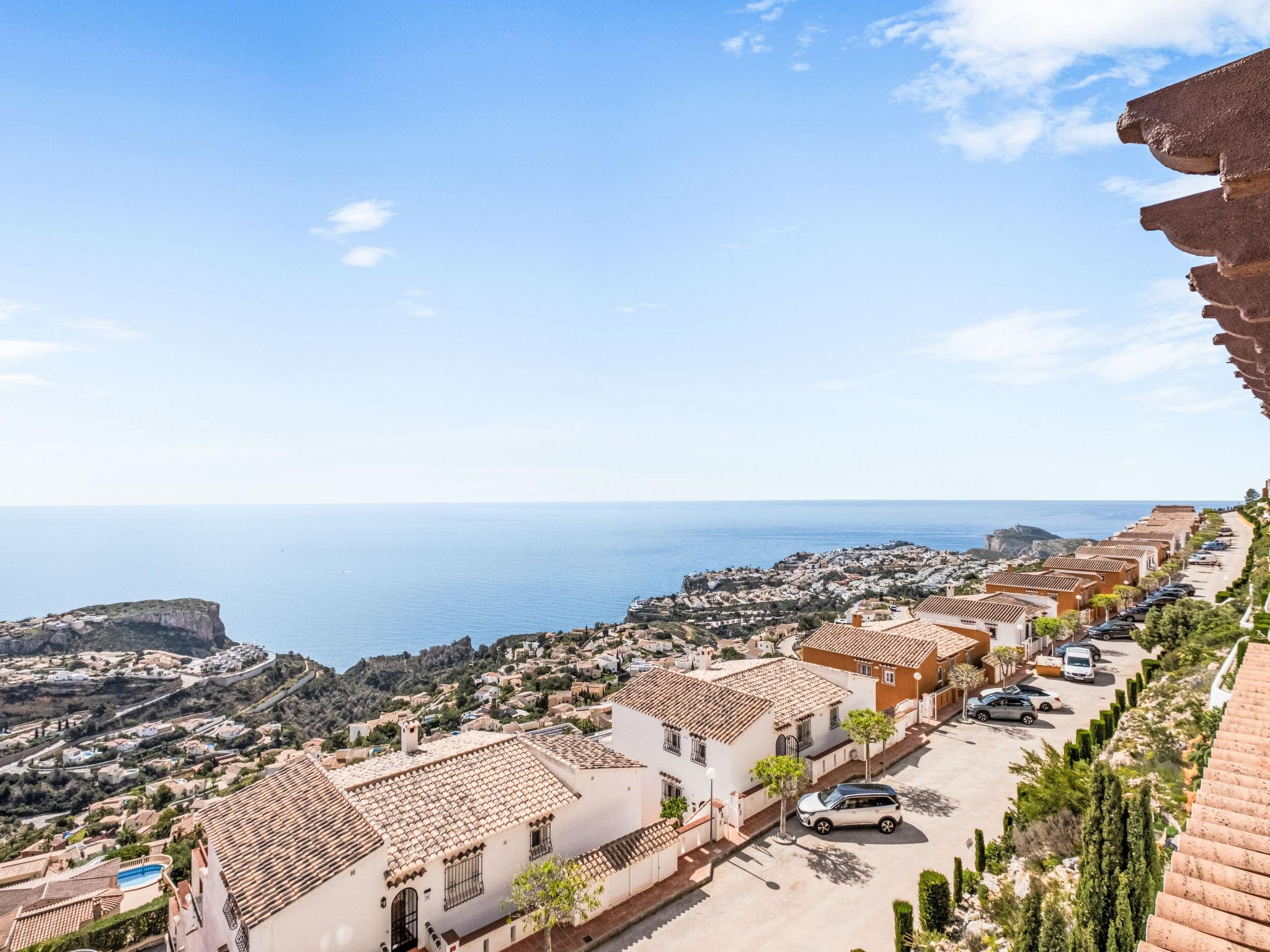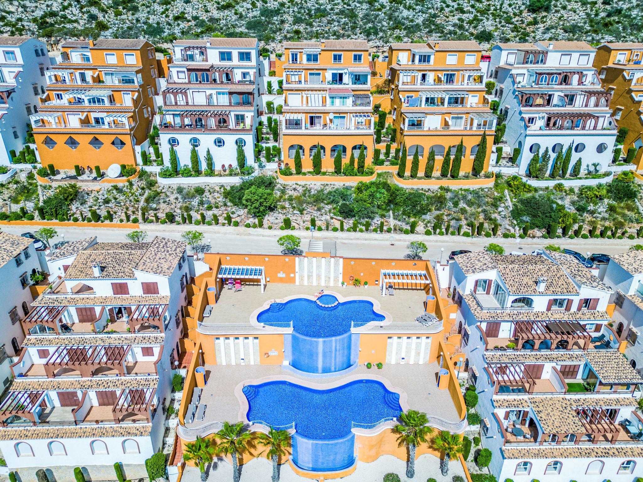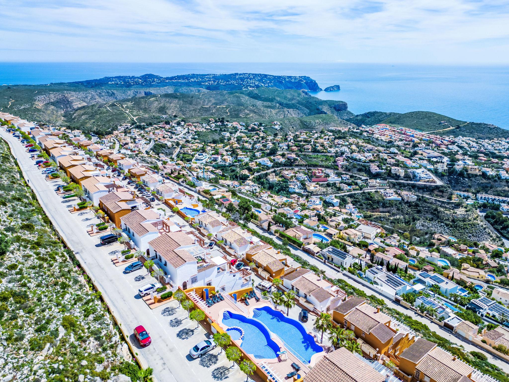 Apartment block "Pueblo Panorama". In the district of Cumbre del Sol, in a quiet, sunny position in the residential district, 4 km from the sea, 4 km from the beach. For shared use: 2 swimming pools (8 x 18 m, depth 120 - 150 cm, seasonal availability: 01.Jan. - 31.Dec.). In the house: internet access, WiFi, washing machine. Stepped path (53 steps) to the house. Shop 4.3 km, supermarket 4.3 km, shopping centre 4.3 km, restaurant 4.3 km, bus stop "Benitachell" 4 km, railway station "Teulada" 8.5 km, ferry "Denia" 22.5 km, sandy beach "Playa Ampolla" 8 km pebble beach "Cala Moraig" 4 km, outdoor swimming pool 10 m. Please note: car recommended. Suitable for families, suitable for seniors. The owner does not accept any youth groups.
