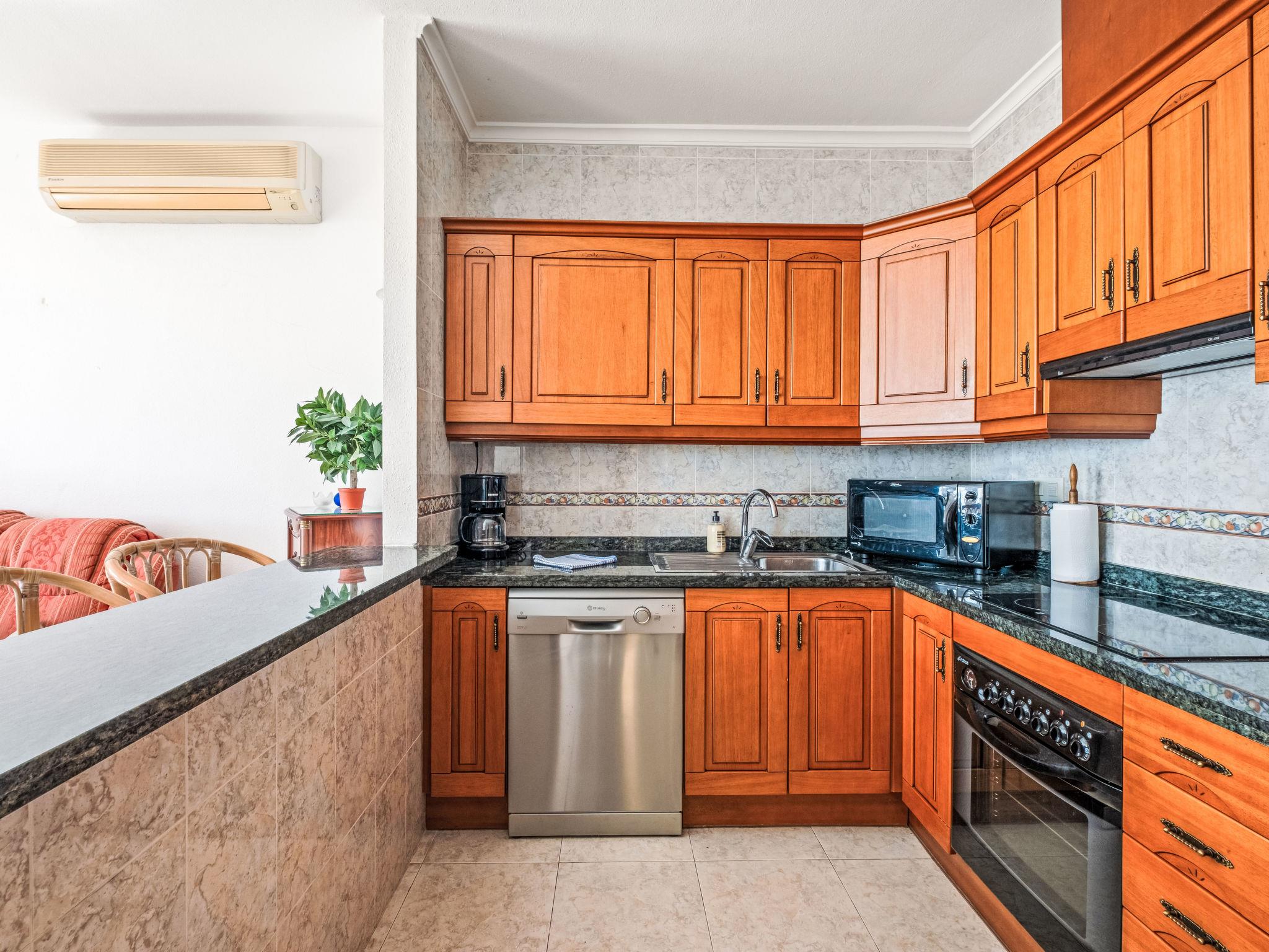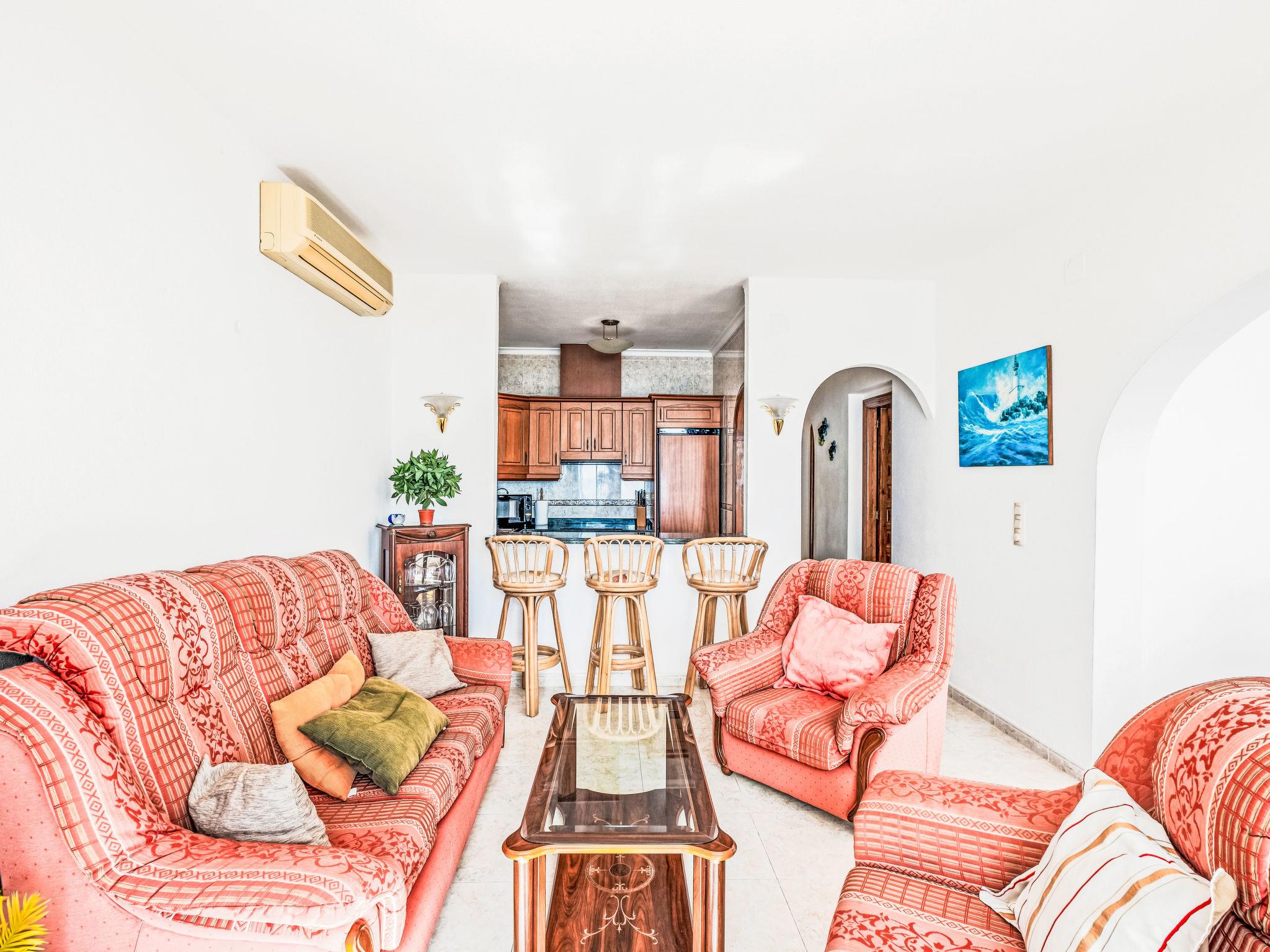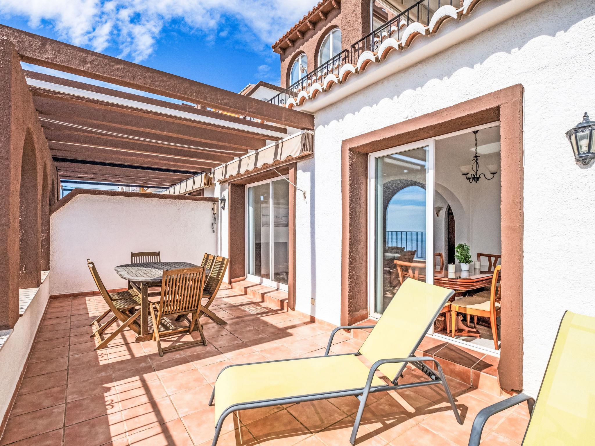 "Pueblo Panorama", 4-room apartment 125 m2 on 2 levels. Bright, comfortable and cosy furnishings: living/dining room with digital TV, air conditioning and forced-air heating. Exit to the terrace. 1 room with 1 french bed (1 x 160 cm, length 200 cm). Kitchen (oven, dishwasher, 4 ceramic glass hob hotplates, toaster, kettle, microwave, electric coffee machine). Shower/bidet/WC, double hand-basin. On the lower ground floor: 1 room with 1 french bed (1 x 160 cm, length 200 cm). 1 room with 1 x 2 bunk beds (80 cm, length 190 cm), 1 pull-out bed (2 pers. 2 x 80 cm, length 190 cm), air conditioning and forced-air heating. Bath/WC. Large terrace. Terrace furniture. Panoramic view of the sea and the resort. Facilities: washing machine, iron, hair dryer. Internet (WiFi, free). Please note: non-smoking house. R00000001