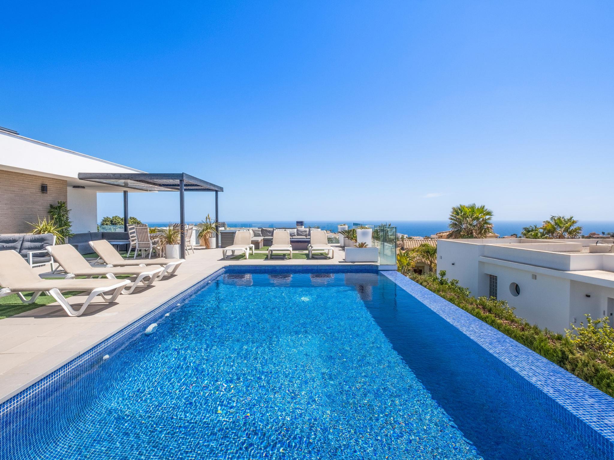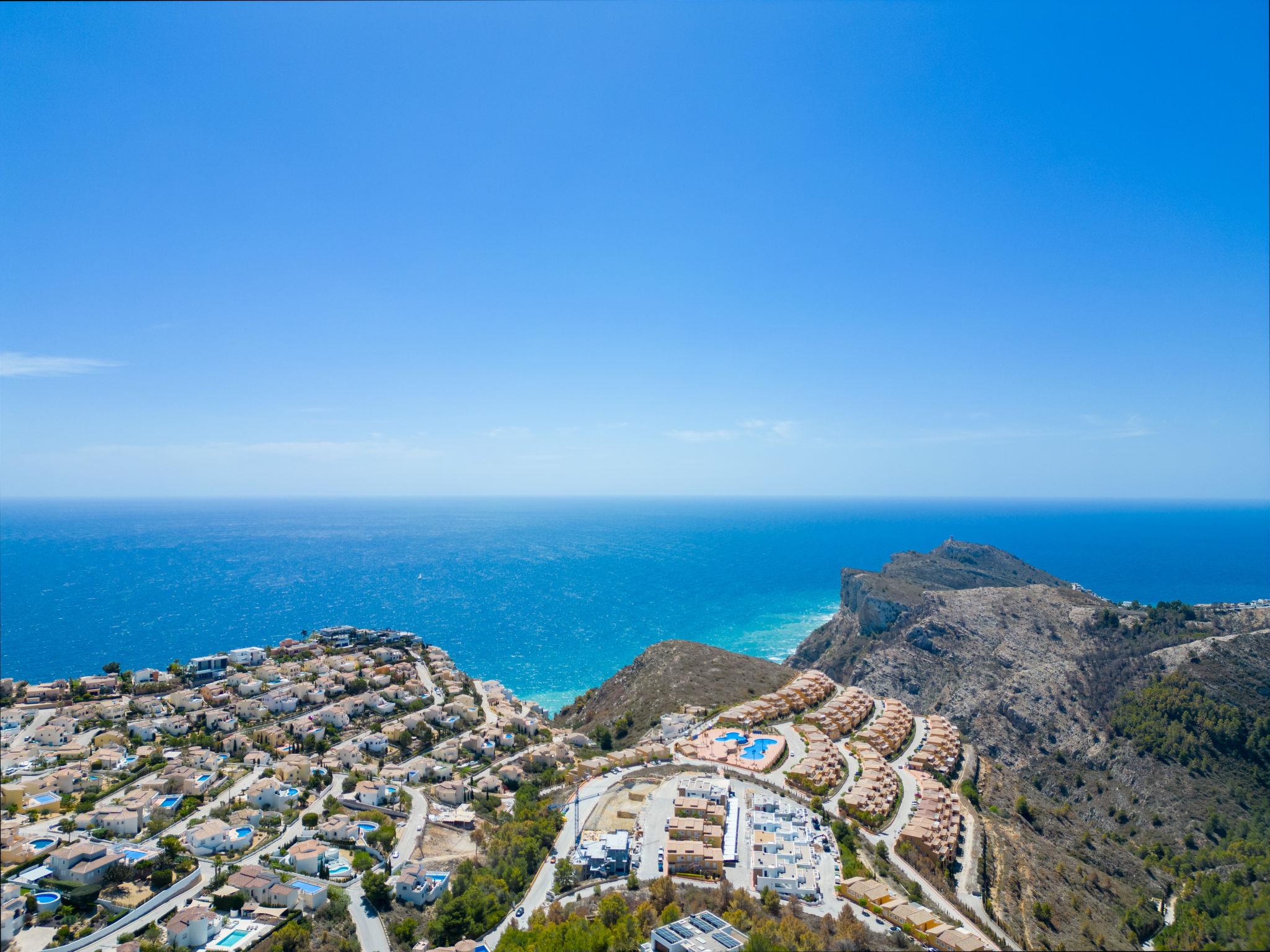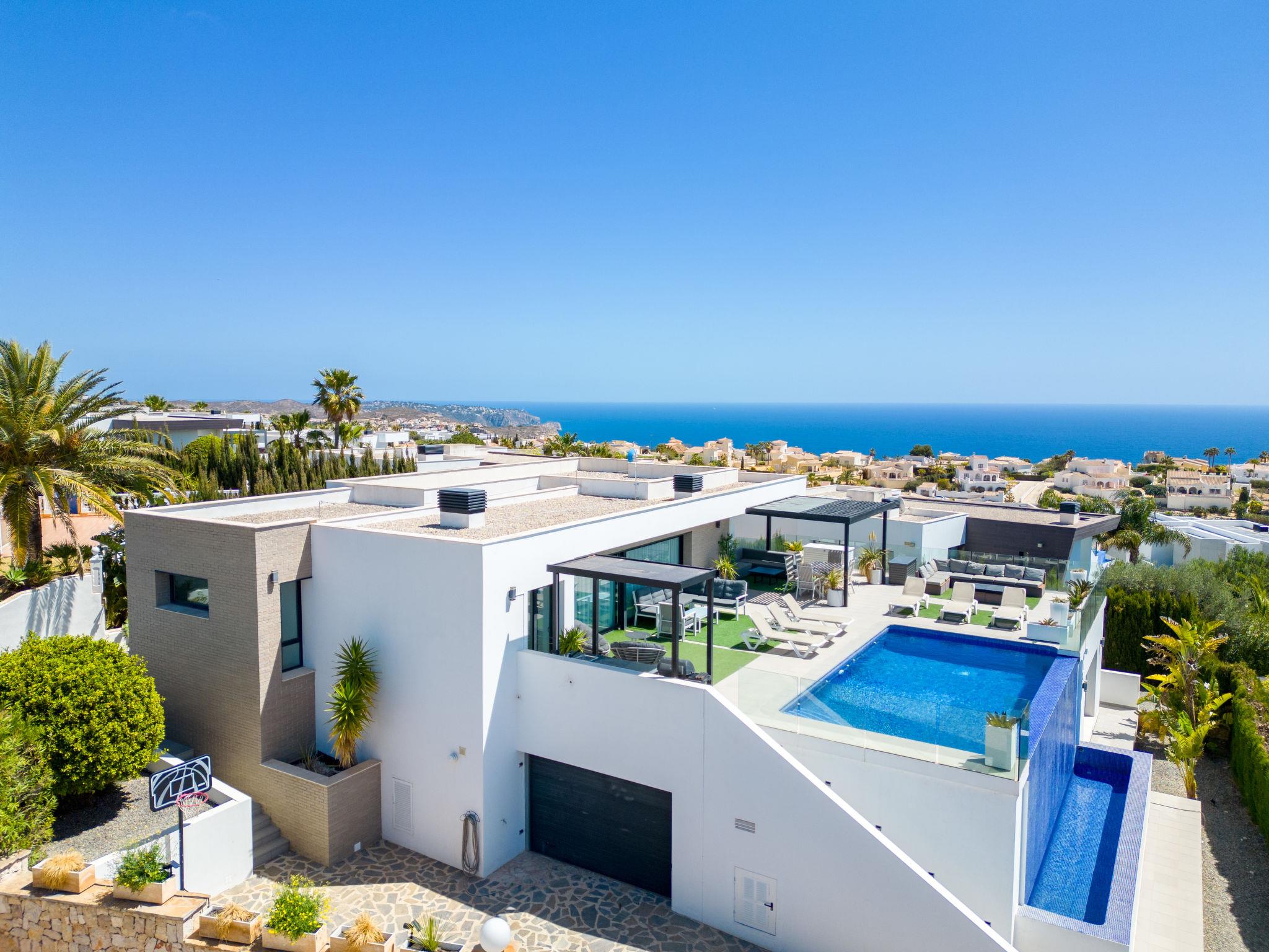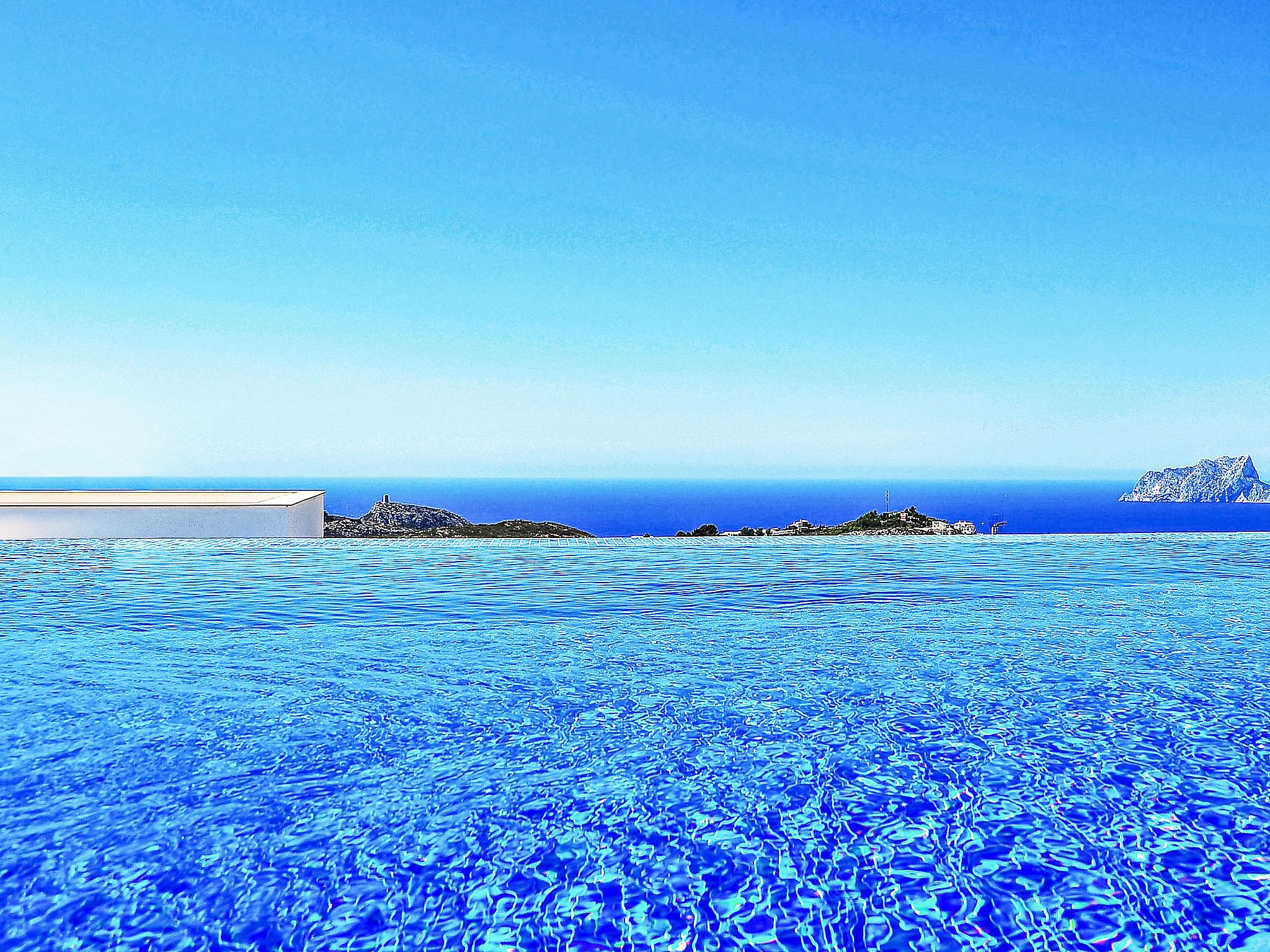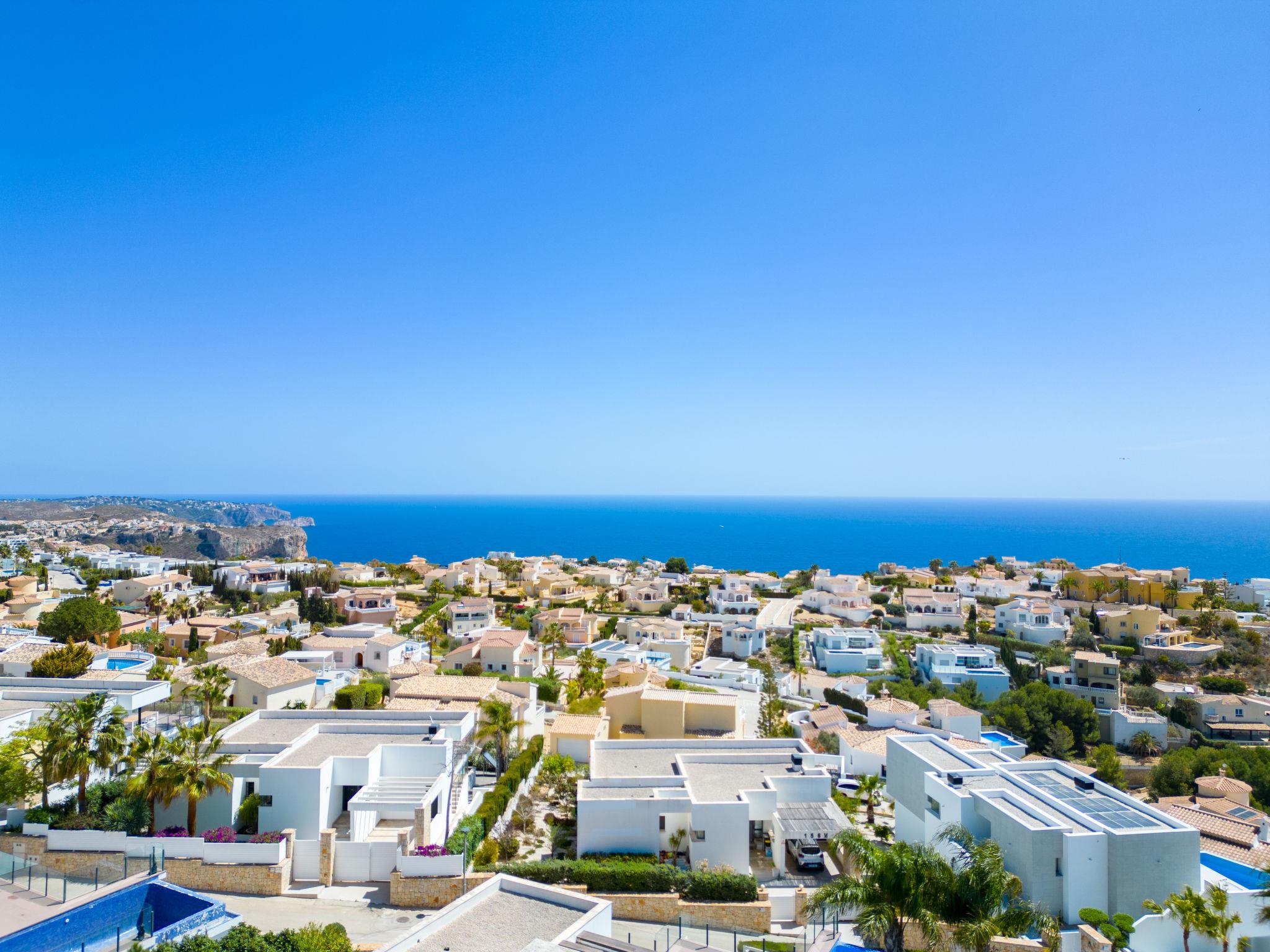 Cumbre del Sol: Very modern, beautiful villa "Megin", 2 storeys, built in 2014. In the district of Cumbre del Sol 5.5 km from the centre of Moraira, in a quiet, sunny position, 2 km from the sea, 2 km from the beach. Private: property 800 m2 (fenced), garden, swimming pool angular (4 x 8 m, depth 150 - 200 cm, seasonal availability: 01.Jan. - 31.Dec.) with internal staircase. In the house: air conditioning. Parking on the premises. Shop 3 km, supermarket 3 km, restaurant 3 km, bus stop "Benitachell" 5.1 km, railway station "Teulada" 8.7 km, ferry "Denia" 24.3 km, pebble beach "Cala Moraig" 2 km. The owner does not accept any groups. The owner does not accept any youth groups. Neighbourhood highly sensitive to noise. Quietness and good behaviour expected.