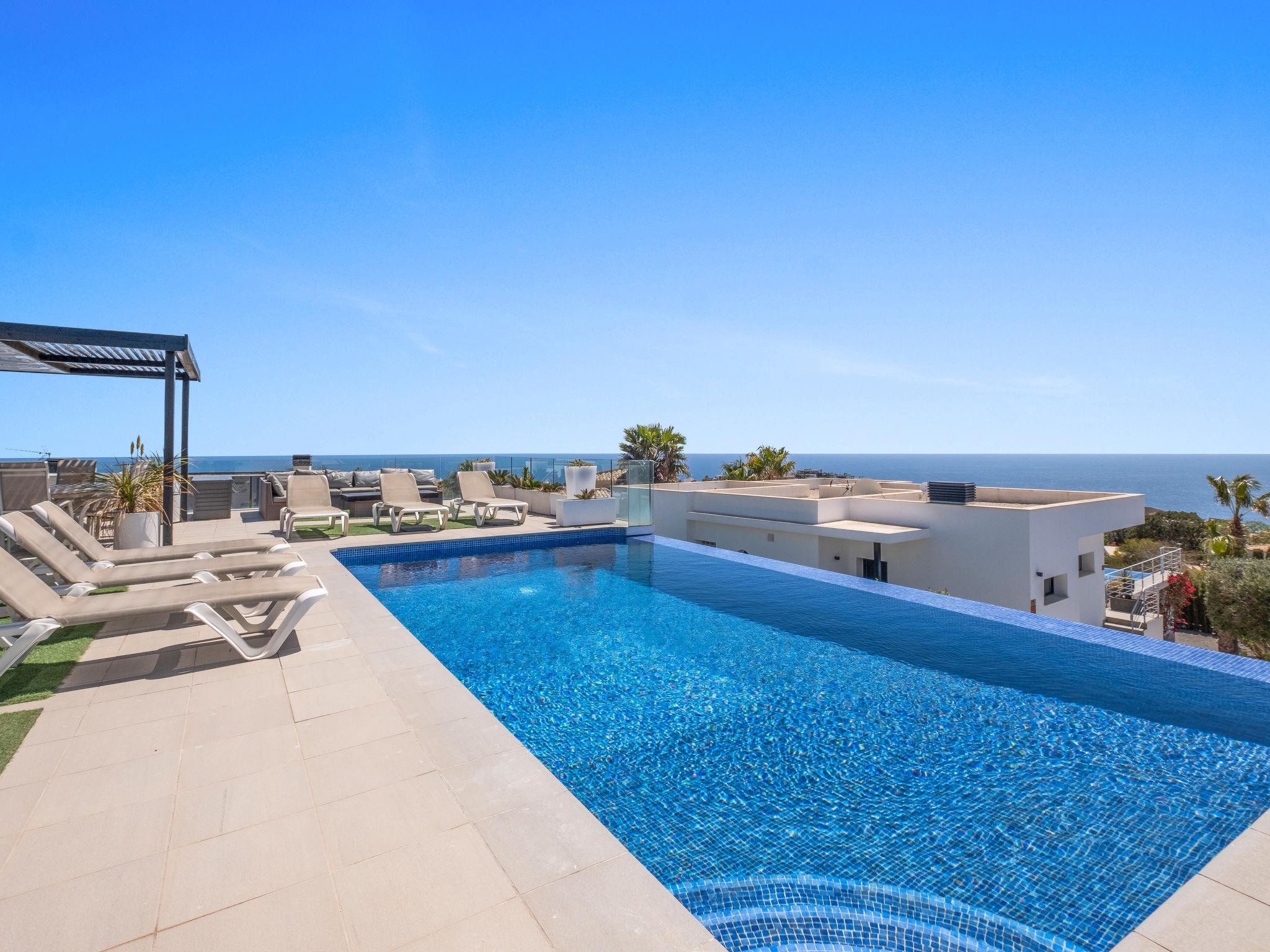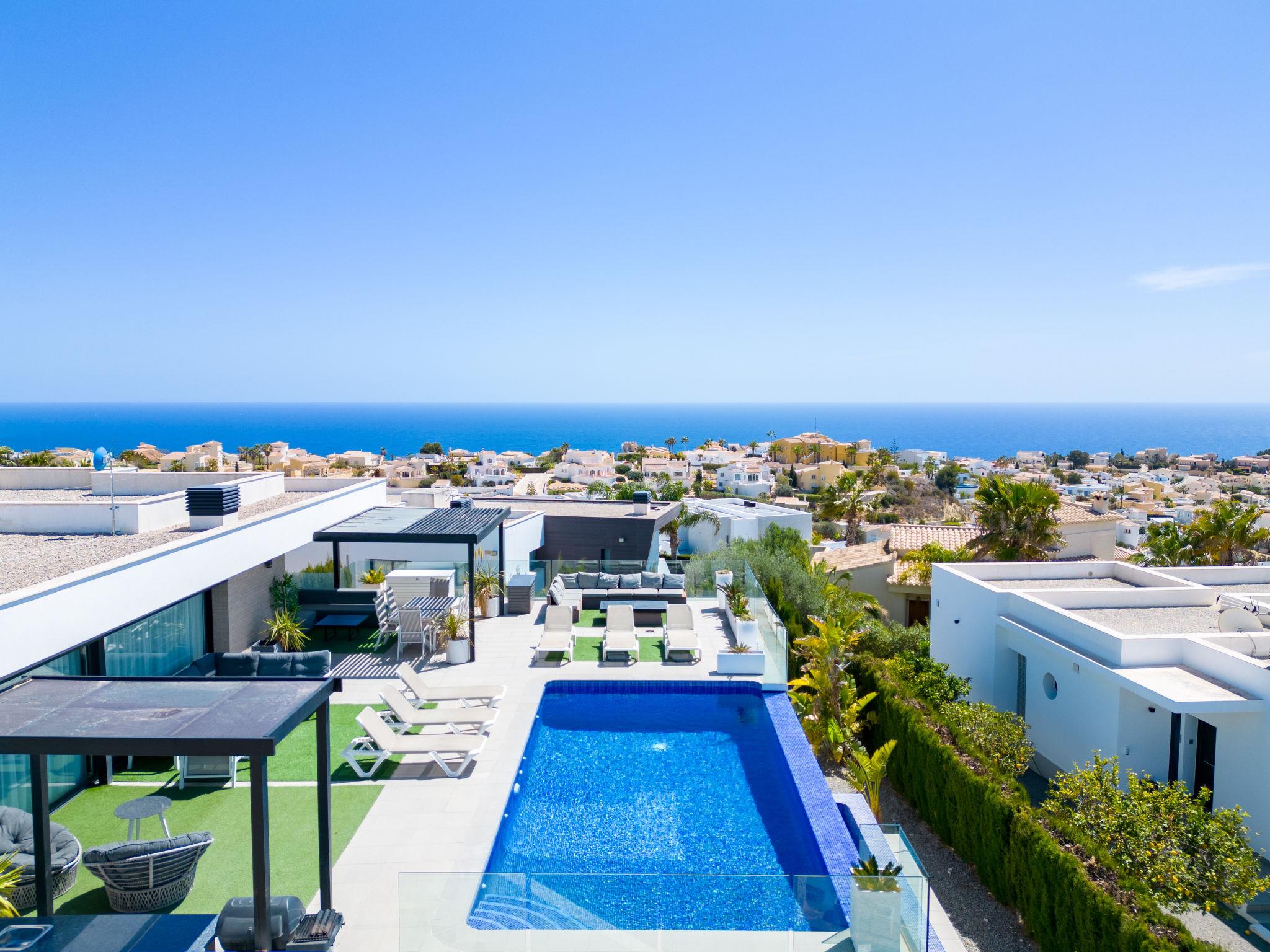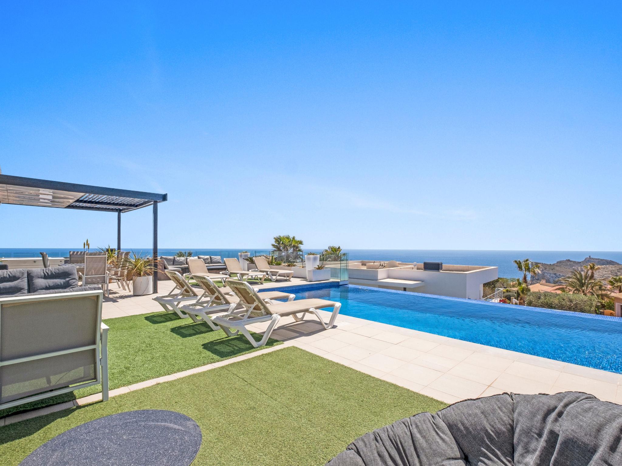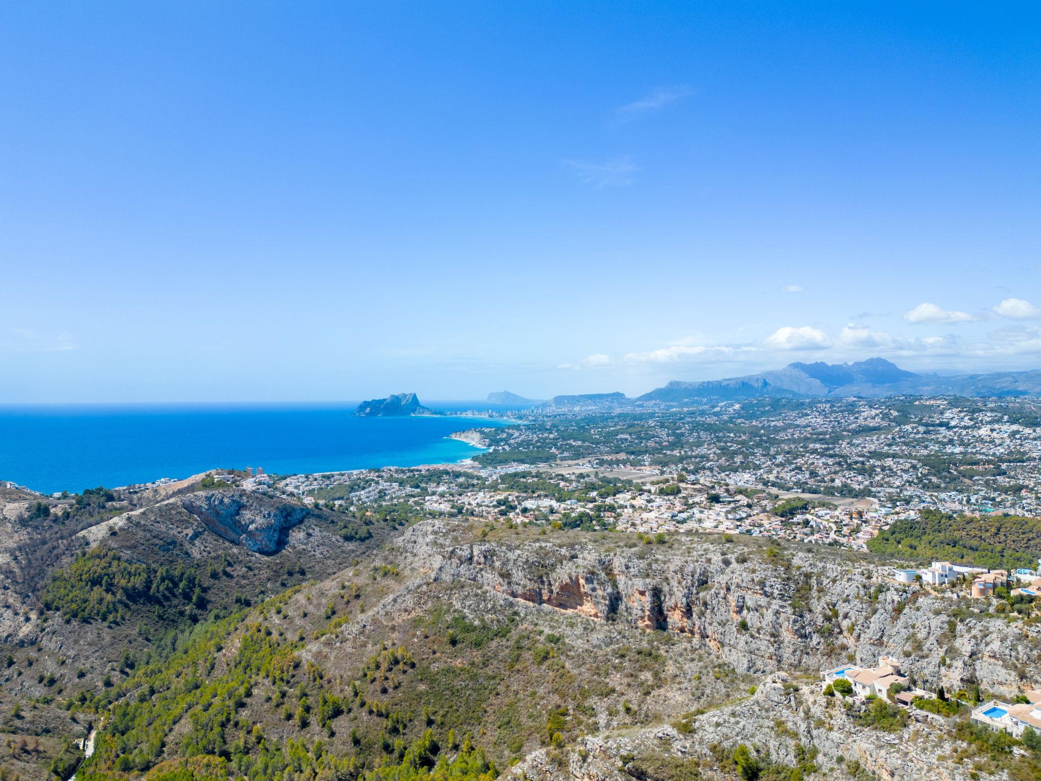 Cumbre del Sol: Very modern, beautiful villa "Megin", 2 storeys, built in 2014. In the district of Cumbre del Sol 5.5 km from the centre of Moraira, in a quiet, sunny position, 2 km from the sea, 2 km from the beach. Private: property 800 m2 (fenced), garden, swimming pool angular (4 x 8 m, depth 150 - 200 cm, seasonal availability: 01.Jan. - 31.Dec.) with internal staircase. In the house: air conditioning. Parking on the premises. Shop 3 km, supermarket 3 km, restaurant 3 km, bus stop "Benitachell" 5.1 km, railway station "Teulada" 8.7 km, ferry "Denia" 24.3 km, pebble beach "Cala Moraig" 2 km. The owner does not accept any groups. The owner does not accept any youth groups. Neighbourhood highly sensitive to noise. Quietness and good behaviour expected.