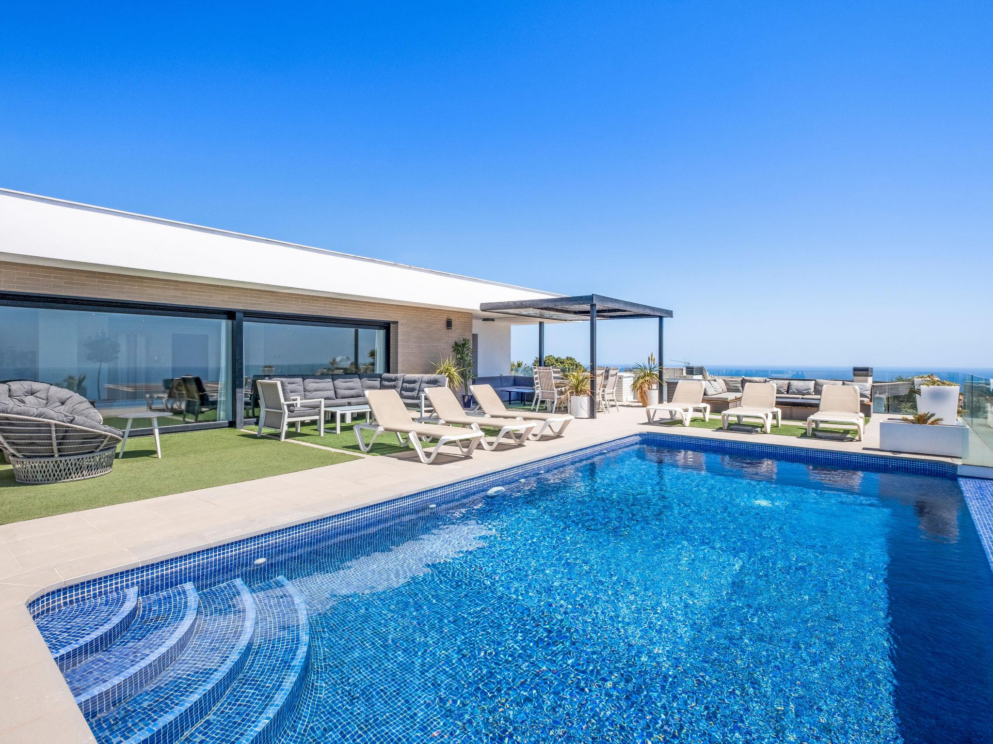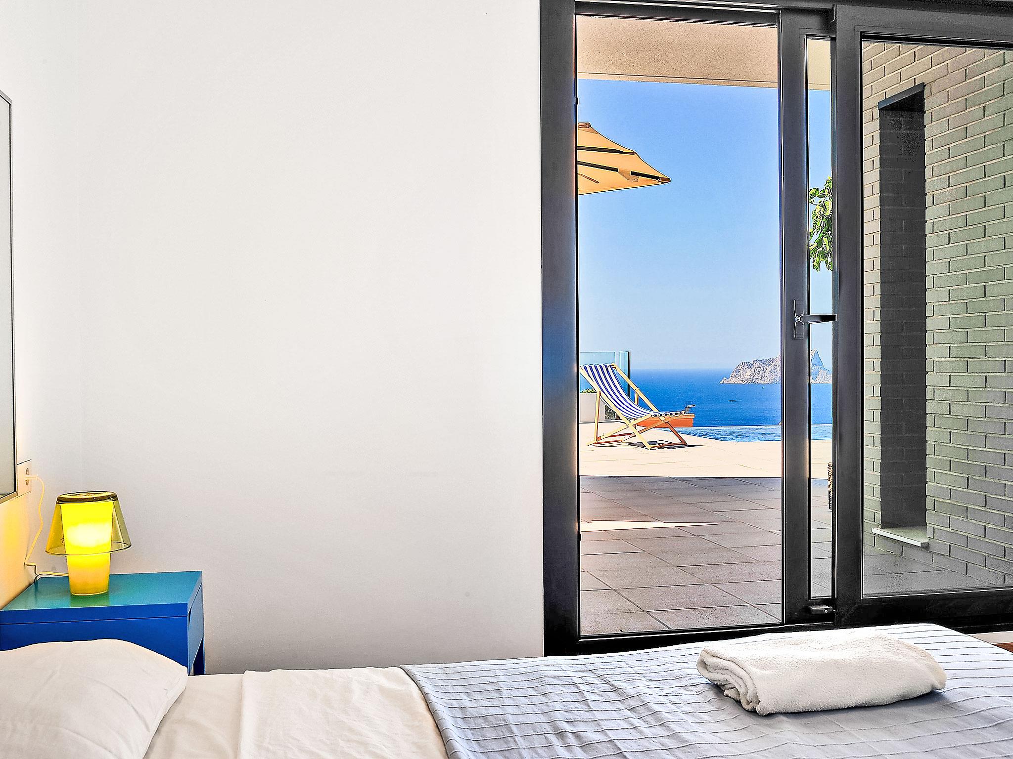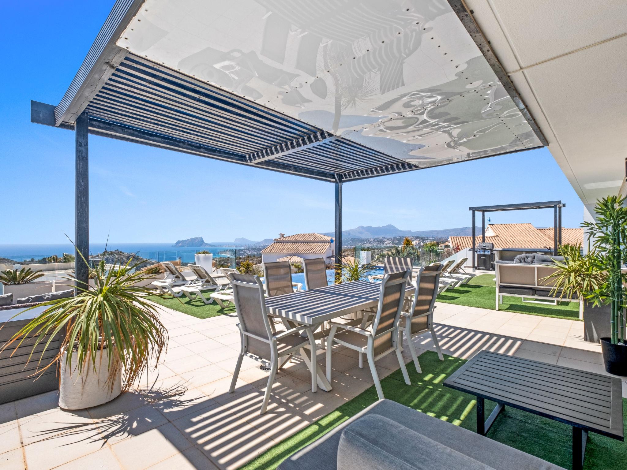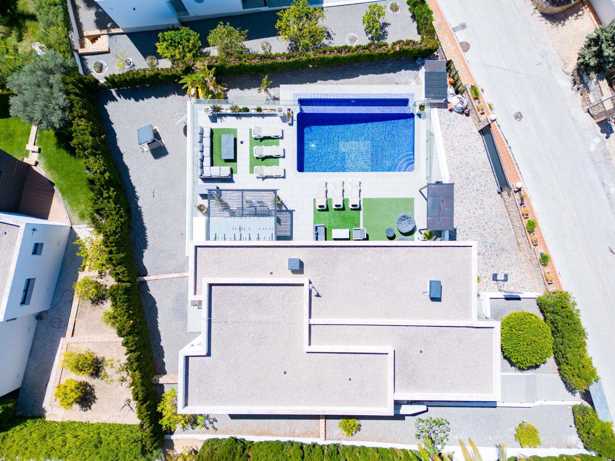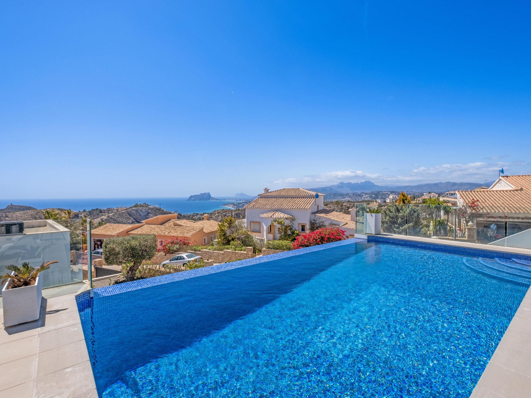 Cumbre del Sol: Very modern, beautiful villa "Megin", 2 storeys, built in 2014. In the district of Cumbre del Sol 5.5 km from the centre of Moraira, in a quiet, sunny position, 2 km from the sea, 2 km from the beach. Private: property 800 m2 (fenced), garden, swimming pool angular (4 x 8 m, depth 150 - 200 cm, seasonal availability: 01.Jan. - 31.Dec.) with internal staircase. In the house: air conditioning. Parking on the premises. Shop 3 km, supermarket 3 km, restaurant 3 km, bus stop "Benitachell" 5.1 km, railway station "Teulada" 8.7 km, ferry "Denia" 24.3 km, pebble beach "Cala Moraig" 2 km. The owner does not accept any groups. The owner does not accept any youth groups. Neighbourhood highly sensitive to noise. Quietness and good behaviour expected.