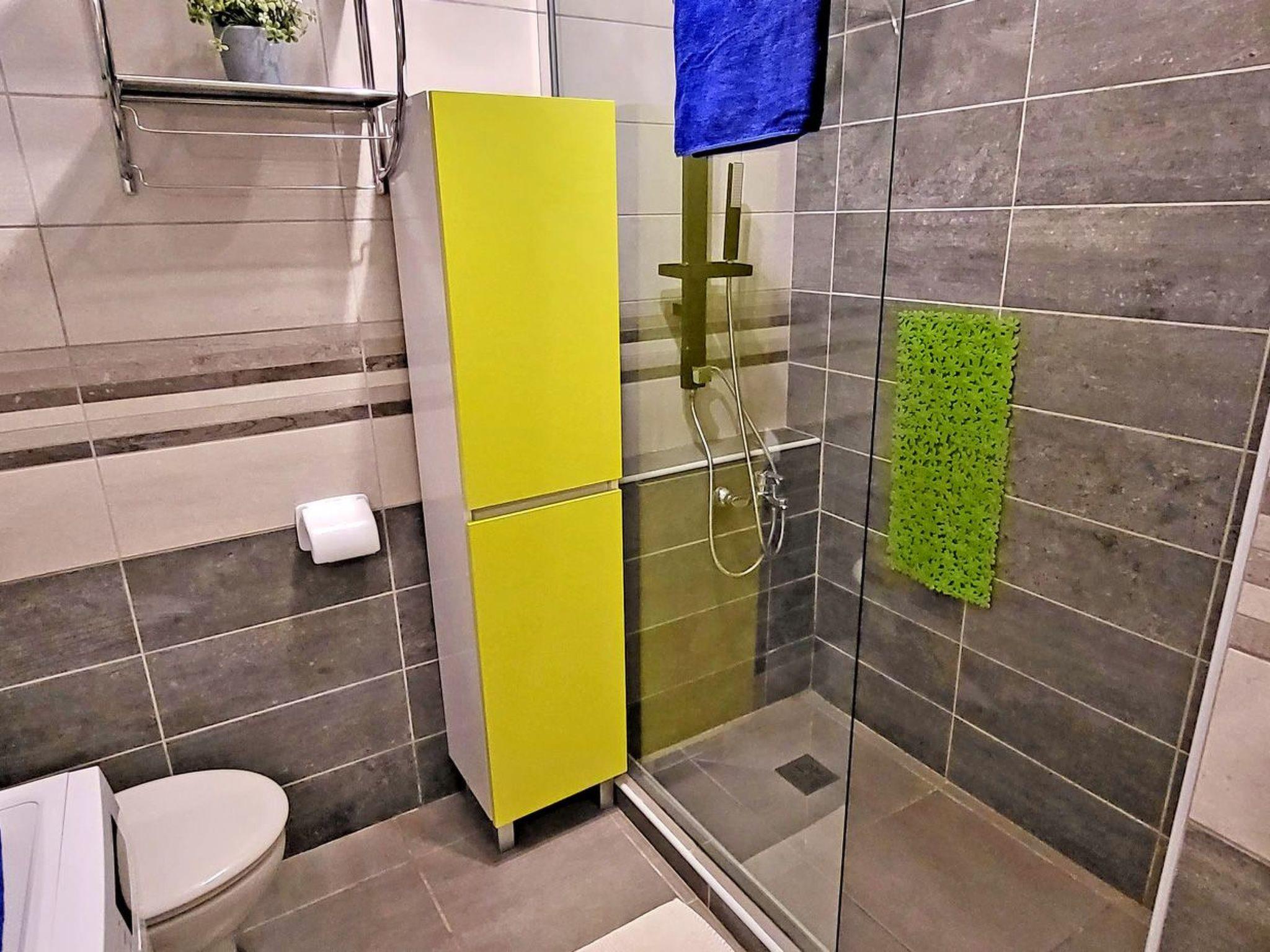 The interior of the flat is modern and functional, creating a bright and cosy living space. There is a combined living/sleeping area and an open-plan kitchen equipped with all the necessary appliances, including a coffee machine and kettle. There is also a bathroom with a shower. A washing machine for your sole use and a fan provide additional comfort.