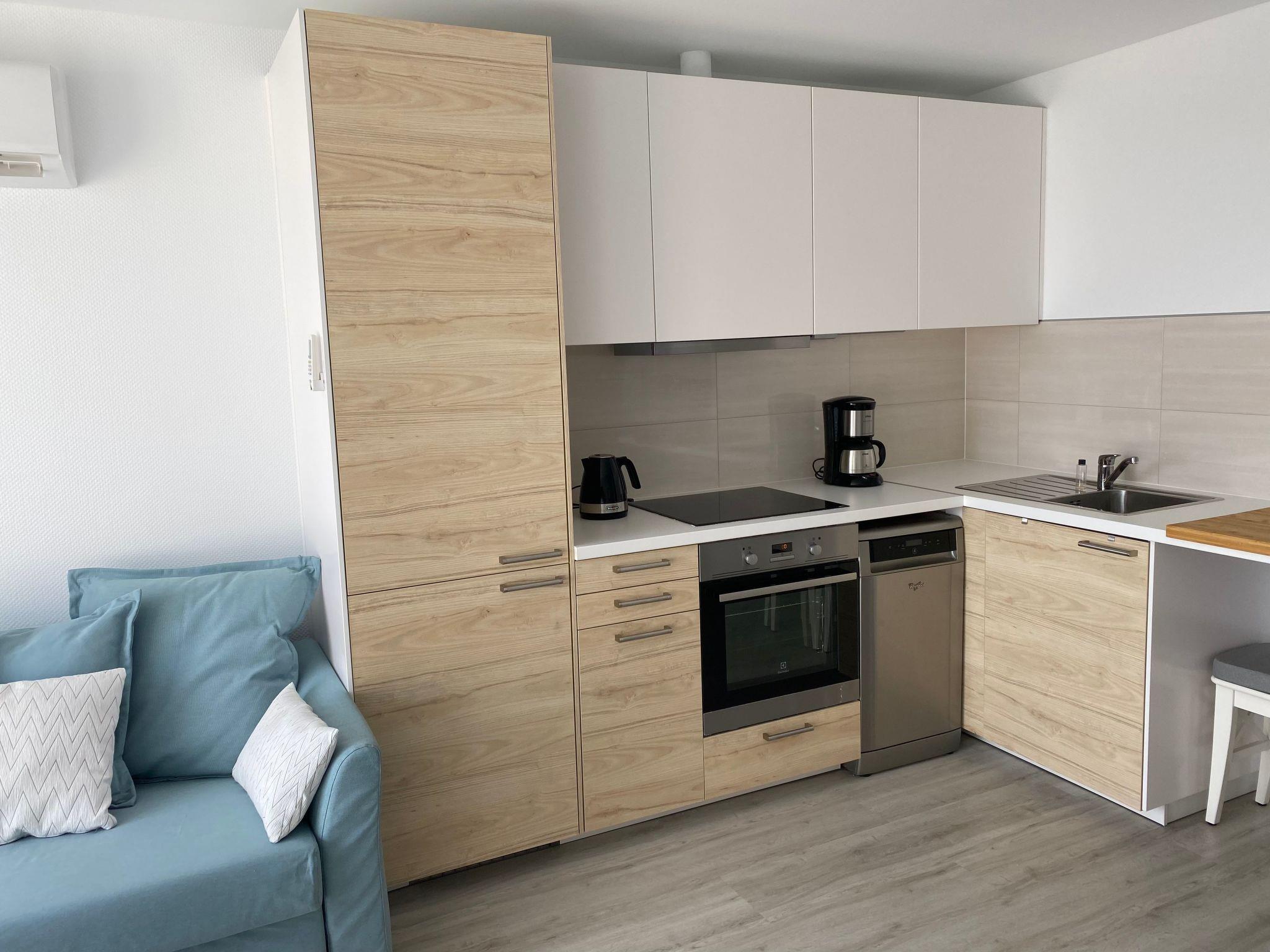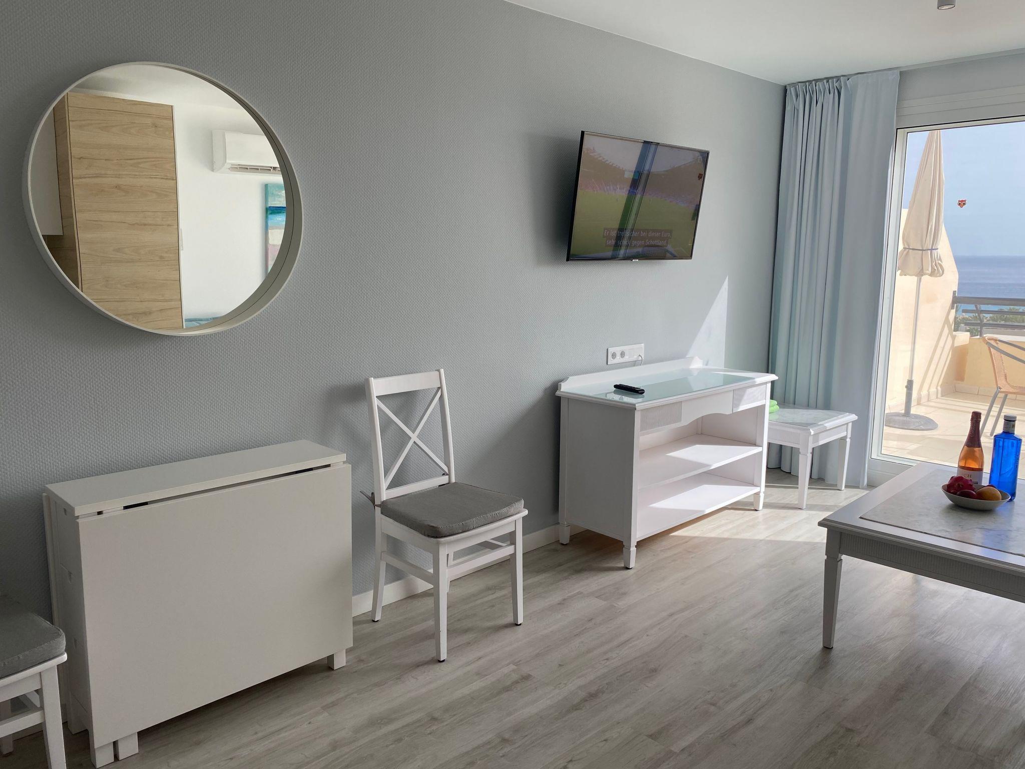 *Living room (with TV, air-conditioning) with kitchenette equipped with new appliances: fridge, oven, electric hob, dishwasher, kettle, toaster, *Bedroom with window and ocean view: double bed 180 cm wide or 2 single beds 90 cm wide. *Bathroom: bathtub with shower, washing machine, toilet, bidet, washbasin *Safe. On the terrace furniture (table + 4 chairs) with sunshade.