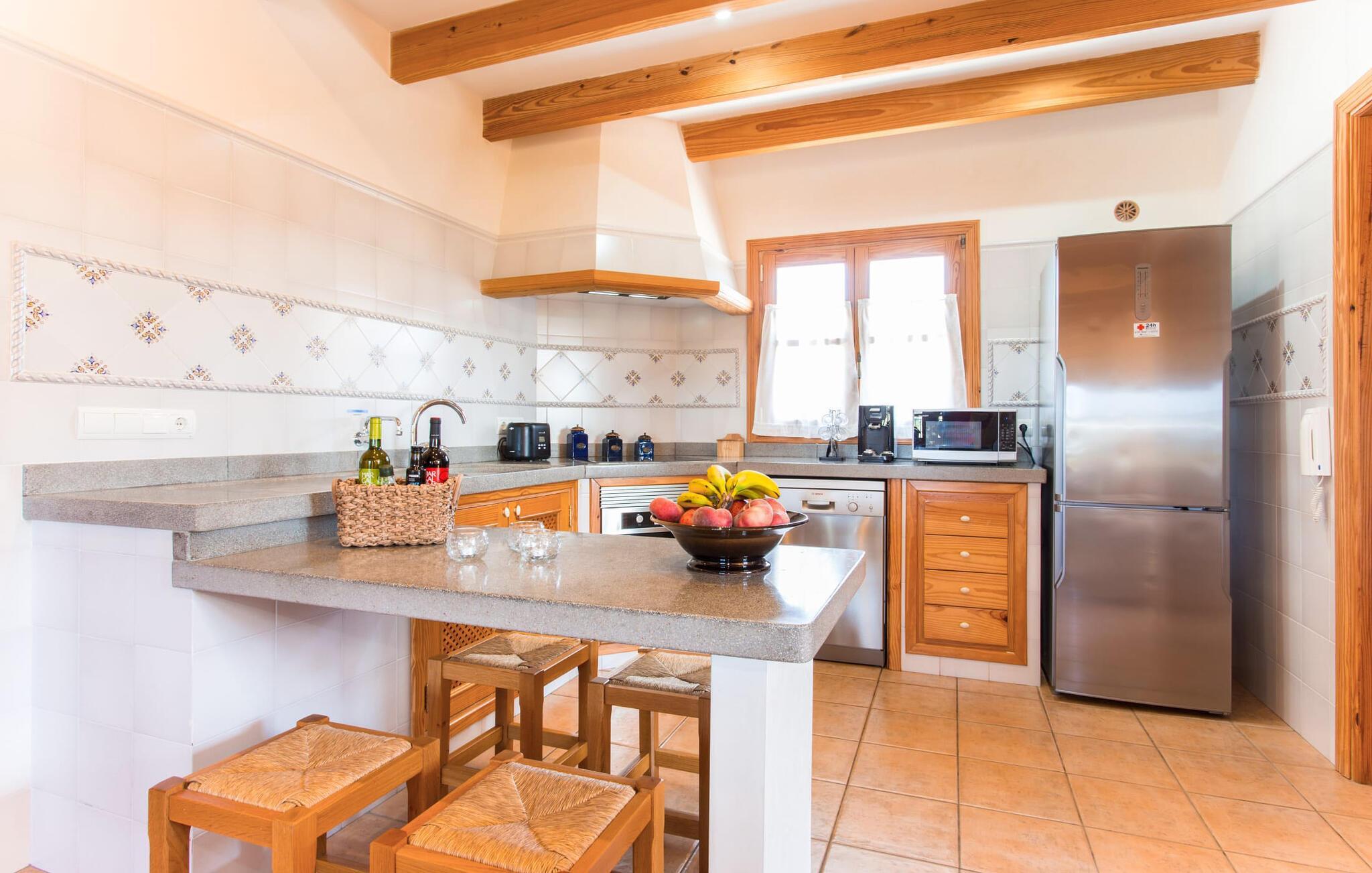 Det tredje billede til højre opsummerer det: Den lille bakke i den lille by Artà er ikke langt, og samtidig kan du nyde privatlivets fred og fred i sin reneste form på dette sted. Villaen er ikke kun et godt valg til “drømmeferien”-projektet, men scorer også point på grund af sit alsidige og velholdte udeareal med en sydvestvendt swimmingpool, der strækker sig direkte foran den smukke naturstensbygning, som er ikke kun med sine knaldblå mosaiksten Ikke alene er det et blikfang, men det er også meget nemt at komme ind via de romerske trappetrin. Har du små børn, vil du glæde dig over det gennemtænkte hegn, der forhindrer ikke-svømmere i at komme uden opsyn til bassinet og på den anden side beskytter poolterrassen langs det skrånende terræn. Den grønne græsplæne, træerne, brolægningen lavet af dekorative natursten, de blå og hvide liggestole og den vellykkede blanding af solrige og skyggefulde steder til afslapning udendørs gør denne fremragende beliggende villa til et sandt blikfang. Terrassen mellem huset og poolområdet er lige så smart, som den er usædvanlig. Her har du et separat opholdsområde med en meget fremtrædende placering med frit udsyn til tre sider. Dette vil helt sikkert være dit foretrukne sted at sidde om dagen og bestemt også til dine velsmagende grillaftener - grillen integreret i det super praktiske udekøkken venter på dig her. Kan du lide at sidde lige ved siden af huset, kan du gøre det på den hyggelige terrasse ved bagindgangen. Også her er du beskyttet fra tre sider, hvilket for eksempel er skønt, når der blæser en stærk brise. Dette er et Fincallorca feriehus. Villaens indretning indbyder til socialt samvær: At bo, spise og lave mad foregår ikke kun på ét plan, men i et stort, let vinklet rum. Den udsøgte, smagfulde indretning med masser af lyst træ kombineret med de let strukturerede vægge, synlige bjælker og terracotta fliser skaber en meget venlig atmosfære, hvor det er nemt at ankomme og slappe af. Her kan der ske mange ting på samme tid: at se en film i sofaen, sprede et kort over Mallorca på bordet og planlægge din næste rejse, lave en lækker salat i køkkenet eller sende et par nye snapshots til dine kære derhjemme. Stilfulde soveværelser - to i stueetagen, et på øverste etage - tilbyder behagelige steder at trække sig tilbage og hvile om natten eller til en lille lur ind imellem. Her er også nogle naturstenselementer, der skaber en smuk visuel sammenhæng mellem indendørs og udendørs arealer. To moderne badeværelser - to brusere og et badekar - tilbyder masser af plads til alle dine rejsekammerater. Beliggende mellem Son Servera og Artà tilbyder villaen "Mu Mare" dig næsten uendelige muligheder for at opleve det smukke østlige Mallorca. Øens smukkeste strande, i alt 18 sandbugter - også kaldet Calas de Mallorca - kan hurtigt nås fra din placering. Vi anbefaler, at du besøger Cala Marjal, Cala Bona og Cala Millor-stranden. Det er værd at besøge det lokale marked om torsdagen. På kun 12 minutter kan du nå Costa dels Pins - lad dig fortrylle af glitrende blåt vand og maleriske bugter! Cala Rajada anbefales til varierede turister, for alle vil finde noget interessant for sig selv i den lille havneby med dens mange butikker, barer og diskoteker. Naturen så langt øjet rækker – nyd denne luksusudsigt til fulde fra den let forhøjede villa "Mu Mare"! Over Son Serveras kyst kan du bo her lige så stille som en typisk mallorcaner. På få minutter i bil kan du nå den indbydende sandstrand på Costa de los Pinos fra "Mu Mare" samt adskillige andre fine sandbugter. Du kan gøre dine daglige indkøb i Son Servera (5 km) eller i Artà (8 km). I Cala Ratjada kan du slentre langs den maleriske havnepromenade om aftenen.