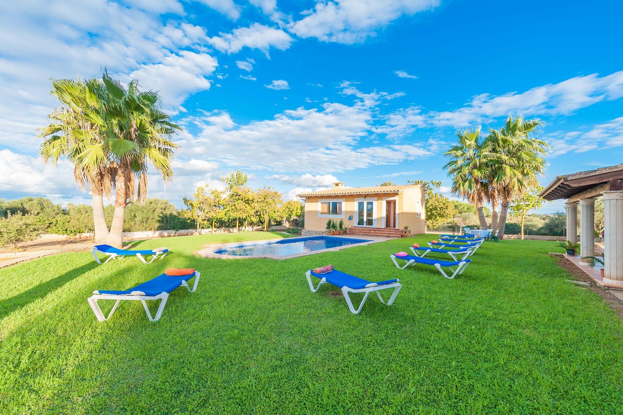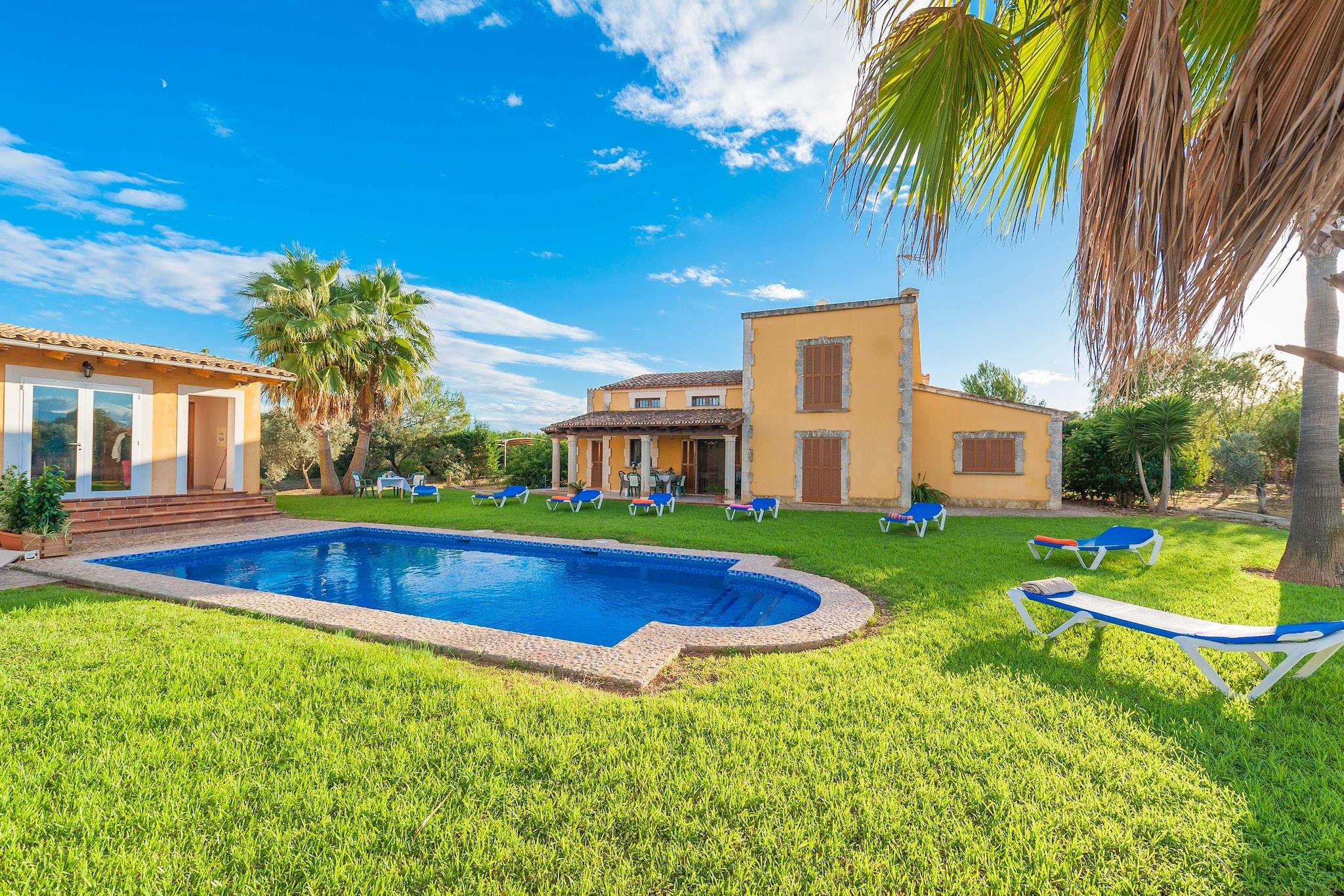 Villa sammen med charmerende funktioner giver et ideelt tilflugtssted for familier og venner, der kan rumme op til otte gæster fordelt på fire smukt indrettede soveværelser - tre med dobbeltsenge og et med to enkeltsenge. Den indbydende stue, der er udstyret med en behagelig sofa, er perfekt til afslapning, uanset om du læser en bog eller nyder satellit-tv. Gæsterne vil sætte pris på det veludstyrede køkken, komplet med vigtige apparater såsom en brødrister, blender, opvaskemaskine og gaskomfur. Ejendommen omfatter også parkeringsplads ved terrassen og en separat bygning med et ekstra køkken og grillplads ved poolen. Beliggende kun 4,7 km fra de fantastiske strande i Can Picafort og Capellans, er villaen ideelt beliggende for strandelskere. Det finkornede sand er perfekt til familieudflugter eller romantiske gåture, med masser af lokale barer og restauranter, der serverer lækker middelhavskøkken. Nærliggende attraktioner omfatter Playa de Muro, kendt for sin rolige atmosfære og krystalklare vand, og de charmerende gamle byer Alcúdia (16 km væk) og Pollença (ca. 20 km væk), hvor du kan udforske ugentlige markeder og brostensbelagte gader. Offentlige transportmuligheder såsom bus- og togstationer er bekvemt placeret for nem rejse rundt i området. Udendørsrummet er et af villaens højdepunkter, der byder på en rummelig terrasse med et stort spisebord til sommermåltider og en 10 x 5 meter pool til forfriskende svømmeture. Der er masser af muligheder for solbadning med otte liggestole, som gæsterne kan nyde. Mens du slapper af med en cocktail ved solnedgang, skaber den indbydende atmosfære de perfekte rammer for afslapning. Bemærk venligst, at kæledyr ikke er tilladt, og at afholdelse af arrangementer er forbudt. Denne villa lover en mindeværdig ferieoplevelse, der blander komfort med skønheden på Mallorca.