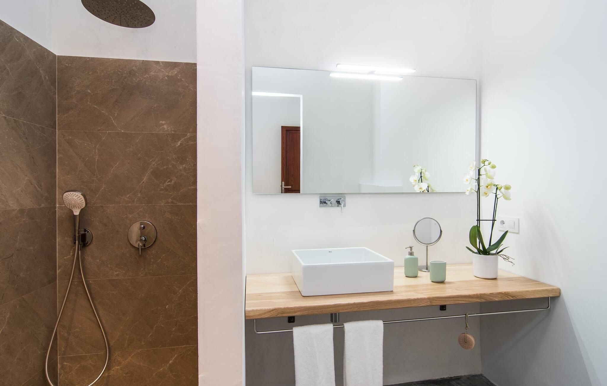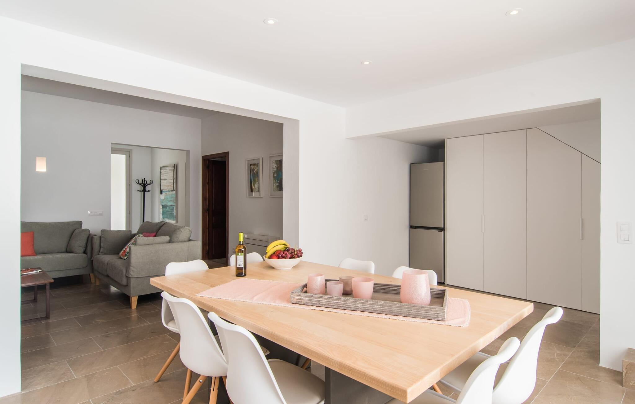 Enhver, der kan lide at komme rundt til fods, har alle de nødvendige faciliteter i nærheden og nyder at slentre gennem små byer, er heldige med dette rækkehus, især da det ligger midt i Artà - et gammelt, fremadstormende feriested, der stadig har små butikker og et livligt liv har et ugentligt marked og fremragende restauranter. Bilen kan parkeres på gaden og er derfor altid klar til den korte køretur til stranden. Selvom I er omgivet af naboer, tilbyder den hvide, fuldstændig renoverede ejendom "Na Valenta" jer en masse privatliv: den smukke lille gårdhave med den højkvalitets minipool, som sikrer, at I kan køle af i ny og næ, er beskyttet af høje mure. En moderne gasgrill er tilgængelig for at tilføje kød og fisk til den markedsfriske salat; Der er ingen nemmere måde at lave noget på, når I ikke har lyst til at gå ud. Den rummelige altanterrasse har en ekspansiv markise, så I kan få uhindret udsyn til handlingen. Og enhver, der kan lide enkelhed, elsker minimalistisk design og ønsker et behageligt køligt rum, især i varmt vejr, vil helt sikkert føle sig godt tilpas inden for "Na Valentas vægge". De to etager formidler et indtryk af sommerfriskhed og byder på møbler af høj kvalitet og værelser med aircondition. I kan også inkludere og tage en eller to andre personer med. Skub glasdøren op til terrassen i gården og forvandl den moderne cocina med mikroovn og opvaskemaskine til et udekøkken. En frisk brise blæser også fra det hyggelige sofaområde til indgangspartiet, som er muliggjort af de ekstra døråbninger. To soveværelser med dobbeltsenge (separate madrasser) deler badeværelset i stueetagen, mens et walk-in-closet og rummeligt bruseniche giver ekstra komfort. Trappen fører op til yderligere to værelser, hver med eget badeværelse og udgang til altan. Det åbne vaskerum gør disse rum ideelle som enkeltværelser. Dette totalrenoverede rækkehus med minimalistisk design, pool og balkonterrasse ligger i centrum af dette populære område i Artà, hvor Golgata ligger. Et ugentligt marked, et supermarked og et indkøbscenter samt restauranter og charmerende caféer er (næsten) lige uden for døren. jeres strandparadis på østkysten ligger kun 10 til 15 km væk, og Capdepera med sit slot og førsteklasses golfbane, Coves d'Artà og vandreområdet omkring Colònia de Sant Pere og Betlem er også kun en kort køretur væk . Bemærk venligst, at denne ejendom ikke accepterer ungdomsgrupper eller polterabender. En ungdomsgruppe på denne ejendom består af personer på 25 år eller derunder. Book ikke denne ejendom, hvis I er en ungdomsgruppe eller polterabend, da jeres reservation vil blive afvist, når den er booket, hvilket også kan være tilfældet ved ankomst til ejendommen eller under jeres ophold, og I vil ikke modtage en refusion