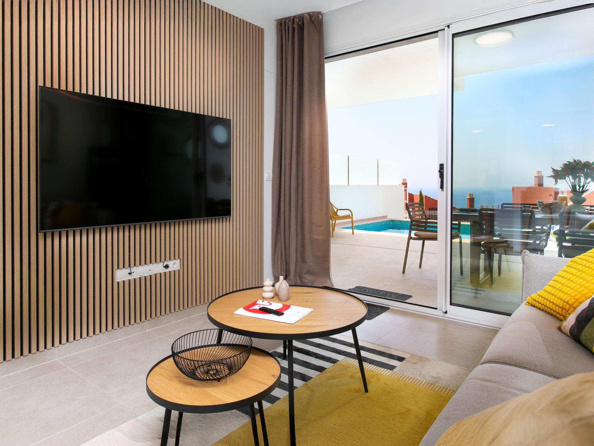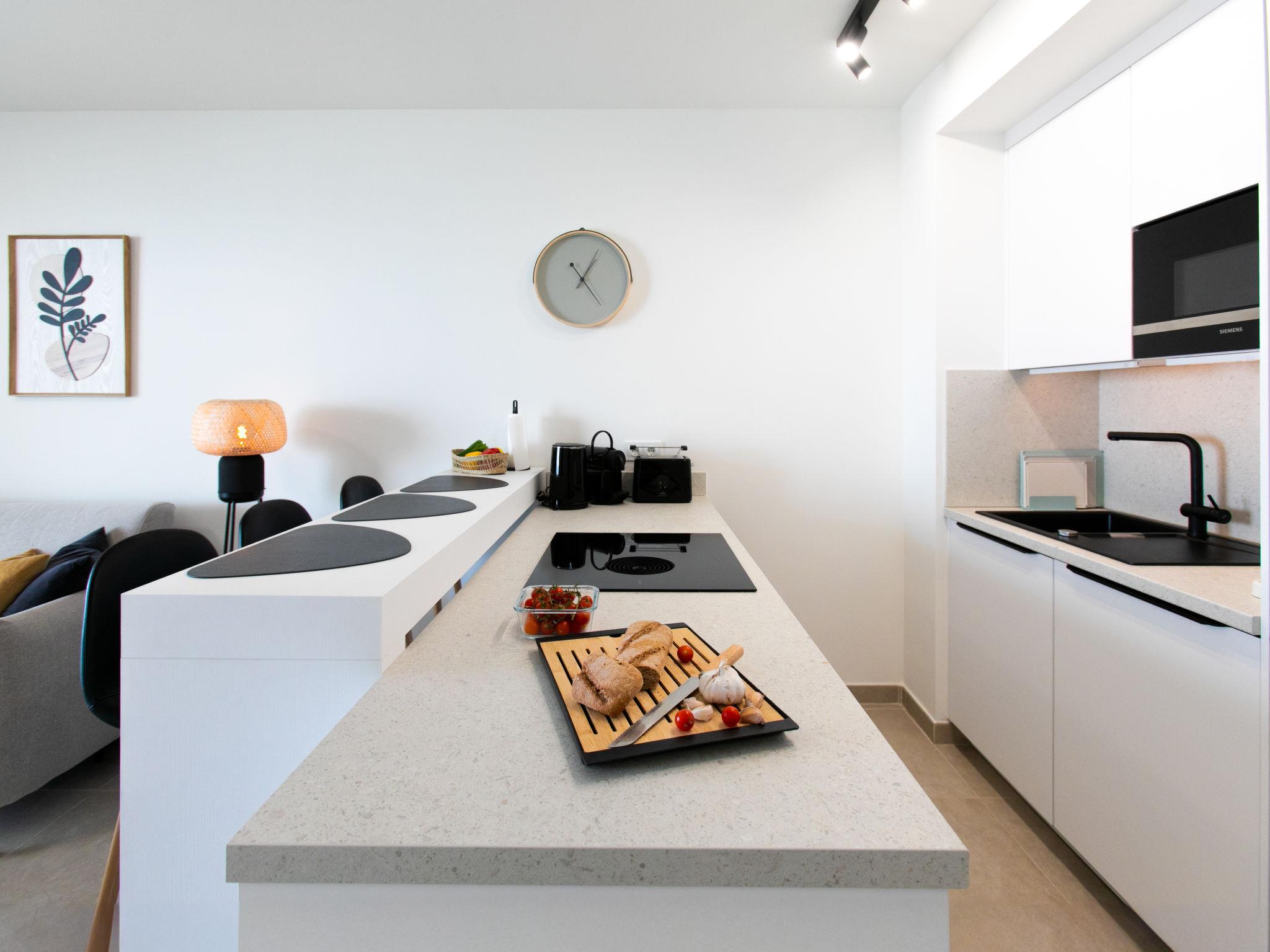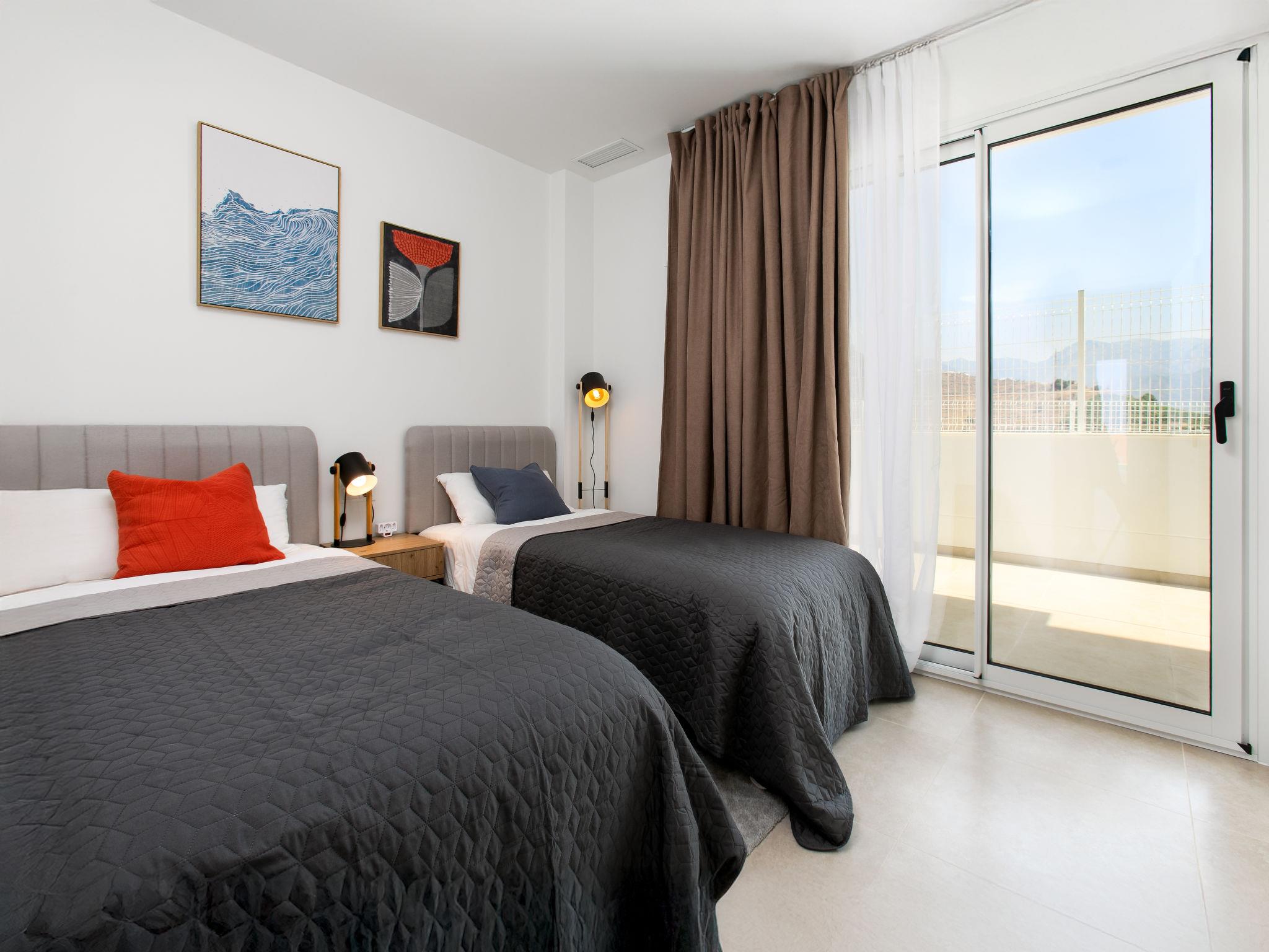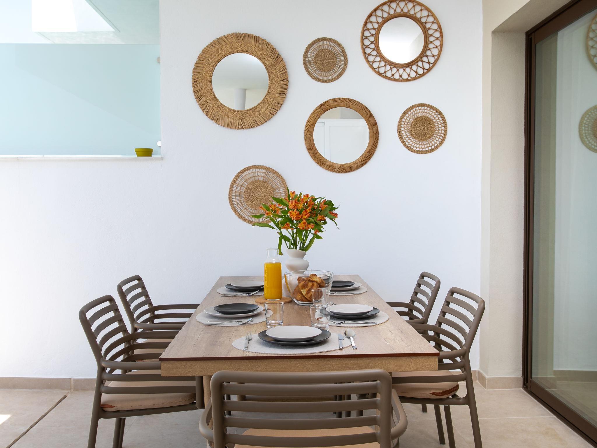 "Bayview Collection Free Spa & Padel", 3-room apartment 75 m2. Comfortable and cosy furnishings: living/dining room with digital TV. Exit to the terrace, to the swimming pool. 1 room with 1 french bed (180 cm, length 200 cm), shower/WC, air conditioning and forced-air heating. Exit to the terrace, to the swimming pool. 1 room with 2 beds (90 cm, length 200 cm), air conditioning and forced-air heating. Exit to the terrace, to the swimming pool. Open kitchen (oven, dishwasher, 4 ceramic glass hob hotplates, toaster, kettle, microwave, freezer, electric coffee machine). Shower/WC. Terrace. Terrace furniture, deck chairs. Marvellous view of the sea and the resort. Facilities: safe, iron, children's high chair, baby cot, hair dryer. Internet (WiFi, free). Parking space n 10 (roofed). Private pool can be heated. There is an extra charge for that if required. VUT7MA/94220 // Reg. Nr.: ESFCTU0000290130011203130000000000000000VUT/MA/942208