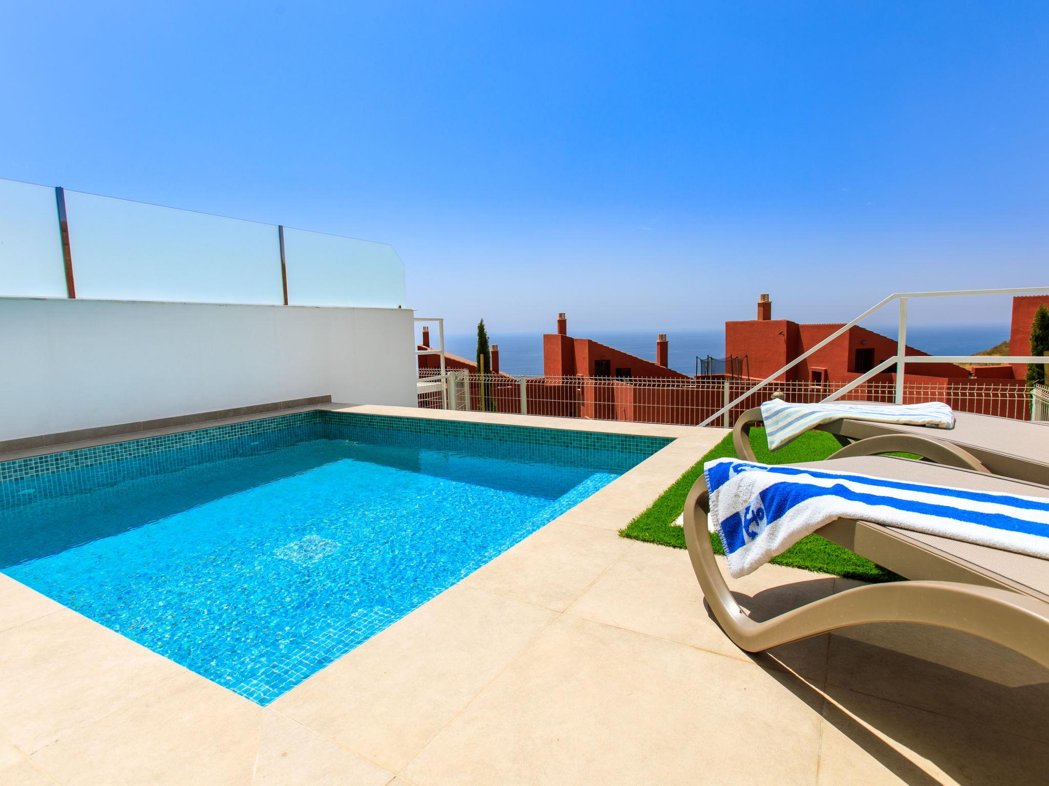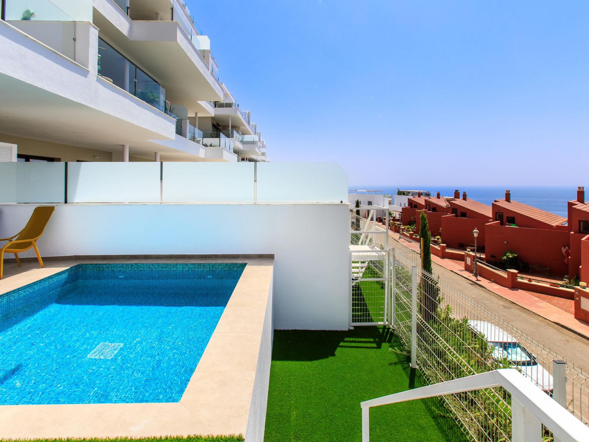 Very modern, beautiful apartment block "Bayview Collection free Spa & Padel", 3 storeys. In the resort 3 km from the centre of Nerja, 1 km from the sea, 1 km from the beach, in a cul-de-sac, south facing position. For shared use: 3 swimming pools, indoor pool (15 x 7 m, seasonal availability: 01.Jan. - 31.Dec.). WC in the pool area, children's pool, outdoor shower, hot tub, table tennis, arbour, pergola, terrace, garden furniture, barbecue, children's playground (slide, swing), pool maintenance by the owner/gardener. Private: swimming pool (3 x 4 m, depth 110 - 110 cm, seasonal availability: 01.Jan. - 31.Dec.). In the house: lounge with TV, sauna, fitness room, steam room, hot tub (all included), spa area for shared use, table tennis, billiard table, playroom, table football, lift. Parking space n 10. Shop 1 km, supermarket 1 km, restaurant 1 km, bus stop "Nerja" 2 m, railway station "Malaga" 57 km, sandy beach "Calaceite" 1 km, diving center 3 km. Sports harbour 17 km, marina 17 km, golf course (18 hole) 23 km. Nearby attractions: Museo de Nerja, Cuevas de Nerja, Acantilados de Maro, Aquavelis, Museo de Miel de Caña, La Alhambra. Well-known ski regions can easily be reached: Sierra Nevada. Hiking paths: Sierra Tejeda, Sierra Almijara. Please note: car recommended. The owner does not accept any youth groups. Loading and unloading of baggage is possible at the holiday house. Property ref. es5405.776.1 is situated on the same property. Neighbourhood highly sensitive to noise. Quietness and good behaviour expected. Amazing complex with 1 indoor swimming pools, darts, paddle court, gym, minigolf, climbing wall, pool table, small futbol and basket field. Part of terrace can be closed with a glass curtain, ideal to eat out on winter days.