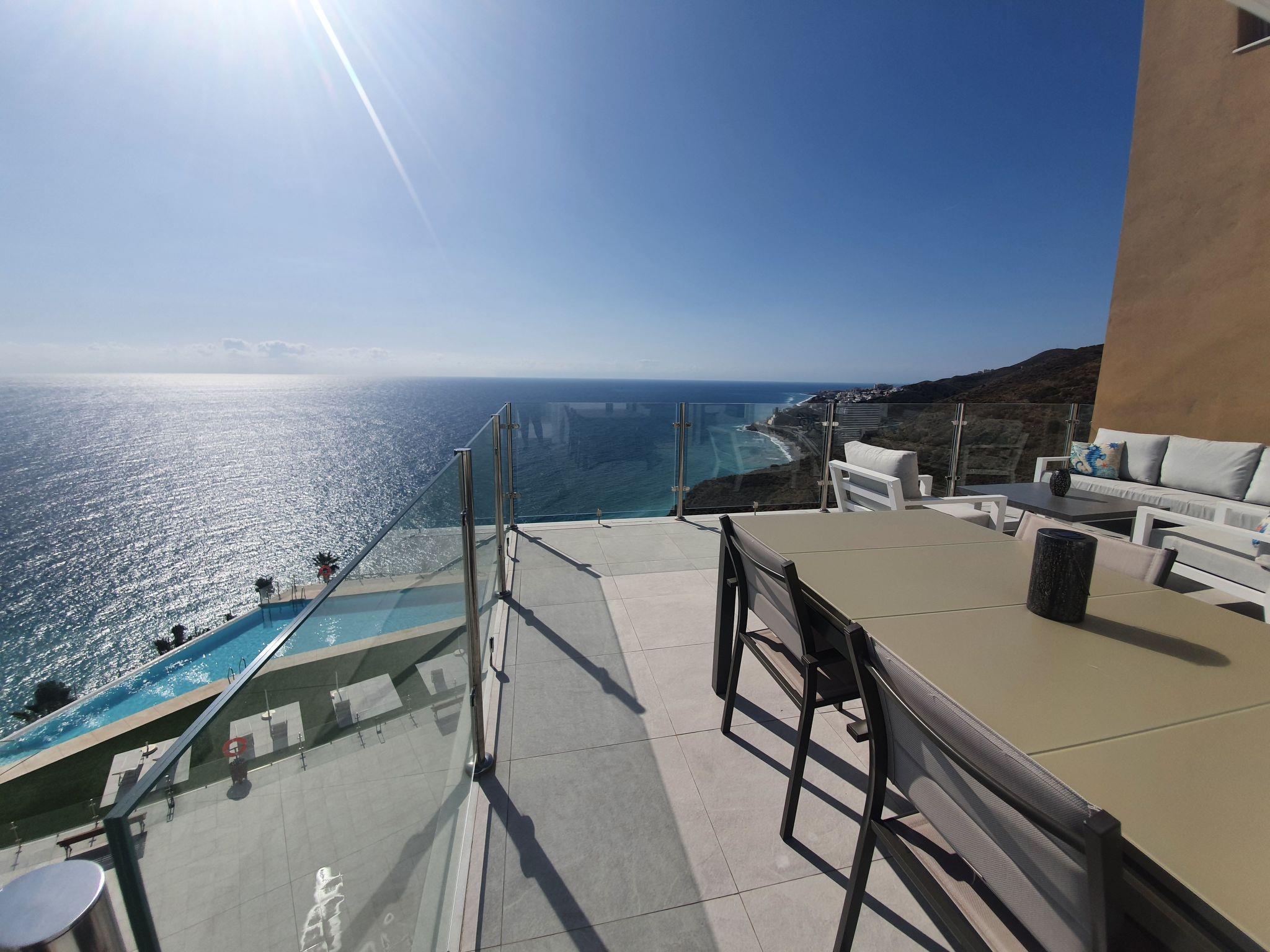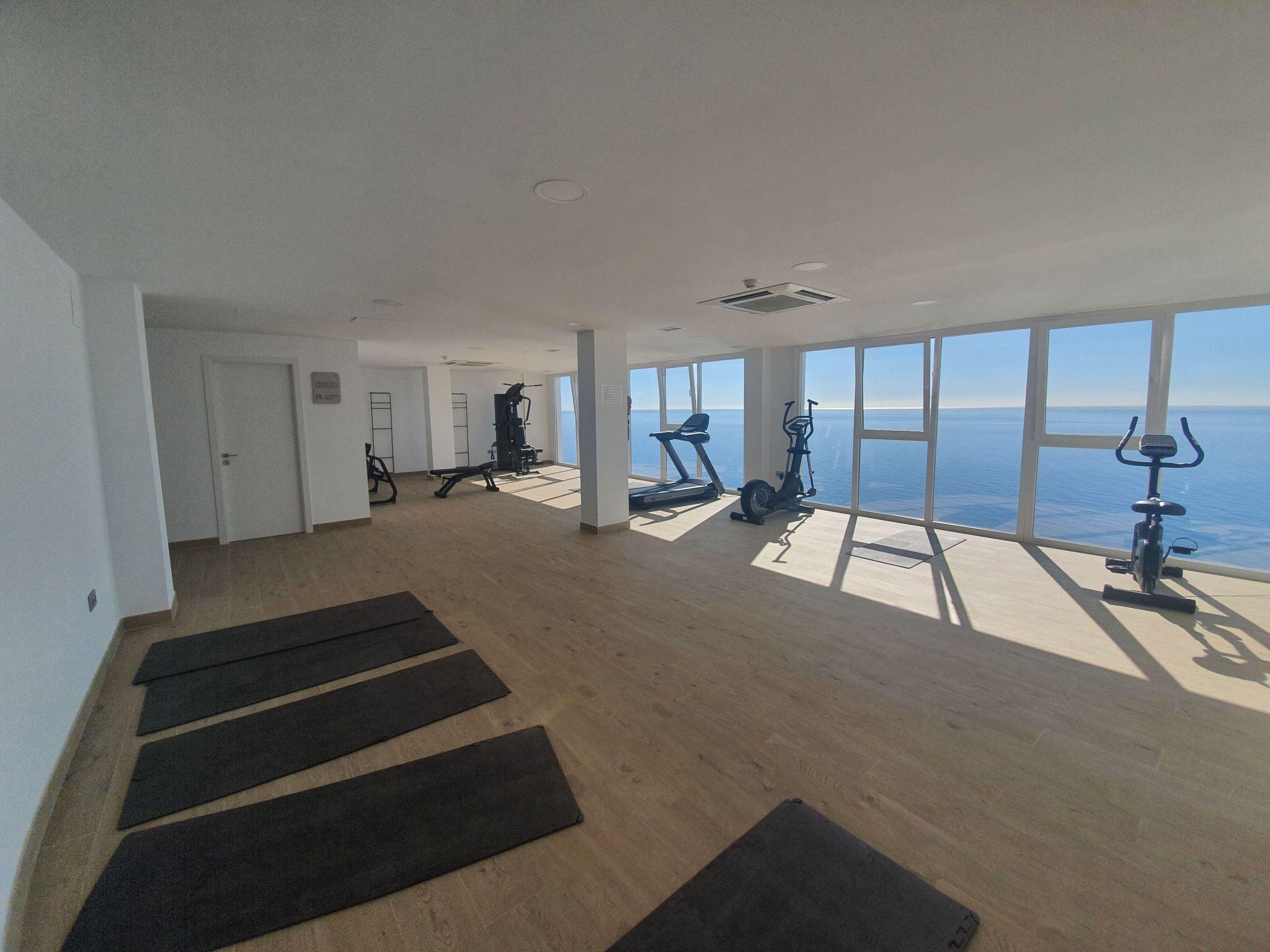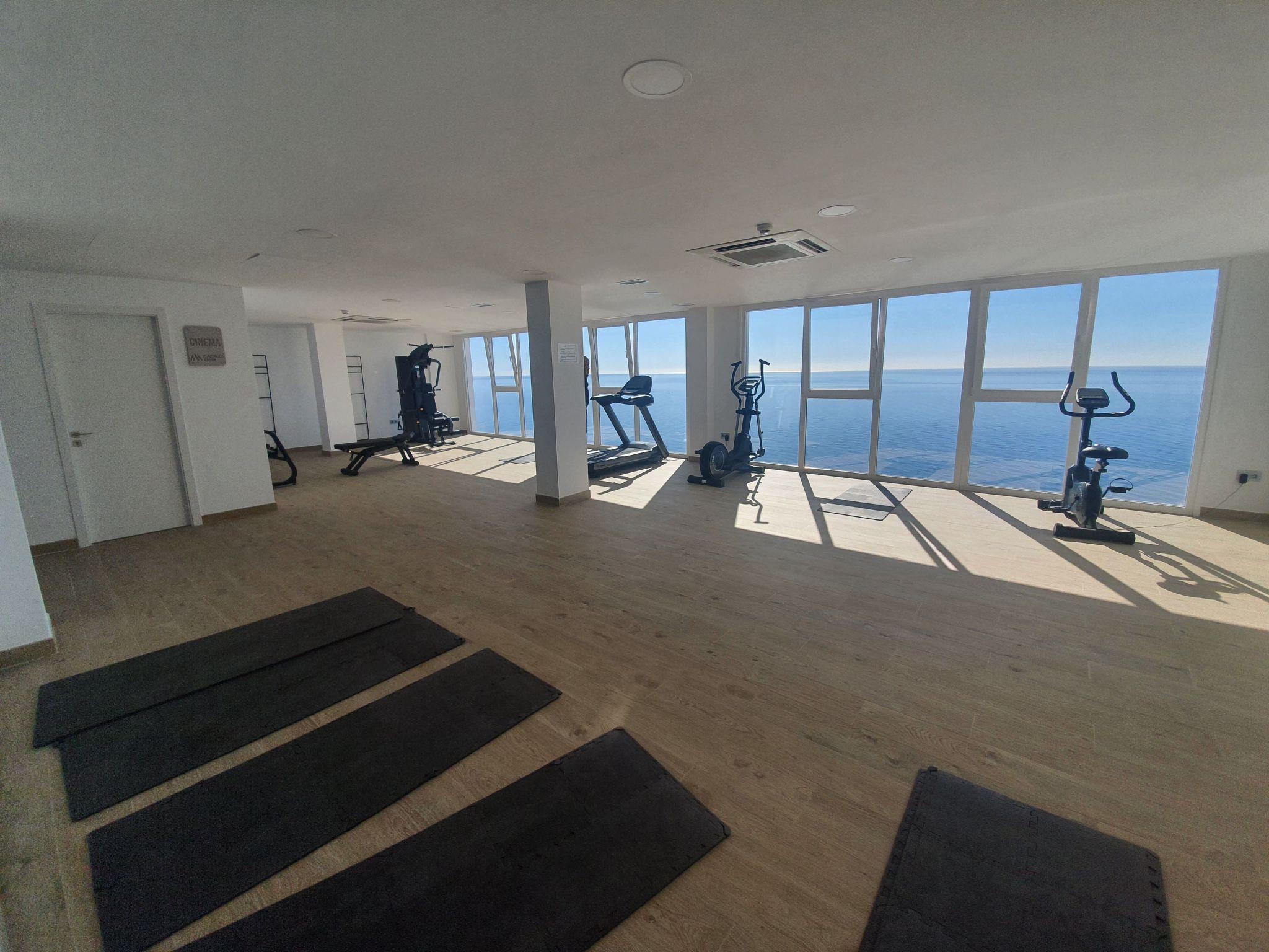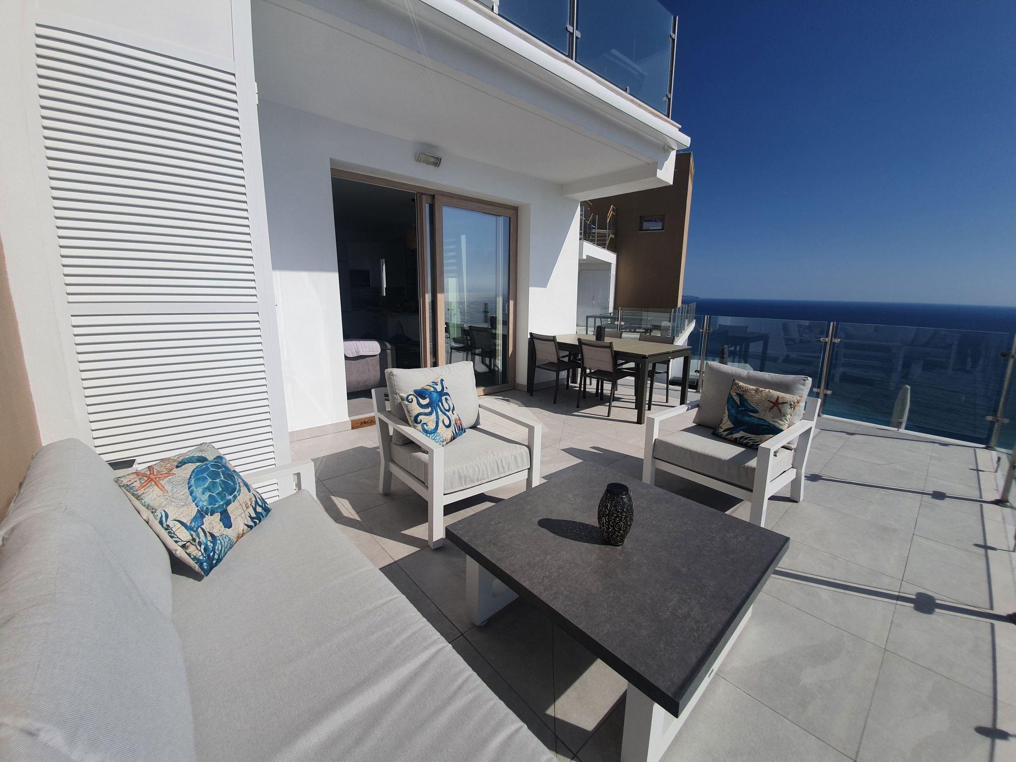 The private terrace area is spacious and has a dining area with table and chairs, as well as an outdoor chill out area comprising of aluminium and textured sofas and chairs. Two folding armchairs are provided. You will never tire of the views, which consist of the communal pool and gardens, the Mediterranean Sea in its entirety and, if you are lucky, you will see dolphins frolicking at certain times of the day.With regard to the complex, there is a large outdoor 'infinity' pool and an indoor pool. The latter is heated and is accompanied by a Jacuzzi and sauna. On the floor directly above the indoor pool is a fully equipped gymnasium with weights and machines. In addition, there is a large communal lounge area with access to the outdoor pool where you can sit and relax or play billiards. The outdoor communal areas are spacious and you will find an outdoor exercise area, table tennis, picnic area with barbecues and beautiful gardens with outstanding views. There is no shortage of things to do if you wish to venture outside the flat.