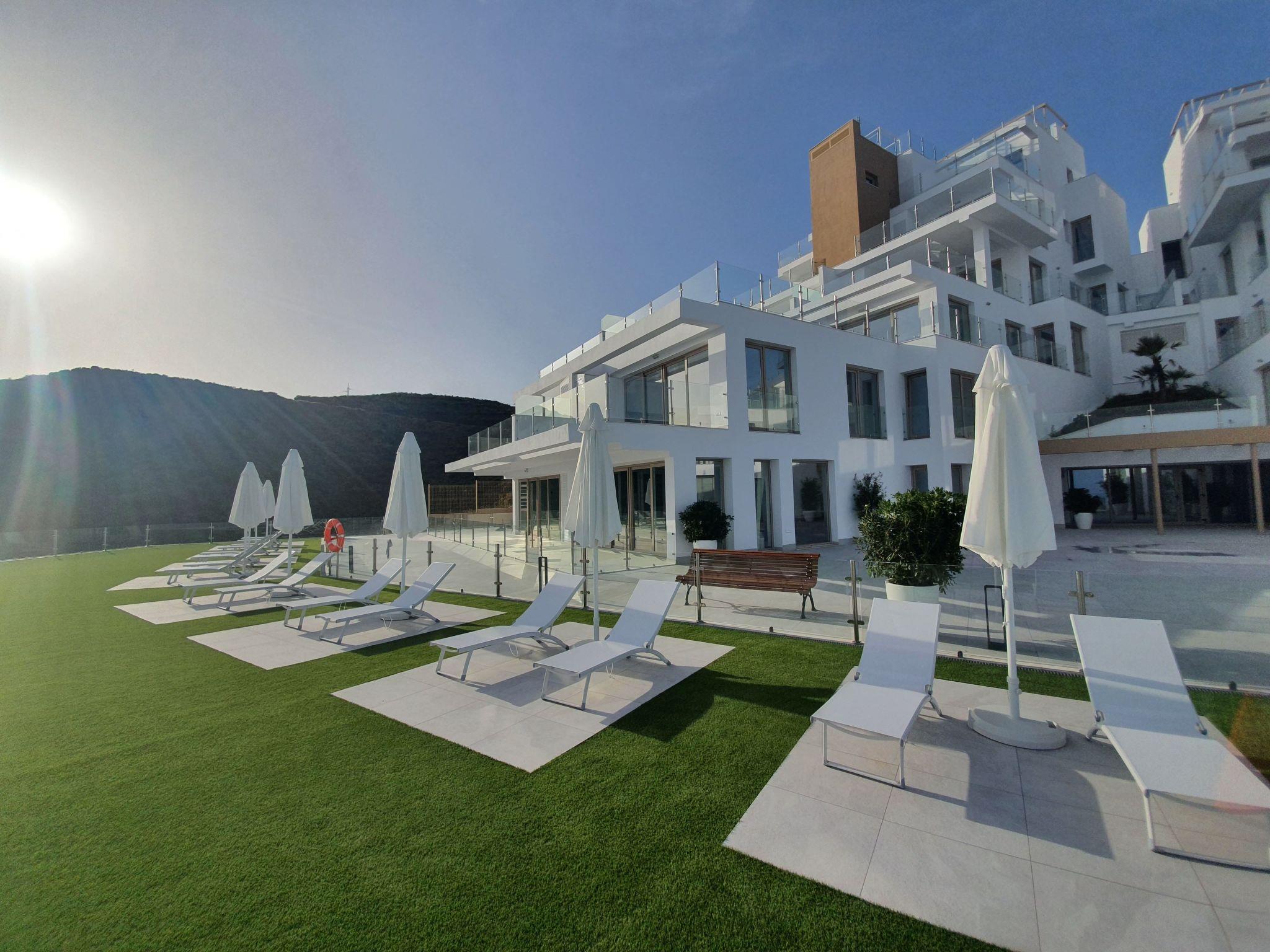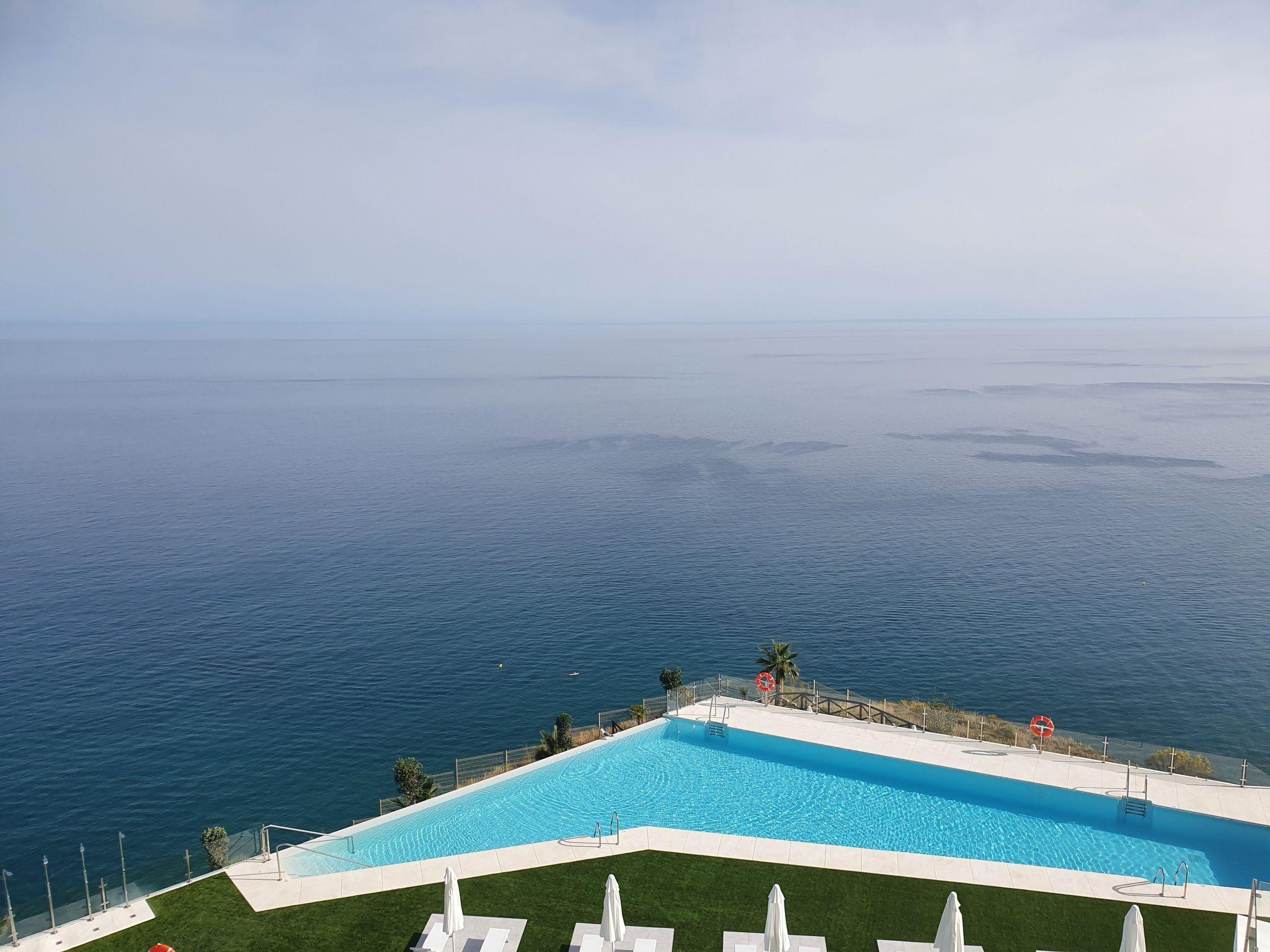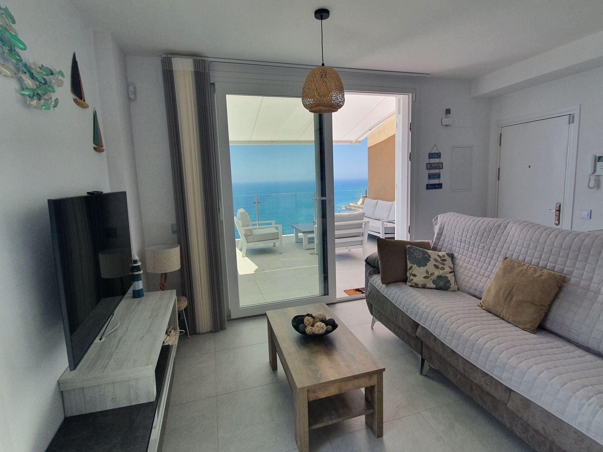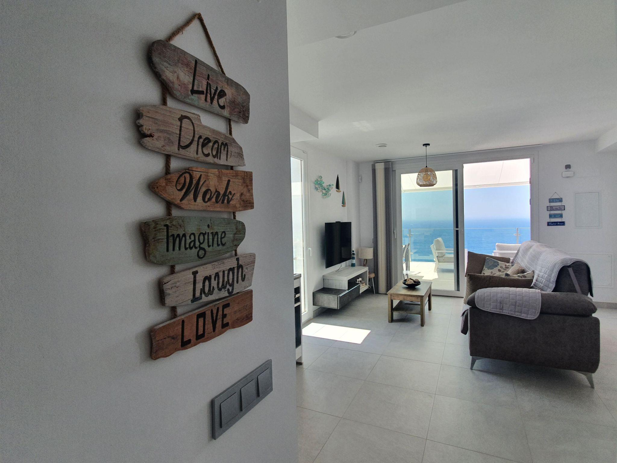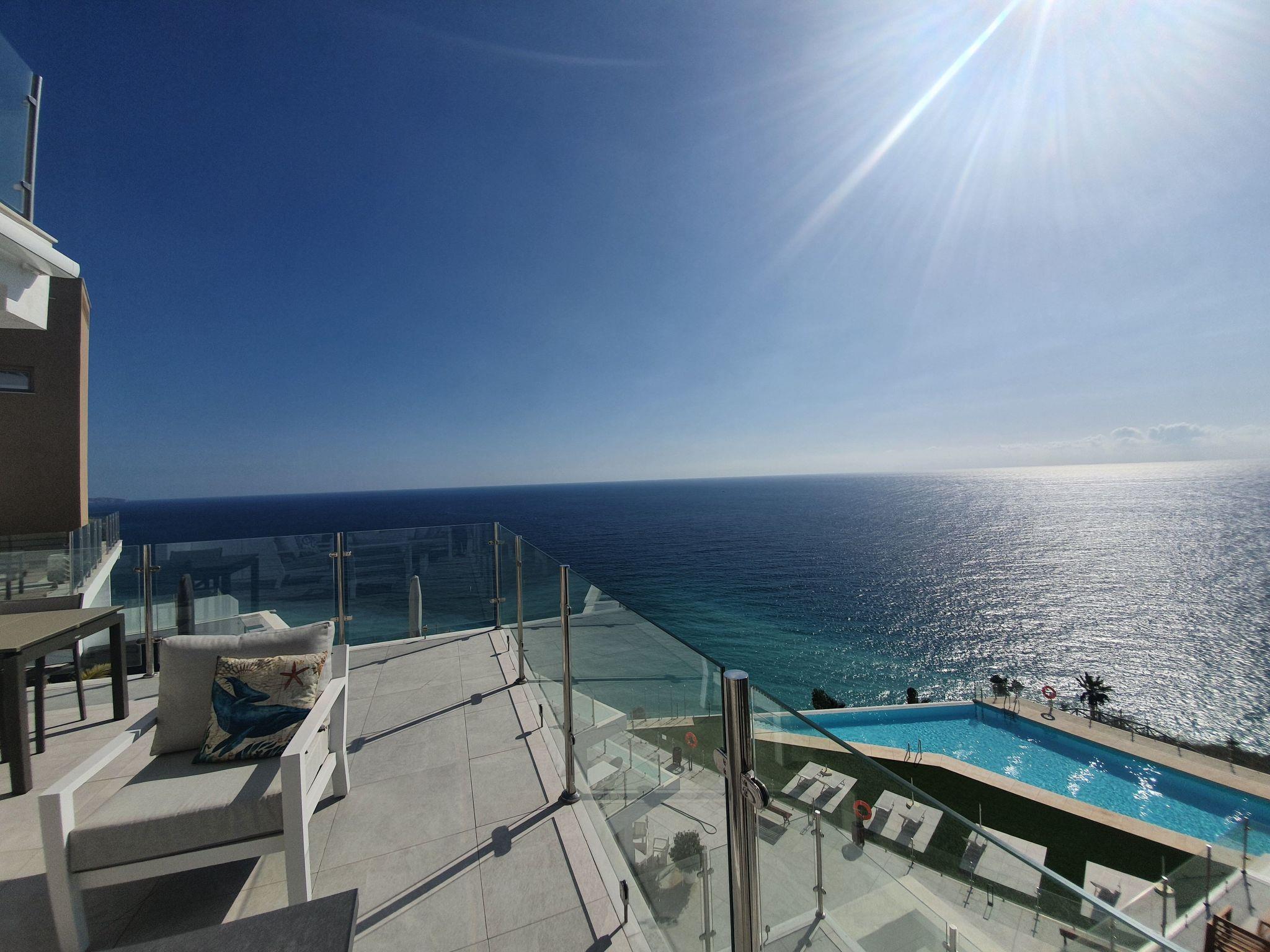 The private terrace area is spacious and has a dining area with table and chairs, as well as an outdoor chill out area comprising of aluminium and textured sofas and chairs. Two folding armchairs are provided. You will never tire of the views, which consist of the communal pool and gardens, the Mediterranean Sea in its entirety and, if you are lucky, you will see dolphins frolicking at certain times of the day.With regard to the complex, there is a large outdoor 'infinity' pool and an indoor pool. The latter is heated and is accompanied by a Jacuzzi and sauna. On the floor directly above the indoor pool is a fully equipped gymnasium with weights and machines. In addition, there is a large communal lounge area with access to the outdoor pool where you can sit and relax or play billiards. The outdoor communal areas are spacious and you will find an outdoor exercise area, table tennis, picnic area with barbecues and beautiful gardens with outstanding views. There is no shortage of things to do if you wish to venture outside the flat.