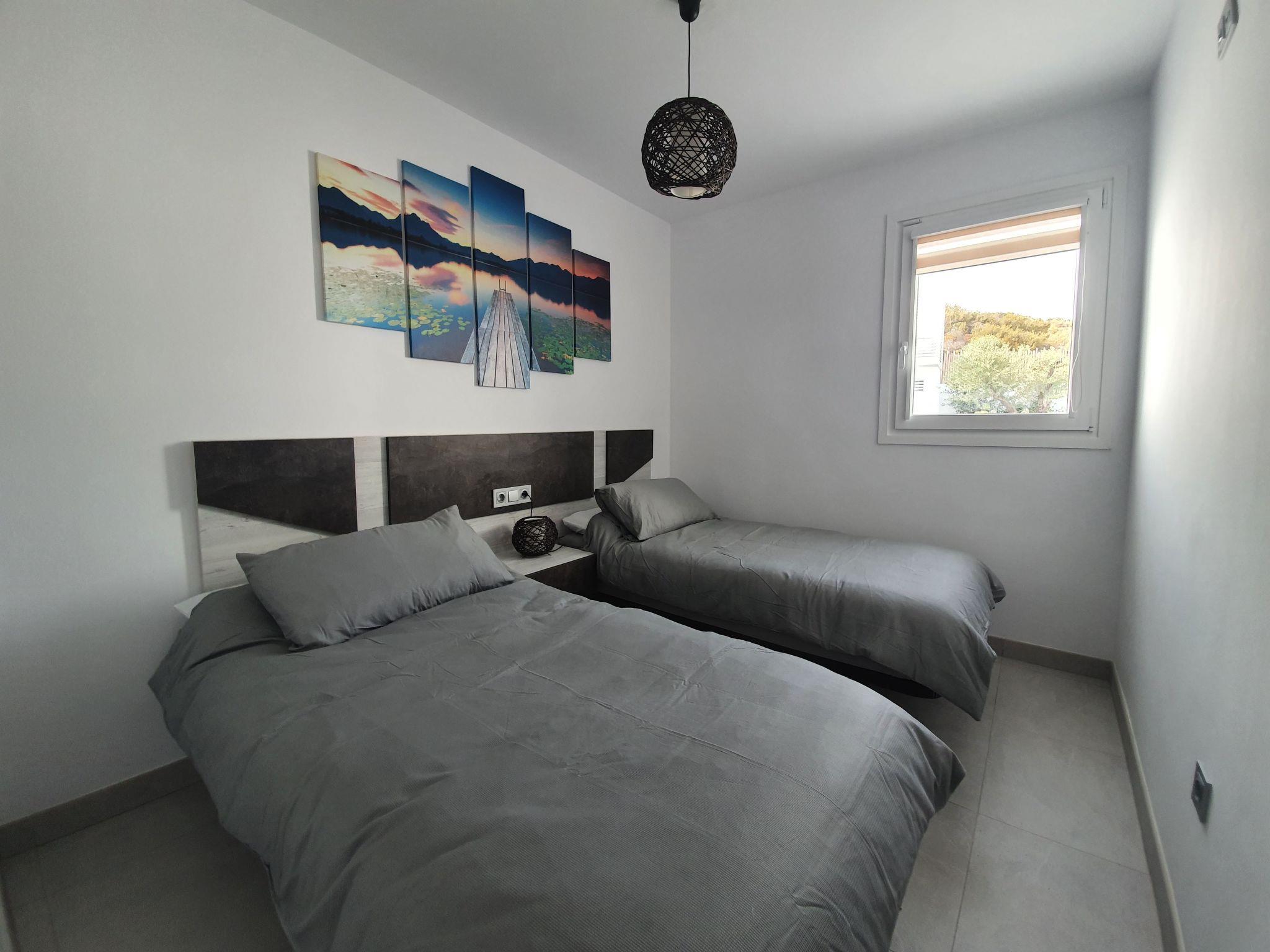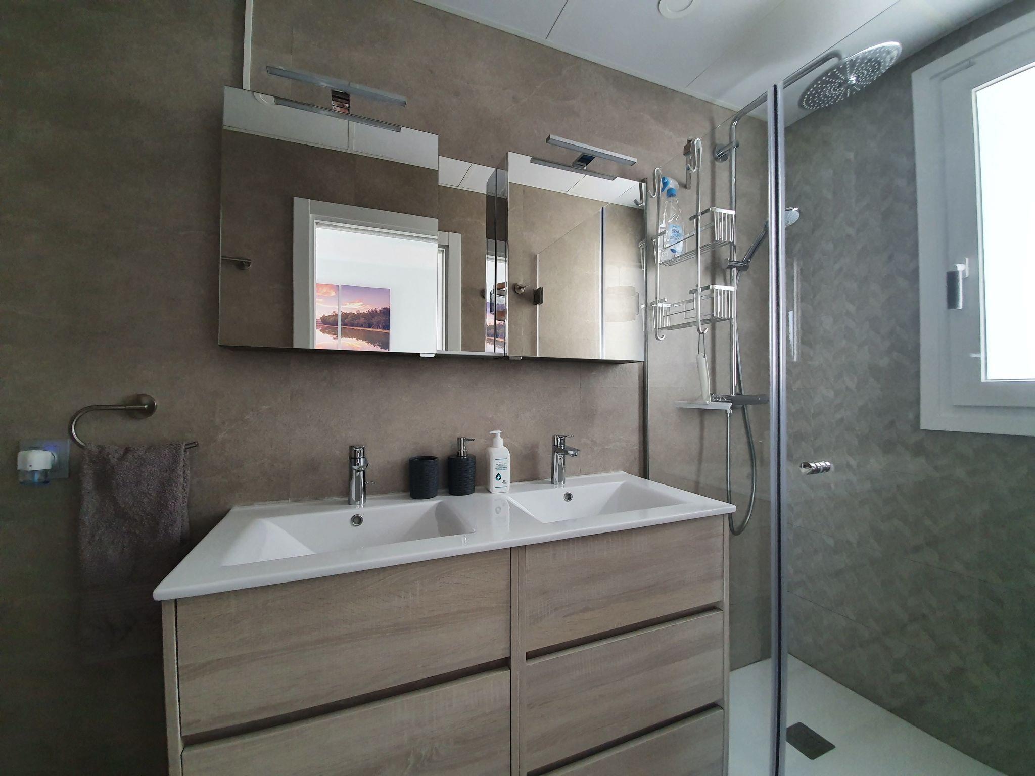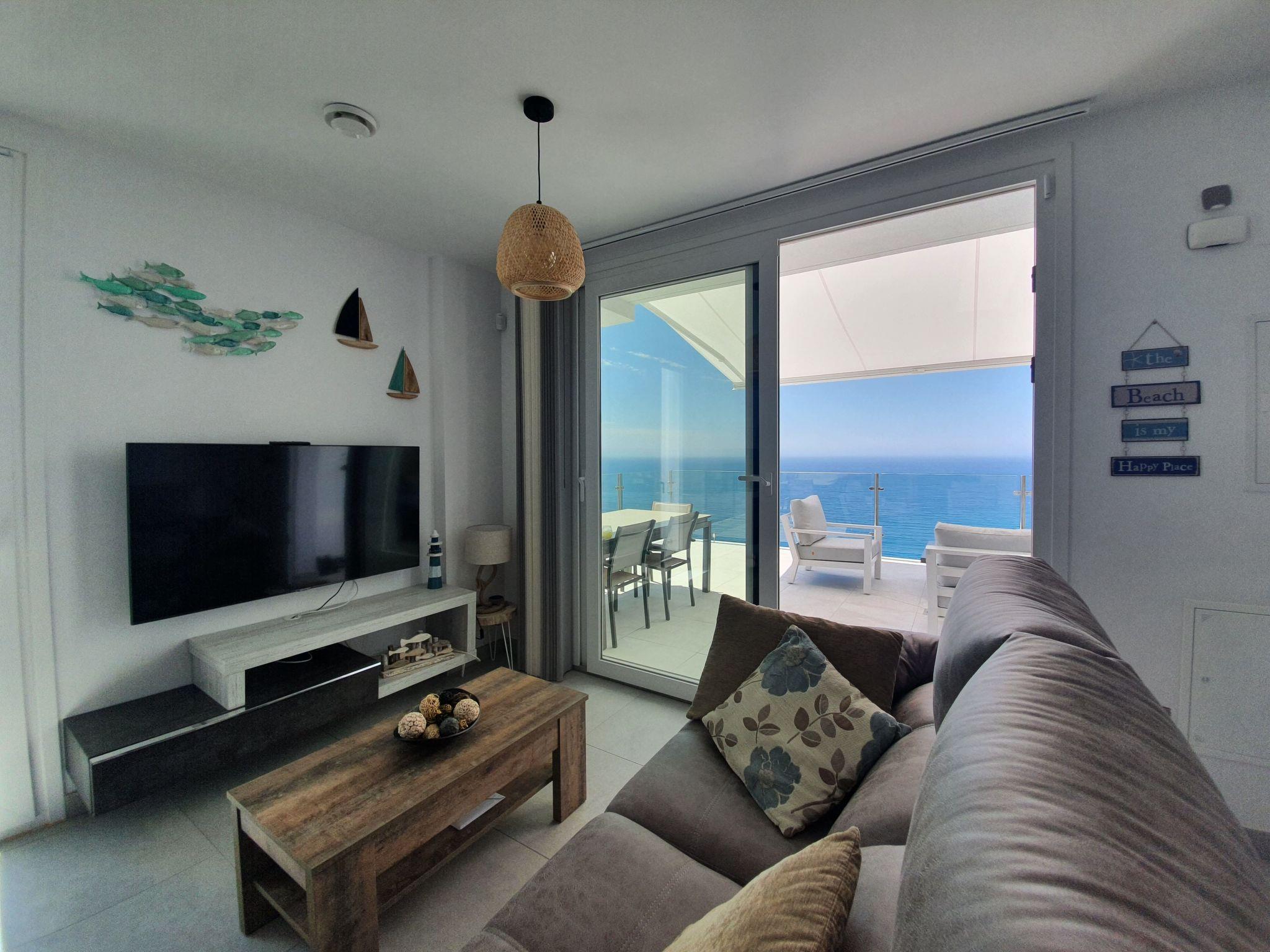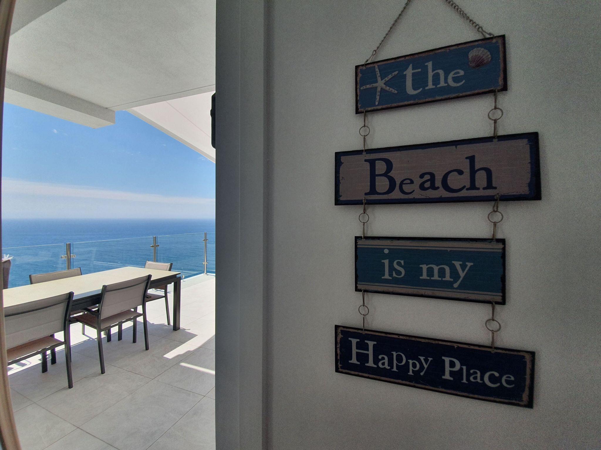 The flat consists of kitchen-dining room and living room together with double doors leading to a spectacular 30m2 terrace offering 180º south facing panoramic sea views and year round sunshine. The master bedroom has a large double bed (1.5m x 1.9m) with fitted wardrobe and ensuite bathroom with walk-in shower, double washbasin and WC. The second bedroom has twin beds (0.90m x 1.9m) and is equipped with a built-in wardrobe. The kitchen area is fully equipped with oven, induction hob, dishwasher, fridge freezer and microwave and all the necessary small appliances.the washing machine and tumble dryer are located in the terrace cabinet.the property has a high tech hot/cold air conditioning system throughout as well as underfloor heating for the colder months.