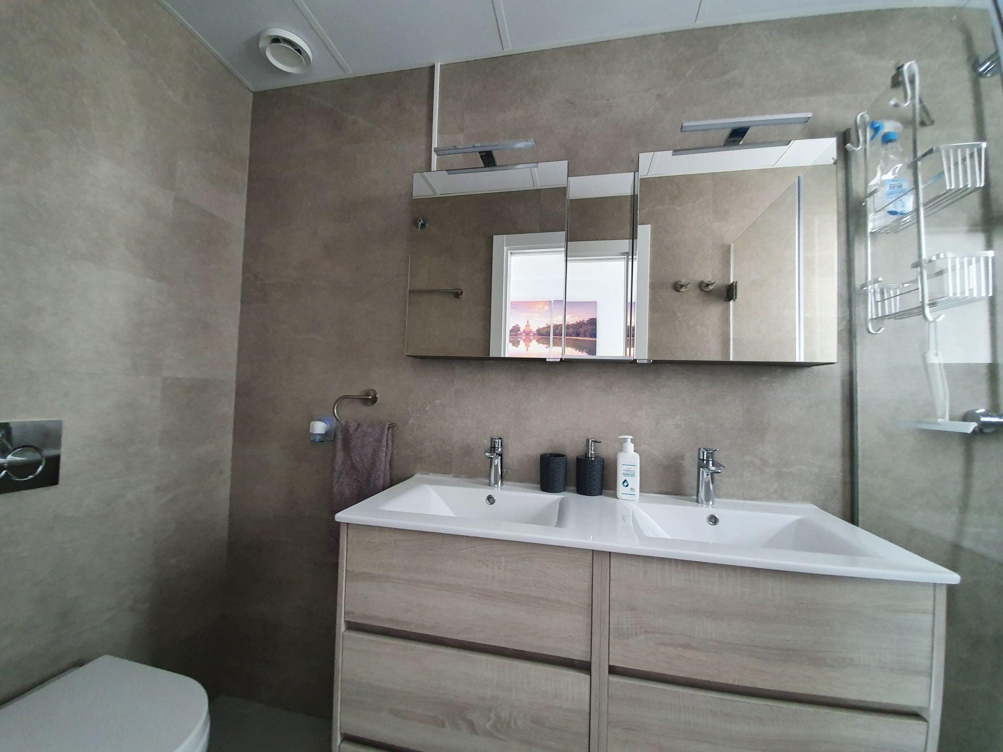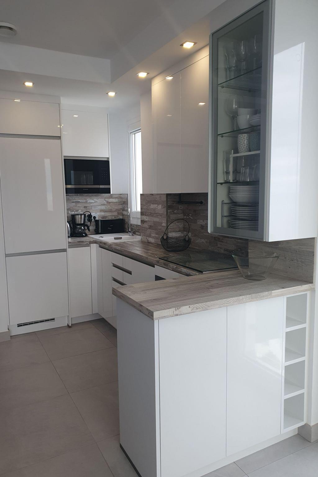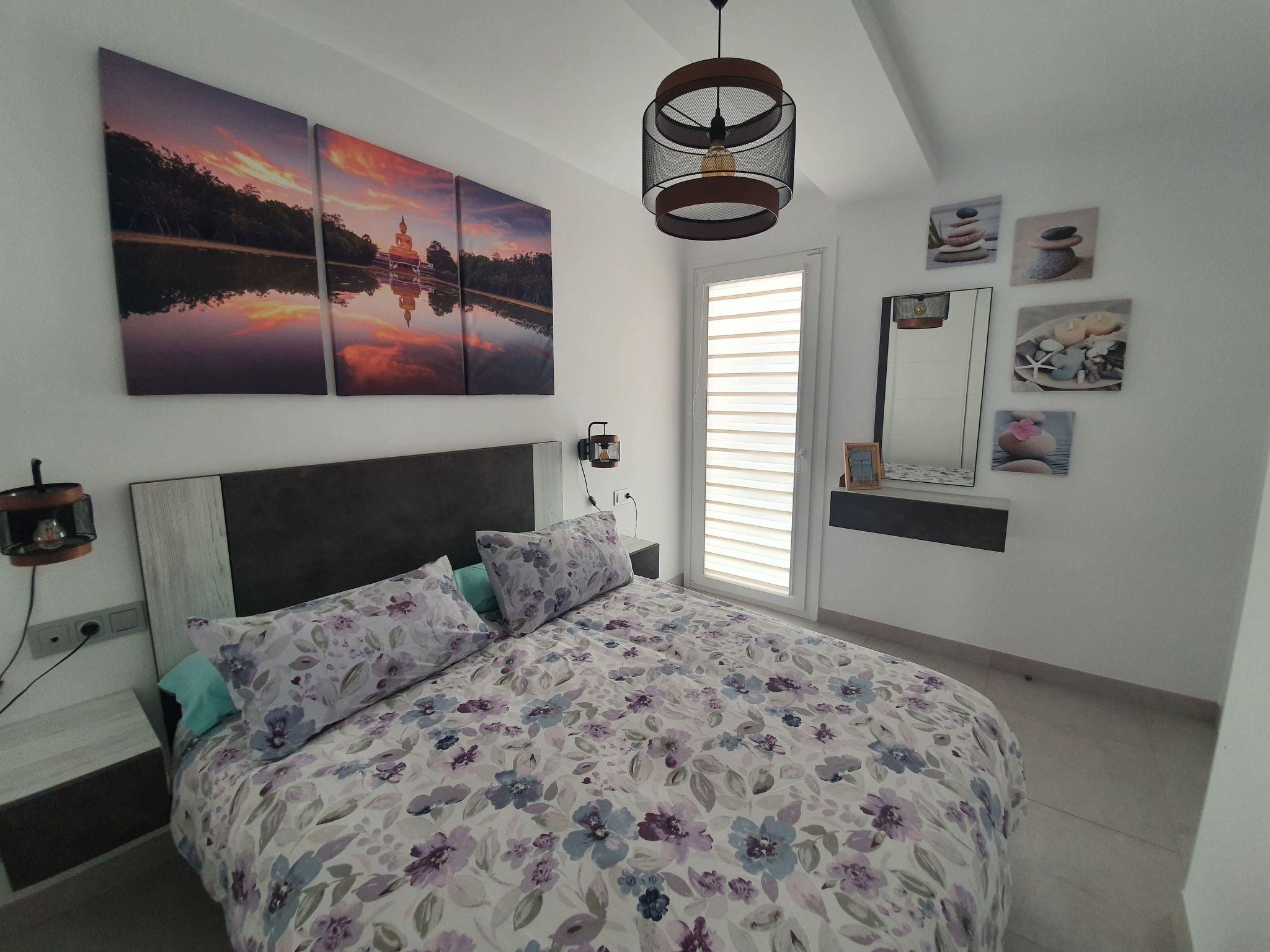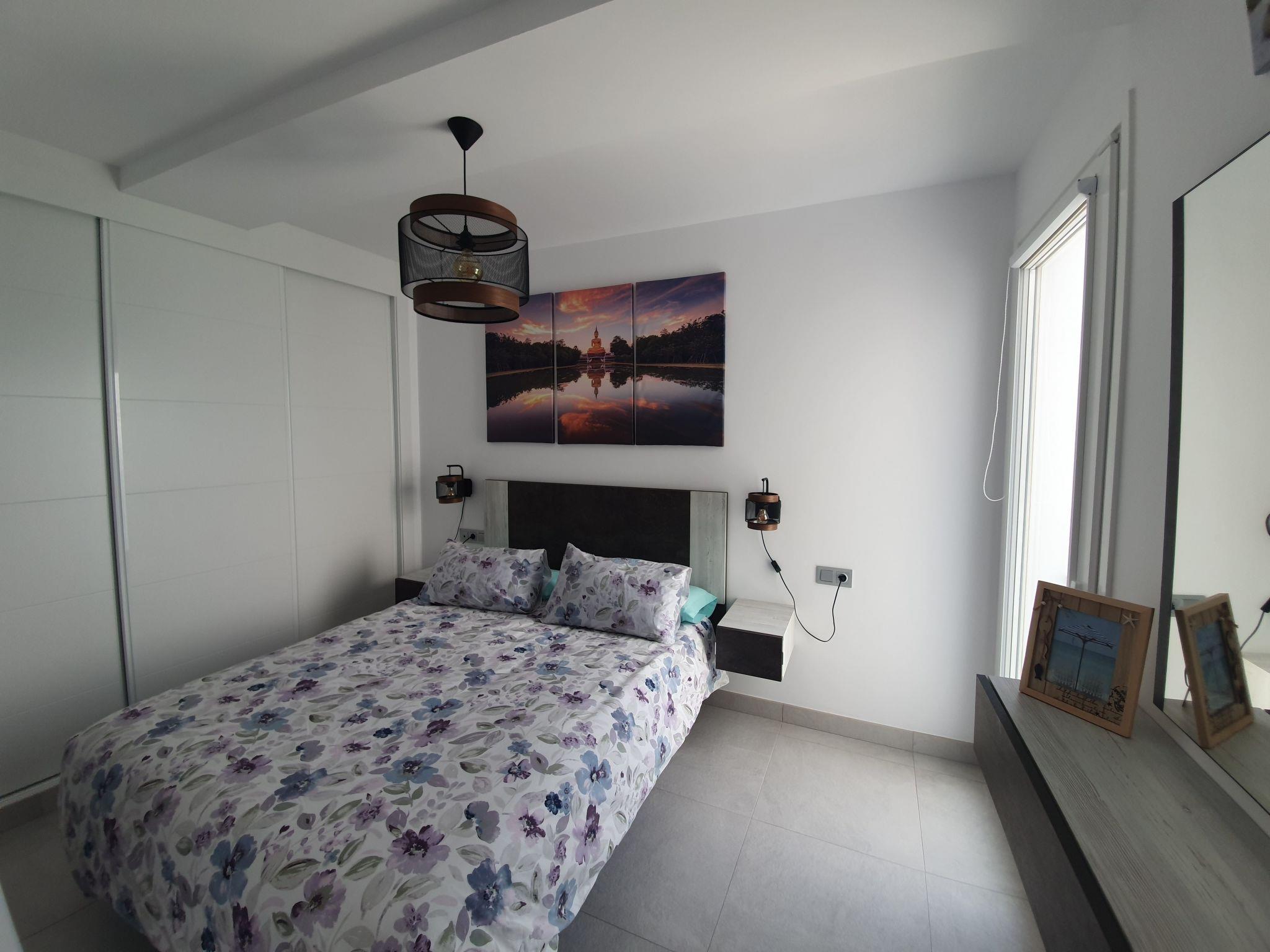 The flat consists of kitchen-dining room and living room together with double doors leading to a spectacular 30m2 terrace offering 180º south facing panoramic sea views and year round sunshine. The master bedroom has a large double bed (1.5m x 1.9m) with fitted wardrobe and ensuite bathroom with walk-in shower, double washbasin and WC. The second bedroom has twin beds (0.90m x 1.9m) and is equipped with a built-in wardrobe. The kitchen area is fully equipped with oven, induction hob, dishwasher, fridge freezer and microwave and all the necessary small appliances.the washing machine and tumble dryer are located in the terrace cabinet.the property has a high tech hot/cold air conditioning system throughout as well as underfloor heating for the colder months.