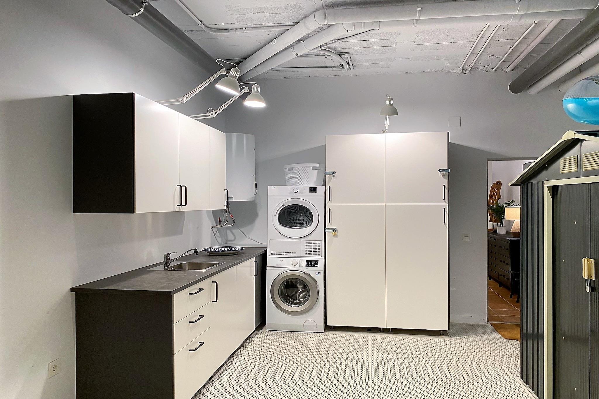 Stueetage: (åbent køkken(elkedel, brødrister, kaffemaskine, ovn, mikrobølgeovn, opvaskemaskine , køleskab, fryser, ), stue / spisestue(Fjernsyn, spisebord, sofahjørne), soveværelse(dobbeltseng), badeværelse(bruser), Internetadgang) På 1. etage: (soveværelse(dobbeltseng), soveværelse(køjeseng, køjeseng), badeværelse(bruser)) garage, tørretumbler, vaskemaskine, klimaanlæg, terrasse, grill, swimmingpool(deles med andre gæster), strygejern, føntørrer, Wine glasses