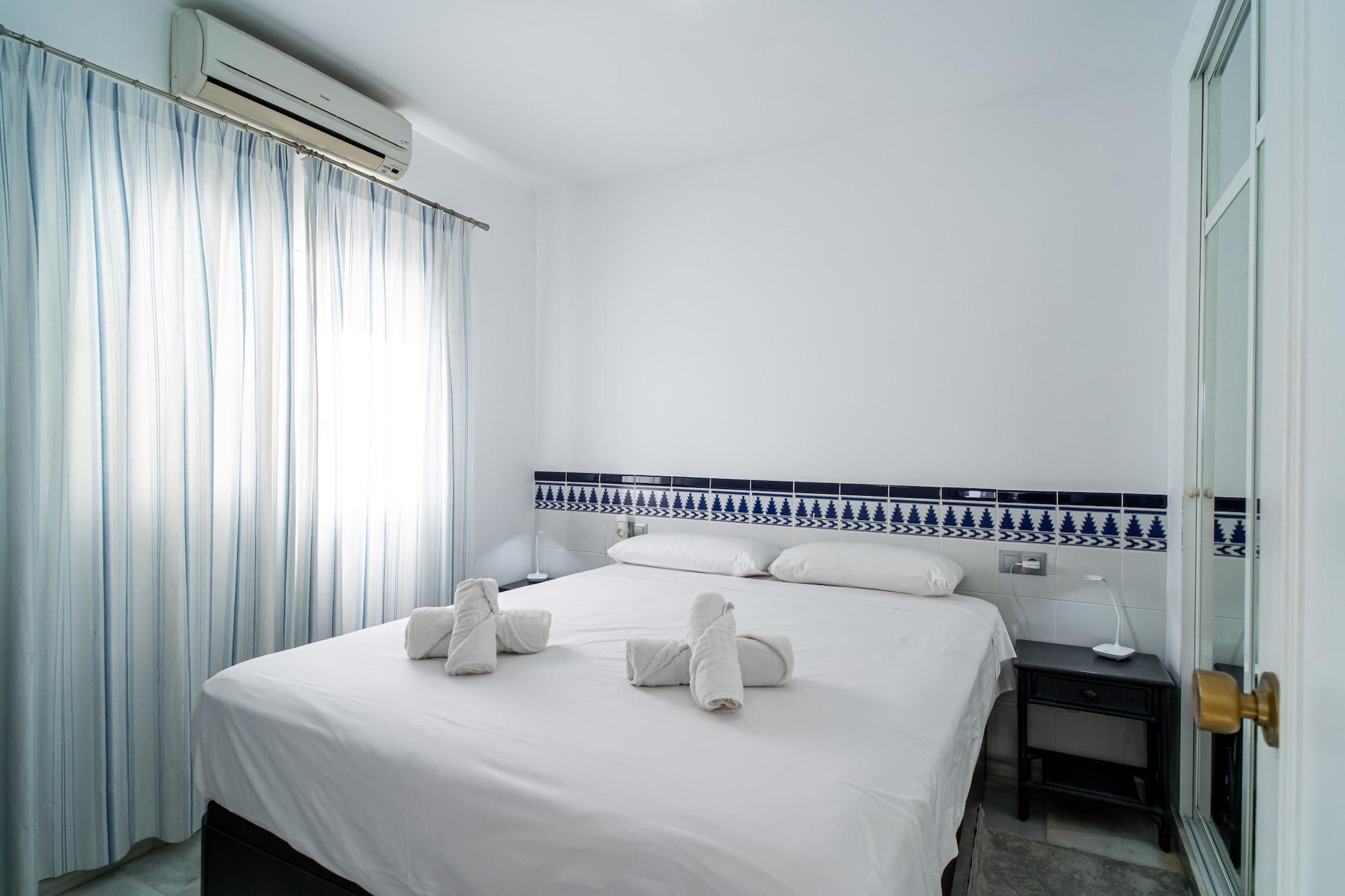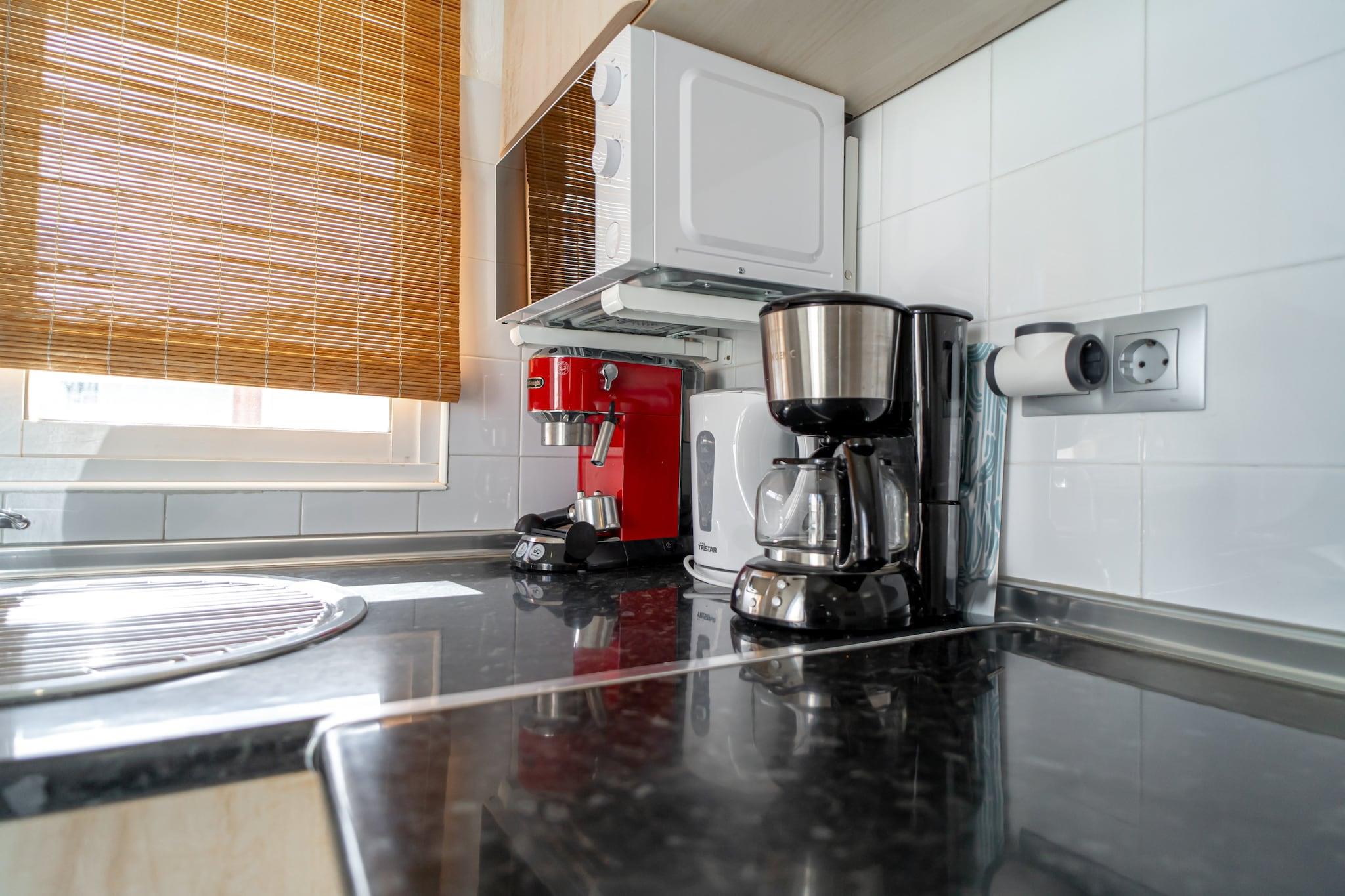 Denne lyse ferielejlighed er en moderne lejlighed med komfort og panoramaudsigt, perfekt til par, der søger en fredelig ferie ved kysten. Ejendommen har et rummeligt soveværelse med en 160x200 cm dobbeltseng og aircondition overalt for at sikre et behageligt ophold året rundt. Stuen har et hyggeligt siddeområde med direkte adgang til en privat terrasse, ideel til afslapning efter en dag på stranden. Selvom ejendommen ikke er kæledyrsvenlig, tilbyder den valgfri ekstraudstyr såsom en velkomstpakke, babyseng og højstol for at øge gæsternes bekvemmelighed. Udendørs servering og en grill på terrassen indbyder til måltider under åben himmel med spektakulær udsigt over havet og bjergene. Lejligheden ligger i et roligt område af Nerja, kun 600 meter fra den populære Burriana-strand, kendt for sin pulserende atmosfære, restauranter ved stranden og vandaktiviteter, herunder kajaksejlads og paddlesurfing. Supermarkeder som Mercadona og Carrefour ligger også kun 600 meter væk, hvilket gør det nemt at handle dagligvarer. Et lokalt busstoppested 200 meter fra ejendommen forbinder gæsterne med resten af byen, mens der er nem gadeparkering, selv i højsæsonen. Lufthavnstransport kan også arrangeres for en problemfri rejseoplevelse. Lejligheden har et fuldt udstyret åbent køkken, perfekt til at tilberede måltider med moderne apparater og madlavningsudstyr. Højhastighedsinternet og tv sørger for underholdning, mens det rene og velholdte badeværelse sikrer komfort under dit ophold.