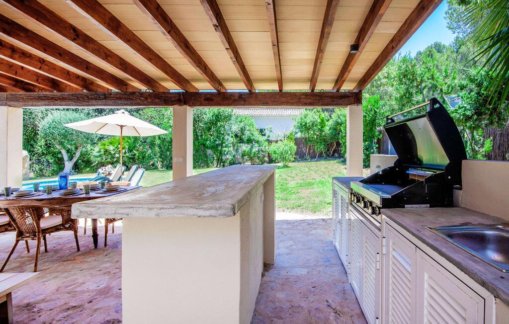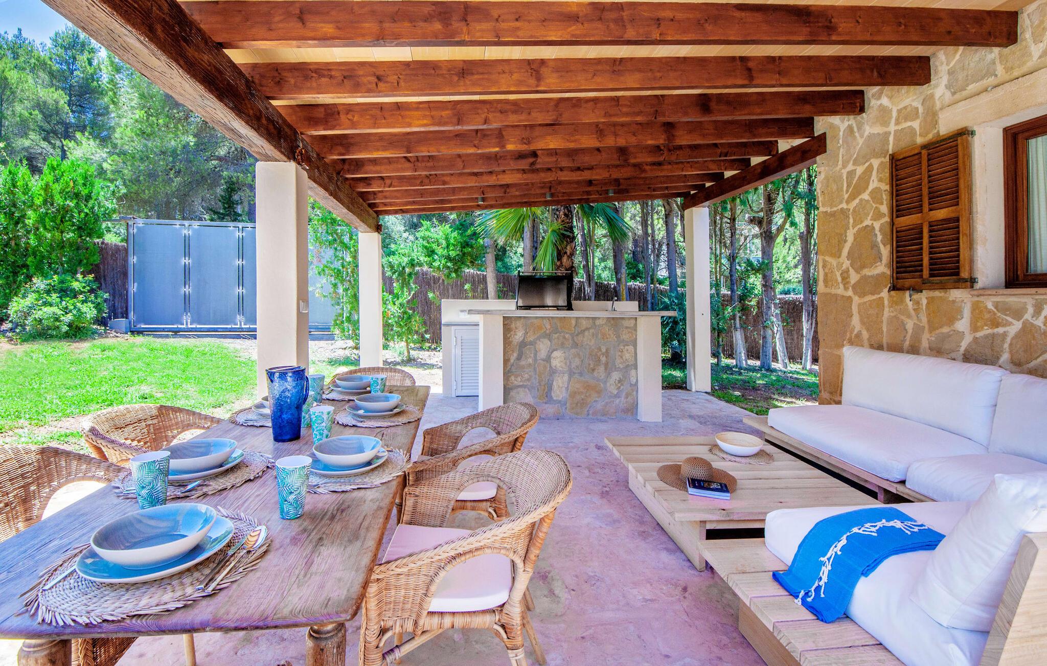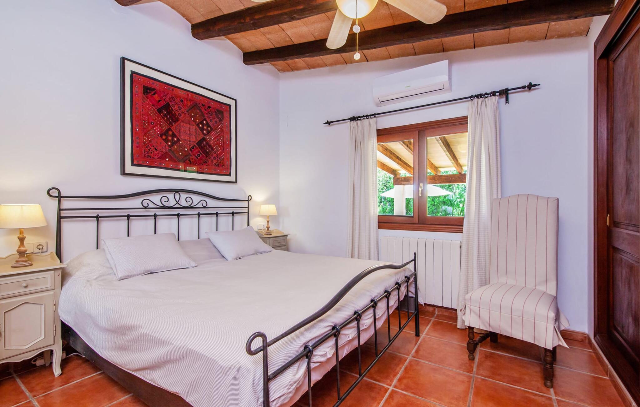 Den mallorcanske villa "Nostra Caseta" er det perfekte feriehus for familier og venner. Den usædvanligt bekvemme beliggenhed i boligområdet Bonaire, langt væk fra masseturismen, er ideel. Ferievillaen kombinerer den typiske finca-følelse med fordelene ved lokale faciliteter lige uden for døren. Det rustikke, traditionelle mallorcanske stenhus er omgivet af en rummelig græsplæne med gamle oliventræer og en indlejret pool. Den organisk formede pool med søstjernemosaik inviterer jer til privat svømme og slappe af. Efter jeres svømmetur kan I slappe af på liggestolene omgivet af den typiske kystvegetation på stenterrassen eller spille et spil bordtennis. Det fænomenale udekøkken er tilgængeligt uanset vejret, da det er overdækket sammen med spise- og loungeområdet ved siden af. En hyggelig grill tidligt på aftenen er et must - den store gasgrill, drikkevarekøleskab og bar hjælper jer med at fejre slutningen af dagen på den L-formede udendørs sofa. Den luftige veranda på forsiden af huset byder på alternative sidde- og spiseområder med udsigt over lystbådehavnen, havet og Tramuntana-bjergene, der fører til Cap de Formentor. Derfra fører en indbydende buegang direkte ind i det indre af den drømmende ferievilla, hvis navn hurtigt bliver jeres motto: "Vores Hus". Familier kan også føle sig hjemme her med et hoveddobbeltværelse, et mindre dobbeltværelse og to dobbeltværelser. Den fuldt klimatiserede bolig har tre moderne badeværelser, hvoraf to er en suite. Alle værelser er i stueetagen. Den åbne planløsning og spisestue i typisk rustik mallorcansk stil blander spanske antikviteter med afrikanske og indiske tekstiler og komfortable moderne møbler, der fuldender villaens afslappede atmosfære. Det fuldt udstyrede køkken med udgang til haven fuldender sommerhusoplevelsen på Mallorca. Grundet centralvarmen kan villaen i en drømmebeliggenhed lejes hele året rundt og med fiberoptisk WiFi kan derfor bruges til hjemmekontorformål selv i den milde Mallorca-vinter. Villa "Nostra Caseta" er enestående med en frodig have, et overdådigt udendørs køkken og afslapningsområde og en privat pool. Dette skønne feriehus med finca-stemning ligger foran Bonaires lystbådehavn med fire restauranter, et minimarked og flere afsondrede strande, alt i gåafstand. Dykning, coasteering og kystvandring er muligt på Bonaire. Villaen ligger ved siden af en fantastisk chill out restaurant, som er et besøg værd. I højsæsonen er der DJ indtil kl. 22.30 3-4 aftener om ugen. Den historiske befæstede by Alcúdia ligger kun en kort køretur eller gåtur derfra, og et besøg i historiske Pollensa eller det livlige Puerto Pollensa er blot et par kilometer væk. Talrige vandsportsaktiviteter er tilgængelige på den 12 km lange Alcudia-strand, som også er i nærheden.