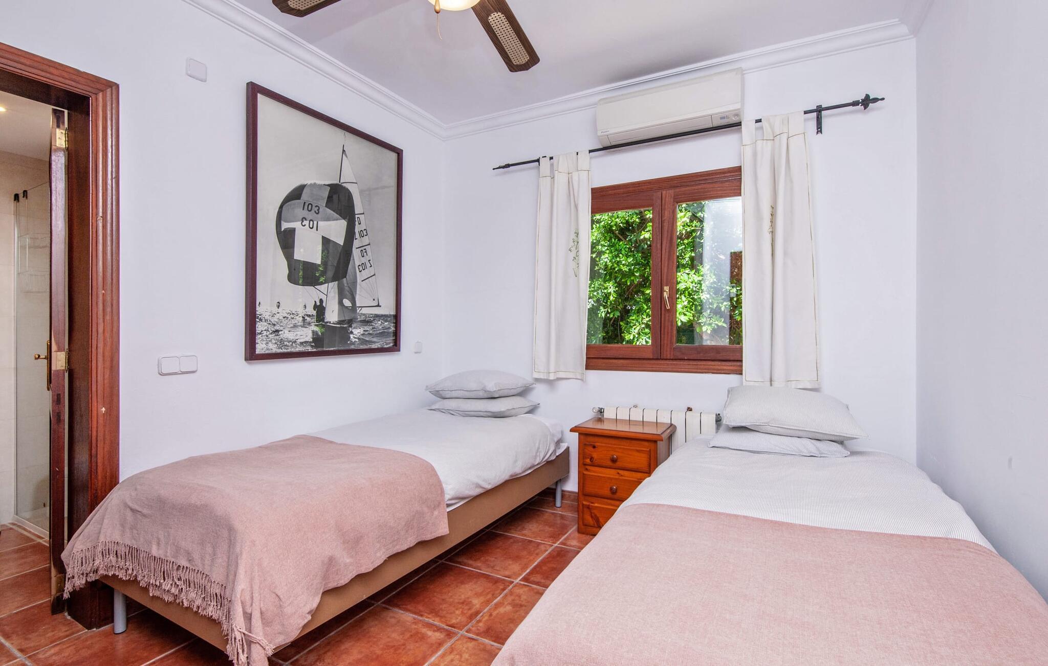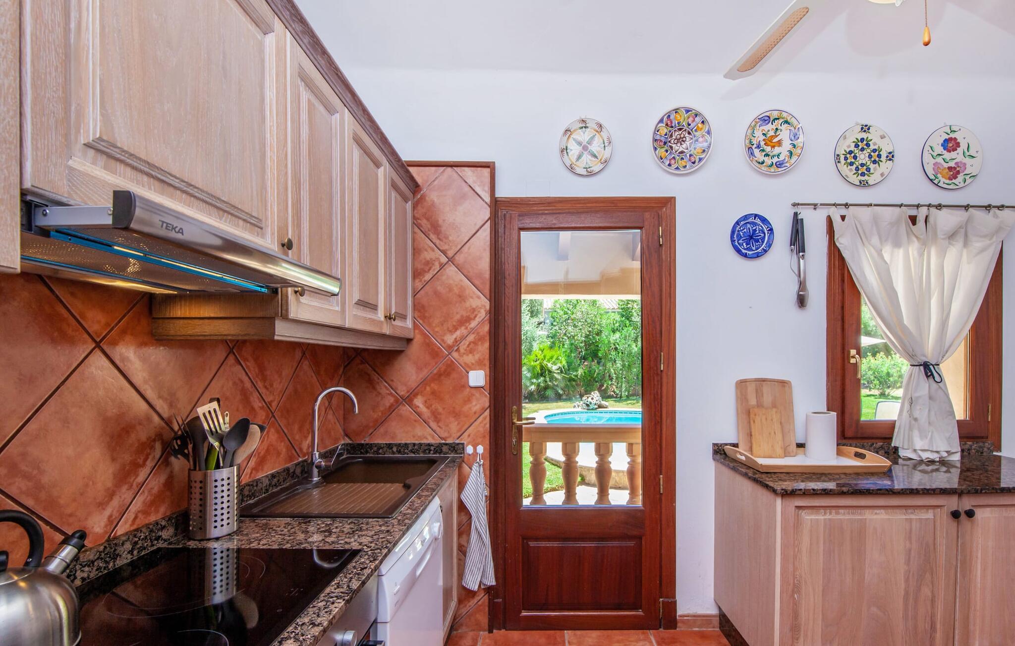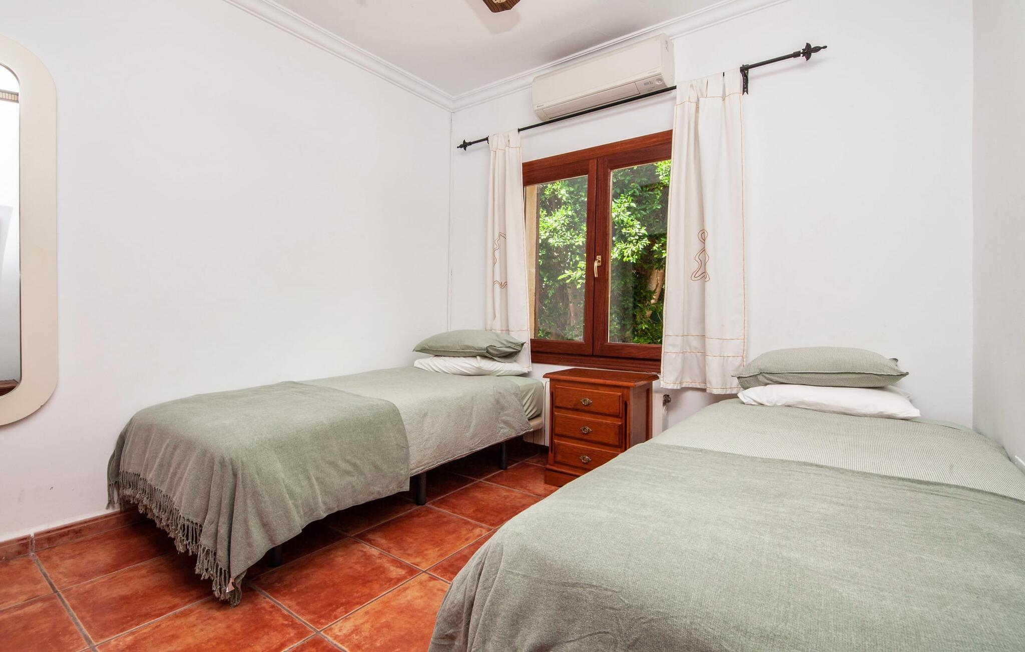 Den mallorcanske villa "Nostra Caseta" er det perfekte feriehus for familier og venner. Den usædvanligt bekvemme beliggenhed i boligområdet Bonaire, langt væk fra masseturismen, er ideel. Ferievillaen kombinerer den typiske finca-følelse med fordelene ved lokale faciliteter lige uden for døren. Det rustikke, traditionelle mallorcanske stenhus er omgivet af en rummelig græsplæne med gamle oliventræer og en indlejret pool. Den organisk formede pool med søstjernemosaik inviterer jer til privat svømme og slappe af. Efter jeres svømmetur kan I slappe af på liggestolene omgivet af den typiske kystvegetation på stenterrassen eller spille et spil bordtennis. Det fænomenale udekøkken er tilgængeligt uanset vejret, da det er overdækket sammen med spise- og loungeområdet ved siden af. En hyggelig grill tidligt på aftenen er et must - den store gasgrill, drikkevarekøleskab og bar hjælper jer med at fejre slutningen af dagen på den L-formede udendørs sofa. Den luftige veranda på forsiden af huset byder på alternative sidde- og spiseområder med udsigt over lystbådehavnen, havet og Tramuntana-bjergene, der fører til Cap de Formentor. Derfra fører en indbydende buegang direkte ind i det indre af den drømmende ferievilla, hvis navn hurtigt bliver jeres motto: "Vores Hus". Familier kan også føle sig hjemme her med et hoveddobbeltværelse, et mindre dobbeltværelse og to dobbeltværelser. Den fuldt klimatiserede bolig har tre moderne badeværelser, hvoraf to er en suite. Alle værelser er i stueetagen. Den åbne planløsning og spisestue i typisk rustik mallorcansk stil blander spanske antikviteter med afrikanske og indiske tekstiler og komfortable moderne møbler, der fuldender villaens afslappede atmosfære. Det fuldt udstyrede køkken med udgang til haven fuldender sommerhusoplevelsen på Mallorca. Grundet centralvarmen kan villaen i en drømmebeliggenhed lejes hele året rundt og med fiberoptisk WiFi kan derfor bruges til hjemmekontorformål selv i den milde Mallorca-vinter. Villa "Nostra Caseta" er enestående med en frodig have, et overdådigt udendørs køkken og afslapningsområde og en privat pool. Dette skønne feriehus med finca-stemning ligger foran Bonaires lystbådehavn med fire restauranter, et minimarked og flere afsondrede strande, alt i gåafstand. Dykning, coasteering og kystvandring er muligt på Bonaire. Villaen ligger ved siden af en fantastisk chill out restaurant, som er et besøg værd. I højsæsonen er der DJ indtil kl. 22.30 3-4 aftener om ugen. Den historiske befæstede by Alcúdia ligger kun en kort køretur eller gåtur derfra, og et besøg i historiske Pollensa eller det livlige Puerto Pollensa er blot et par kilometer væk. Talrige vandsportsaktiviteter er tilgængelige på den 12 km lange Alcudia-strand, som også er i nærheden.