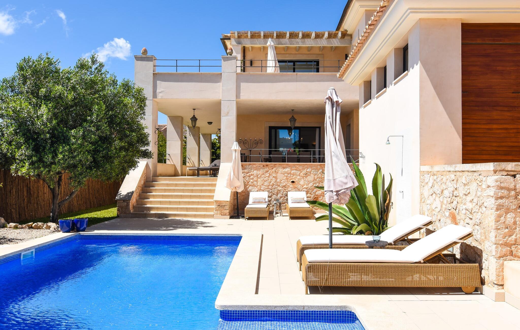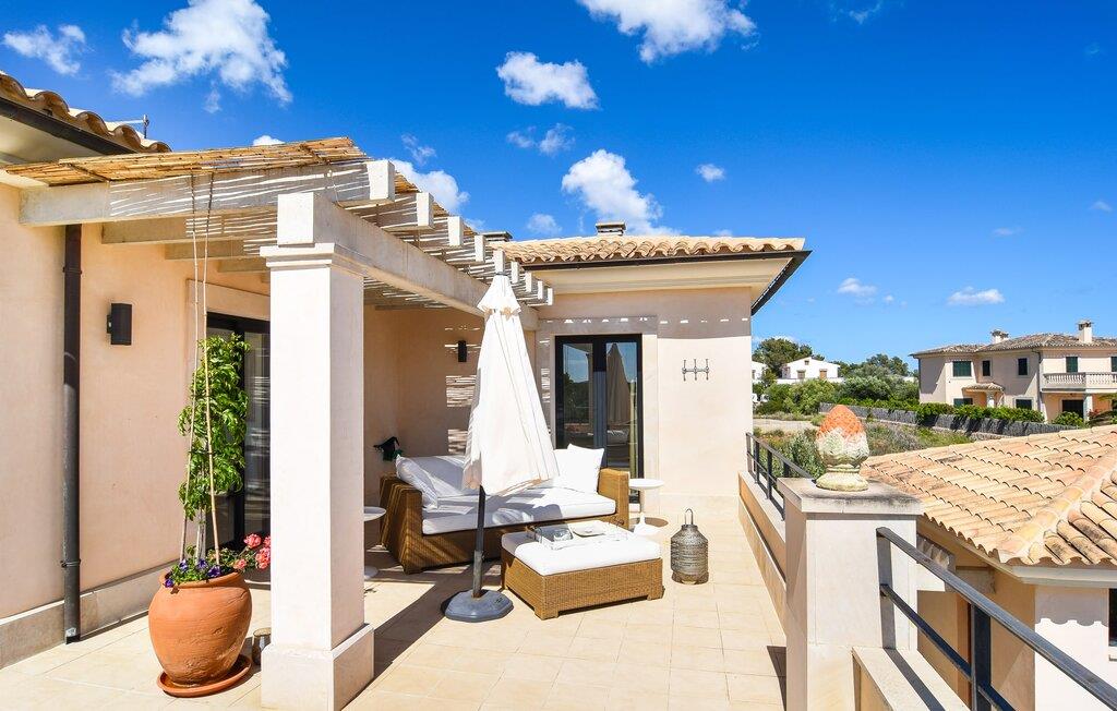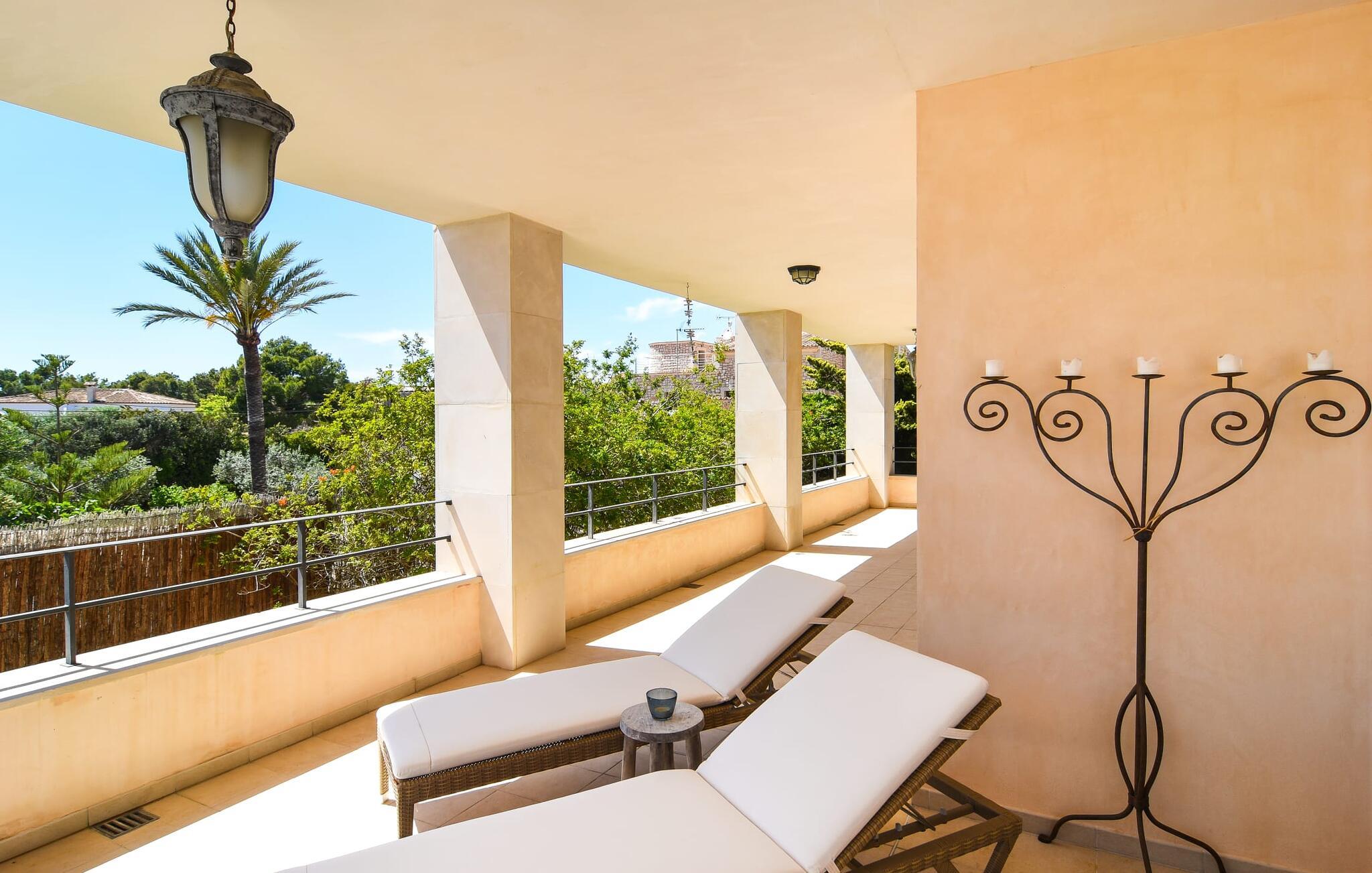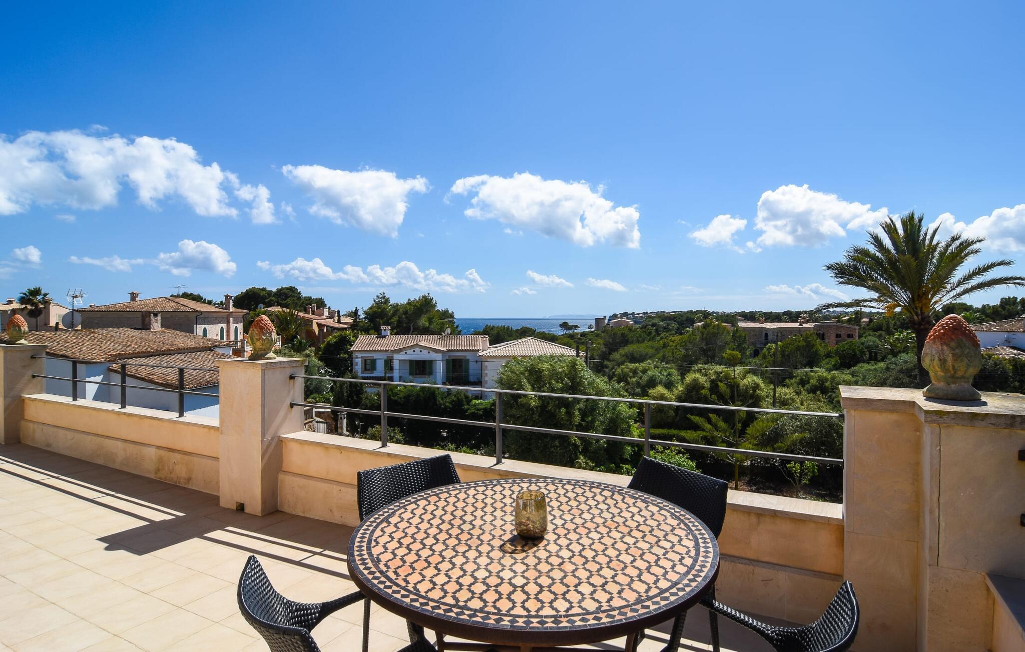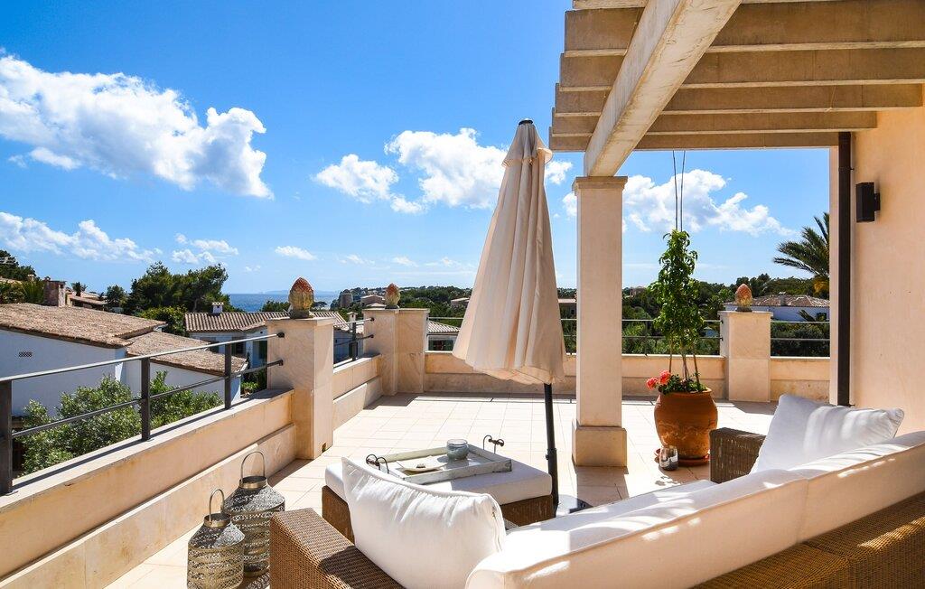 “Ocean Blue” – det er det lovende navn på denne byvilla, der ligger på Mallorcas smukke sydøstkyst. Her er nogle af højdepunkterne i drømmevillaen. Ejendommen består stort set af en helt sydvendt terrasse og poolområde. Poolen er tilgængelig via en lav sidetrappe og er placeret på en naturstensterrasse. Der er plads nok på terrassen til komfortable poly-flet liggestole og endda en kølig dagseng i Bali-stil. Middelhavsblomstrende planter som hibiscus, nogle palmer og oliventræer omgiver det lille, men meget attraktive udendørsområde. Selvom villaen er beliggende i en urbanisering af høj kvalitet med nabohuse, er poolområdet ikke synligt, og privatlivets fred er meget godt beskyttet i hele ejendommen. En trappe fører til villaens overdækkede terrasse, som er L-formet. Der er god plads til liggestole og et massivt træbord med trendy højryggede rattanstole. Et andet mere romantisk opholdsområde på en slags terrasse lige ved siden af køkkenet er udstyret med et delikat bistromøbelsæt. Ydermere er der ovenpå en indbydende, delvist overdækket udsigtsplatform og et afslappet loungehjørne, der er tilgængeligt fra to af soveværelserne. Uanset om det er dag eller nat, kan I slappe helt af og nyde den fænomenale havudsigt. Når vi træder ind i denne 5-stjernede ejendom, møder vi en eksemplarisk indretningsstil, der fuldstændig imponerer med sin elegante, tidløse stemning via gulv-til-loft, antracitfarvede vindueselementer, der bader interiøret i denne smarte villa i smukt lys. De lyse rum er indrettet med overvejende hvide møbler og højkvalitets tilbehør af metal og træ i rustik-moderne landstedsstil med vintage-touch, som det også kan ses i den kombinerede opholds- og spiseafdeling. Højkvalitets, massive mørke trædøre adskiller rummene. Marès-sten af høj kvalitet, som har sin naturlige oprindelse på De Baleariske Øer, blev ofte brugt. Det trendy køkken er udstyret med indbyggede skabe, der svarer til stilen fra et tidligere gårdkøkken - alt i hvid af høj kvalitet. Det moderne, fuldt udstyrede køkken gør selvforplejning til en fornøjelse. Enkeltværelset med enkel og elegant indretning samt badeværelse, der også sagtens kan bruges som gæstebadeværelse, er placeret i stueetagen. En trætrappe, som bliver til et galleri, fører til det øverste niveau, hvor de tre andre soveværelser er placeret; alle med aircondition. Sengene i de rummelige værelser måler alle 1,80 mx 2 m. To trendy afslapningsrum deler det ene af de to badeværelser, hovedsoveværelset har eget badeværelse. Hvert en-suite badeværelse har indretning af høj kvalitet - smukt flisebelagt med brusekabine fra gulv til loft: I hovedbadeværelset er der endnu et stort badekar, hvor I kan nyde panoramaudsigten, mens I slapper af i badekarret. Fra den allerede beskrevne solterrasse på dette niveau kan I byde den nye dag velkommen, mens I nyder den let salte brise, der blæser fra havet. Villaen har en privilegeret beliggenhed mellem de to kystbyer Cala Santanyi og Cala Figuera. Cala Santanyi er også inden for gåafstand. Denne lille bugt med fint sand er kendetegnet ved sin flade, børnevenlige kyst og sin lyse azurblå farve: Enhver, der sidder på trappen til de gamle fiskerhytter og ser på det imponerende klippepanorama over det glitrende vand, ved, at man endelig er på ferie. I bør bestemt ikke gå glip af en tur til den maleriske fiskerihavn Cala Figuera (ca. 1,3 km væk). Denne fjordlignende "figenbugt" er stadig udgangspunktet for fiskere. Samtidig finder I nogle rigtig gode restauranter langs den smukke promenade, der serverer friskfanget fisk. På grund af dens beliggenhed i en urbanisering er der noget støj fra gaden, men det bruges hovedsageligt af lokale beboere, nabobyer er nemme at nå, herunder Santanyi, som blev grundlagt i 1200-tallet. Her kan I gå en tur gennem maleriske gader og finde en hyggelig bodega og tapasbar for at afslutte jeres afslappende dag. Den maritime villa "Ocean Blue" er beliggende i den velholdte urbanisering Se Torre Nova nær Cala Santanyi. Det skylder sit navn til dets nærhed til havet, da den smukke sandbugt Cala Santanyi ligger kun et stenkast væk og kan også nås til fods. Daglig indkøb kan foretages i Santanyi, hvor det ugentlige marked finder sted hver onsdag. Den maleriske fiskerihavn Cala Figuera ligger kun 1,3 km væk og kan nemt nås til fods.