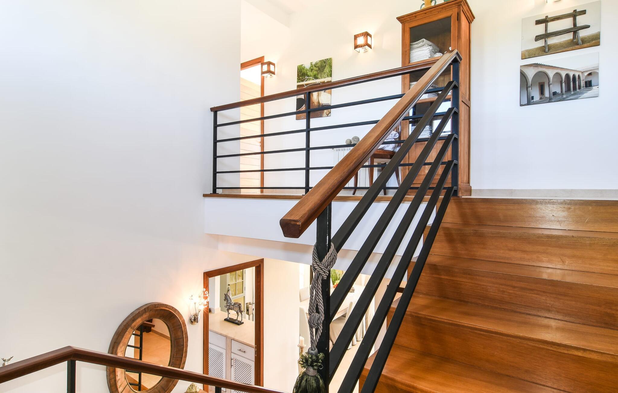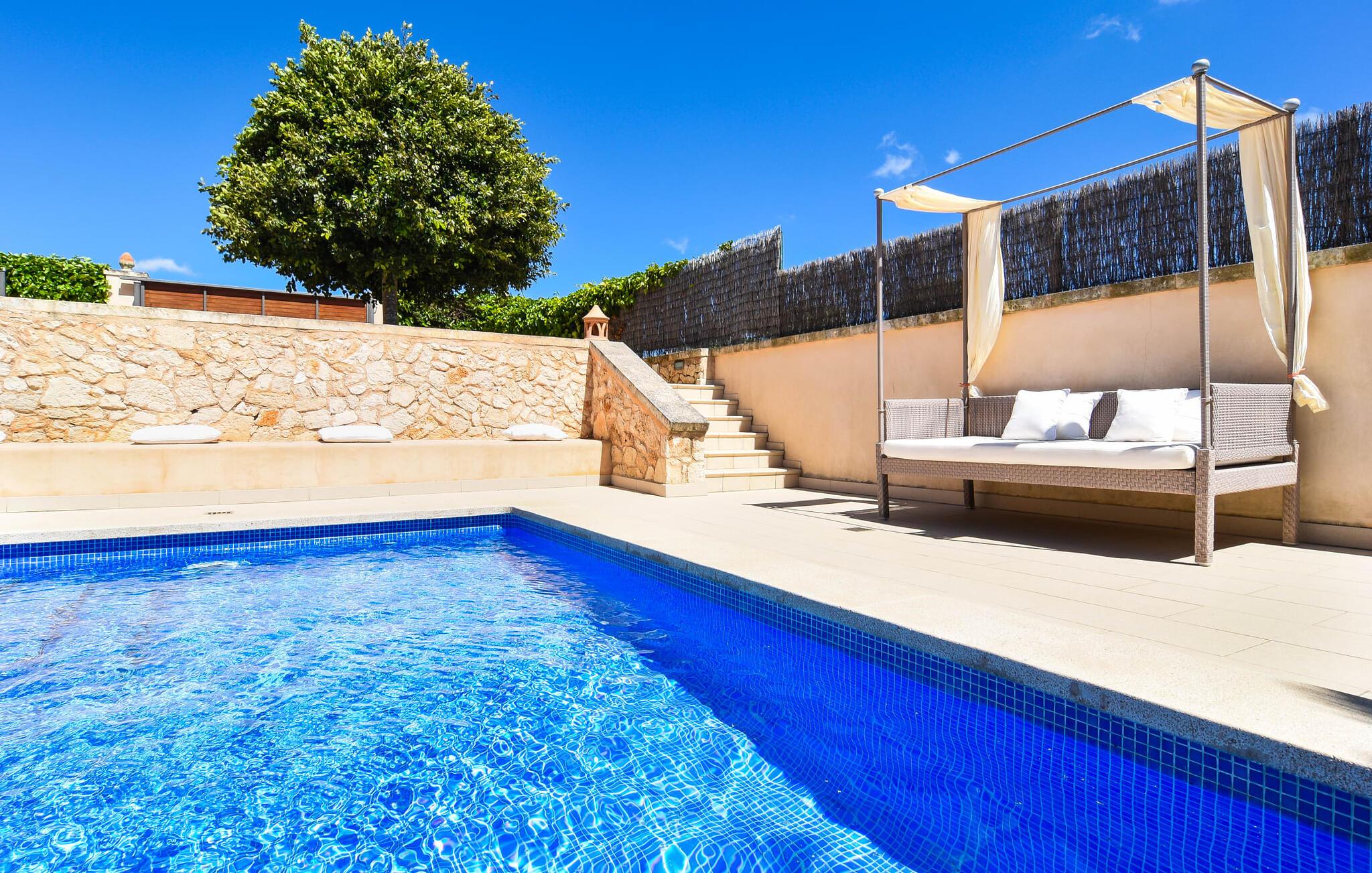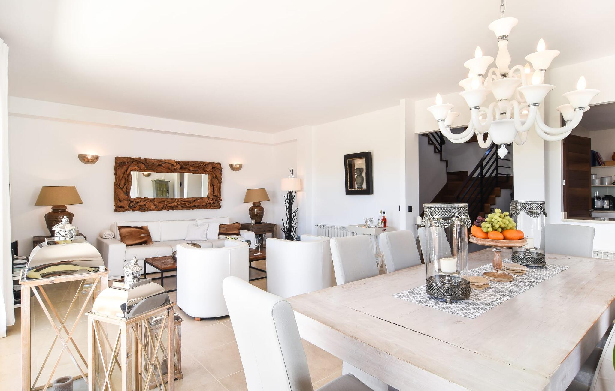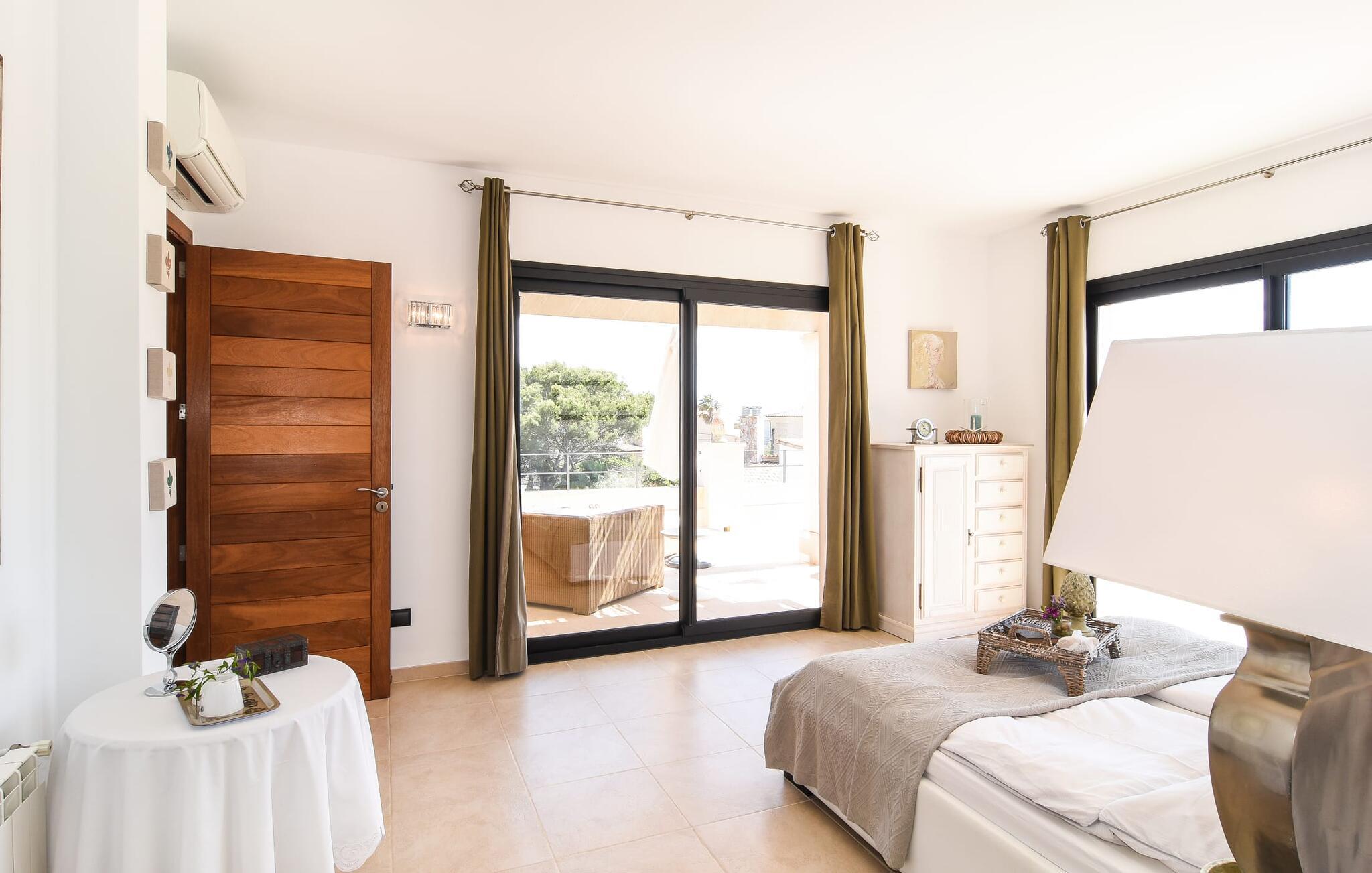 “Ocean Blue” – det er det lovende navn på denne byvilla, der ligger på Mallorcas smukke sydøstkyst. Her er nogle af højdepunkterne i drømmevillaen. Ejendommen består stort set af en helt sydvendt terrasse og poolområde. Poolen er tilgængelig via en lav sidetrappe og er placeret på en naturstensterrasse. Der er plads nok på terrassen til komfortable poly-flet liggestole og endda en kølig dagseng i Bali-stil. Middelhavsblomstrende planter som hibiscus, nogle palmer og oliventræer omgiver det lille, men meget attraktive udendørsområde. Selvom villaen er beliggende i en urbanisering af høj kvalitet med nabohuse, er poolområdet ikke synligt, og privatlivets fred er meget godt beskyttet i hele ejendommen. En trappe fører til villaens overdækkede terrasse, som er L-formet. Der er god plads til liggestole og et massivt træbord med trendy højryggede rattanstole. Et andet mere romantisk opholdsområde på en slags terrasse lige ved siden af køkkenet er udstyret med et delikat bistromøbelsæt. Ydermere er der ovenpå en indbydende, delvist overdækket udsigtsplatform og et afslappet loungehjørne, der er tilgængeligt fra to af soveværelserne. Uanset om det er dag eller nat, kan I slappe helt af og nyde den fænomenale havudsigt. Når vi træder ind i denne 5-stjernede ejendom, møder vi en eksemplarisk indretningsstil, der fuldstændig imponerer med sin elegante, tidløse stemning via gulv-til-loft, antracitfarvede vindueselementer, der bader interiøret i denne smarte villa i smukt lys. De lyse rum er indrettet med overvejende hvide møbler og højkvalitets tilbehør af metal og træ i rustik-moderne landstedsstil med vintage-touch, som det også kan ses i den kombinerede opholds- og spiseafdeling. Højkvalitets, massive mørke trædøre adskiller rummene. Marès-sten af høj kvalitet, som har sin naturlige oprindelse på De Baleariske Øer, blev ofte brugt. Det trendy køkken er udstyret med indbyggede skabe, der svarer til stilen fra et tidligere gårdkøkken - alt i hvid af høj kvalitet. Det moderne, fuldt udstyrede køkken gør selvforplejning til en fornøjelse. Enkeltværelset med enkel og elegant indretning samt badeværelse, der også sagtens kan bruges som gæstebadeværelse, er placeret i stueetagen. En trætrappe, som bliver til et galleri, fører til det øverste niveau, hvor de tre andre soveværelser er placeret; alle med aircondition. Sengene i de rummelige værelser måler alle 1,80 mx 2 m. To trendy afslapningsrum deler det ene af de to badeværelser, hovedsoveværelset har eget badeværelse. Hvert en-suite badeværelse har indretning af høj kvalitet - smukt flisebelagt med brusekabine fra gulv til loft: I hovedbadeværelset er der endnu et stort badekar, hvor I kan nyde panoramaudsigten, mens I slapper af i badekarret. Fra den allerede beskrevne solterrasse på dette niveau kan I byde den nye dag velkommen, mens I nyder den let salte brise, der blæser fra havet. Villaen har en privilegeret beliggenhed mellem de to kystbyer Cala Santanyi og Cala Figuera. Cala Santanyi er også inden for gåafstand. Denne lille bugt med fint sand er kendetegnet ved sin flade, børnevenlige kyst og sin lyse azurblå farve: Enhver, der sidder på trappen til de gamle fiskerhytter og ser på det imponerende klippepanorama over det glitrende vand, ved, at man endelig er på ferie. I bør bestemt ikke gå glip af en tur til den maleriske fiskerihavn Cala Figuera (ca. 1,3 km væk). Denne fjordlignende "figenbugt" er stadig udgangspunktet for fiskere. Samtidig finder I nogle rigtig gode restauranter langs den smukke promenade, der serverer friskfanget fisk. På grund af dens beliggenhed i en urbanisering er der noget støj fra gaden, men det bruges hovedsageligt af lokale beboere, nabobyer er nemme at nå, herunder Santanyi, som blev grundlagt i 1200-tallet. Her kan I gå en tur gennem maleriske gader og finde en hyggelig bodega og tapasbar for at afslutte jeres afslappende dag. Den maritime villa "Ocean Blue" er beliggende i den velholdte urbanisering Se Torre Nova nær Cala Santanyi. Det skylder sit navn til dets nærhed til havet, da den smukke sandbugt Cala Santanyi ligger kun et stenkast væk og kan også nås til fods. Daglig indkøb kan foretages i Santanyi, hvor det ugentlige marked finder sted hver onsdag. Den maleriske fiskerihavn Cala Figuera ligger kun 1,3 km væk og kan nemt nås til fods.