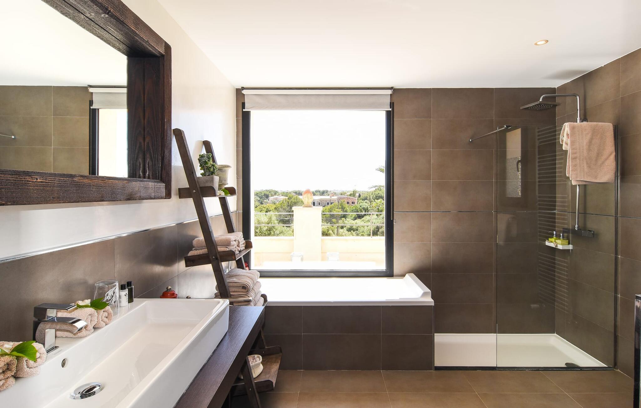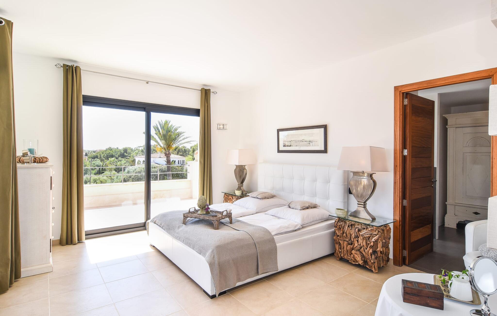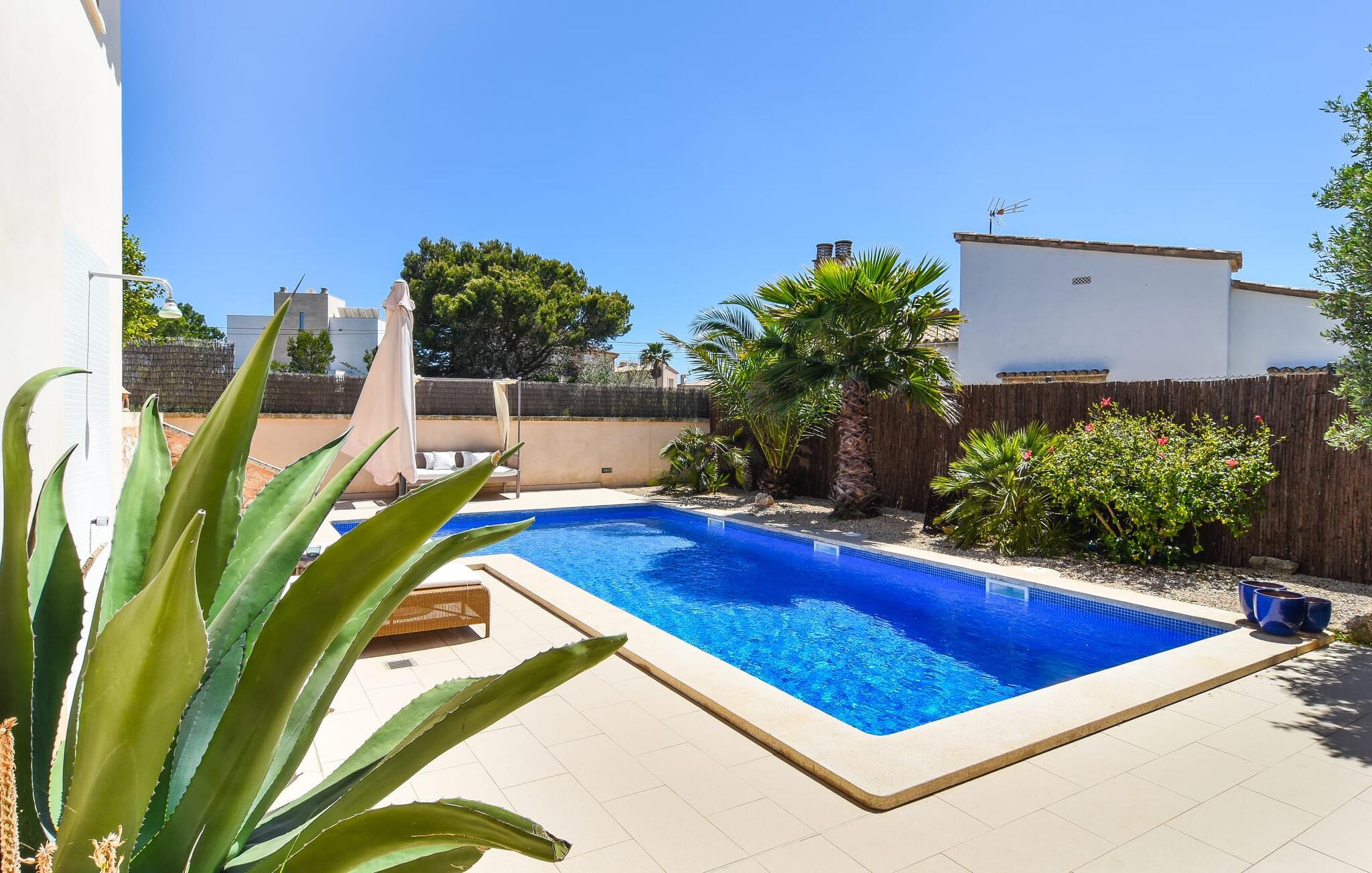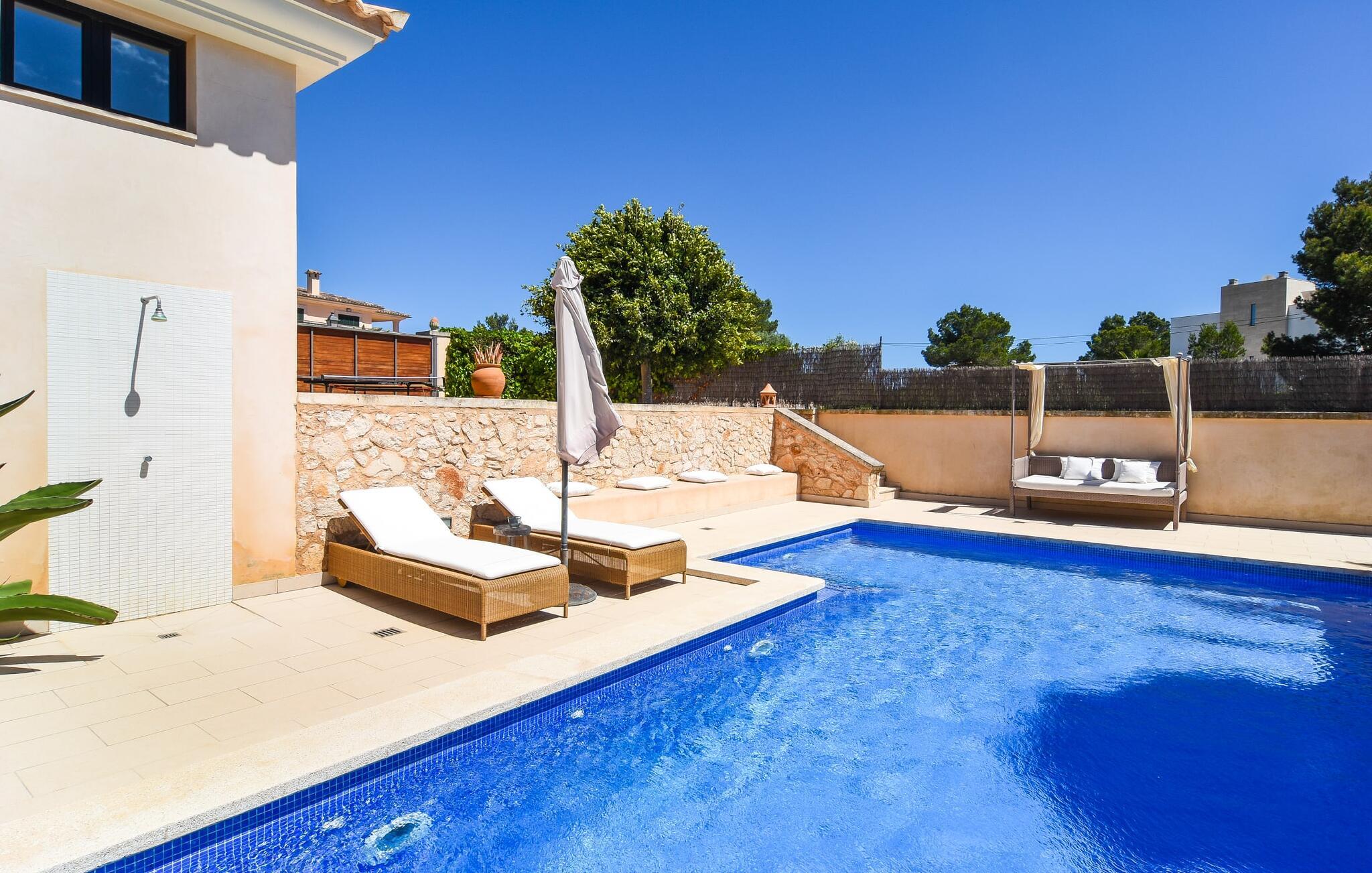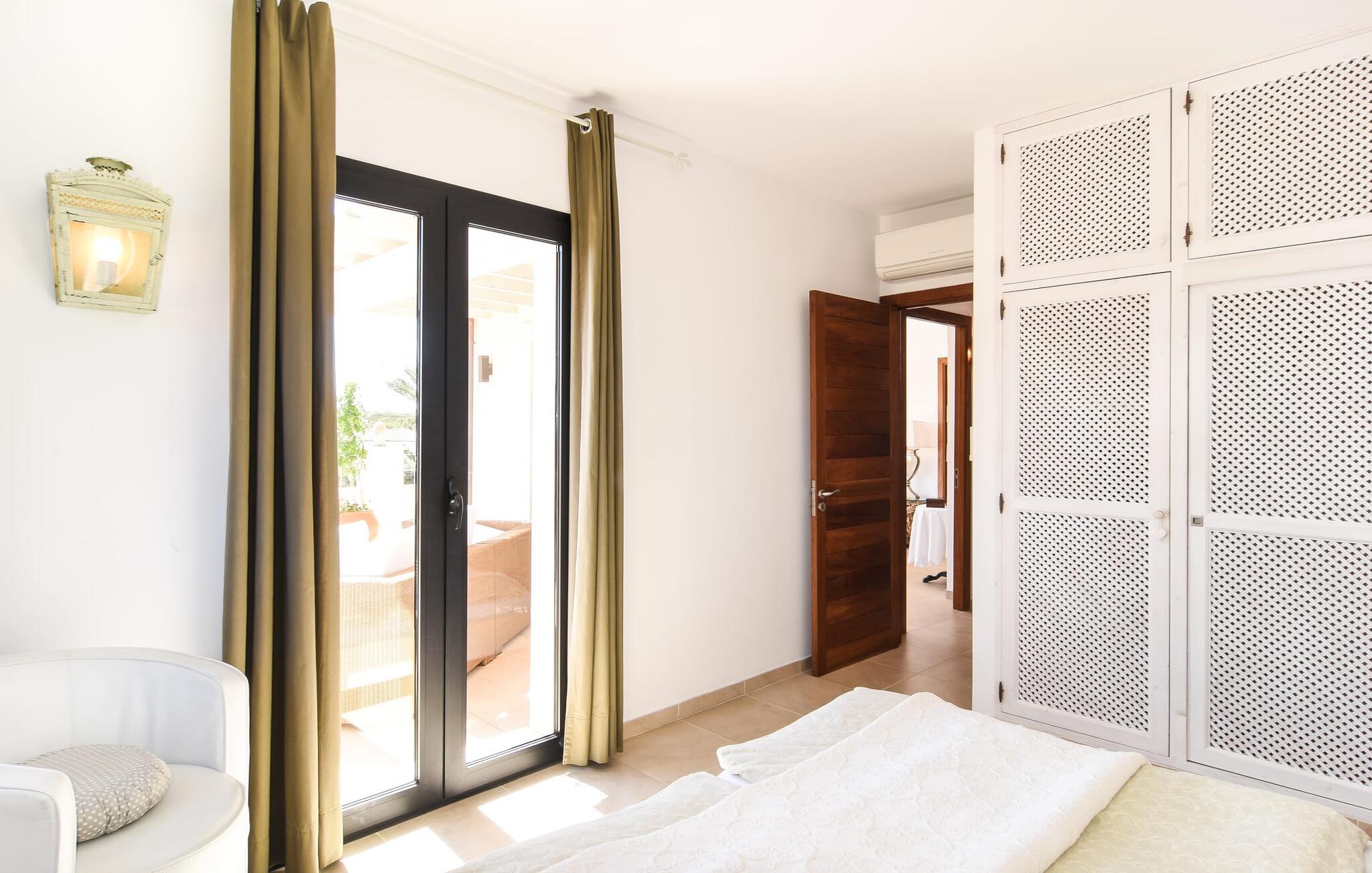 “Ocean Blue” – det er det lovende navn på denne byvilla, der ligger på Mallorcas smukke sydøstkyst. Her er nogle af højdepunkterne i drømmevillaen. Ejendommen består stort set af en helt sydvendt terrasse og poolområde. Poolen er tilgængelig via en lav sidetrappe og er placeret på en naturstensterrasse. Der er plads nok på terrassen til komfortable poly-flet liggestole og endda en kølig dagseng i Bali-stil. Middelhavsblomstrende planter som hibiscus, nogle palmer og oliventræer omgiver det lille, men meget attraktive udendørsområde. Selvom villaen er beliggende i en urbanisering af høj kvalitet med nabohuse, er poolområdet ikke synligt, og privatlivets fred er meget godt beskyttet i hele ejendommen. En trappe fører til villaens overdækkede terrasse, som er L-formet. Der er god plads til liggestole og et massivt træbord med trendy højryggede rattanstole. Et andet mere romantisk opholdsområde på en slags terrasse lige ved siden af køkkenet er udstyret med et delikat bistromøbelsæt. Ydermere er der ovenpå en indbydende, delvist overdækket udsigtsplatform og et afslappet loungehjørne, der er tilgængeligt fra to af soveværelserne. Uanset om det er dag eller nat, kan I slappe helt af og nyde den fænomenale havudsigt. Når vi træder ind i denne 5-stjernede ejendom, møder vi en eksemplarisk indretningsstil, der fuldstændig imponerer med sin elegante, tidløse stemning via gulv-til-loft, antracitfarvede vindueselementer, der bader interiøret i denne smarte villa i smukt lys. De lyse rum er indrettet med overvejende hvide møbler og højkvalitets tilbehør af metal og træ i rustik-moderne landstedsstil med vintage-touch, som det også kan ses i den kombinerede opholds- og spiseafdeling. Højkvalitets, massive mørke trædøre adskiller rummene. Marès-sten af høj kvalitet, som har sin naturlige oprindelse på De Baleariske Øer, blev ofte brugt. Det trendy køkken er udstyret med indbyggede skabe, der svarer til stilen fra et tidligere gårdkøkken - alt i hvid af høj kvalitet. Det moderne, fuldt udstyrede køkken gør selvforplejning til en fornøjelse. Enkeltværelset med enkel og elegant indretning samt badeværelse, der også sagtens kan bruges som gæstebadeværelse, er placeret i stueetagen. En trætrappe, som bliver til et galleri, fører til det øverste niveau, hvor de tre andre soveværelser er placeret; alle med aircondition. Sengene i de rummelige værelser måler alle 1,80 mx 2 m. To trendy afslapningsrum deler det ene af de to badeværelser, hovedsoveværelset har eget badeværelse. Hvert en-suite badeværelse har indretning af høj kvalitet - smukt flisebelagt med brusekabine fra gulv til loft: I hovedbadeværelset er der endnu et stort badekar, hvor I kan nyde panoramaudsigten, mens I slapper af i badekarret. Fra den allerede beskrevne solterrasse på dette niveau kan I byde den nye dag velkommen, mens I nyder den let salte brise, der blæser fra havet. Villaen har en privilegeret beliggenhed mellem de to kystbyer Cala Santanyi og Cala Figuera. Cala Santanyi er også inden for gåafstand. Denne lille bugt med fint sand er kendetegnet ved sin flade, børnevenlige kyst og sin lyse azurblå farve: Enhver, der sidder på trappen til de gamle fiskerhytter og ser på det imponerende klippepanorama over det glitrende vand, ved, at man endelig er på ferie. I bør bestemt ikke gå glip af en tur til den maleriske fiskerihavn Cala Figuera (ca. 1,3 km væk). Denne fjordlignende "figenbugt" er stadig udgangspunktet for fiskere. Samtidig finder I nogle rigtig gode restauranter langs den smukke promenade, der serverer friskfanget fisk. På grund af dens beliggenhed i en urbanisering er der noget støj fra gaden, men det bruges hovedsageligt af lokale beboere, nabobyer er nemme at nå, herunder Santanyi, som blev grundlagt i 1200-tallet. Her kan I gå en tur gennem maleriske gader og finde en hyggelig bodega og tapasbar for at afslutte jeres afslappende dag. Den maritime villa "Ocean Blue" er beliggende i den velholdte urbanisering Se Torre Nova nær Cala Santanyi. Det skylder sit navn til dets nærhed til havet, da den smukke sandbugt Cala Santanyi ligger kun et stenkast væk og kan også nås til fods. Daglig indkøb kan foretages i Santanyi, hvor det ugentlige marked finder sted hver onsdag. Den maleriske fiskerihavn Cala Figuera ligger kun 1,3 km væk og kan nemt nås til fods.