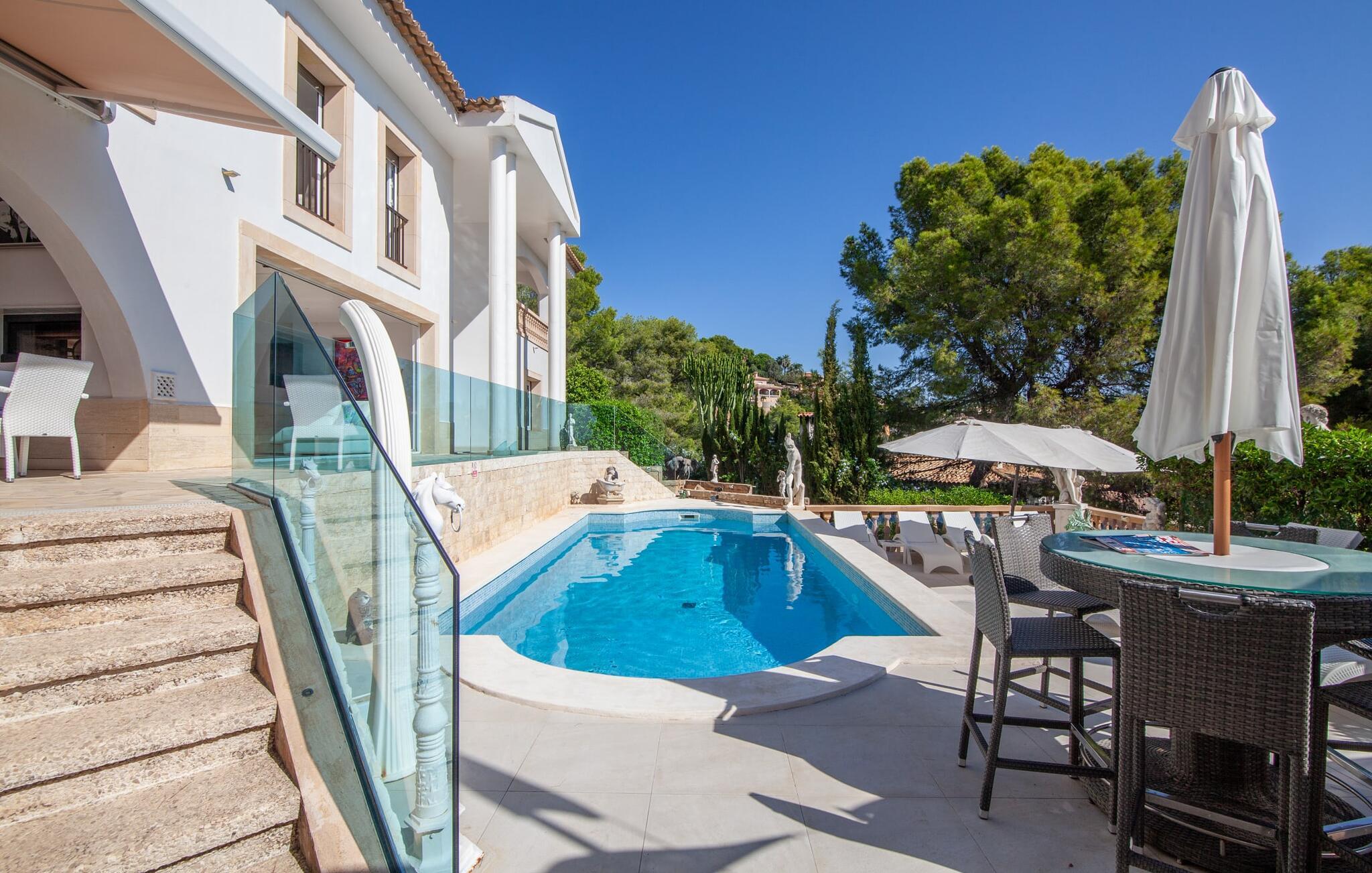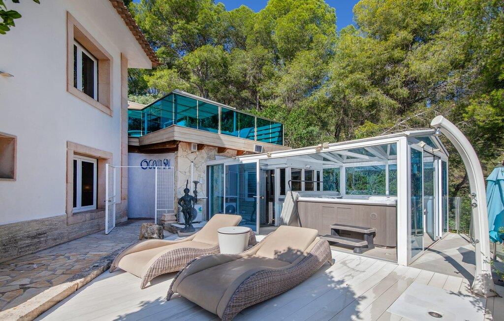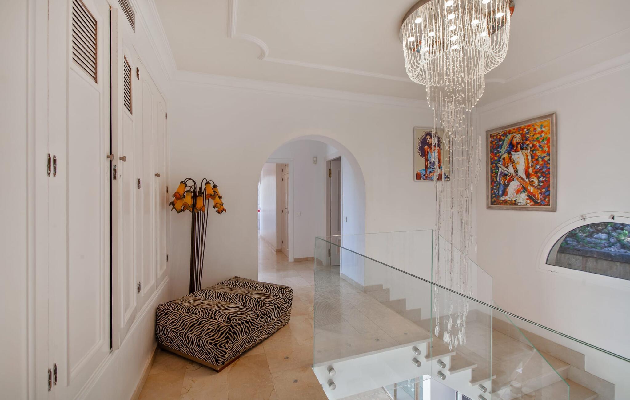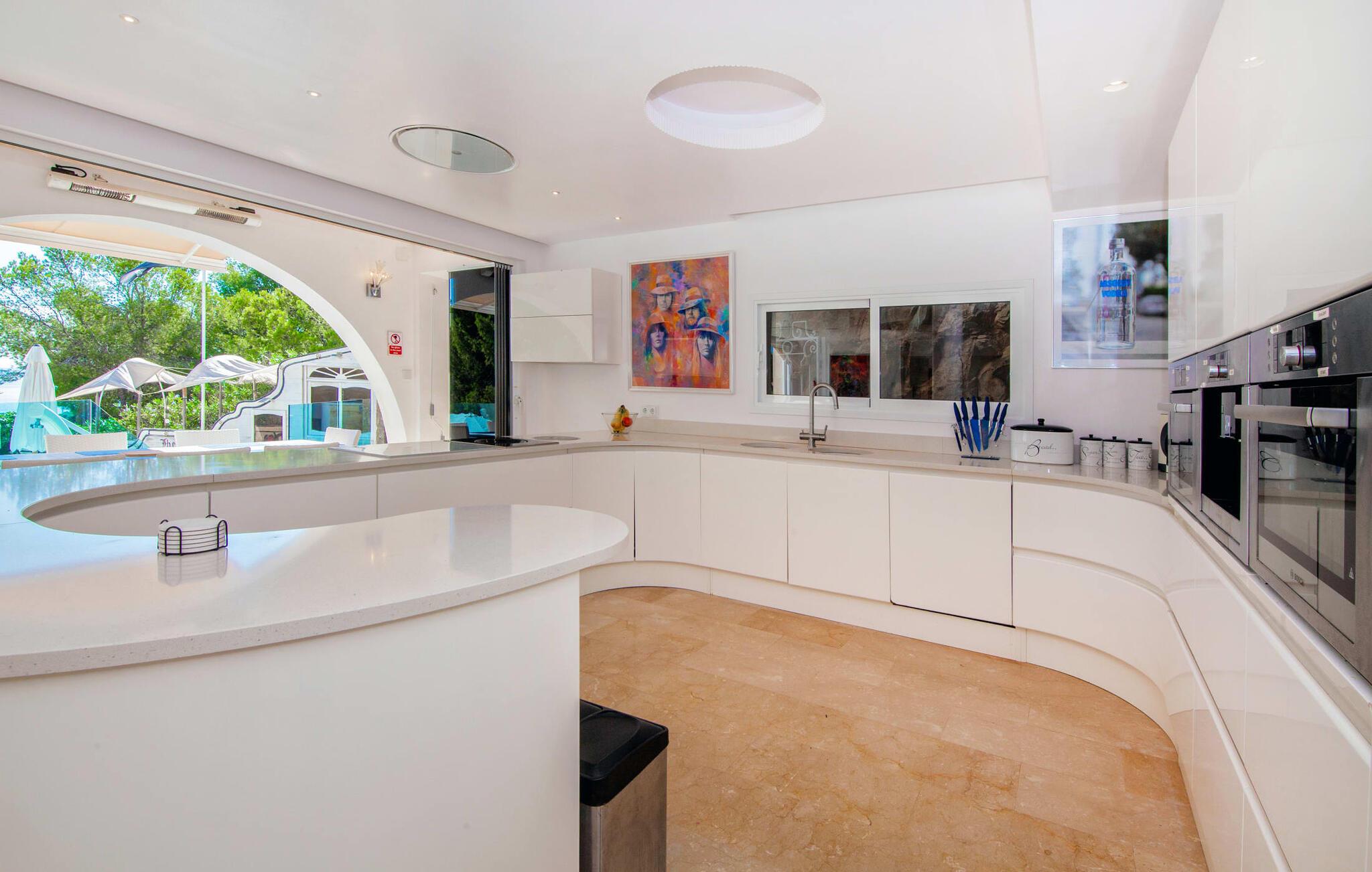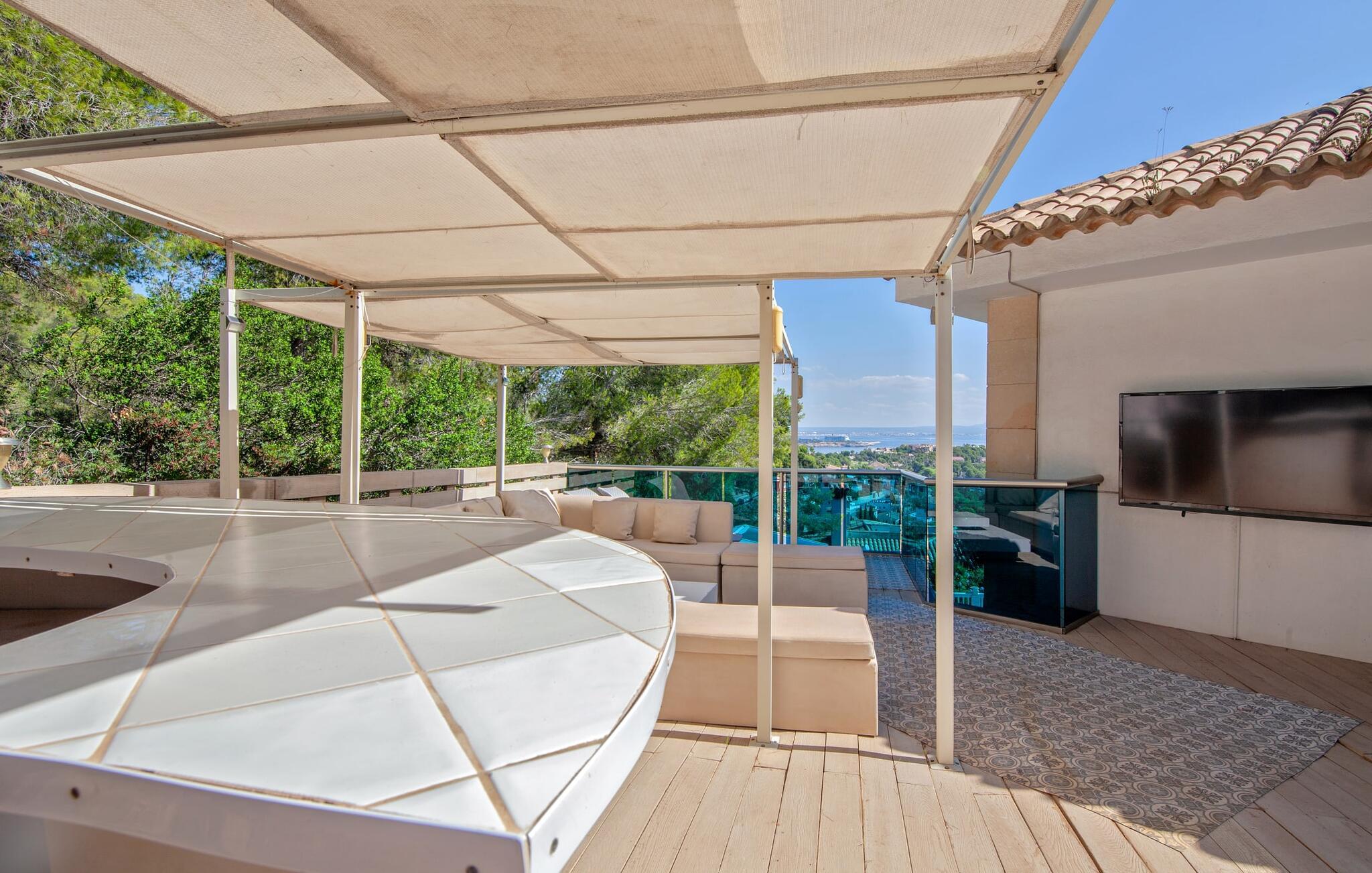 På grund af sin beliggenhed i bakkerne i Portal Nous kan I nyde den perfekte udsigt over havet fra villaen "Ocean View". Samtidig venter der jer adskillige højdepunkter i det varierede udendørsområde: en pool med en omgivende terrasse og liggestole, et udendørs køkken/bar med tv og poolbord, en professionel grillstation og en chillout-lounge. Legepladsen med et piratskib byder også på masser af legemuligheder for de yngre gæster. En overdækket spiseplads ved huset giver jer mulighed for at spise jeres måltider i en familievenlig atmosfære. I kan også nyde en fascinerende panoramaudsigt fra soveværelsets balkoner og terrasser. Det luksuriøse feriehus er indlejret i Middelhavets grønne bakker og tårner sig imponerende op over havet. Luksusferiefølelsen fortsætter i det indre af den elegante villa. Et overdækket spabad venter på jer. Hvis I kan lide at dyrke sport på ferien, kan I træne i hotellets fitnesscenter. Bagefter finder I varme og afslapning i den private sauna. Den fantastiske villa "Ocean View" er derfor ideel til helårsbrug. Udover sportslokalerne er det eksklusive design af de overvejende hvide møbler også imponerende. Det hvide højglans køkken vil glæde enhver amatørkok. De fem soveværelser varierer mellem brug af børn eller voksne, hvilket fremhæver familievenligheden i dette fantastiske feriehus. Tre badeværelser fås i et flot design. Aircondition, downlights, lydsystem, WiFi med mulighed for hjemmekontor og forskellige smart-tv'er kaster denne førsteklasses familievilla ind i premiumsegmentet. Denne elegante og familievenlige ferievilla byder på ren luksus både inde og ude. Ejendommen af høj kvalitet er beliggende i bakkerne i landsbyen Portal Nous mellem Palma og Calvià i den sydvestlige del af øen. Shoppingmuligheder kan findes i de omkringliggende byer som Palmanova, Palma eller Calvià. Villaen ligger 700 m fra Cala Bendinat og andre sandstrande.