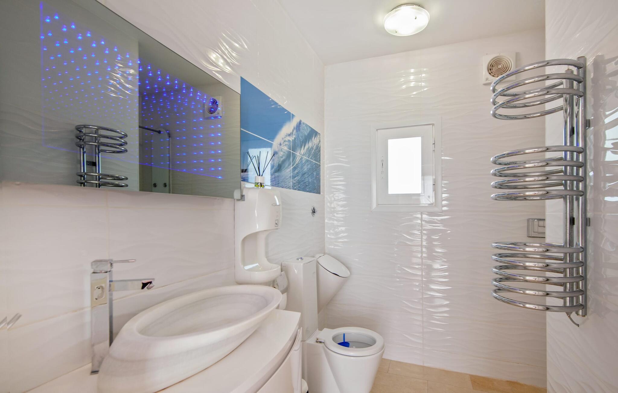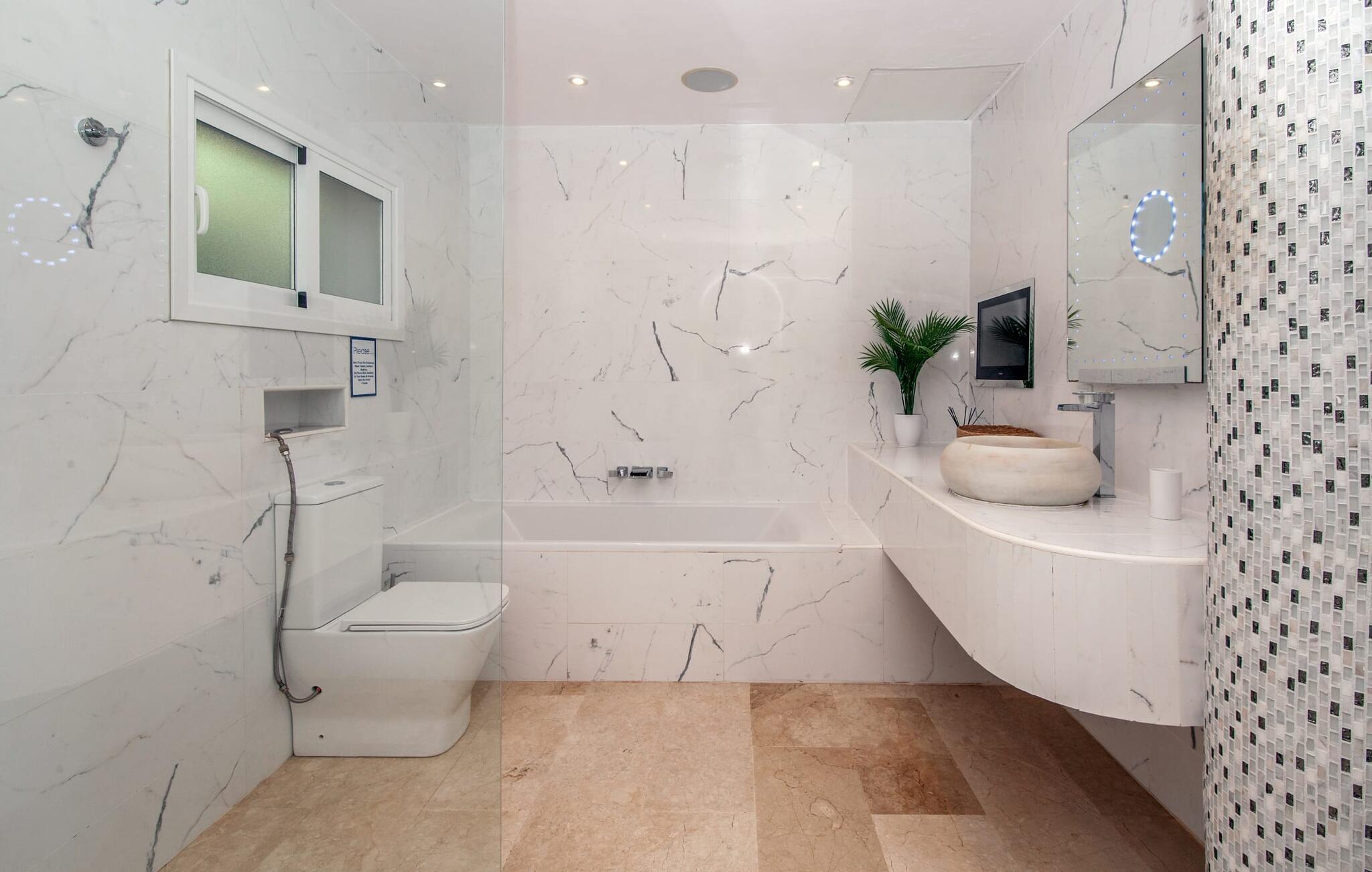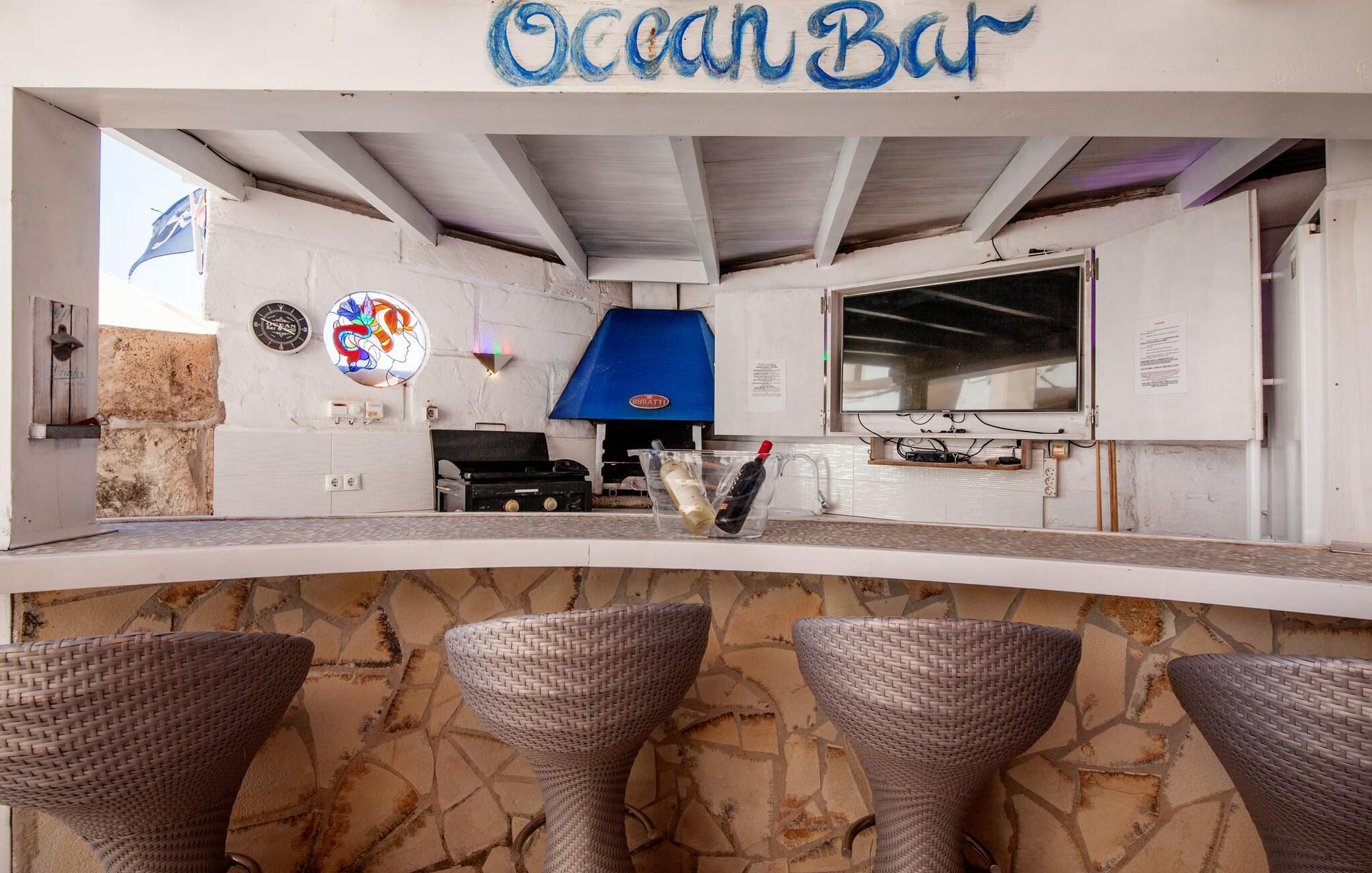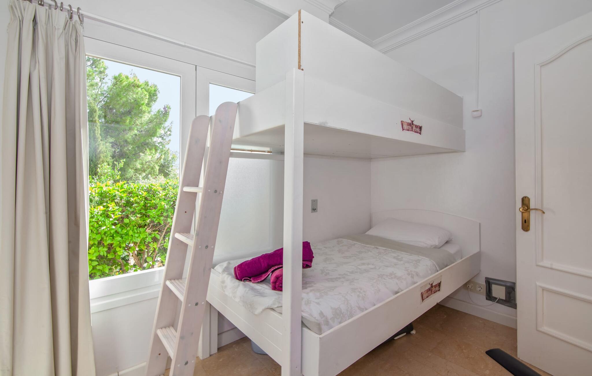 På grund af sin beliggenhed i bakkerne i Portal Nous kan I nyde den perfekte udsigt over havet fra villaen "Ocean View". Samtidig venter der jer adskillige højdepunkter i det varierede udendørsområde: en pool med en omgivende terrasse og liggestole, et udendørs køkken/bar med tv og poolbord, en professionel grillstation og en chillout-lounge. Legepladsen med et piratskib byder også på masser af legemuligheder for de yngre gæster. En overdækket spiseplads ved huset giver jer mulighed for at spise jeres måltider i en familievenlig atmosfære. I kan også nyde en fascinerende panoramaudsigt fra soveværelsets balkoner og terrasser. Det luksuriøse feriehus er indlejret i Middelhavets grønne bakker og tårner sig imponerende op over havet. Luksusferiefølelsen fortsætter i det indre af den elegante villa. Et overdækket spabad venter på jer. Hvis I kan lide at dyrke sport på ferien, kan I træne i hotellets fitnesscenter. Bagefter finder I varme og afslapning i den private sauna. Den fantastiske villa "Ocean View" er derfor ideel til helårsbrug. Udover sportslokalerne er det eksklusive design af de overvejende hvide møbler også imponerende. Det hvide højglans køkken vil glæde enhver amatørkok. De fem soveværelser varierer mellem brug af børn eller voksne, hvilket fremhæver familievenligheden i dette fantastiske feriehus. Tre badeværelser fås i et flot design. Aircondition, downlights, lydsystem, WiFi med mulighed for hjemmekontor og forskellige smart-tv'er kaster denne førsteklasses familievilla ind i premiumsegmentet. Denne elegante og familievenlige ferievilla byder på ren luksus både inde og ude. Ejendommen af høj kvalitet er beliggende i bakkerne i landsbyen Portal Nous mellem Palma og Calvià i den sydvestlige del af øen. Shoppingmuligheder kan findes i de omkringliggende byer som Palmanova, Palma eller Calvià. Villaen ligger 700 m fra Cala Bendinat og andre sandstrande.
