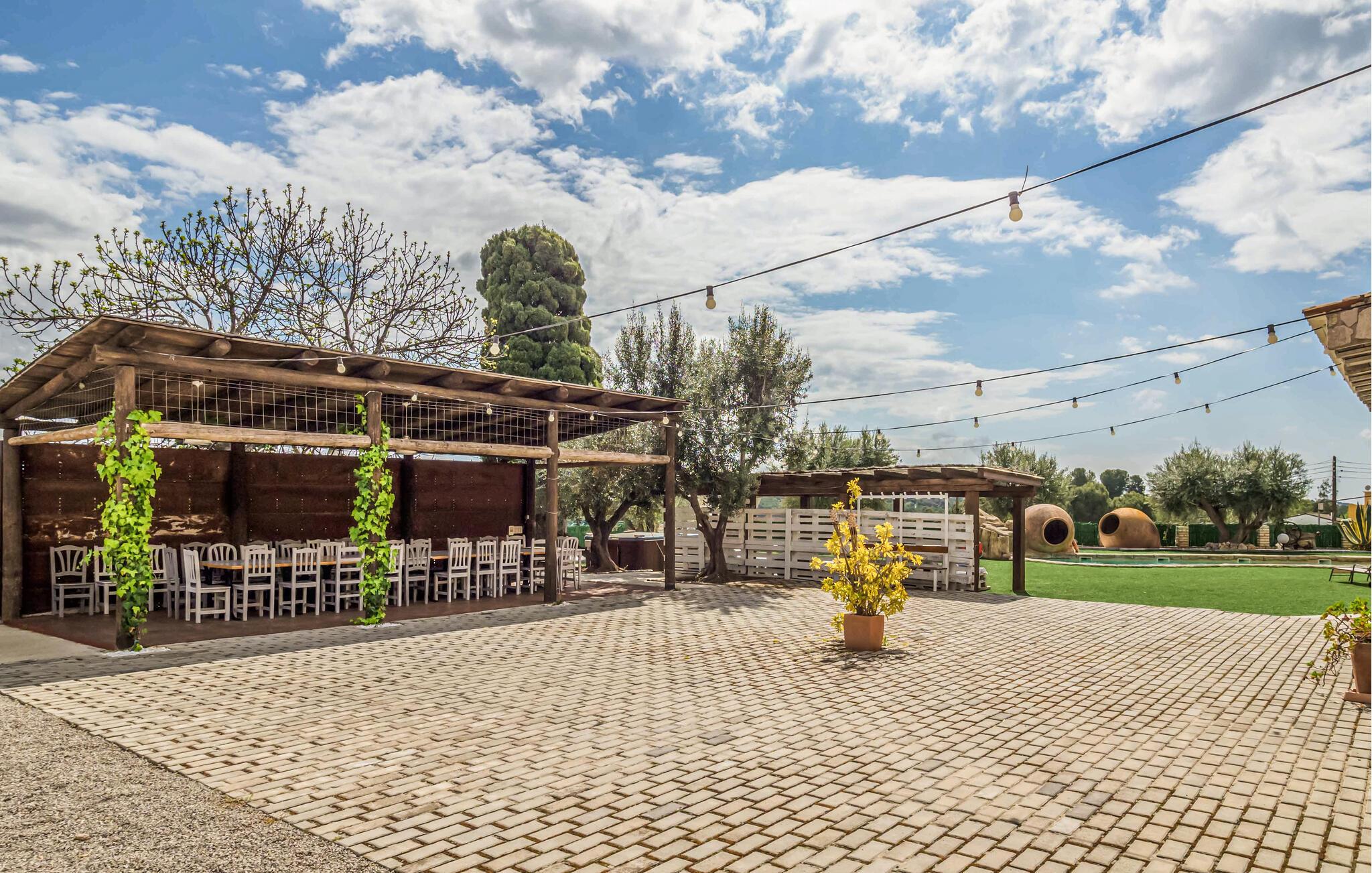 Slap af ved poolen med liggestole og en velplejet græsplæne. Brug det overdækkede loungeområde med dagsenge og gardiner til skyggefulde pauser. Lad børnene lege på græsplænerne eller find roen med en slentretur gennem grunden. Tilbring tid sammen på terrassen med spisebordet og se solnedgangen over de omkringliggende bakker om aftenen.