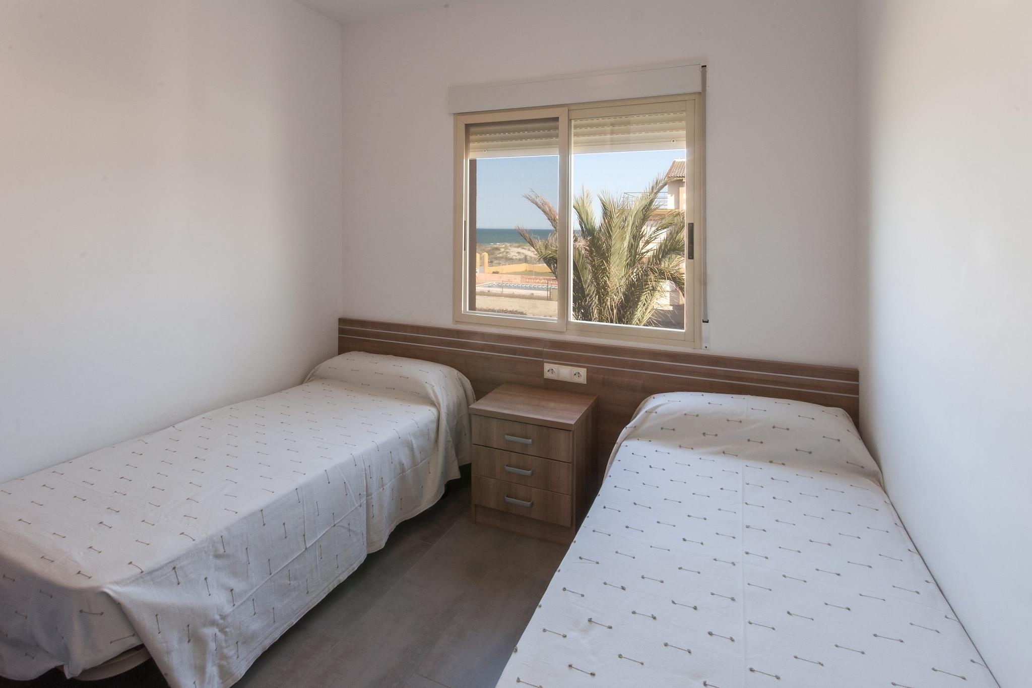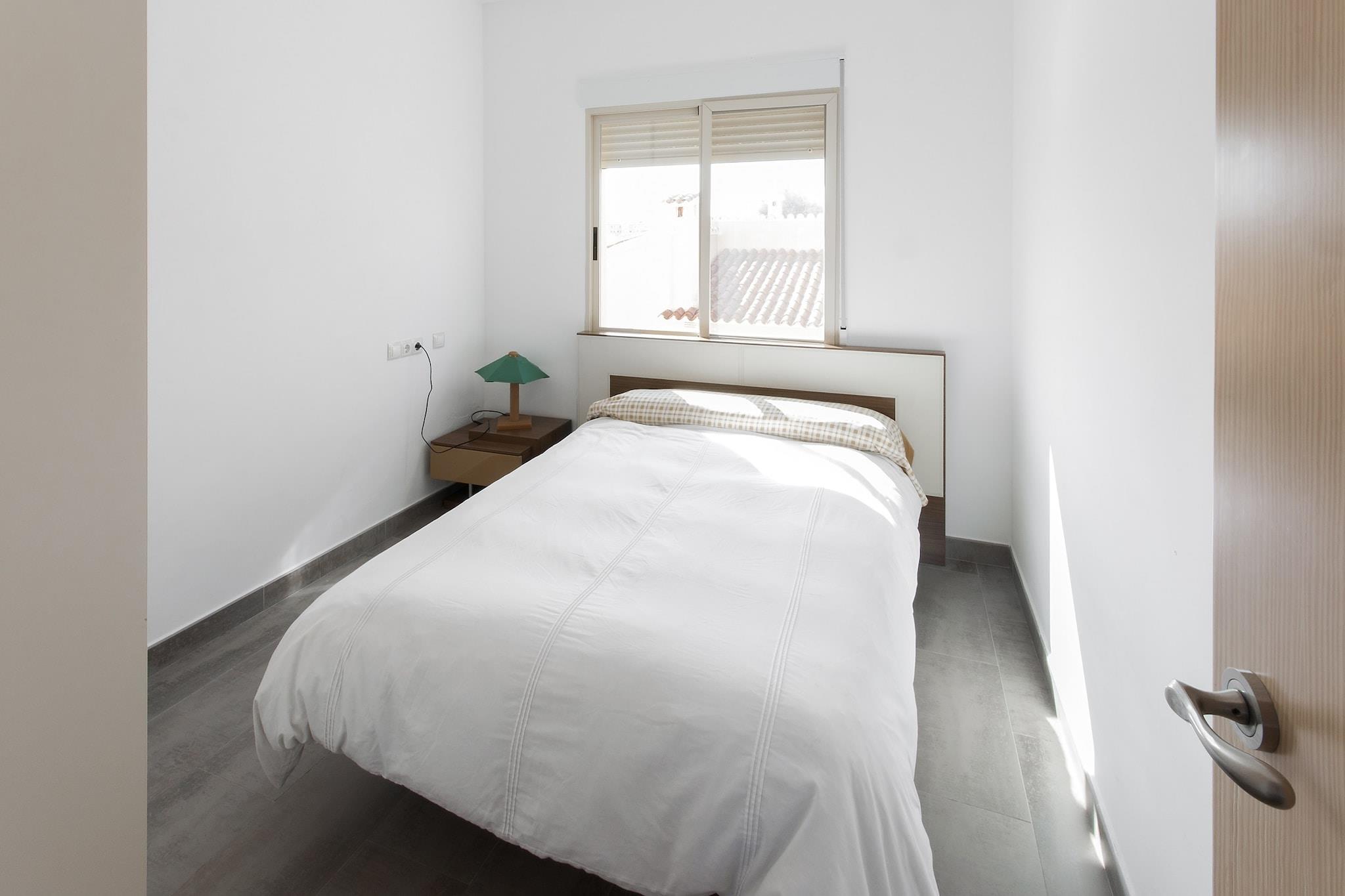 Træd ind i en lys og luftig lejlighed med fælles have, hvor børn og kæledyr kan lege frit. Køl af i den fælles pool, slap af på liggestole, eller nyd et måltid tilberedt på den mobile grill. Tre parkeringspladser er tilgængelige for nemheds skyld. Nærliggende hundevenlige strande og vandrestier gør det nemt at udforske området med din lodne ledsager. Det rolige miljø er ideelt til et afslappet ophold, da arrangementer ikke er tilladt. Opholds-, spise- og køkkenområdet i åbent plan, med aircondition overalt, giver plads til at slappe af, mens du beundrer den naturskønne udsigt. Stuen har satellit-tv, spiseplads med stort bord og fuldt udstyret køkken med el-komfur og kaffemaskine. Fire soveværelser - to dobbeltværelser og to tvillinger - plus en barneseng giver fleksible sovearrangementer. To badeværelser med bruser, fem radiatorer og en ekstra gang AC-enhed sikrer komfort i hver sæson. Vasketøj, herunder en vaskemaskine og strygejern, er også til rådighed. Lejligheden ligger i Oliva, få skridt fra sandstrande, der er ideelle til svømning, solbadning og vandsport såsom skysurfing. Golfentusiaster kan besøge Oliva Nova 18-hullers bane, og ridefans kan nyde undervisning på Oliva Nova Equestrian Center. Naturparken Montgó og Font Salada ligger i nærheden for vandre- og wellnessoplevelser. Byen Oliva, 8 km væk, byder på lokale caféer, restauranter og butikker, der serverer friske middelhavsretter, hvilket gør det nemt at udforske og spise ude efter en dag med aktiviteter.