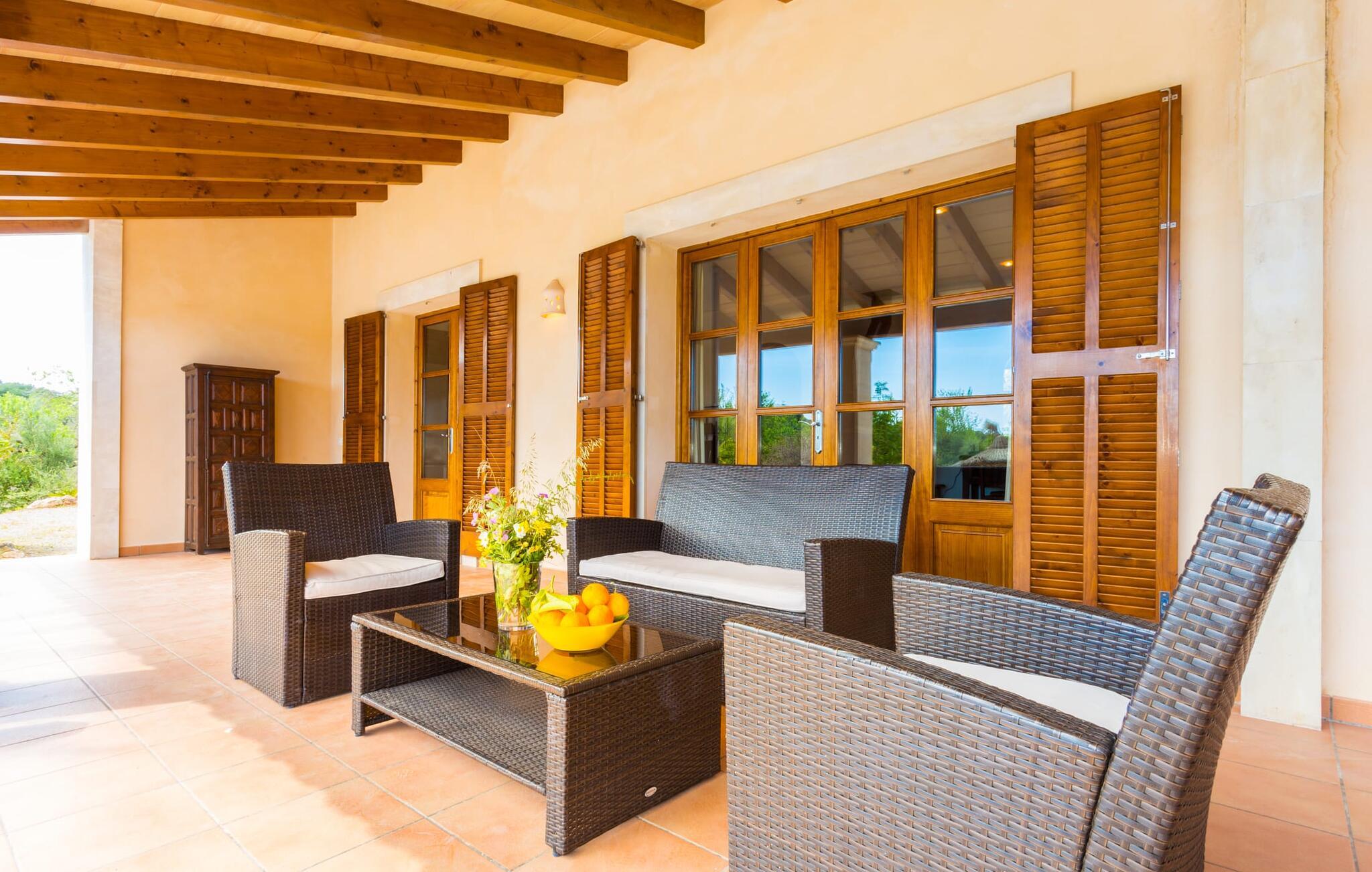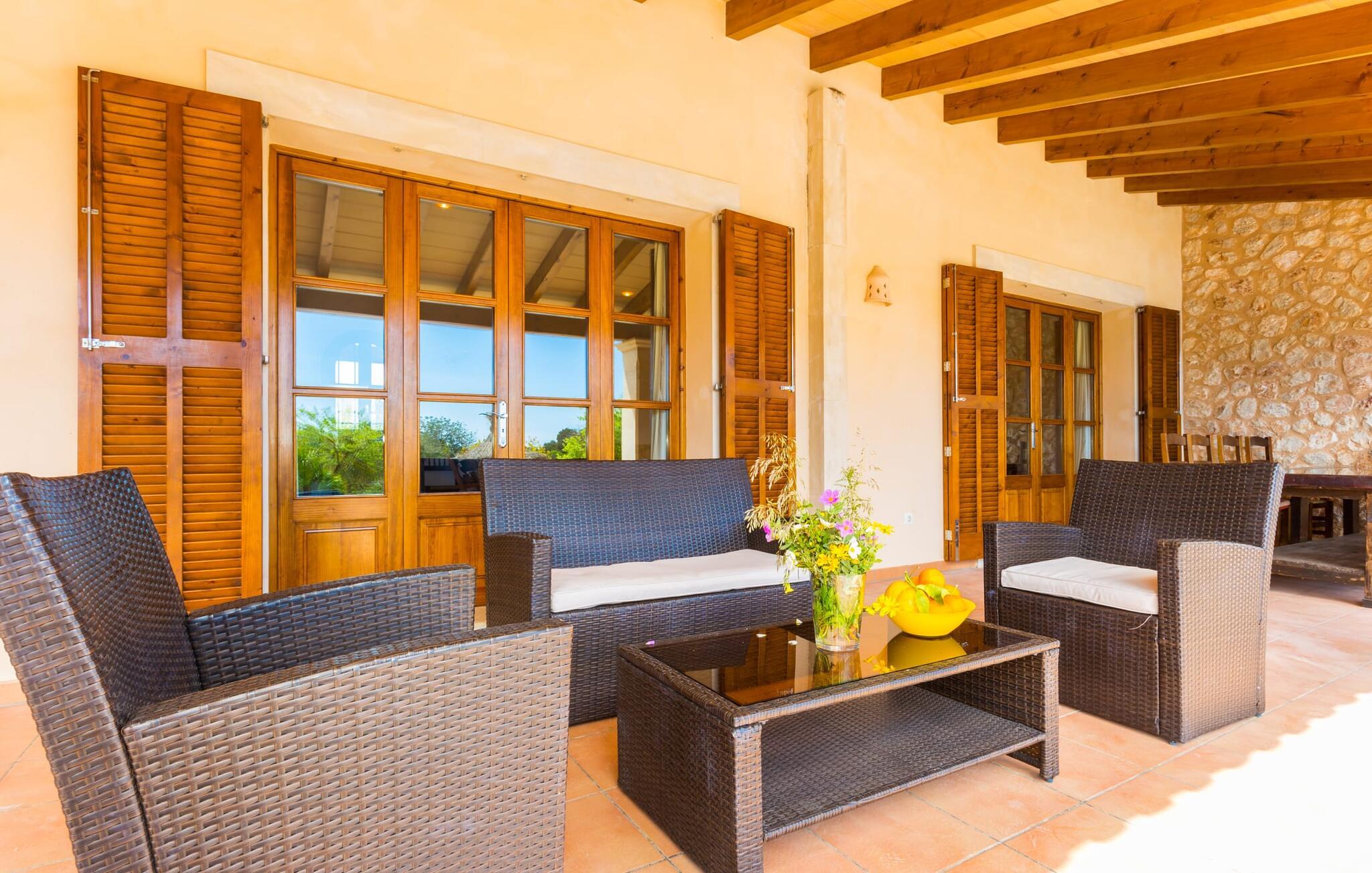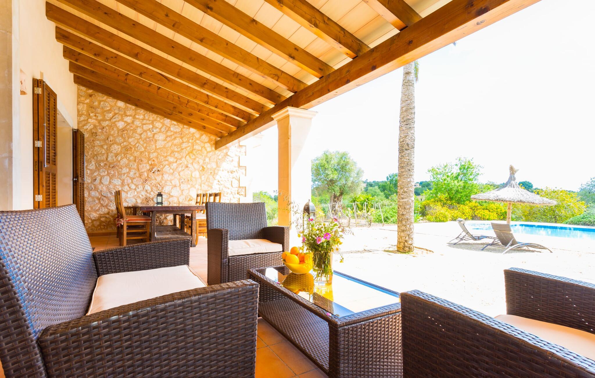Hvis I er nysgerrig, når I ankommer, vil en rundvisning i huset tage jer til poolområdet på få skridt. Den rummelige pool, som har en elegant afrundet indgang og er ideel til svømning, er omgivet af en flisebelagt terrasse, hvorpå der er liggestole. Udsigten er fascinerende, uanset hvor man står: enten over de tilstødende buske ind i det brede landskab mod bygningen, der foran er de to palmer og den faste parasol. Hvis I finder jeres perfekte plads på en af ??de mange liggestole, måske med en kølig drink ved hånden, kan I slappe af og slappe af i fuldstændig fred og ro. Simpelthen fantastisk: dette er den perfekte ferie! Stien til huset er asfalteret og omkranser de åbne grusarealer. I to trin når I ud til terrassen, som er generøst overdækket i hele den et-plans bygnings længde. Udover det rustikke spisebord og den hyggelige siddeplads er der mere end nok plads til alle former for aktiviteter. Det synlige træbjælkeloft er farvekoordineret med vinduer og skodder, hvilket skaber en behagelig atmosfære. Den omgivende mur lavet af traditionelt murværk fuldender udseendet. Der er også en muret grill i nærheden, hvor I kan tilberede og spise frisk indkøbt mad fra området. Her kan I sagtens tilbringe en hyggelig time! Søger I skygge, finder I nok plads under de to parasoller og den overdækkede terrasse.
