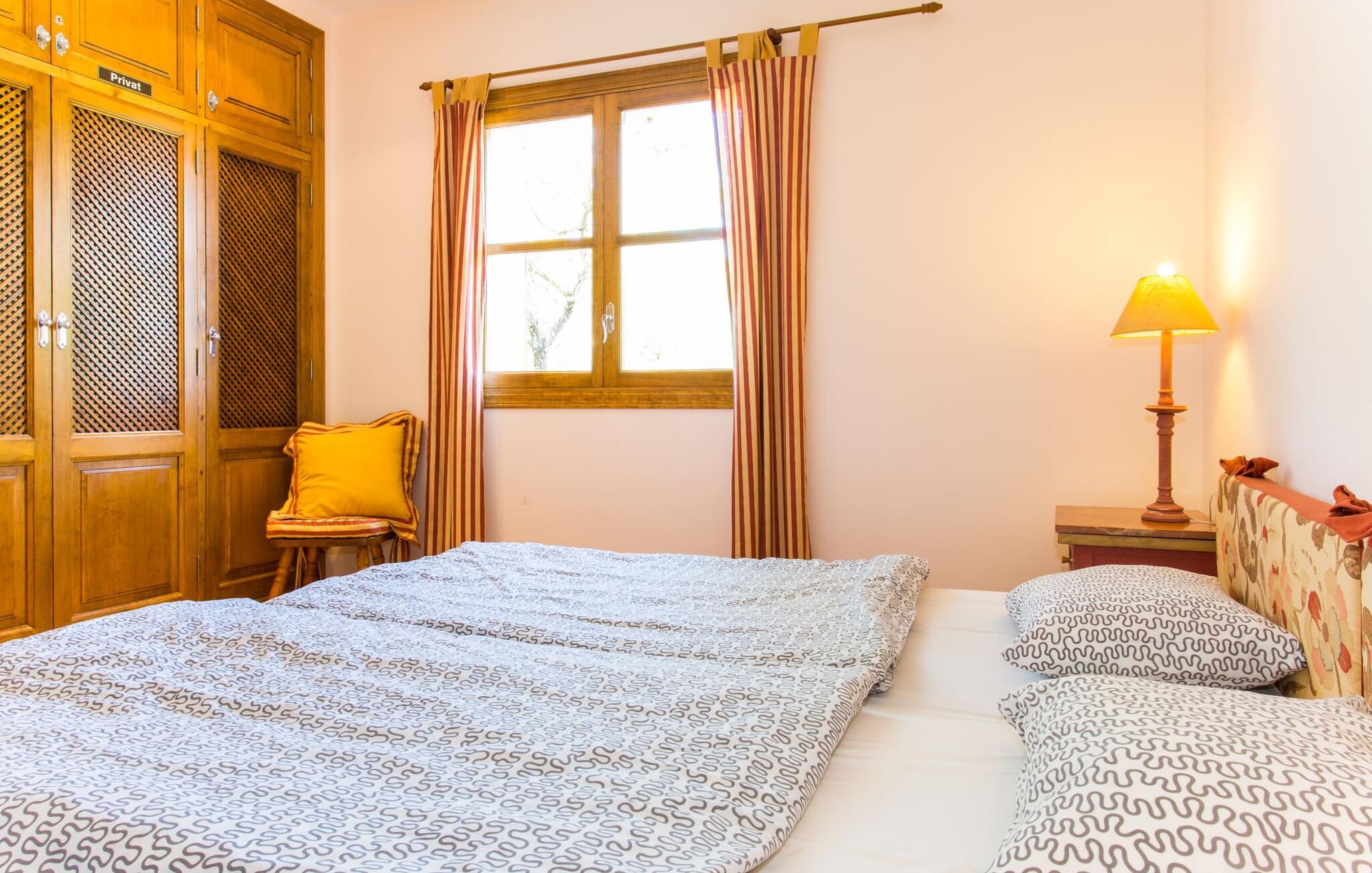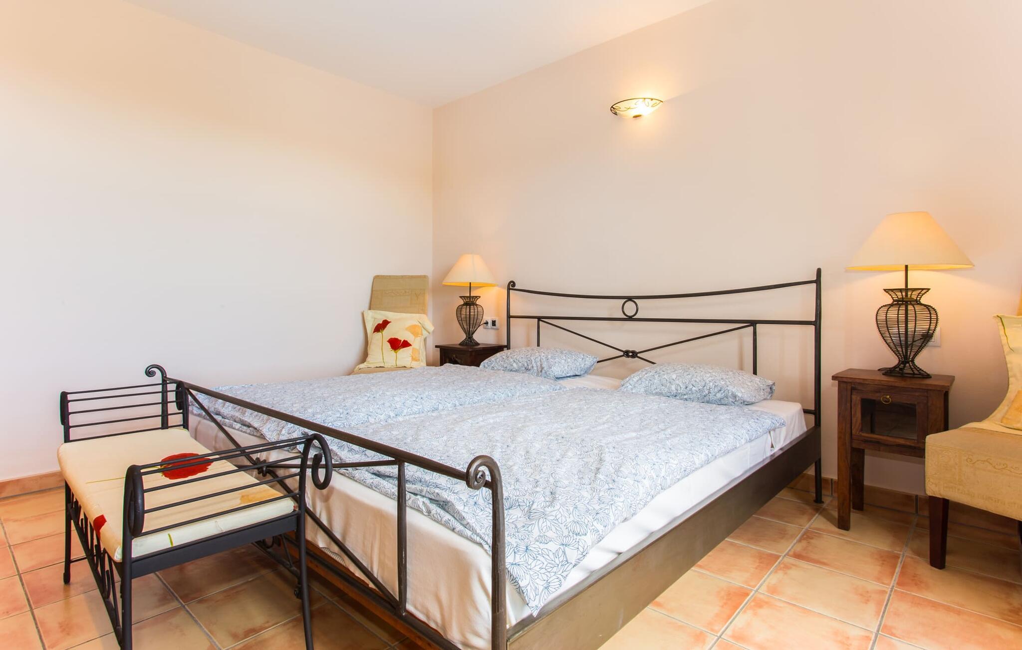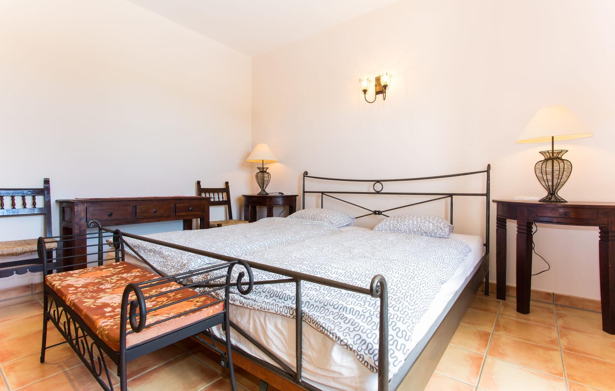 Hvis I er nysgerrig, når I ankommer, vil en rundvisning i huset tage jer til poolområdet på få skridt. Den rummelige pool, som har en elegant afrundet indgang og er ideel til svømning, er omgivet af en flisebelagt terrasse, hvorpå der er liggestole. Udsigten er fascinerende, uanset hvor man står: enten over de tilstødende buske ind i det brede landskab mod bygningen, der foran er de to palmer og den faste parasol. Hvis I finder jeres perfekte plads på en af ??de mange liggestole, måske med en kølig drink ved hånden, kan I slappe af og slappe af i fuldstændig fred og ro. Simpelthen fantastisk: dette er den perfekte ferie! Stien til huset er asfalteret og omkranser de åbne grusarealer. I to trin når I ud til terrassen, som er generøst overdækket i hele den et-plans bygnings længde. Udover det rustikke spisebord og den hyggelige siddeplads er der mere end nok plads til alle former for aktiviteter. Det synlige træbjælkeloft er farvekoordineret med vinduer og skodder, hvilket skaber en behagelig atmosfære. Den omgivende mur lavet af traditionelt murværk fuldender udseendet. Der er også en muret grill i nærheden, hvor I kan tilberede og spise frisk indkøbt mad fra området. Her kan I sagtens tilbringe en hyggelig time! Søger I skygge, finder I nok plads under de to parasoller og den overdækkede terrasse.