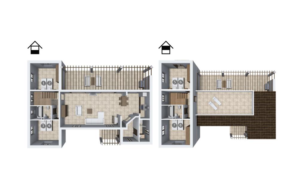 Gulvet i huset er fuldstændig flisebelagt; Hele ejendommen fanger solen rigtig godt og fremstår derfor meget lys og indbydende. I stueetagen af ??bygningen finder I den åbne stue, som er komfortabelt indrettet med en blanding af moderne og traditionelle møbler. I vil med garanti hygge jer i det hyggelige sofaområde, ved brændeovnen eller foran fjernsynet! I tilknytning hertil ligger det åbne køkken med spiseplads, hvis udstyr intet lader tilbage at ønske. På denne etage er der yderligere to soveværelser og to badeværelser - hvoraf det ene også indeholder vaskemaskinen. På øverste etage er der yderligere to dobbeltværelser, et badeværelse og som et særligt højdepunkt en lille terrasse, hvor I kan nyde mange skønne timer i solen. Alle soveværelser er funktionelt indrettede og byder på masser af opbevaringsplads takket være indbyggede skabe. Badeværelserne er udstyret med badekar og brusere. De rustikke spejle, smukke tilbehør og skarpe lys vil mere end opfylde alle jeres forventninger.