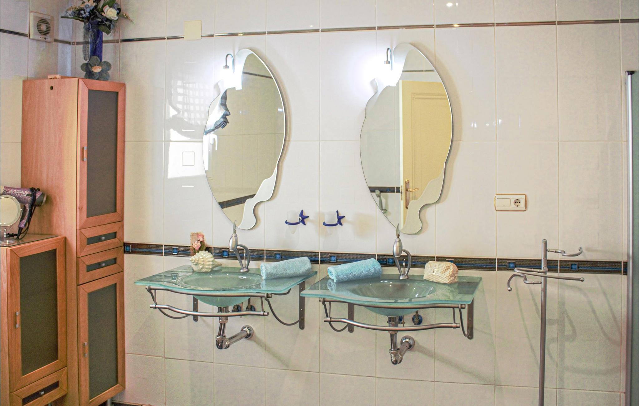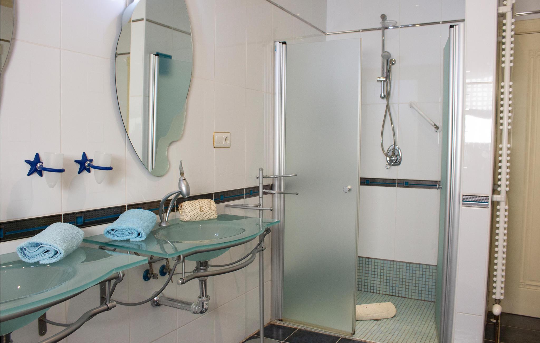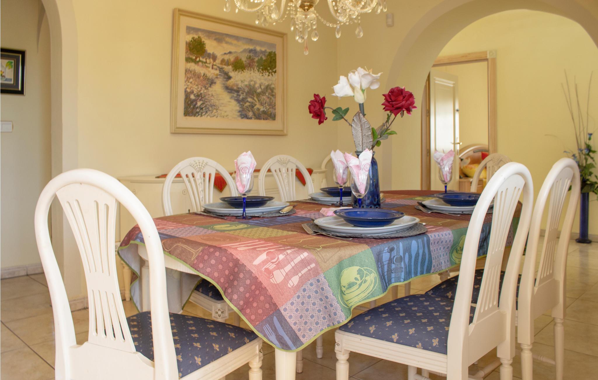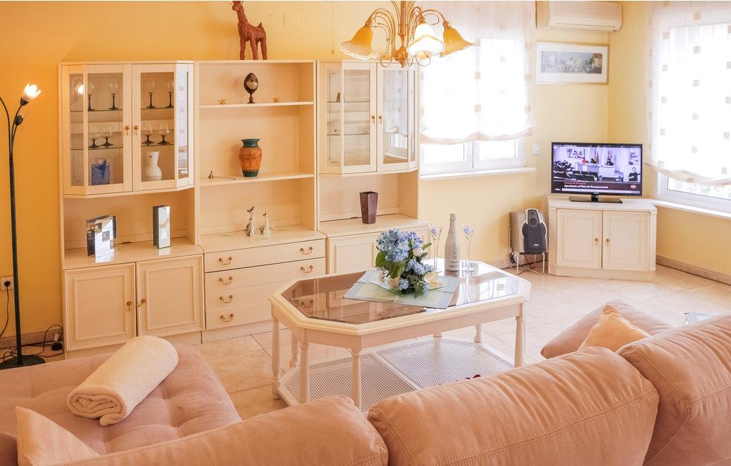 Der er to badeværelser og tre soveværelser, hvoraf to har dobbeltsenge, så huset kan rumme op til seks personer. Det er komfortabelt indrettet i tiltalende farver og danner en smuk ramme om ferier i hver sæson. På varme sommerdage sørger klimaanlægget for behagelige temperaturer i alle rum.