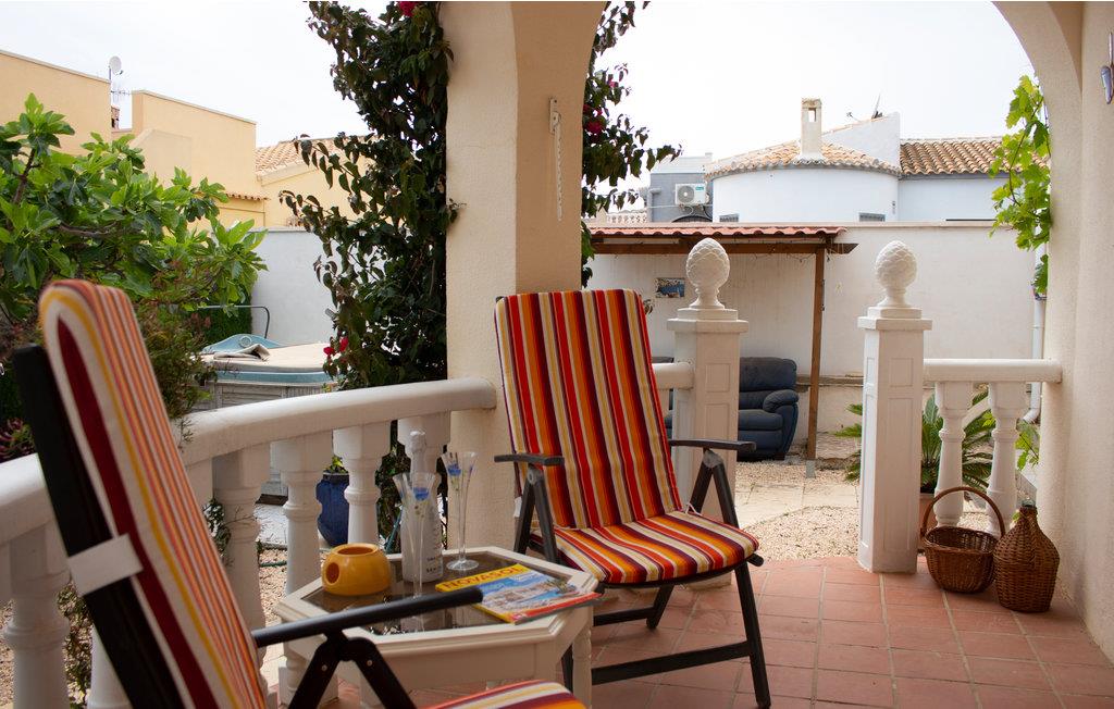 Udenfor inviterer den overdækkede terrasse, der er udstyret med havemøbler, til behagelige timer udendørs.