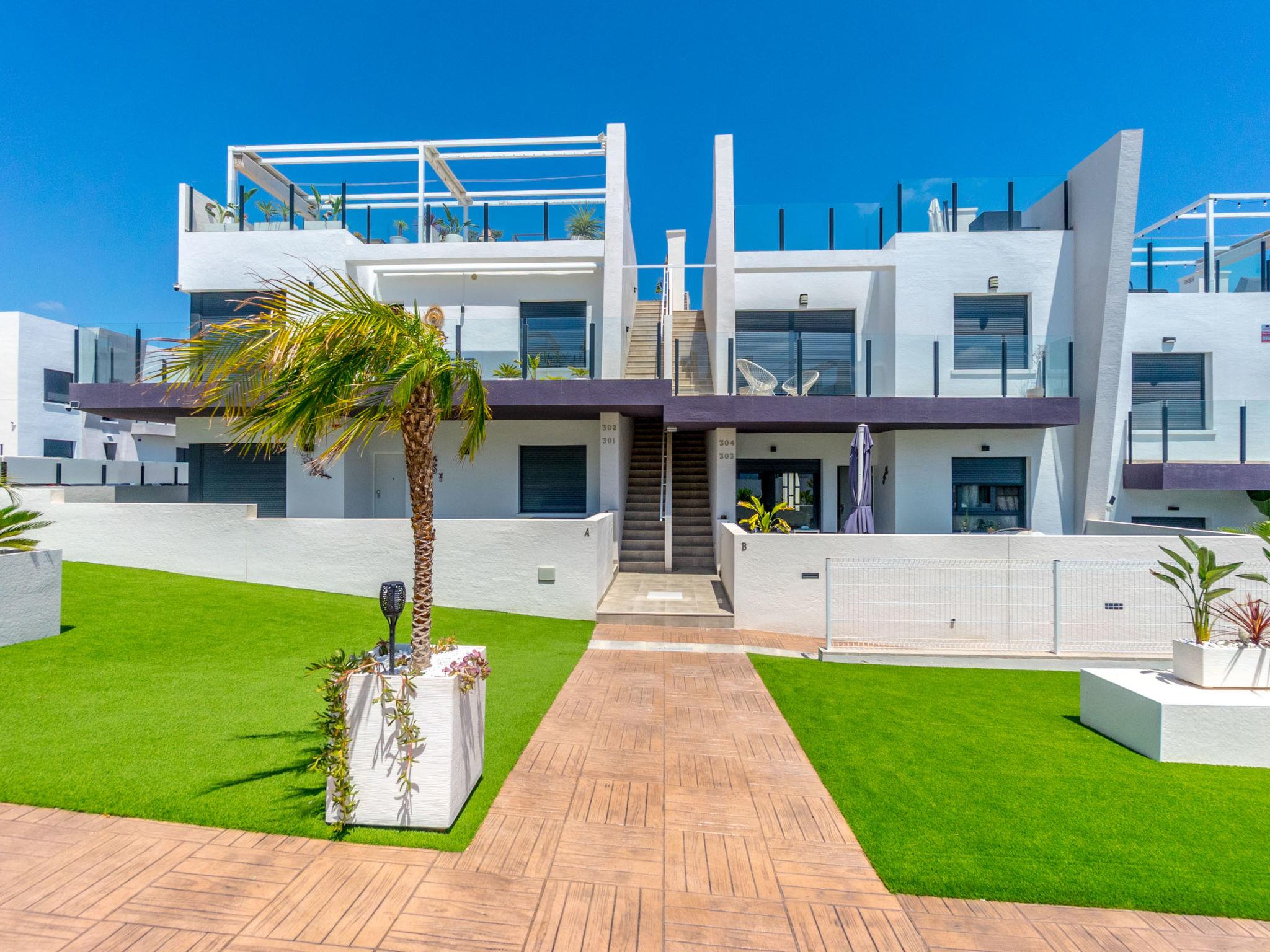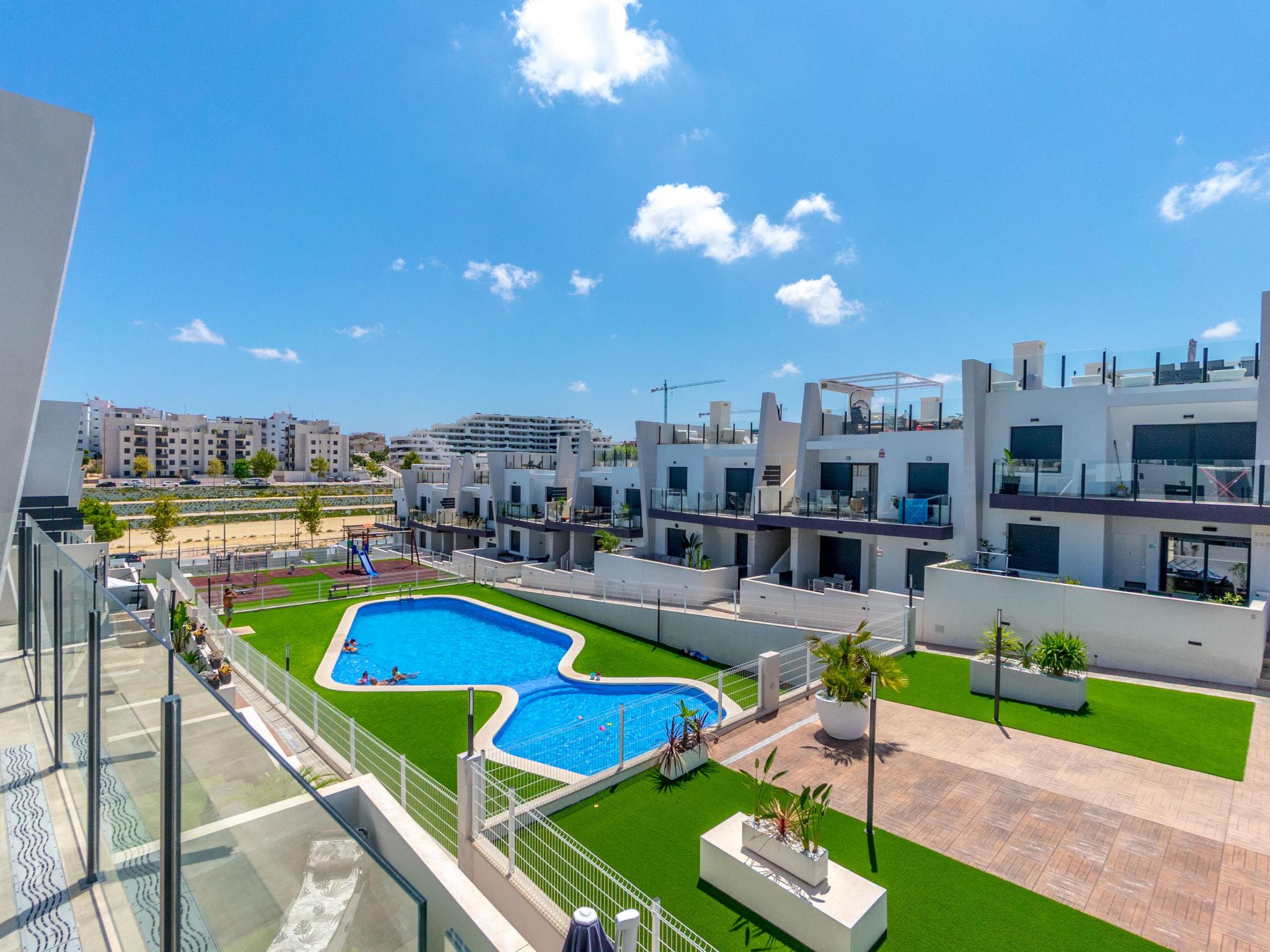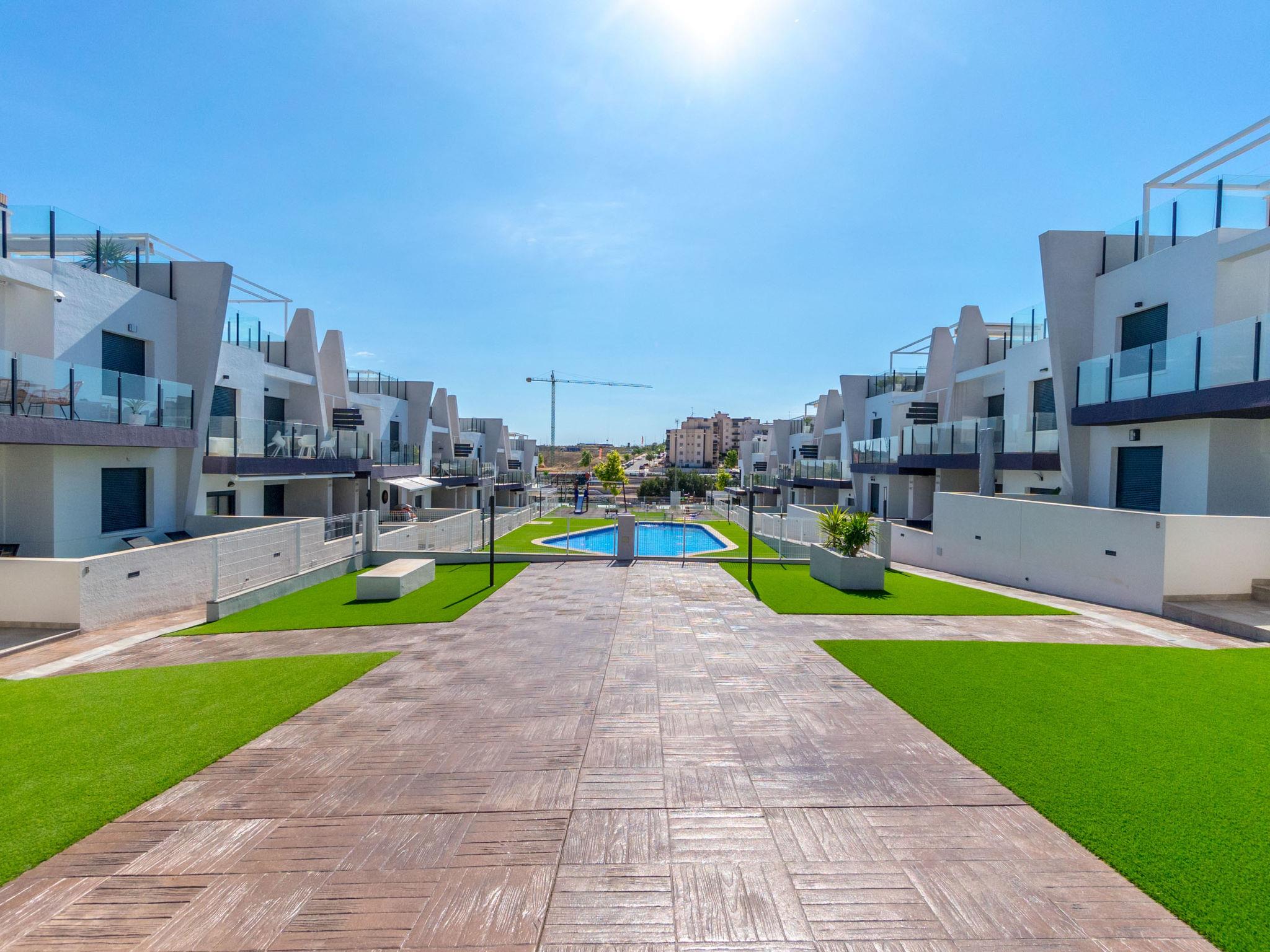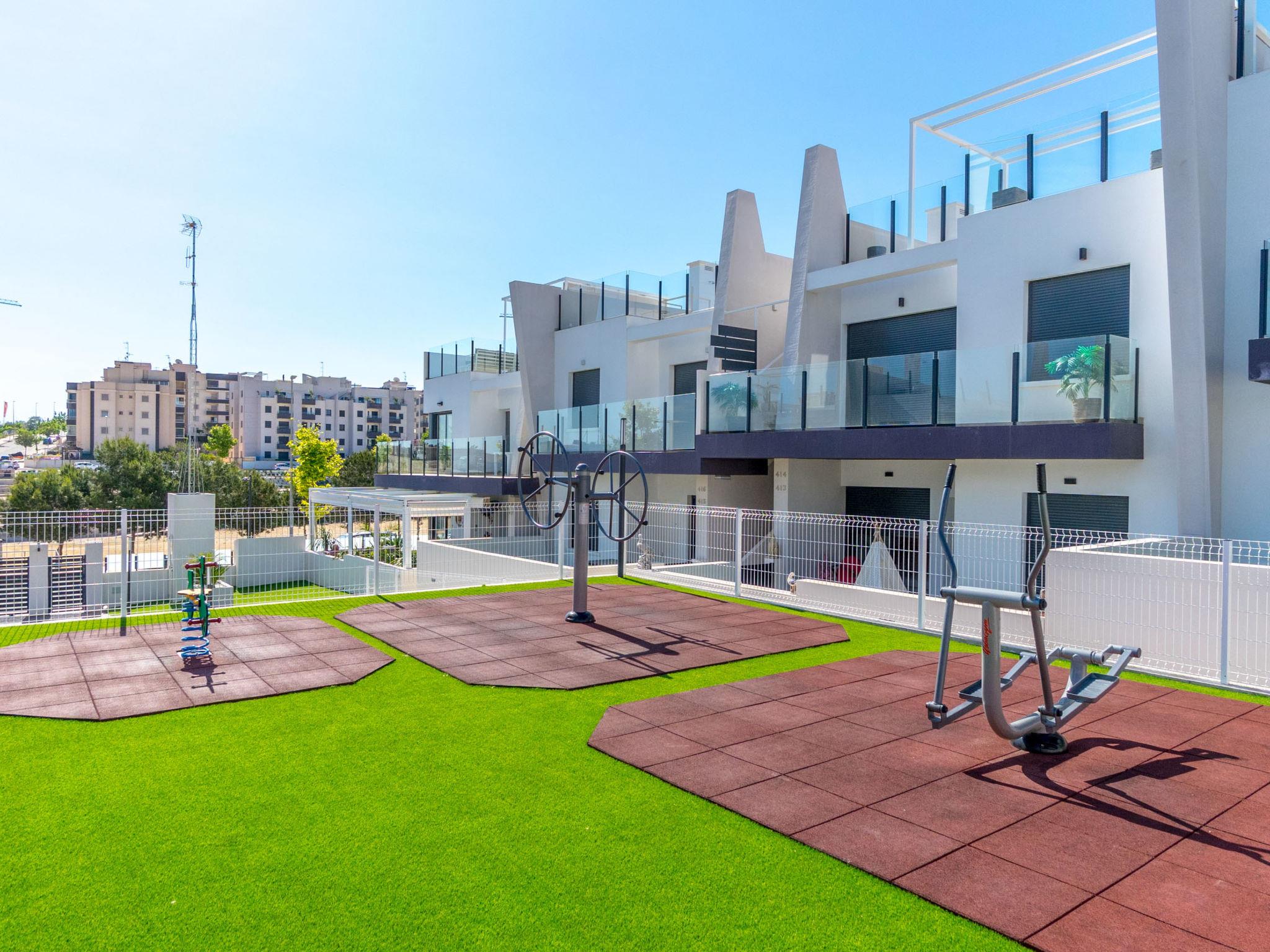 Modern, beautiful apartment block "Residencial Saoco", 2 storeys. 1.5 km from the centre of San Miguel de Salinas, 11 km from the centre of La Zenia, in a quiet, sunny position, traffic calmed area, 11 km from the sea, 11 km from the beach. For shared use: property (fenced), swimming pool (seasonal availability: 01.Jan. - 31.Dec.). Children's pool, outdoor shower, children's playground (slide, swing). In the house: roof terrace. Grocery 1.7 km, supermarket 1.7 km, restaurant 2 km, bus stop 1.9 km, sandy beach "Playa de La Zenia" 11 km. Golf course (18 hole) 9 km.