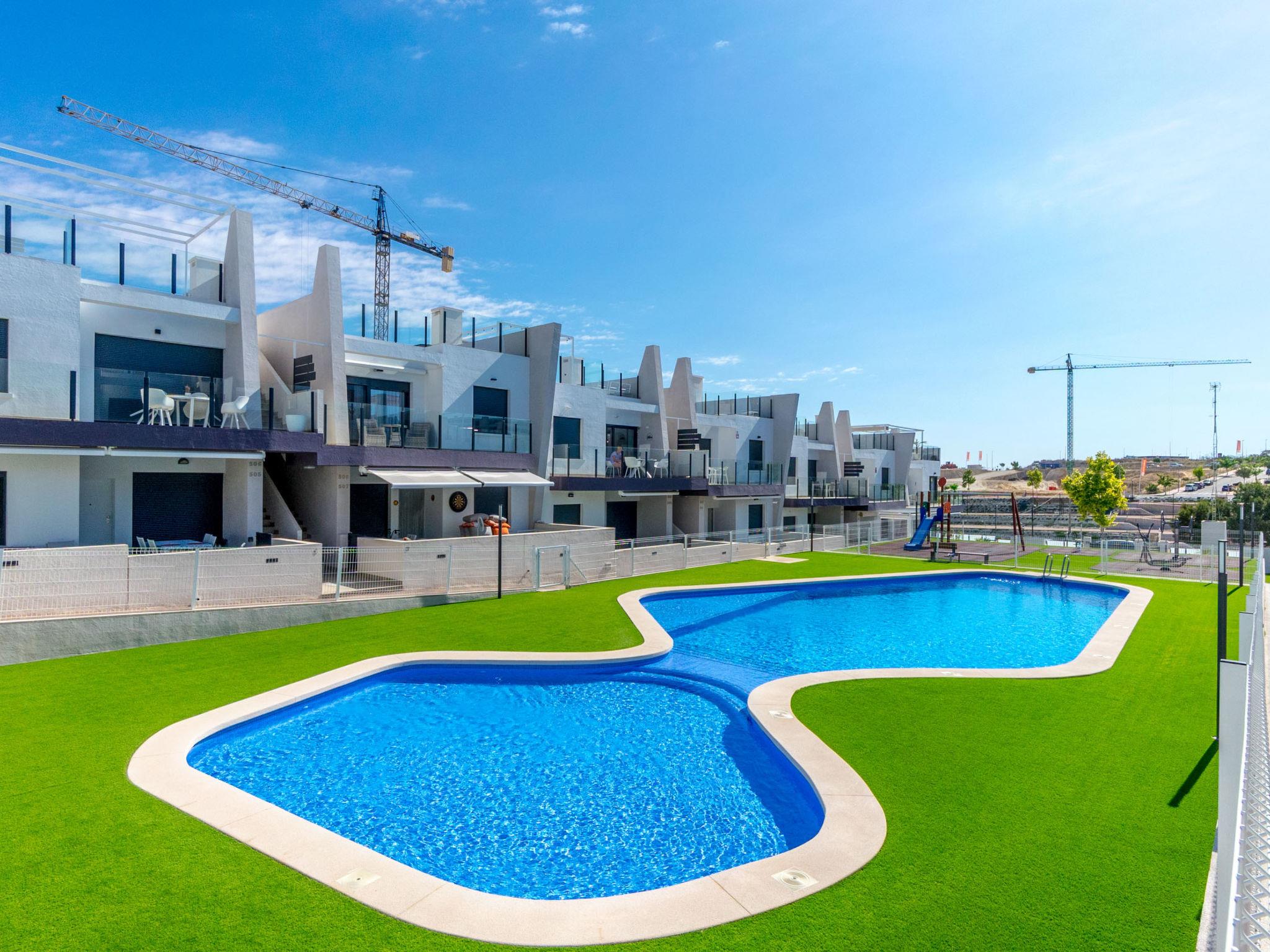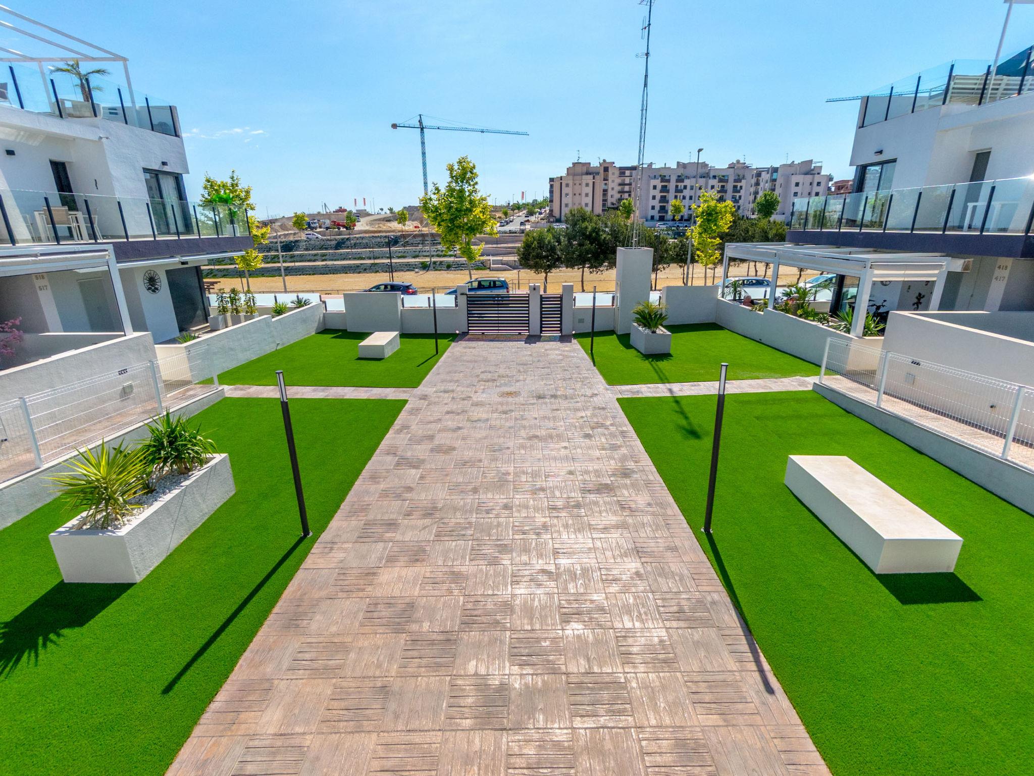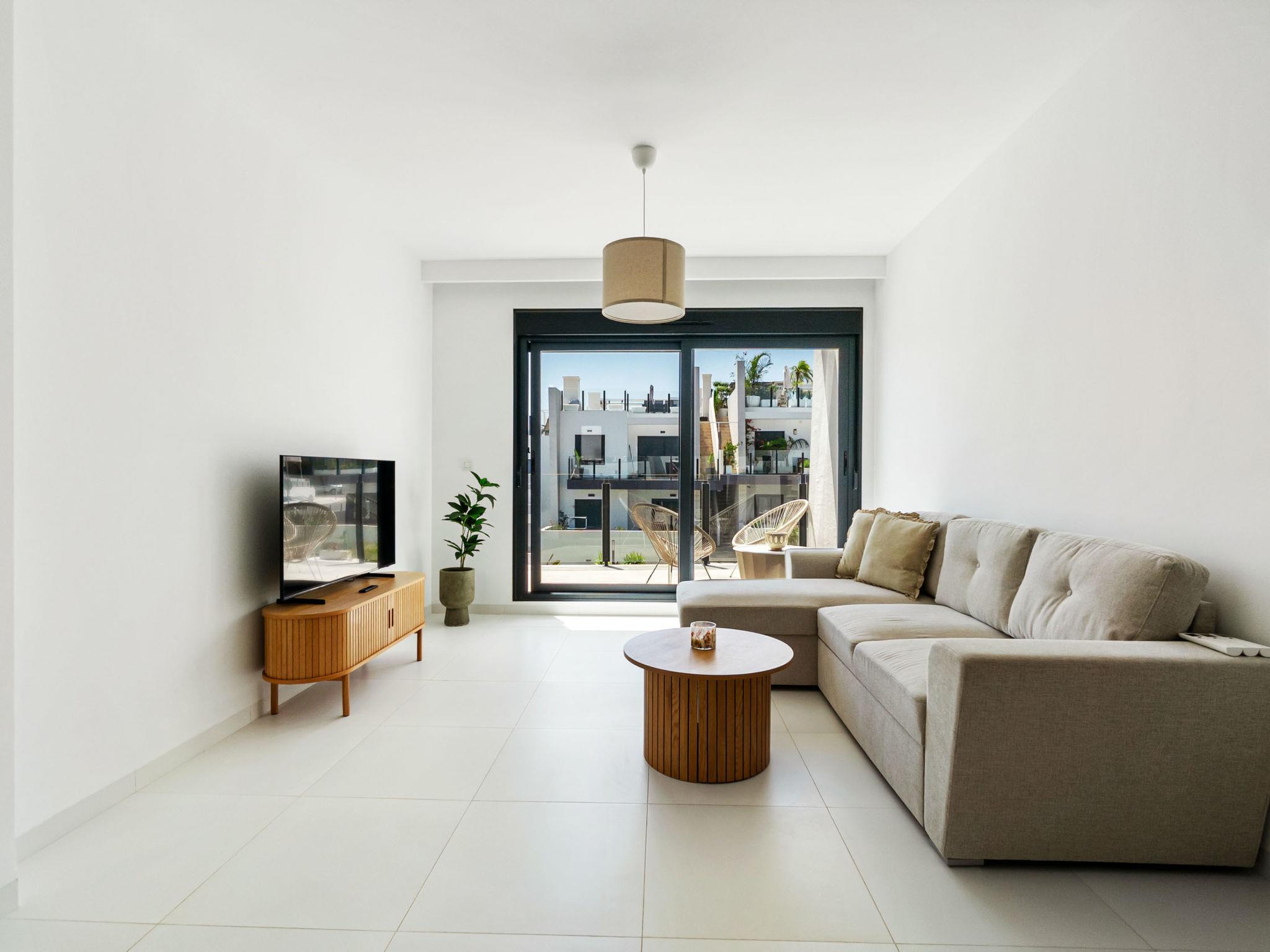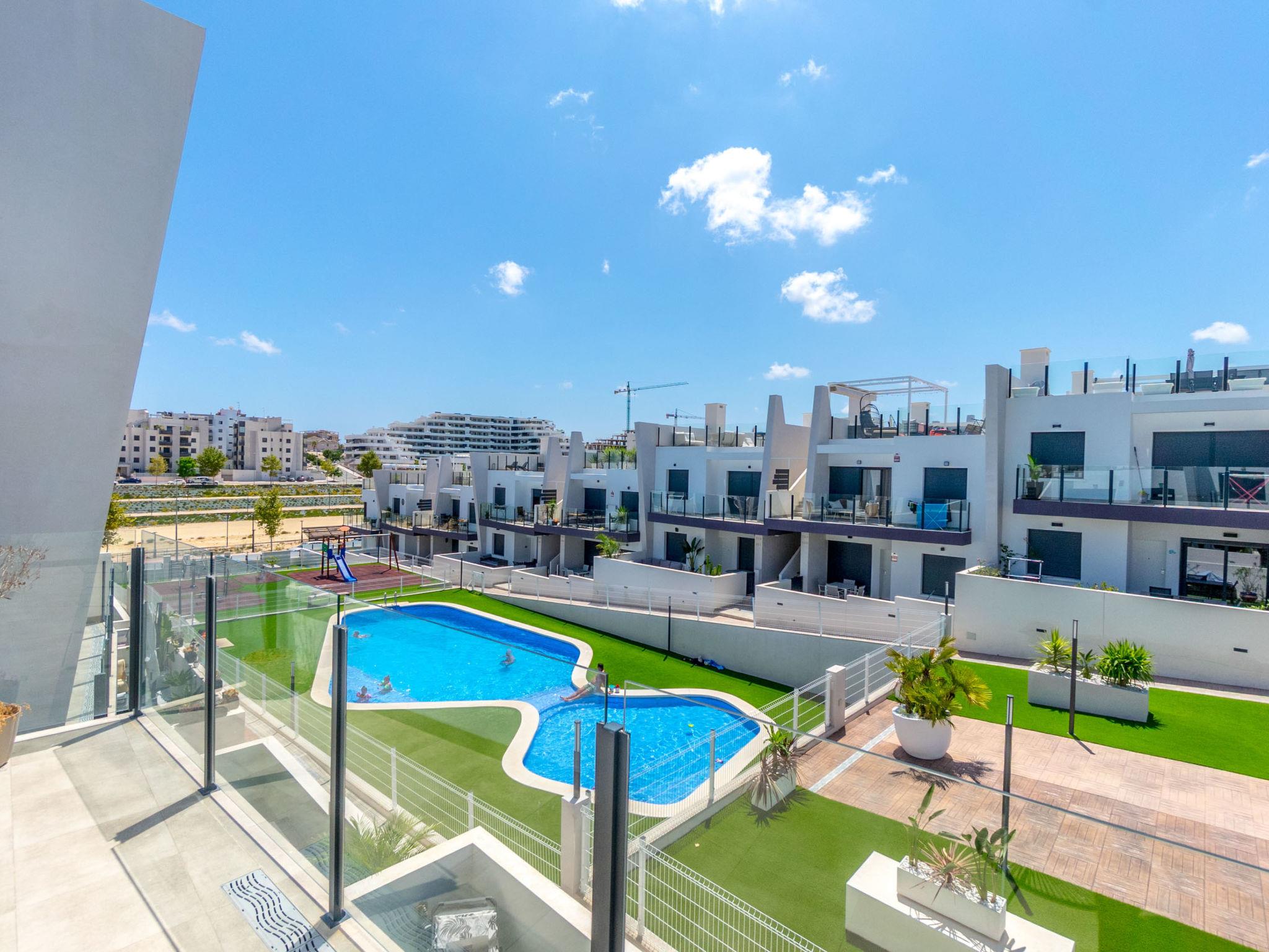 Modern, beautiful apartment block "Residencial Saoco", 2 storeys. 1.5 km from the centre of San Miguel de Salinas, 11 km from the centre of La Zenia, in a quiet, sunny position, traffic calmed area, 11 km from the sea, 11 km from the beach. For shared use: property (fenced), swimming pool (seasonal availability: 01.Jan. - 31.Dec.). Children's pool, outdoor shower, children's playground (slide, swing). In the house: roof terrace. Grocery 1.7 km, supermarket 1.7 km, restaurant 2 km, bus stop 1.9 km, sandy beach "Playa de La Zenia" 11 km. Golf course (18 hole) 9 km.