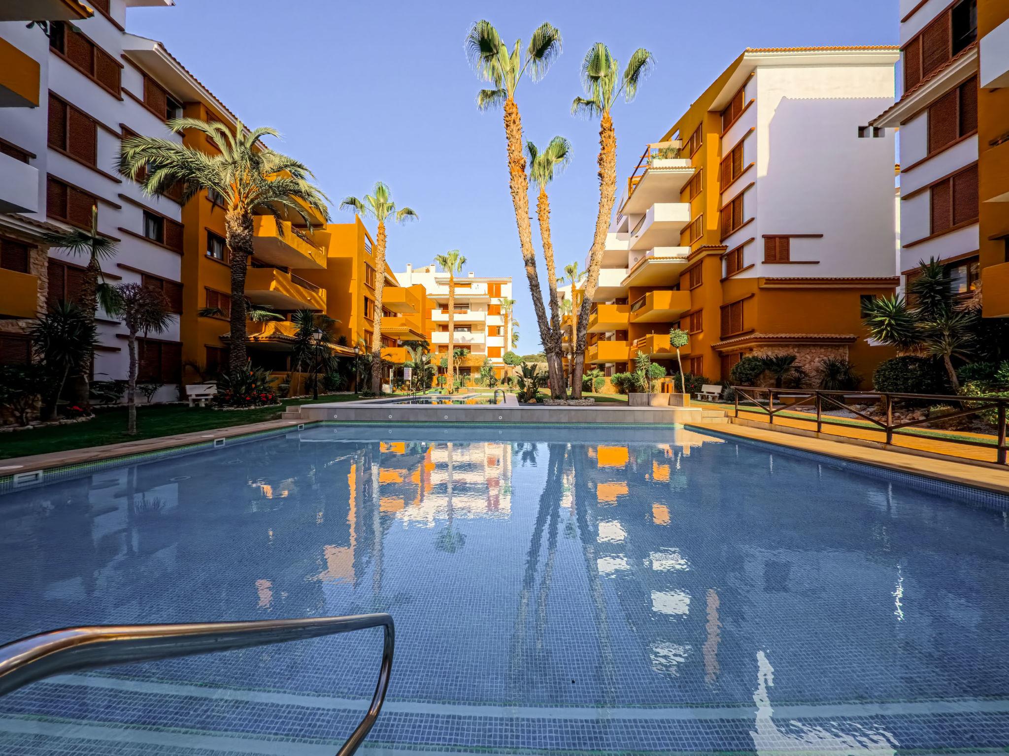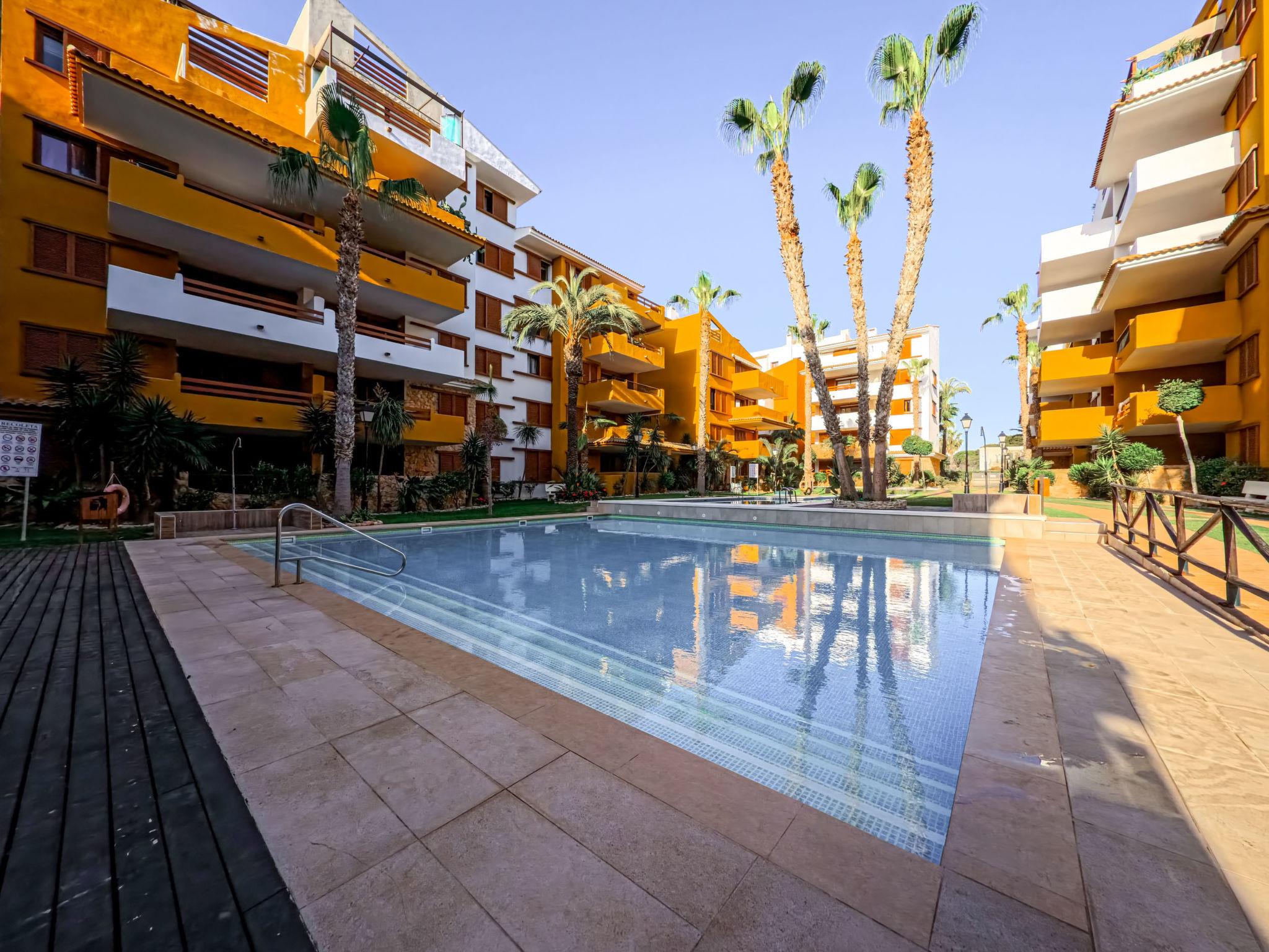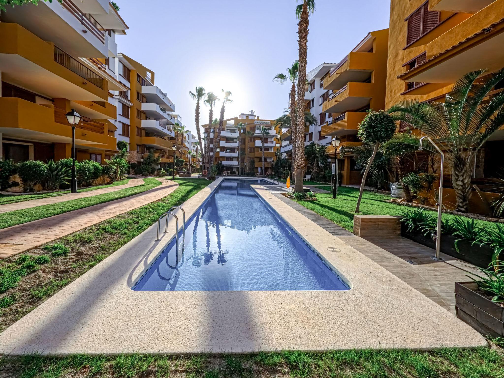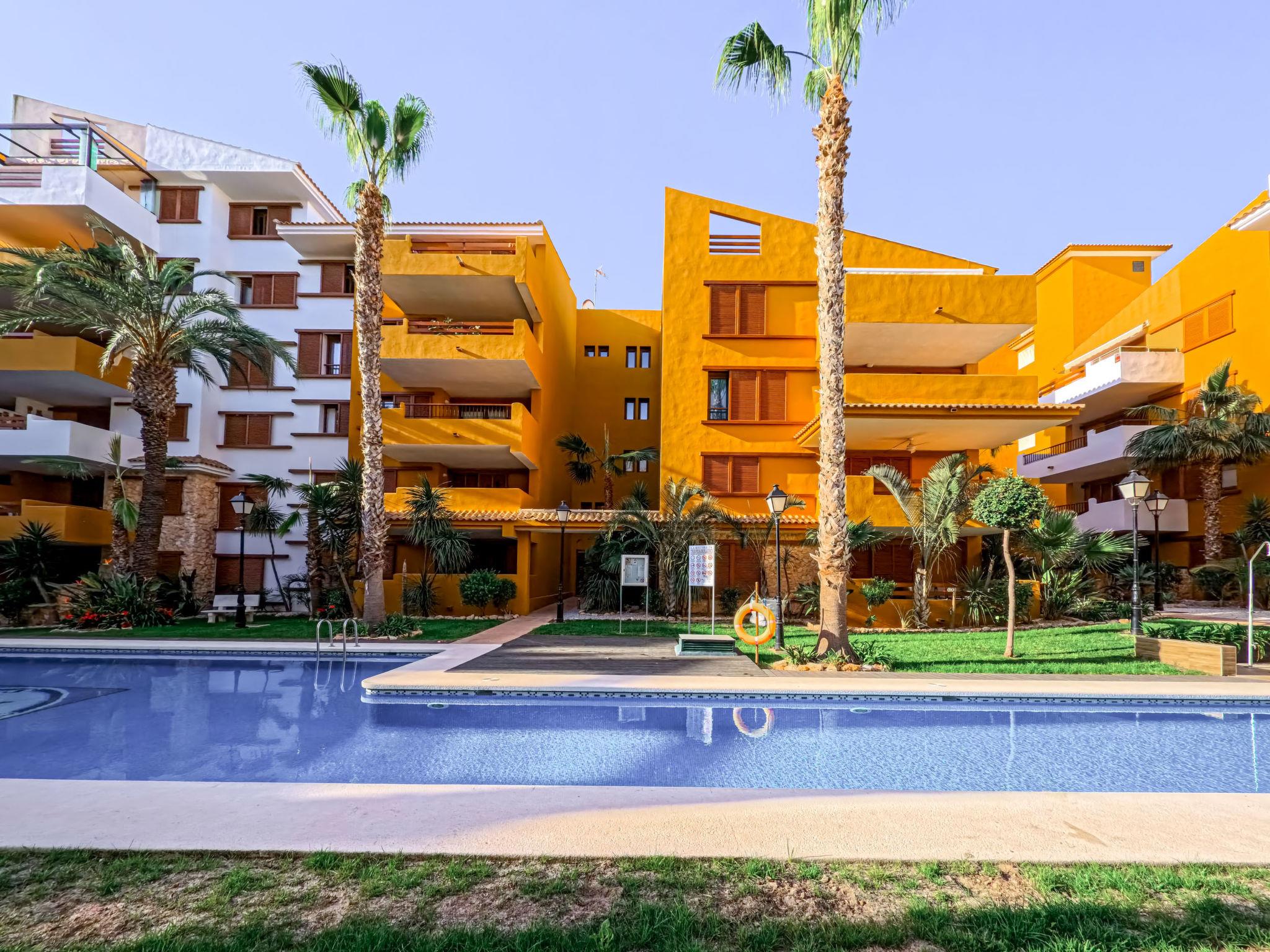 Punta Prima: Beautiful apartment block "La Recoleta". 7 km from the centre of Torrevieja, 3 km from the centre of Orihuela Costa, 300 m from the sea, 900 m from the beach. For shared use: property (fenced), beautiful, well-kept garden flowers and trees, lawn for sunbathing, 3 swimming pools (26 x 6 m, seasonal availability: 01.Jan. - 31.Dec.) with internal staircase. Outdoor shower. In the house: lift. Grocery 1.8 km, supermarket 1.8 km, shopping centre 1 km, restaurant 300 m, bus stop 600 m, sandy beach "Playa Punta Prima", swimming bay 300 m. Sports harbour 5 km, marina 5 km, golf course 7 km. The owner does not accept any youth groups.
