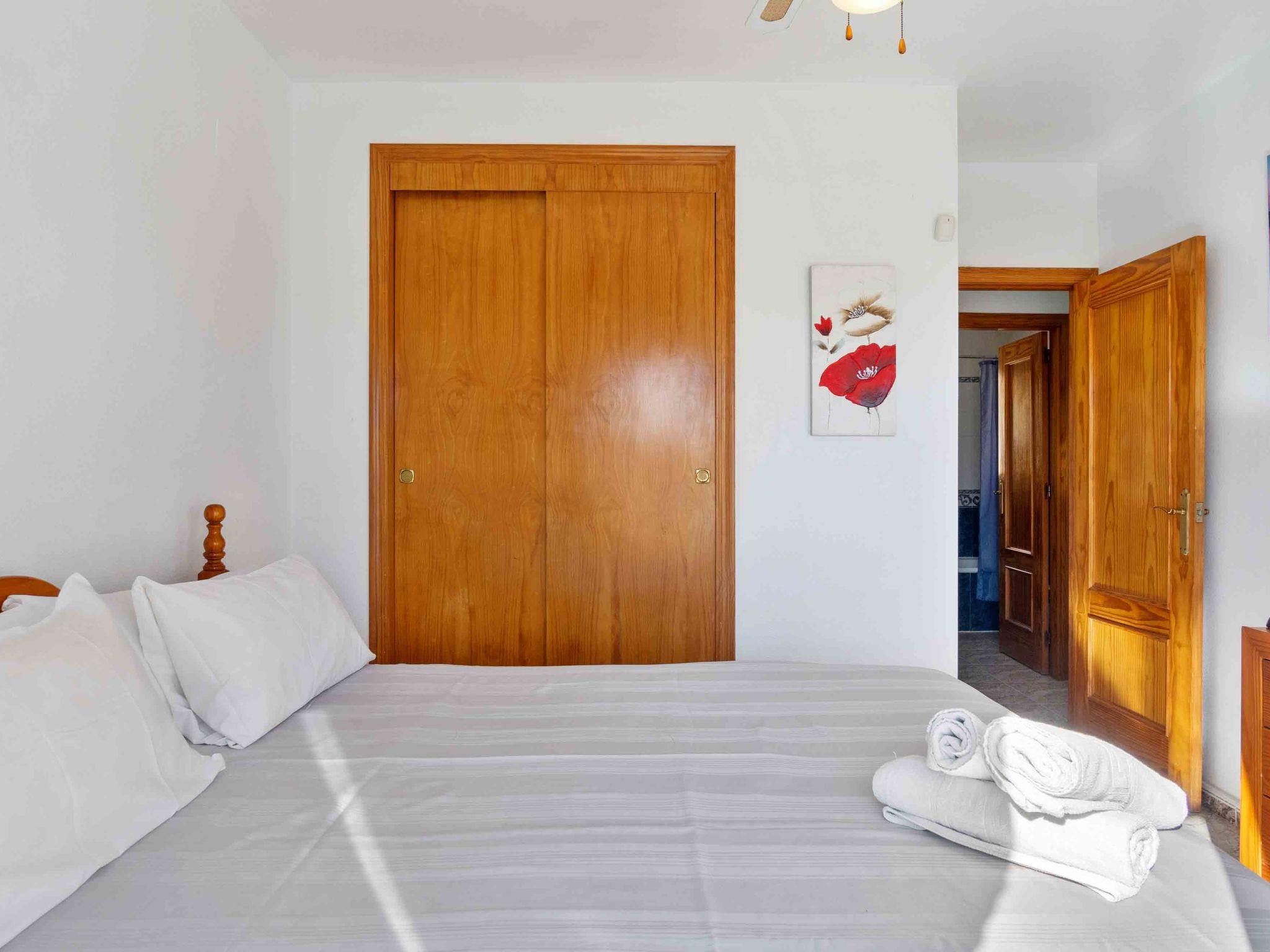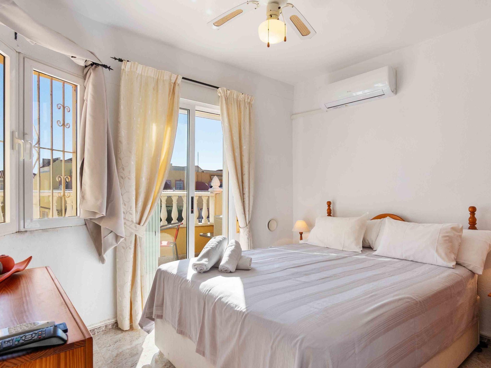 "Lomas de Cabo Roig", 3-room terraced house 64 m2. Spacious and bright, comfortable and beautiful furnishings: open living/dining room with satellite TV, air conditioning and forced-air heating. Exit to the terrace. Open kitchen (oven, 4 ceramic glass hob hotplates, toaster, microwave, electric coffee machine). Sep. WC. Upper floor: 1 room with 1 french bed (1 x 160 cm, length 200 cm), satellite TV, air conditioning and fan. Exit to the terrace. 1 room with 2 beds (90 cm, length 200 cm), air conditioning and fan. Bath/bidet/WC. Terrace. Terrace furniture. View of the swimming pool. Facilities: washing machine, iron, baby cot, hair dryer. Parking at the house. Please note: suitable for families. Non-smoking house. Please note: Internet is only accessible in common areas. R000000001