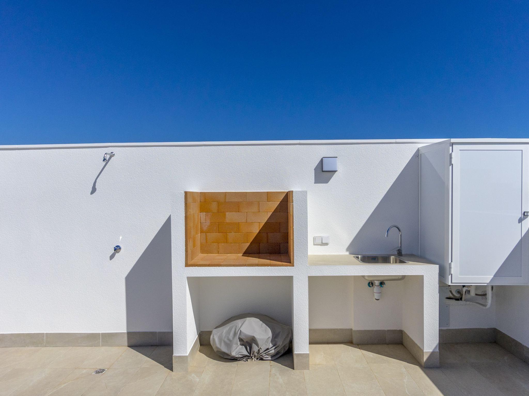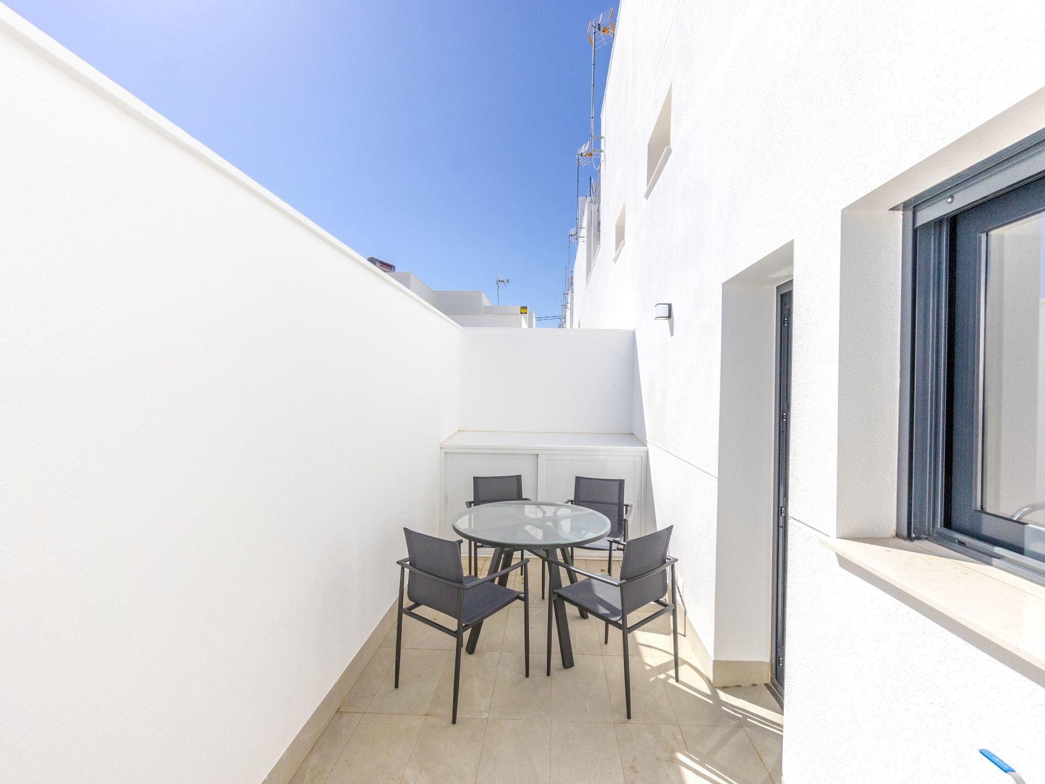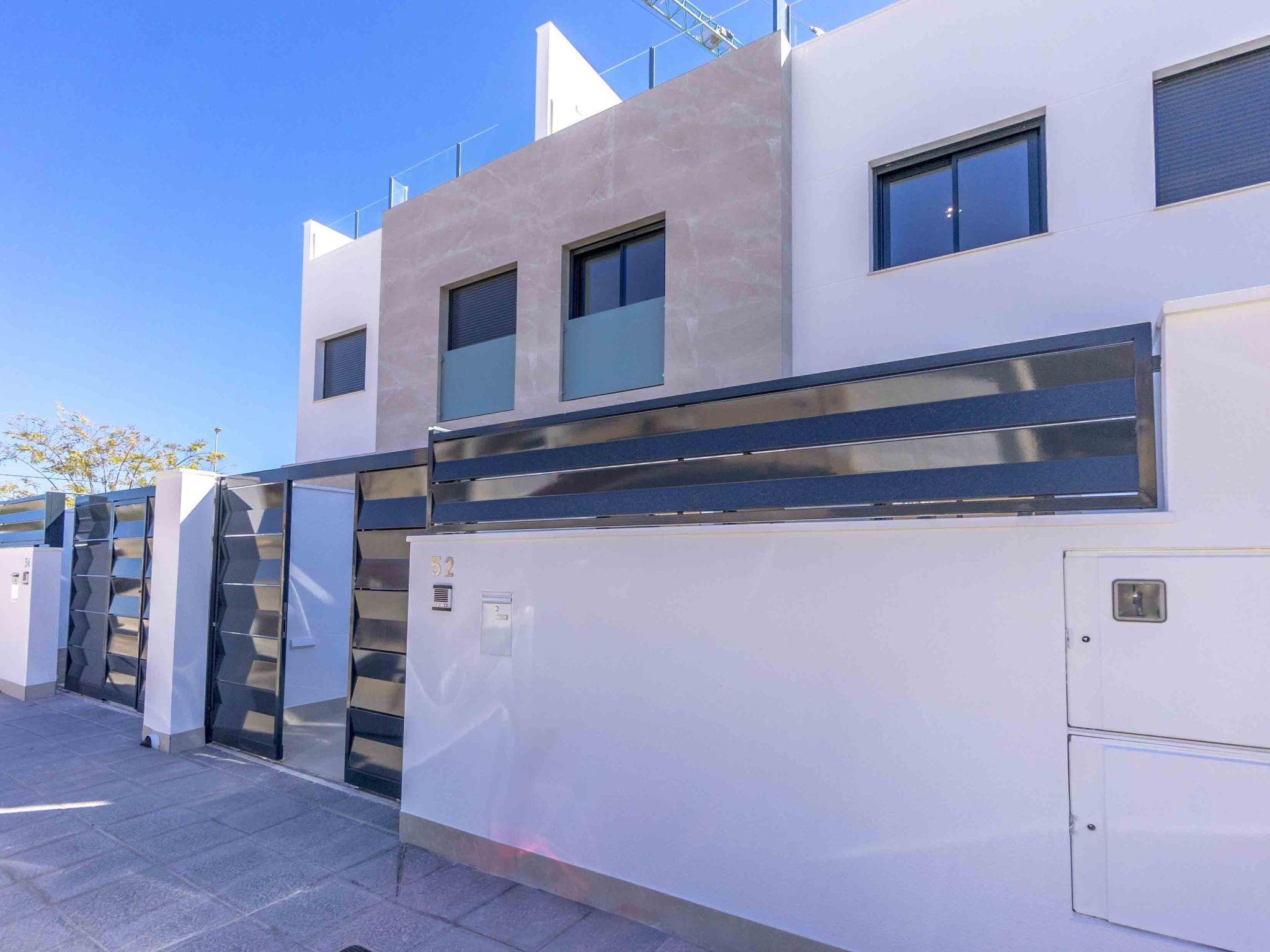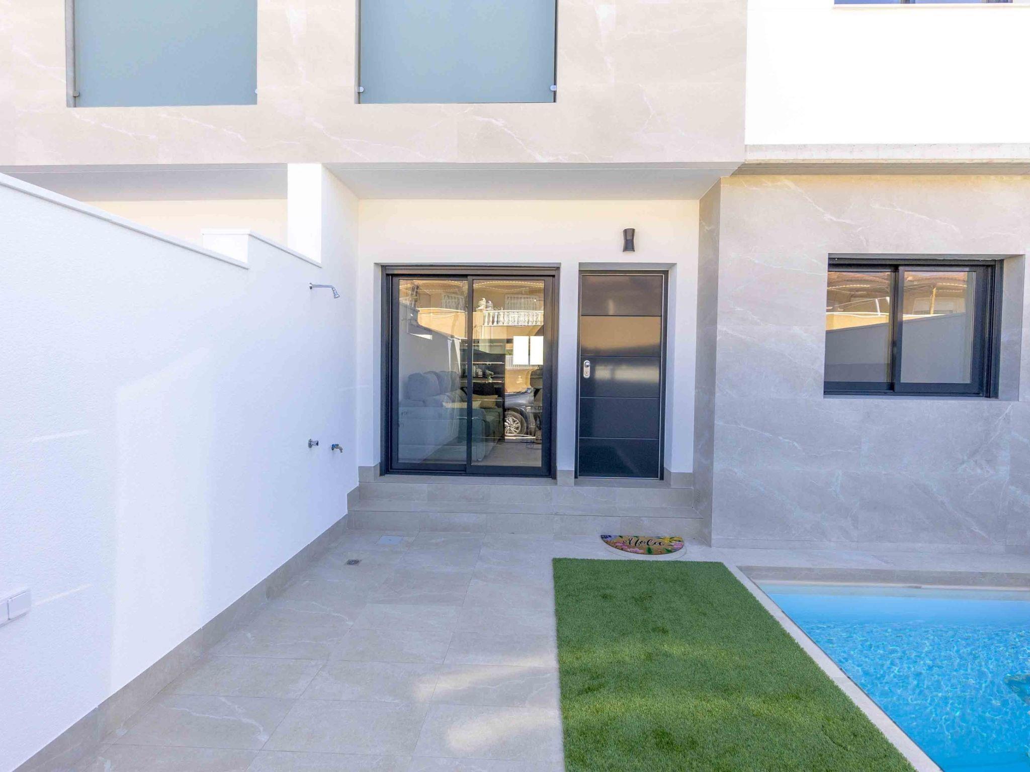 Modern, beautiful terraced house "Green Garden II", 3 storeys, built in 2024. In the resort 1 km from the centre of Pilar de la Horadada, 6 km from the centre of Dehesa de Campoamor, in a quiet, sunny position residential area (villas), 3 km from the sea, 300 km from the beach. Private: property (fenced), swimming pool (4 x 3 m, seasonal availability: 01.Jan. - 31.Dec.). In the house: sun terrace. Parking at the house. Grocery 1 km, supermarket 1 km, restaurant 1 km, bar 350 m, bakery 1 km, bus stop "Pilar de la Horadada Vta" 2 km, railway station "Orihuela" 34 km, sandy beach "Playa del Puerto" 3 km. Sports harbour 4 km, marina 4 km, golf course (18 hole) 4 km. The owner does not accept any youth groups.