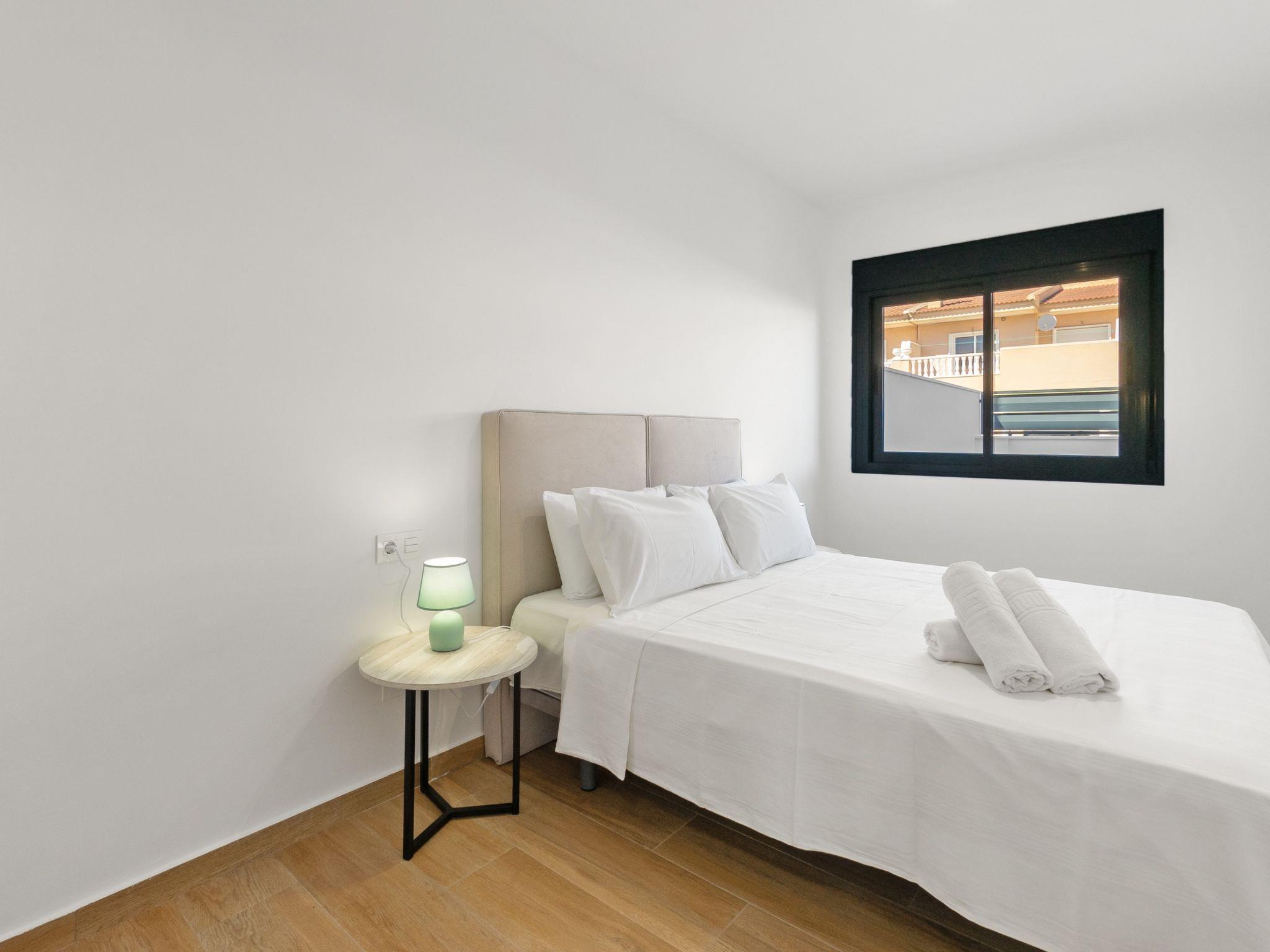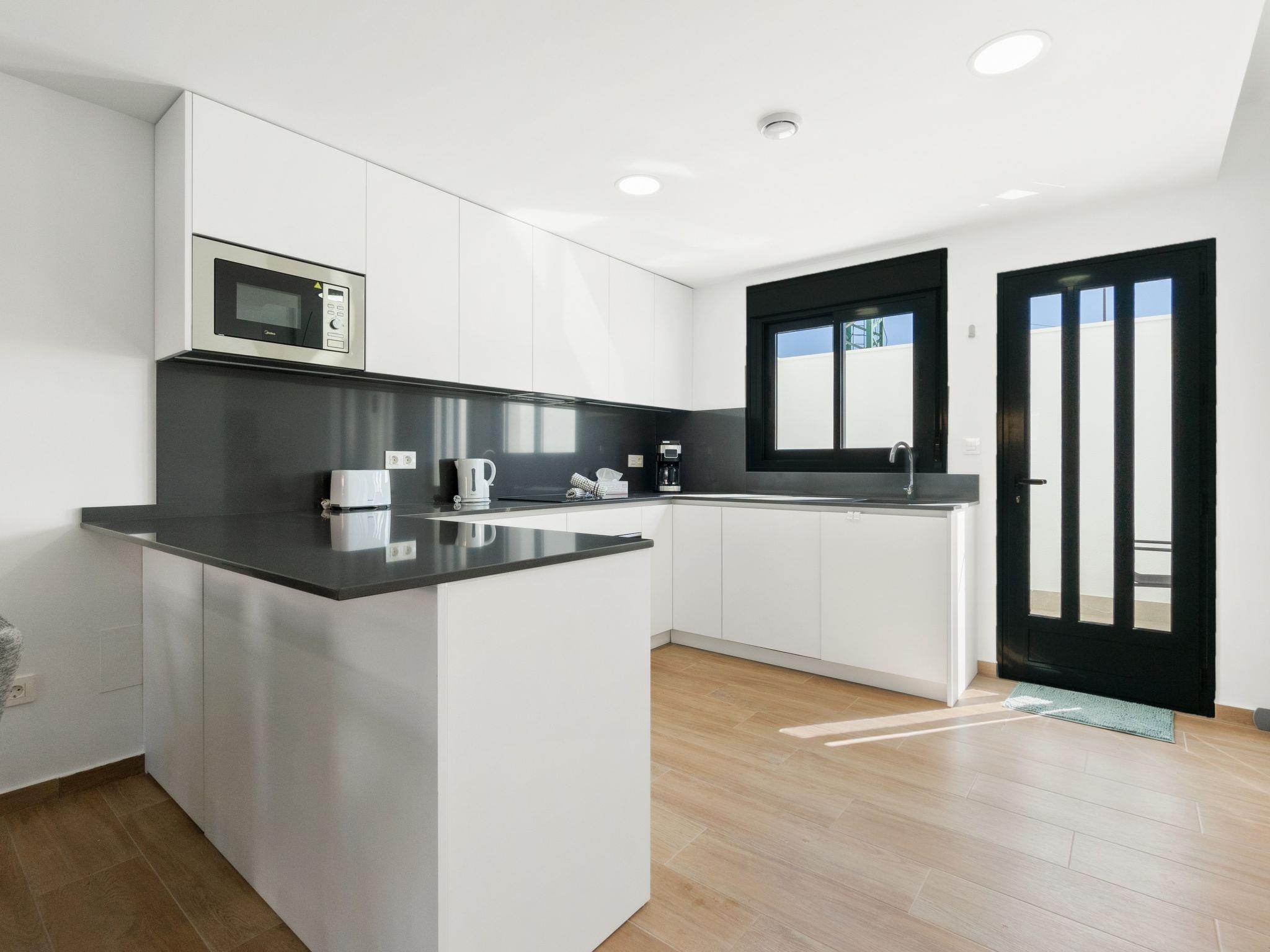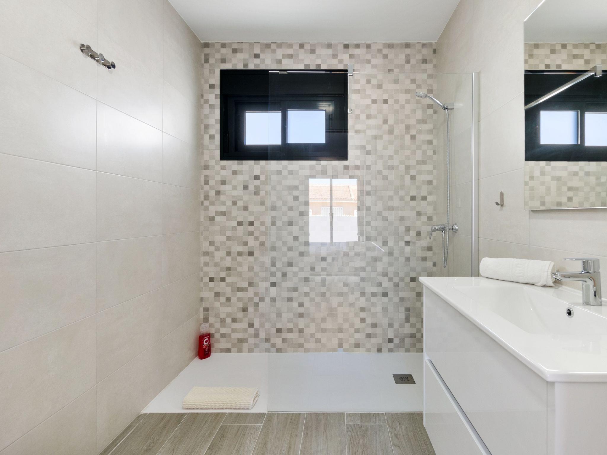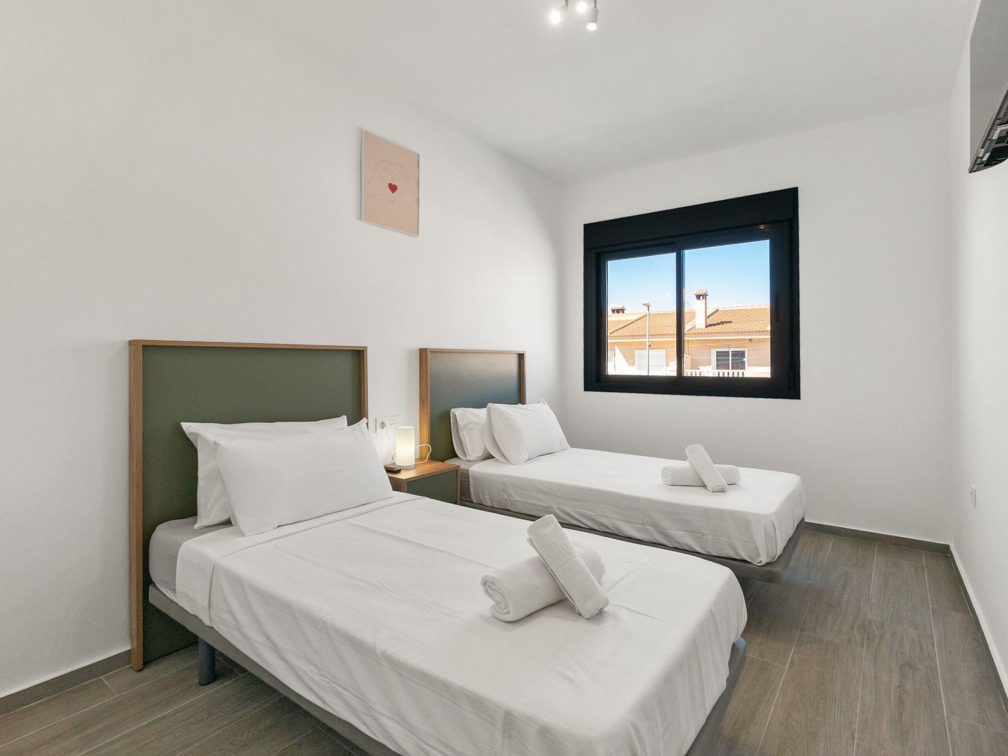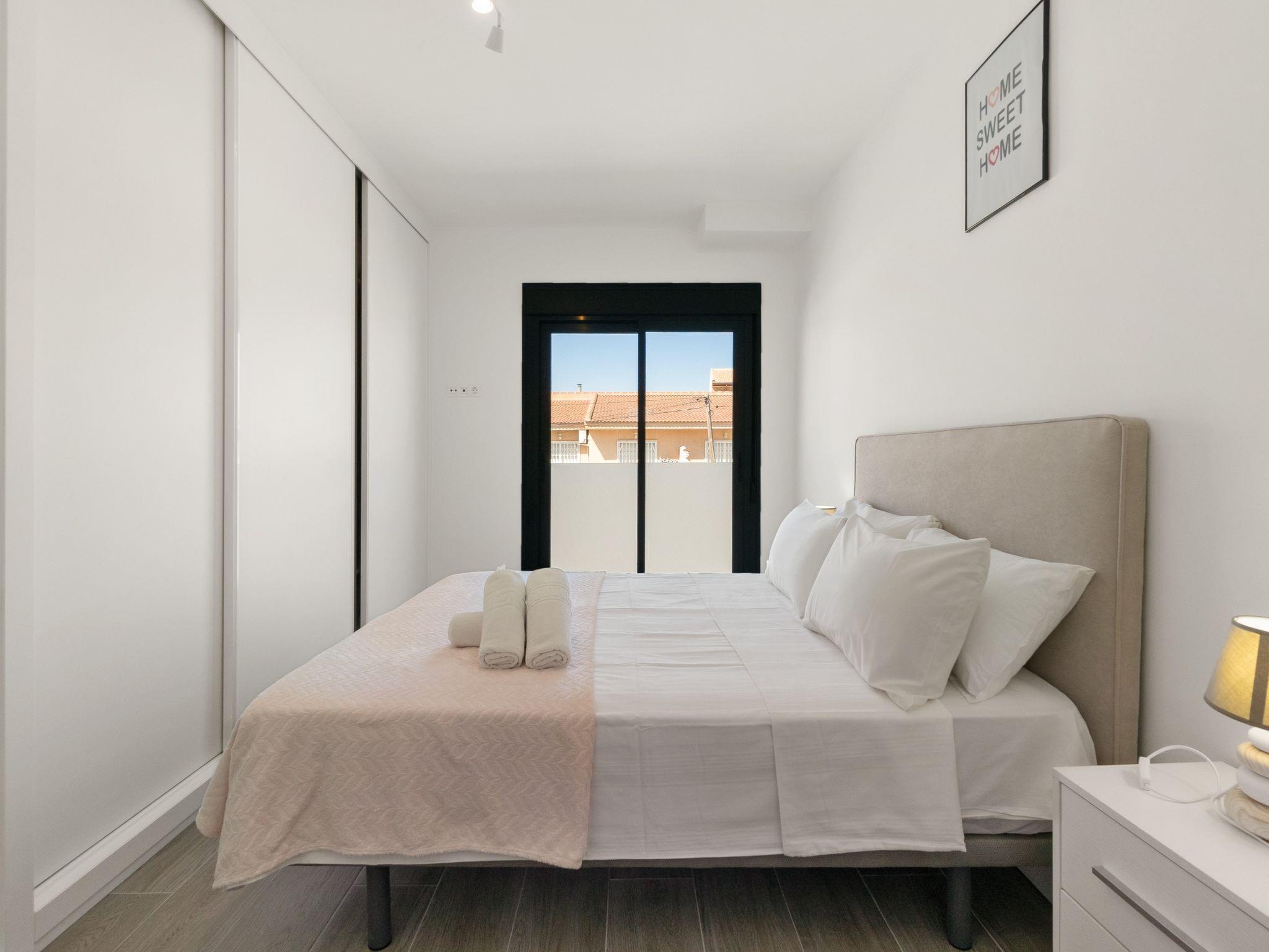 Modern, beautiful terraced house "Green Garden II", 3 storeys, built in 2024. In the resort 1 km from the centre of Pilar de la Horadada, 6 km from the centre of Dehesa de Campoamor, in a quiet, sunny position residential area (villas), 3 km from the sea, 300 km from the beach. Private: property (fenced), swimming pool (4 x 3 m, seasonal availability: 01.Jan. - 31.Dec.). In the house: sun terrace. Parking at the house. Grocery 1 km, supermarket 1 km, restaurant 1 km, bar 350 m, bakery 1 km, bus stop "Pilar de la Horadada Vta" 2 km, railway station "Orihuela" 34 km, sandy beach "Playa del Puerto" 3 km. Sports harbour 4 km, marina 4 km, golf course (18 hole) 4 km. The owner does not accept any youth groups.