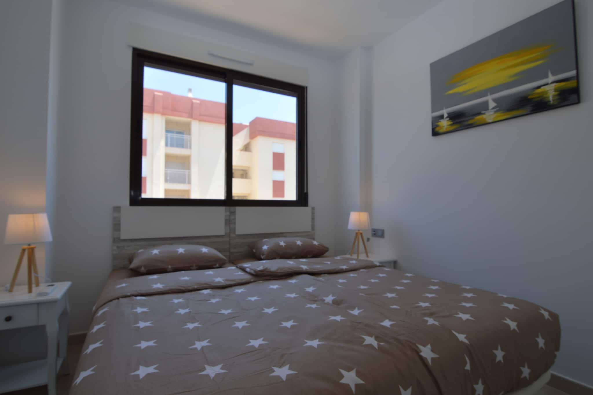 Nyd en afslappende middelhavsflugt i denne hyggelige 3-værelses lejlighed i Valencia, perfekt til familier eller små grupper på op til 6 gæster. Beliggende kun 3,9 km fra Playa Cabo Roig og 4,5 km fra Torreviejas centrum tilbyder dette hjem en fredelig base med nem adgang til kysten og lokale attraktioner. Lejligheden har en privat terrasse med havemøbler, ideel til morgenkaffe eller aftensnak. Indenfor finder du et komfortabelt opholdsrum med aircondition og et veludstyret køkken til at tilberede måltider. Efter en dag med udforskning kan du køle af i den fælles swimmingpool eller slappe af i dit hjem. Med restauranter kun 300 meter væk og supermarkeder inden for 2,8 km, er alt hvad du behøver tæt på. Alicante Lufthavn ligger 53 km derfra, og gæsterne har en udpeget parkeringsplads i garagen for ekstra bekvemmelighed. Uanset om du er her til stranddage, gåture i byen eller blot for at slappe af, tilbyder denne lejlighed et indbydende tilflugtssted på Costa Blanca.