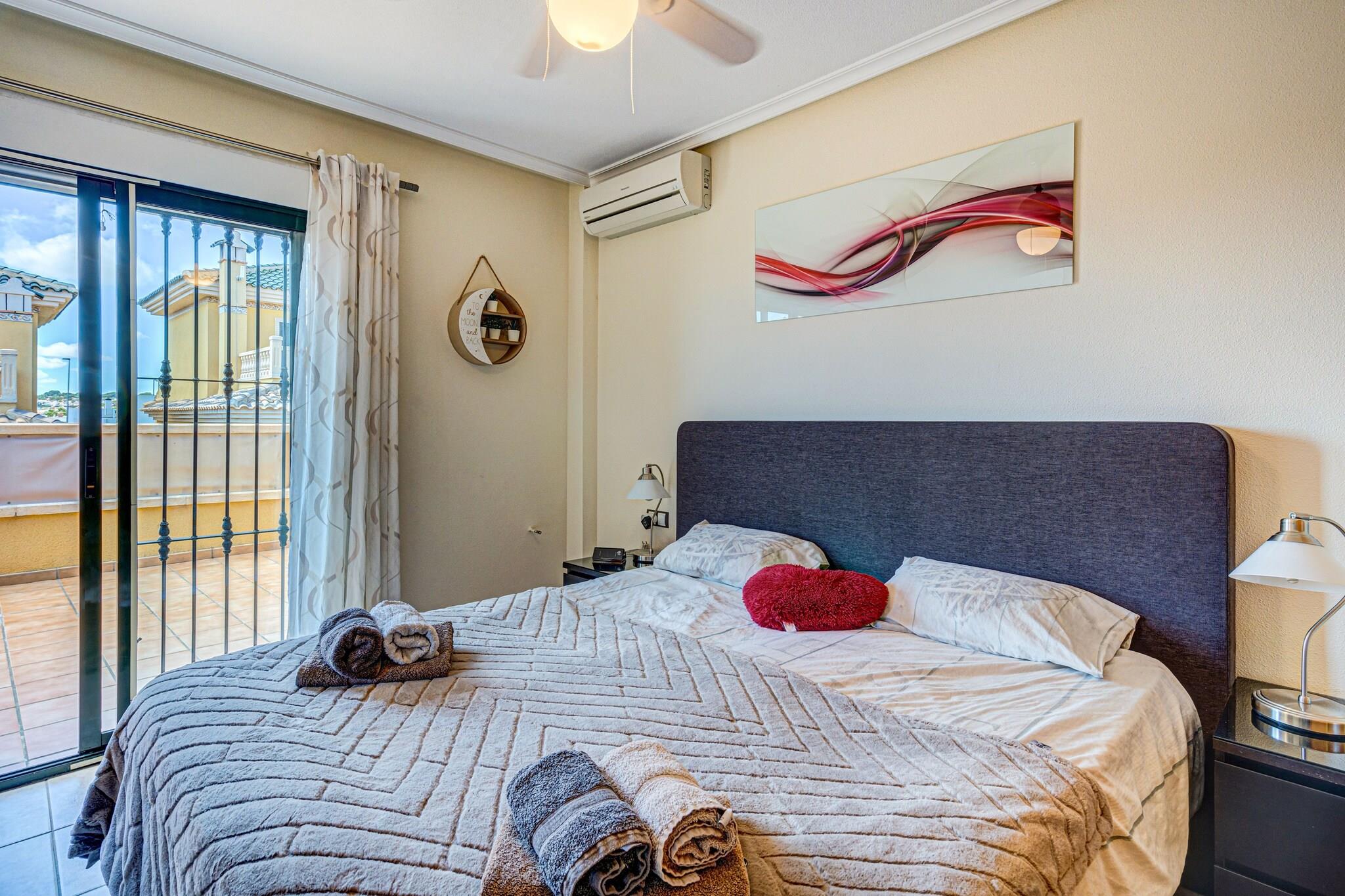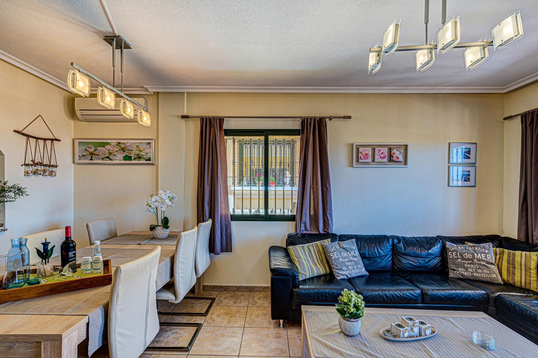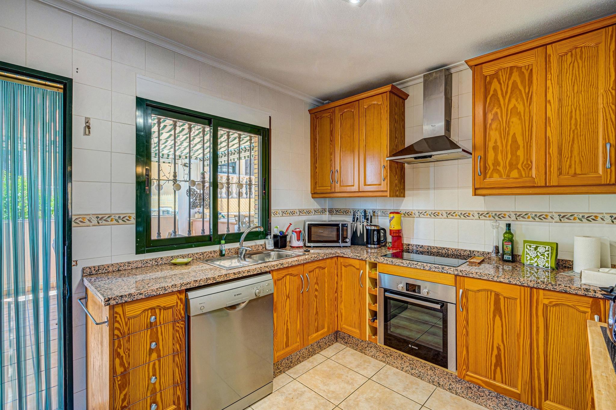 Dette charmerende feriehus i Orihuela Costa tilbyder den perfekte blanding af privatliv, komfort og kystsjov, ideel til familier eller venner. Ejendommen er omgivet af en frodig have og høje mure og sikrer et fredeligt og privat ophold kun få minutter fra stranden. Indenfor giver den rummelige stue og det veludstyrede køkken (med Dolce Gusto- og Senseo-maskiner) alle hjemmets bekvemmeligheder. Træd ud på den solplettede terrasse for at nyde måltider eller drinks i den friske luft. Garagen inkluderer fitnessudstyr og tre cykler, en elektrisk, så du kan udforske området i dit eget tempo. Du er kun i kort afstand fra sandkysten ved Punta Prima, Playa Flamenca, La Zenia og Cabo Roig, hvor levende musik tilføjer weekendens charme. Det berømte butikscenter La Zenia ligger kun 2 km væk, og tilbyder en pulserende blanding af butikker og spisesteder. Efter en tur langs kysten kan du slappe af på en af de mange hyggelige restauranter i nærheden. Gæsterne har også adgang til en fælles pool og petanque-område, hvilket tilføjer fritidsmulighederne. Uanset om du solbader, cykler eller bare slapper af i haven, er dette hjem en dejlig base for din flugt fra Costa Blanca.
