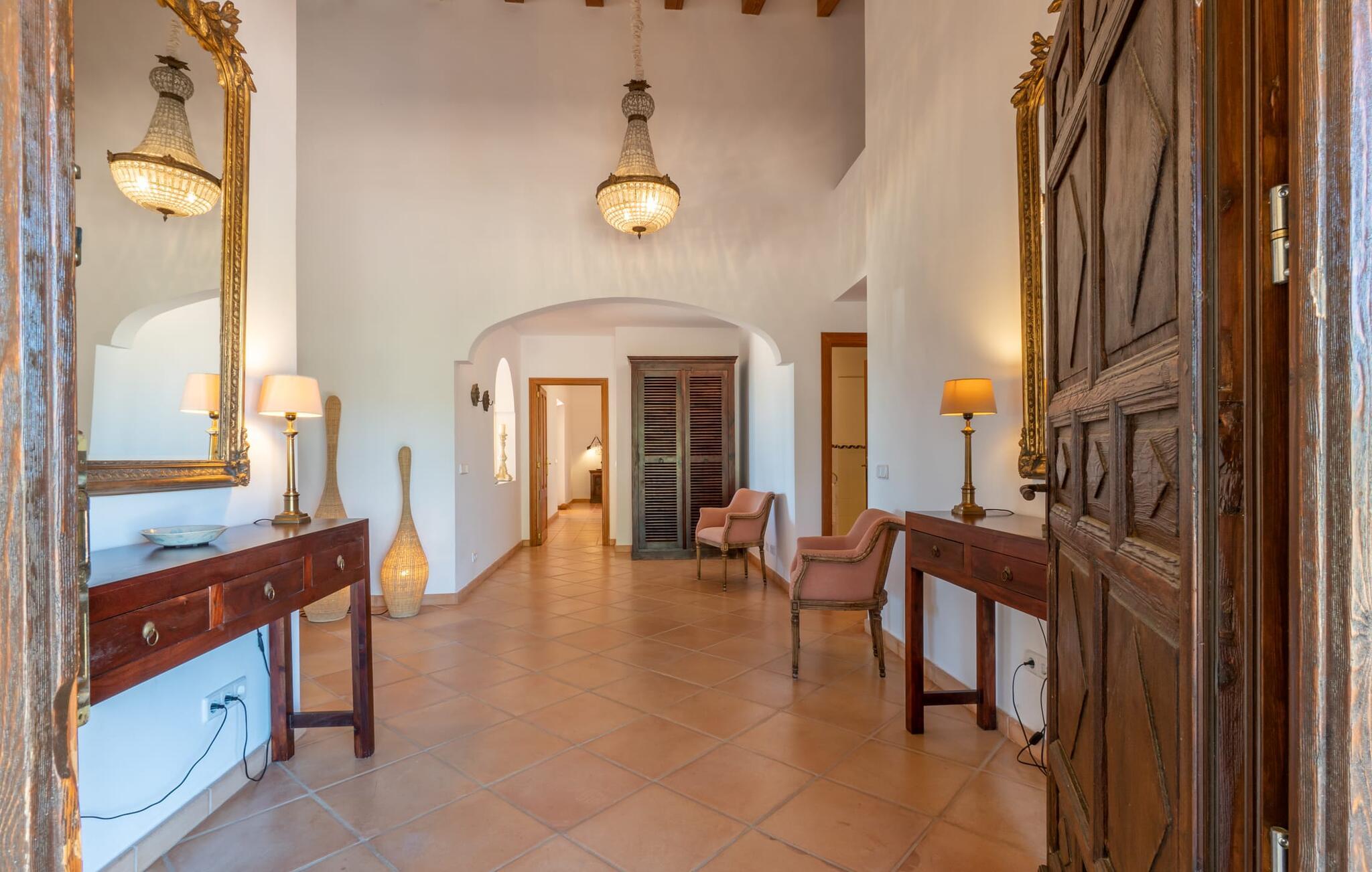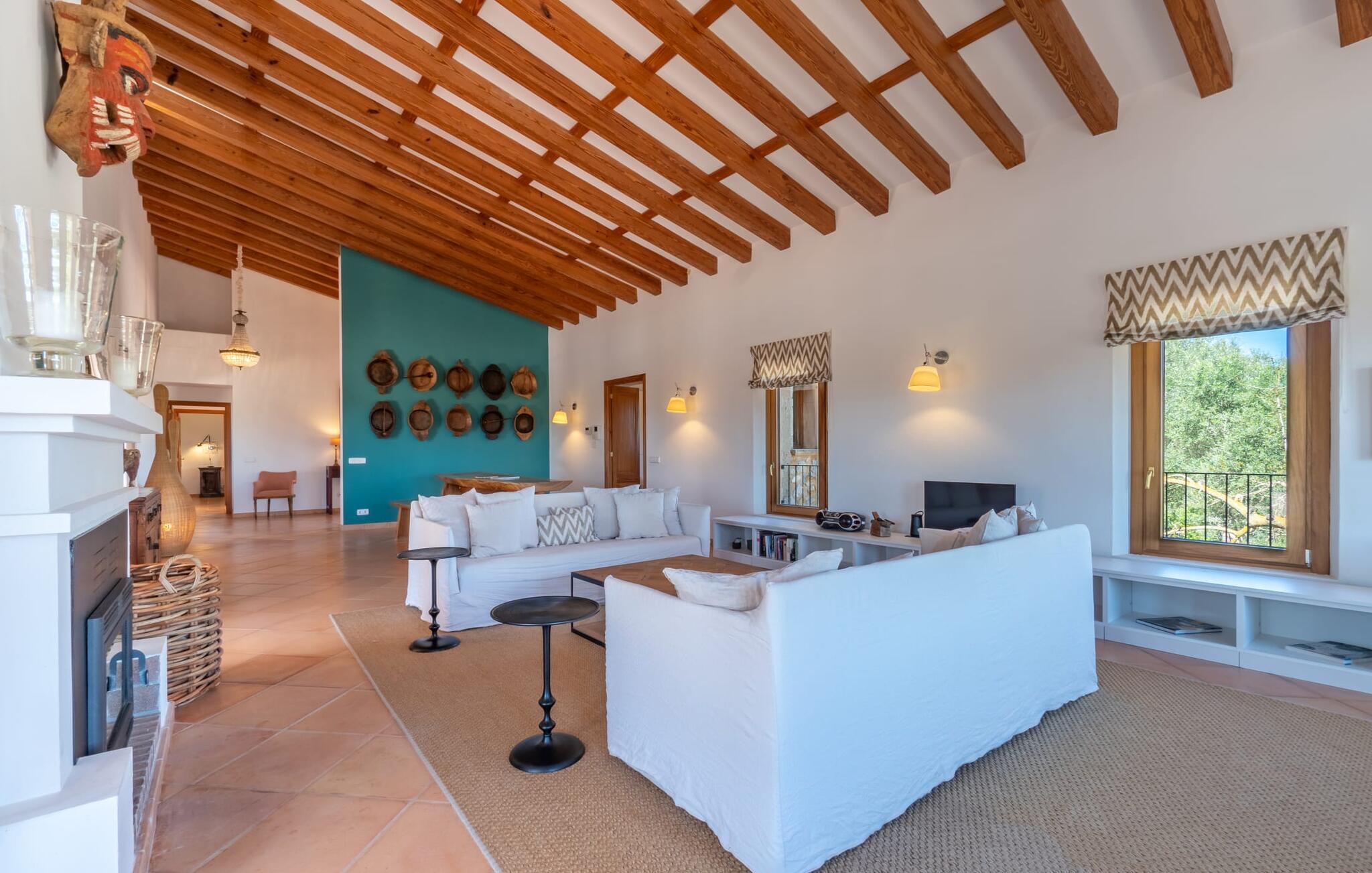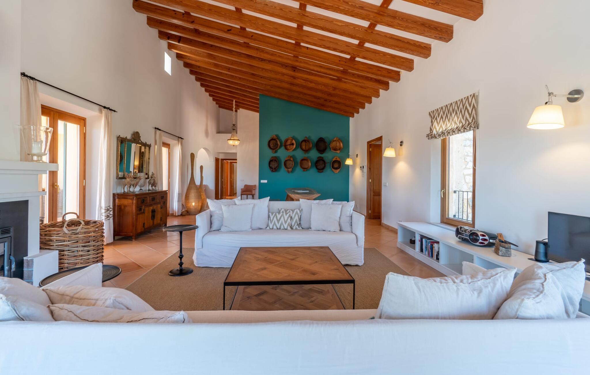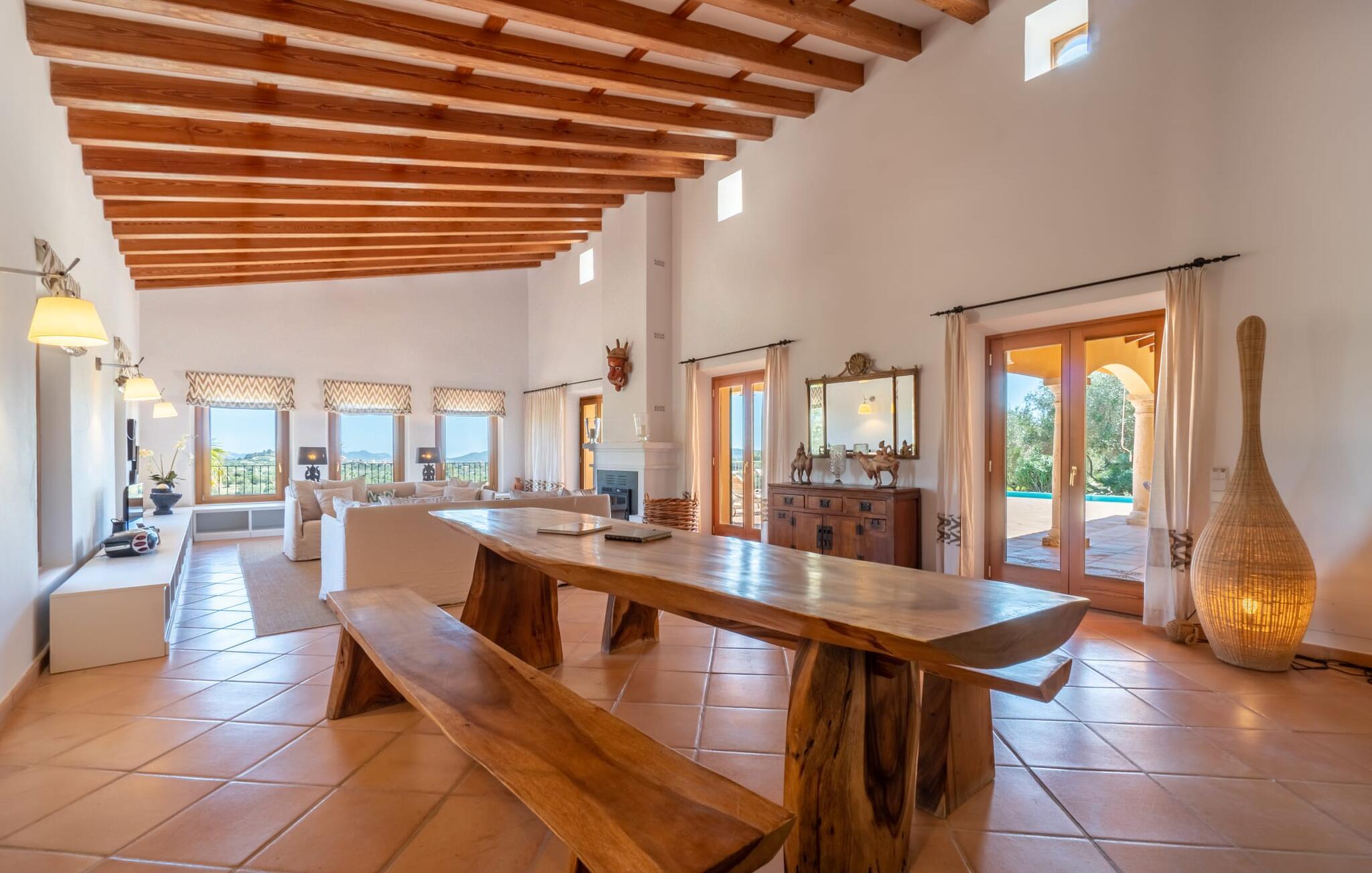 Midt i en stor ejendom med flere palme-, mandel- og oliventræer og en fantastisk udsigt over Artà byder villaen "Pablo" (lokalt: "Son Sureda") sine gæster velkommen. På klare dage kan I endda se et stykke af havet herfra. Træd nærmere og brug et øjeblik for at få et bedre kig på dette særlige feriehus. I dette tyndt befolkede område på landet finder I ægte fred og ro, så I helt kan slippe alle hverdagens bekymringer, som nogle gange kan være ret stressende. Det er den vildt romantiske charme ved stedets ekstraordinære æstetiske design, der umiddelbart fremstår indbydende for beskueren. Den rustikke have vil helt sikkert appellere til alle naturelskere, da det meste af den simpelthen er blevet efterladt i sin naturlige tilstand, hvilket giver den en behagelig, uberørt følelse. Den rummelige overdækkede terrasse løber næsten halvvejs rundt om huset og byder på udsigt over poolen og hele byen Artà. Et stort spisebord med dekorative polyrattan stole danner den perfekte ramme om lange, hyggelige måltider med hele gruppen; Og med et panorama som dette herude burde det være mindst dobbelt så sjovt. Den originale drivtømmerlampe over bordet er et rigtigt blikfang, og lyset den giver om aftenen er simpelthen fortryllende. Poolen er på den ene side af den flisebelagte terrasse. Dybden varierer mellem 1,15 og 1,95 m og har en række brede trin, der fører behageligt ud i vandet. Her er flere utroligt smukke steder at slappe af, enten i solen eller under taget, hvor man bare ikke kan lave noget i timevis. Der er nok liggestole til rådighed for jer. Og husk at starte grillen i tide til aftengrillen. Husets indretning er usædvanligt stilfuldt og samtidig fuld af rustik charme. Hvide vægge, smukke terracotta flisegulve og dekorative loftsbjælker skaber en atmosfære af elegance, der er godt komplementeret af attraktive stoffer og unikke, omhyggeligt udvalgte dekorative genstande. Den overordnede behageligt rummelige bygning er opdelt i hovedhuset og en separat lejlighed. Dette er ideelt, hvis I rejser med bedsteforældre eller venner og ikke vil gå glip af jeres eget private tilbagetog. Den store stue er oversvømmet med naturligt lys og har en pejs og nogle super komfortable sofaer, hvor I virkelig kan strække jer ud og slappe af. Og hvis I leder efter noget underholdning, er der højhastigheds-WiFi, et fladskærms-satellit-tv og et cd-stereo. Det elegante spisebord i massivt træ står i smuk kontrast til den farverige, farverigt dekorerede skillevæg bagved og er det perfekte sted til gode fælles måltider, hvis I vælger at spise indendørs. Det moderne køkken er fuldt udstyret og er direkte tilgængeligt fra stue/spisestue. Med en kedel og en fuldautomatisk kaffemaskine kan I tilberede en aromatisk varm drik om morgenen og nyde den udendørs, mens I byder den nye dag velkommen. Fire hyggelige soveværelser med aircondition indbyder til rolige nætter. De luksuriøse badeværelser er designet i en moderne stil og har indretning af høj kvalitet. På øverste etage, hvor I skal bo i en gruppe på højst seks personer, er der et soveværelse med eget badeværelse og yderligere to soveværelser med separate badeværelser. Nedenunder er der et yderligere soveværelse og en-suite badeværelse i en lejlighed med separat indgang, som kan åbnes, hvis I booker boligen til en gruppe på otte personer. De nærmeste strande til denne villa er Cala Ratjada, Canyamel, Cala Bona, Costa dels Pins og Cala Millor Bay. Med omkring 6.500 indbyggere er Artà en smuk lille by uden store hoteller. Der er flere fremragende mallorcanske restauranter samt gode shoppingmuligheder. Hver tirsdag er byen vært for sit ugentlige marked, som også omfatter et håndværksmarked, der bestemt er et besøg værd. I kan også besøge Son Servera, hvor dets ugentlige marked finder sted hver fredag. Den fritliggende villa "Pablo" (kaldet "Son Sureda" ved ankomsten) ligger på en næsten 18.000 m² stor grund, indlejret i det smukke bakkede landskab nordvest for Artà. Den fine sandbugt Cala Torta ligger 14 km derfra. Stien dertil fører gennem et smukt naturreservat, der forbliver fuldstændig uberørt af menneskelig udvikling. For at handle dagligvarer og andre daglige fornødenheder er det kun 8 minutters kørsel væk.