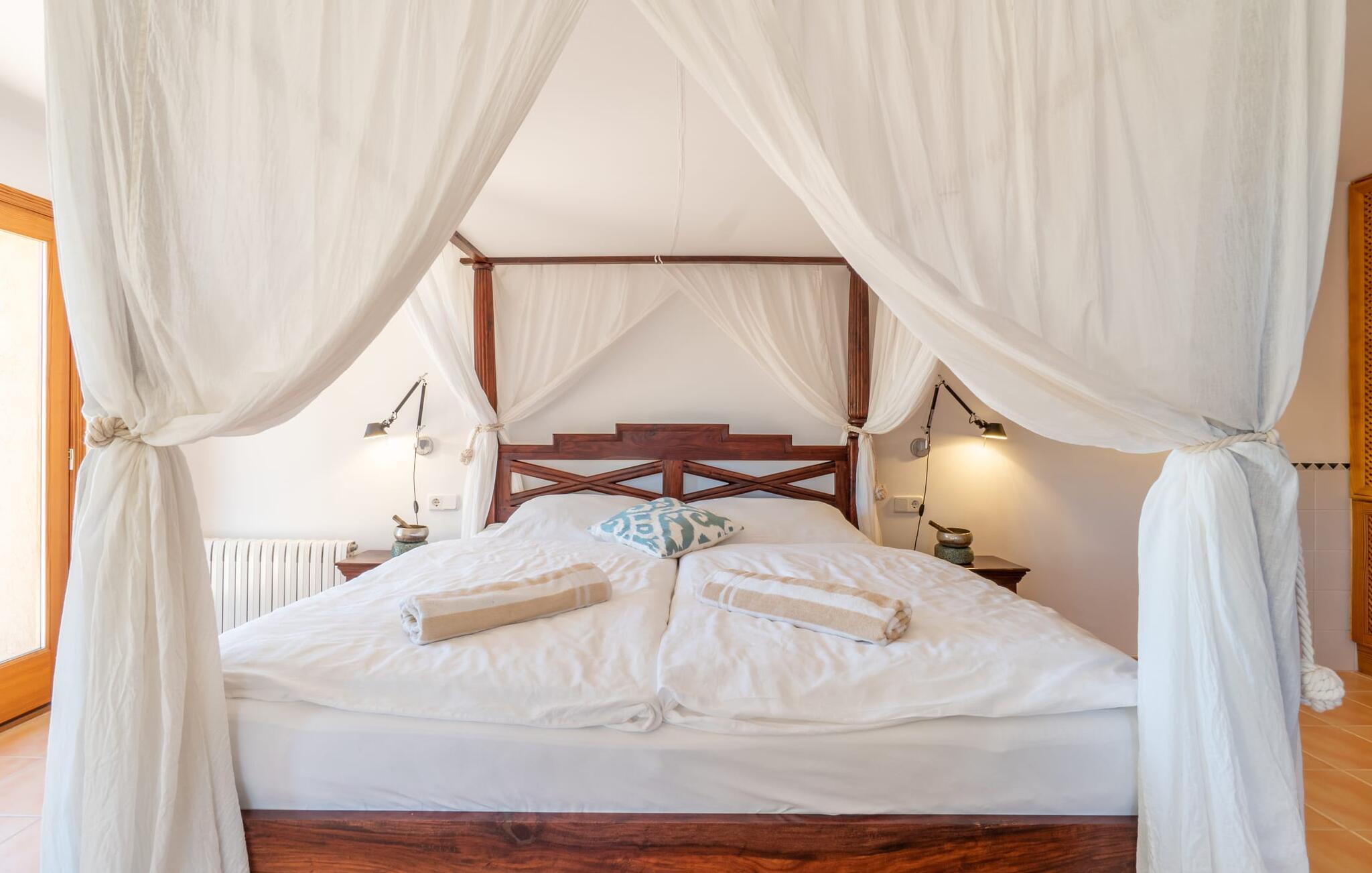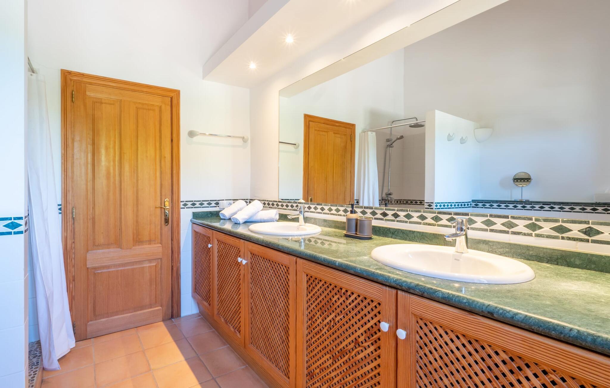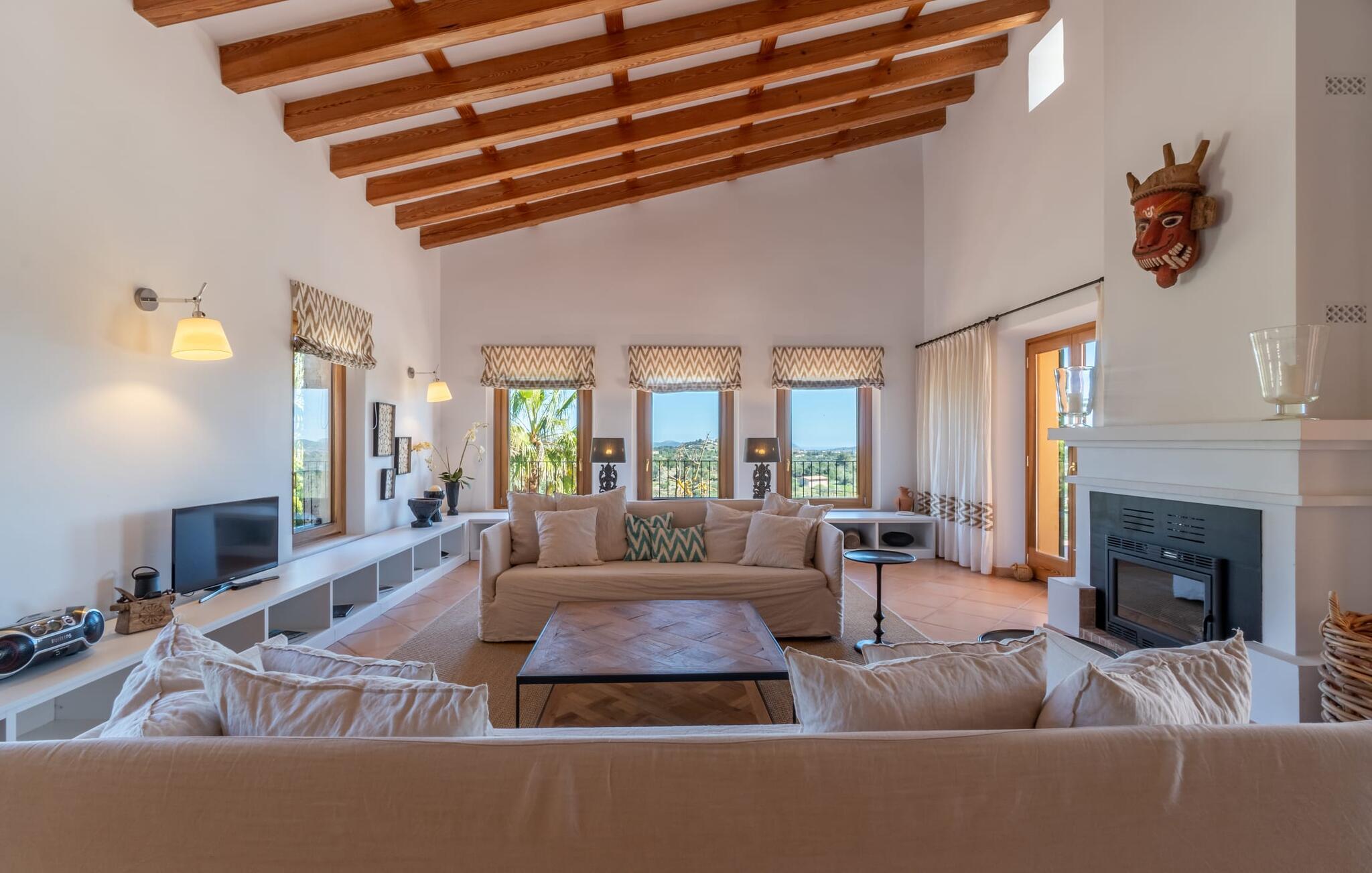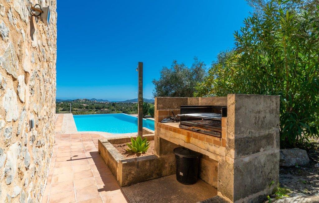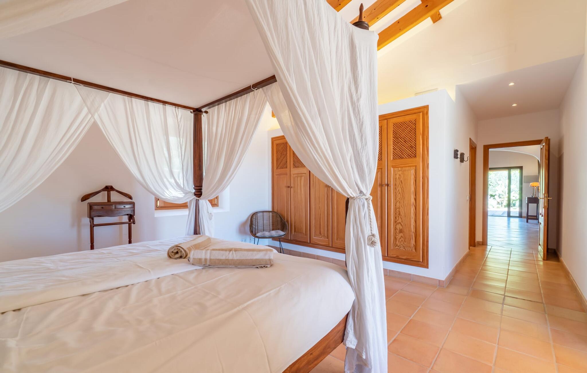 Midt i en stor ejendom med flere palme-, mandel- og oliventræer og en fantastisk udsigt over Artà byder villaen "Pablo" (lokalt: "Son Sureda") sine gæster velkommen. På klare dage kan I endda se et stykke af havet herfra. Træd nærmere og brug et øjeblik for at få et bedre kig på dette særlige feriehus. I dette tyndt befolkede område på landet finder I ægte fred og ro, så I helt kan slippe alle hverdagens bekymringer, som nogle gange kan være ret stressende. Det er den vildt romantiske charme ved stedets ekstraordinære æstetiske design, der umiddelbart fremstår indbydende for beskueren. Den rustikke have vil helt sikkert appellere til alle naturelskere, da det meste af den simpelthen er blevet efterladt i sin naturlige tilstand, hvilket giver den en behagelig, uberørt følelse. Den rummelige overdækkede terrasse løber næsten halvvejs rundt om huset og byder på udsigt over poolen og hele byen Artà. Et stort spisebord med dekorative polyrattan stole danner den perfekte ramme om lange, hyggelige måltider med hele gruppen; Og med et panorama som dette herude burde det være mindst dobbelt så sjovt. Den originale drivtømmerlampe over bordet er et rigtigt blikfang, og lyset den giver om aftenen er simpelthen fortryllende. Poolen er på den ene side af den flisebelagte terrasse. Dybden varierer mellem 1,15 og 1,95 m og har en række brede trin, der fører behageligt ud i vandet. Her er flere utroligt smukke steder at slappe af, enten i solen eller under taget, hvor man bare ikke kan lave noget i timevis. Der er nok liggestole til rådighed for jer. Og husk at starte grillen i tide til aftengrillen. Husets indretning er usædvanligt stilfuldt og samtidig fuld af rustik charme. Hvide vægge, smukke terracotta flisegulve og dekorative loftsbjælker skaber en atmosfære af elegance, der er godt komplementeret af attraktive stoffer og unikke, omhyggeligt udvalgte dekorative genstande. Den overordnede behageligt rummelige bygning er opdelt i hovedhuset og en separat lejlighed. Dette er ideelt, hvis I rejser med bedsteforældre eller venner og ikke vil gå glip af jeres eget private tilbagetog. Den store stue er oversvømmet med naturligt lys og har en pejs og nogle super komfortable sofaer, hvor I virkelig kan strække jer ud og slappe af. Og hvis I leder efter noget underholdning, er der højhastigheds-WiFi, et fladskærms-satellit-tv og et cd-stereo. Det elegante spisebord i massivt træ står i smuk kontrast til den farverige, farverigt dekorerede skillevæg bagved og er det perfekte sted til gode fælles måltider, hvis I vælger at spise indendørs. Det moderne køkken er fuldt udstyret og er direkte tilgængeligt fra stue/spisestue. Med en kedel og en fuldautomatisk kaffemaskine kan I tilberede en aromatisk varm drik om morgenen og nyde den udendørs, mens I byder den nye dag velkommen. Fire hyggelige soveværelser med aircondition indbyder til rolige nætter. De luksuriøse badeværelser er designet i en moderne stil og har indretning af høj kvalitet. På øverste etage, hvor I skal bo i en gruppe på højst seks personer, er der et soveværelse med eget badeværelse og yderligere to soveværelser med separate badeværelser. Nedenunder er der et yderligere soveværelse og en-suite badeværelse i en lejlighed med separat indgang, som kan åbnes, hvis I booker boligen til en gruppe på otte personer. De nærmeste strande til denne villa er Cala Ratjada, Canyamel, Cala Bona, Costa dels Pins og Cala Millor Bay. Med omkring 6.500 indbyggere er Artà en smuk lille by uden store hoteller. Der er flere fremragende mallorcanske restauranter samt gode shoppingmuligheder. Hver tirsdag er byen vært for sit ugentlige marked, som også omfatter et håndværksmarked, der bestemt er et besøg værd. I kan også besøge Son Servera, hvor dets ugentlige marked finder sted hver fredag. Den fritliggende villa "Pablo" (kaldet "Son Sureda" ved ankomsten) ligger på en næsten 18.000 m² stor grund, indlejret i det smukke bakkede landskab nordvest for Artà. Den fine sandbugt Cala Torta ligger 14 km derfra. Stien dertil fører gennem et smukt naturreservat, der forbliver fuldstændig uberørt af menneskelig udvikling. For at handle dagligvarer og andre daglige fornødenheder er det kun 8 minutters kørsel væk.