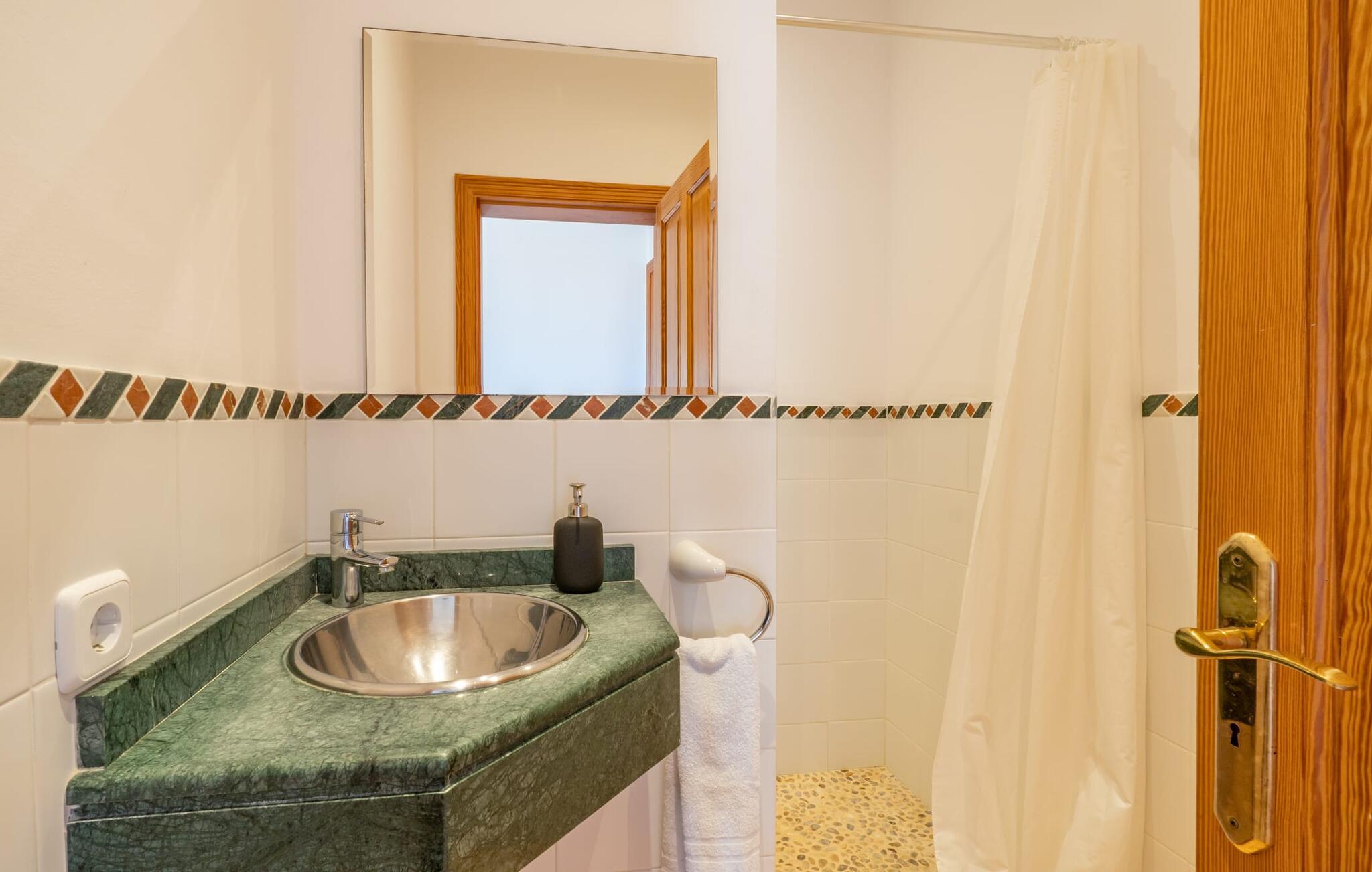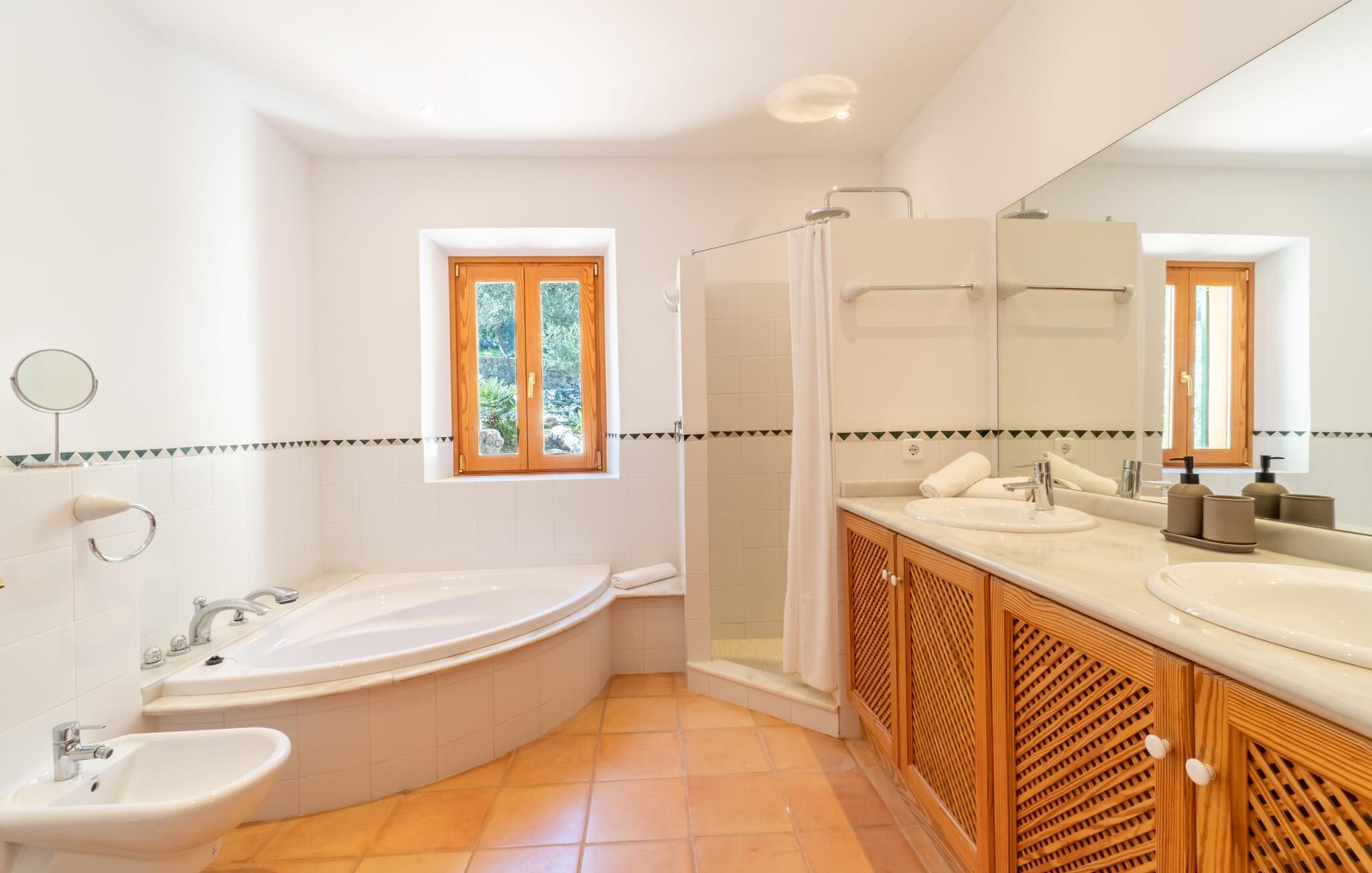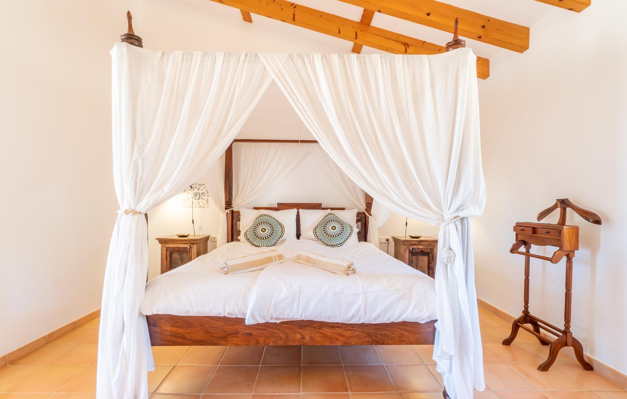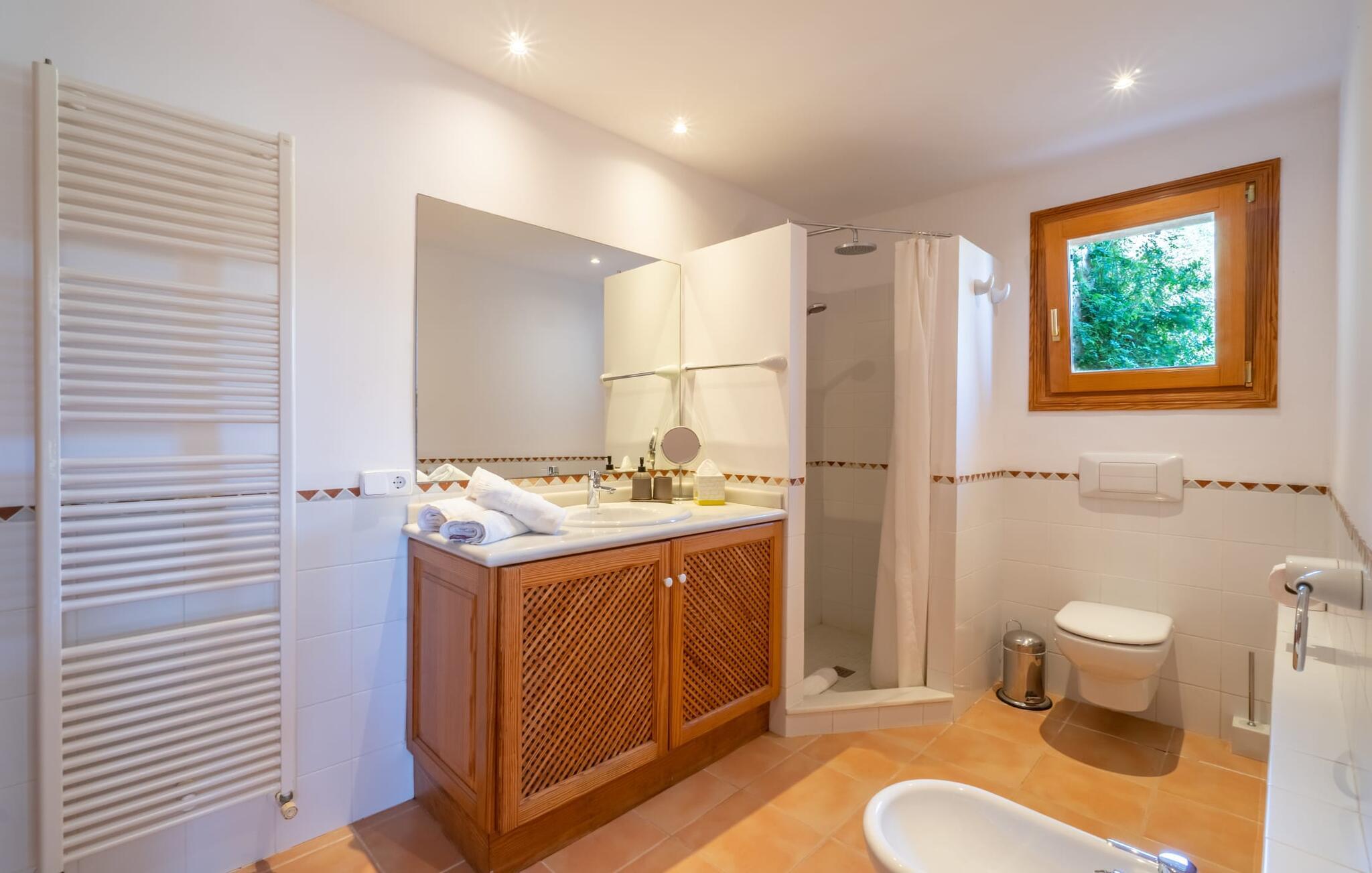 Midt i en stor ejendom med flere palme-, mandel- og oliventræer og en fantastisk udsigt over Artà byder villaen "Pablo" (lokalt: "Son Sureda") sine gæster velkommen. På klare dage kan I endda se et stykke af havet herfra. Træd nærmere og brug et øjeblik for at få et bedre kig på dette særlige feriehus. I dette tyndt befolkede område på landet finder I ægte fred og ro, så I helt kan slippe alle hverdagens bekymringer, som nogle gange kan være ret stressende. Det er den vildt romantiske charme ved stedets ekstraordinære æstetiske design, der umiddelbart fremstår indbydende for beskueren. Den rustikke have vil helt sikkert appellere til alle naturelskere, da det meste af den simpelthen er blevet efterladt i sin naturlige tilstand, hvilket giver den en behagelig, uberørt følelse. Den rummelige overdækkede terrasse løber næsten halvvejs rundt om huset og byder på udsigt over poolen og hele byen Artà. Et stort spisebord med dekorative polyrattan stole danner den perfekte ramme om lange, hyggelige måltider med hele gruppen; Og med et panorama som dette herude burde det være mindst dobbelt så sjovt. Den originale drivtømmerlampe over bordet er et rigtigt blikfang, og lyset den giver om aftenen er simpelthen fortryllende. Poolen er på den ene side af den flisebelagte terrasse. Dybden varierer mellem 1,15 og 1,95 m og har en række brede trin, der fører behageligt ud i vandet. Her er flere utroligt smukke steder at slappe af, enten i solen eller under taget, hvor man bare ikke kan lave noget i timevis. Der er nok liggestole til rådighed for jer. Og husk at starte grillen i tide til aftengrillen. Husets indretning er usædvanligt stilfuldt og samtidig fuld af rustik charme. Hvide vægge, smukke terracotta flisegulve og dekorative loftsbjælker skaber en atmosfære af elegance, der er godt komplementeret af attraktive stoffer og unikke, omhyggeligt udvalgte dekorative genstande. Den overordnede behageligt rummelige bygning er opdelt i hovedhuset og en separat lejlighed. Dette er ideelt, hvis I rejser med bedsteforældre eller venner og ikke vil gå glip af jeres eget private tilbagetog. Den store stue er oversvømmet med naturligt lys og har en pejs og nogle super komfortable sofaer, hvor I virkelig kan strække jer ud og slappe af. Og hvis I leder efter noget underholdning, er der højhastigheds-WiFi, et fladskærms-satellit-tv og et cd-stereo. Det elegante spisebord i massivt træ står i smuk kontrast til den farverige, farverigt dekorerede skillevæg bagved og er det perfekte sted til gode fælles måltider, hvis I vælger at spise indendørs. Det moderne køkken er fuldt udstyret og er direkte tilgængeligt fra stue/spisestue. Med en kedel og en fuldautomatisk kaffemaskine kan I tilberede en aromatisk varm drik om morgenen og nyde den udendørs, mens I byder den nye dag velkommen. Fire hyggelige soveværelser med aircondition indbyder til rolige nætter. De luksuriøse badeværelser er designet i en moderne stil og har indretning af høj kvalitet. På øverste etage, hvor I skal bo i en gruppe på højst seks personer, er der et soveværelse med eget badeværelse og yderligere to soveværelser med separate badeværelser. Nedenunder er der et yderligere soveværelse og en-suite badeværelse i en lejlighed med separat indgang, som kan åbnes, hvis I booker boligen til en gruppe på otte personer. De nærmeste strande til denne villa er Cala Ratjada, Canyamel, Cala Bona, Costa dels Pins og Cala Millor Bay. Med omkring 6.500 indbyggere er Artà en smuk lille by uden store hoteller. Der er flere fremragende mallorcanske restauranter samt gode shoppingmuligheder. Hver tirsdag er byen vært for sit ugentlige marked, som også omfatter et håndværksmarked, der bestemt er et besøg værd. I kan også besøge Son Servera, hvor dets ugentlige marked finder sted hver fredag. Den fritliggende villa "Pablo" (kaldet "Son Sureda" ved ankomsten) ligger på en næsten 18.000 m² stor grund, indlejret i det smukke bakkede landskab nordvest for Artà. Den fine sandbugt Cala Torta ligger 14 km derfra. Stien dertil fører gennem et smukt naturreservat, der forbliver fuldstændig uberørt af menneskelig udvikling. For at handle dagligvarer og andre daglige fornødenheder er det kun 8 minutters kørsel væk.