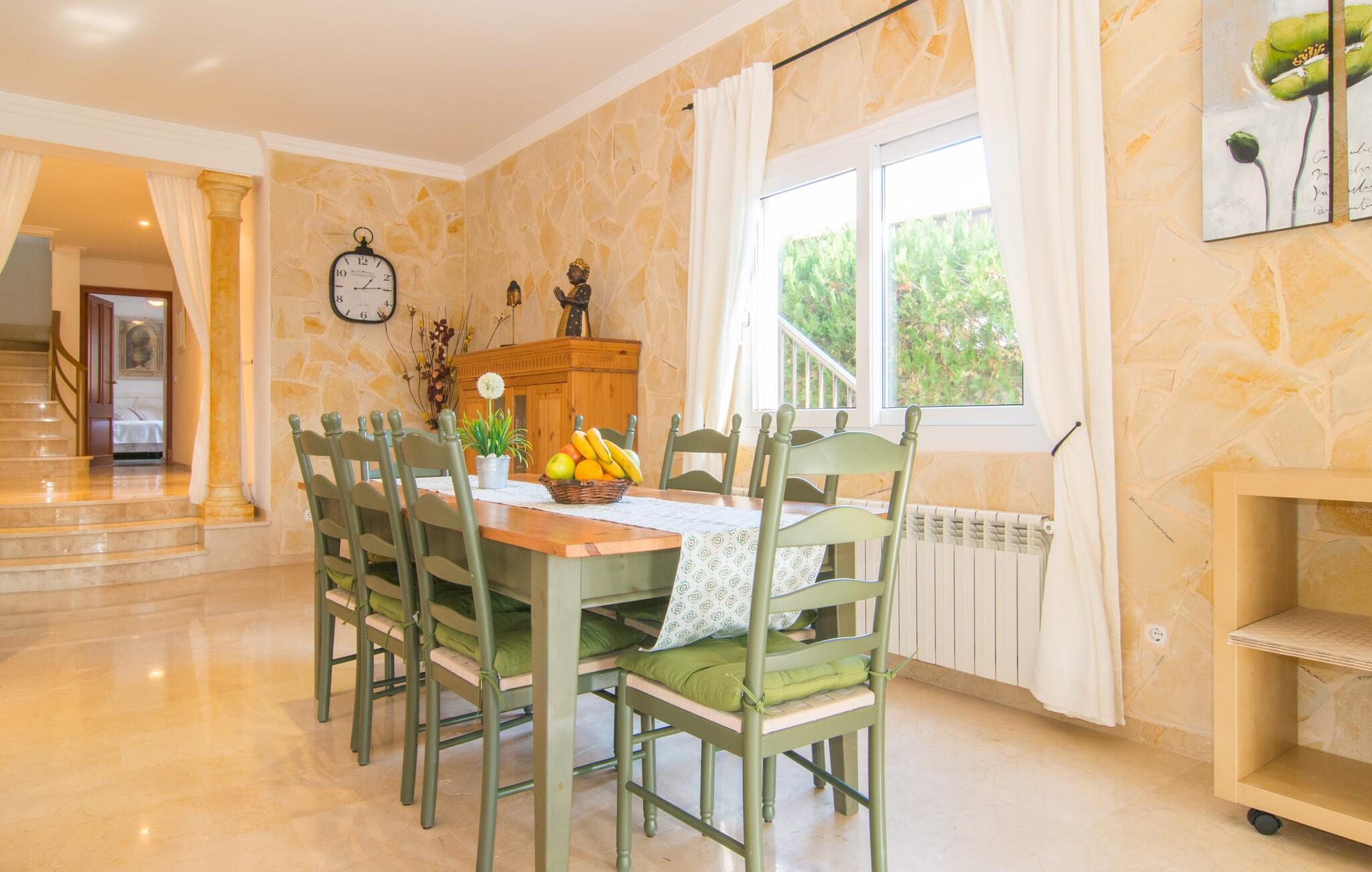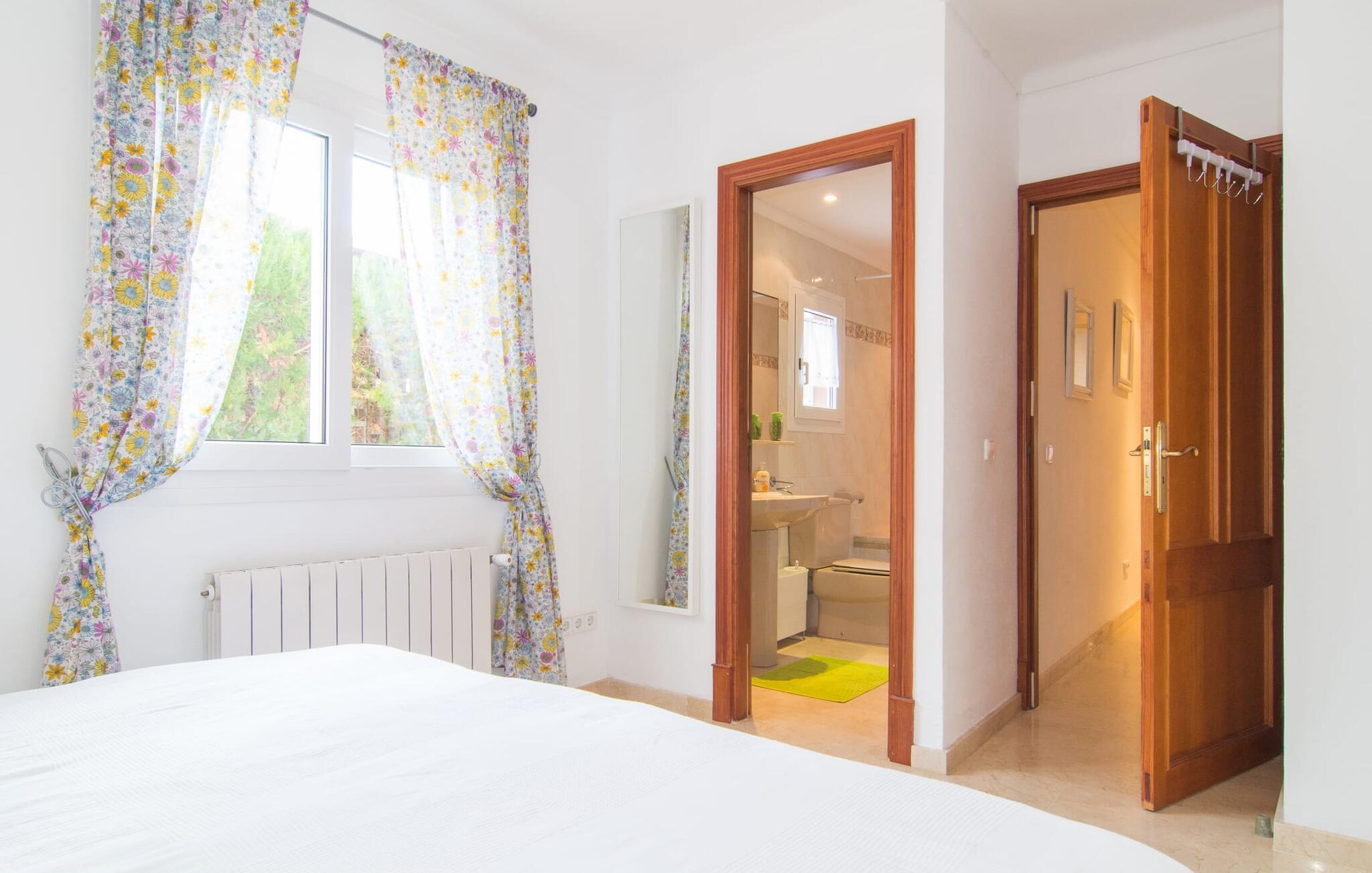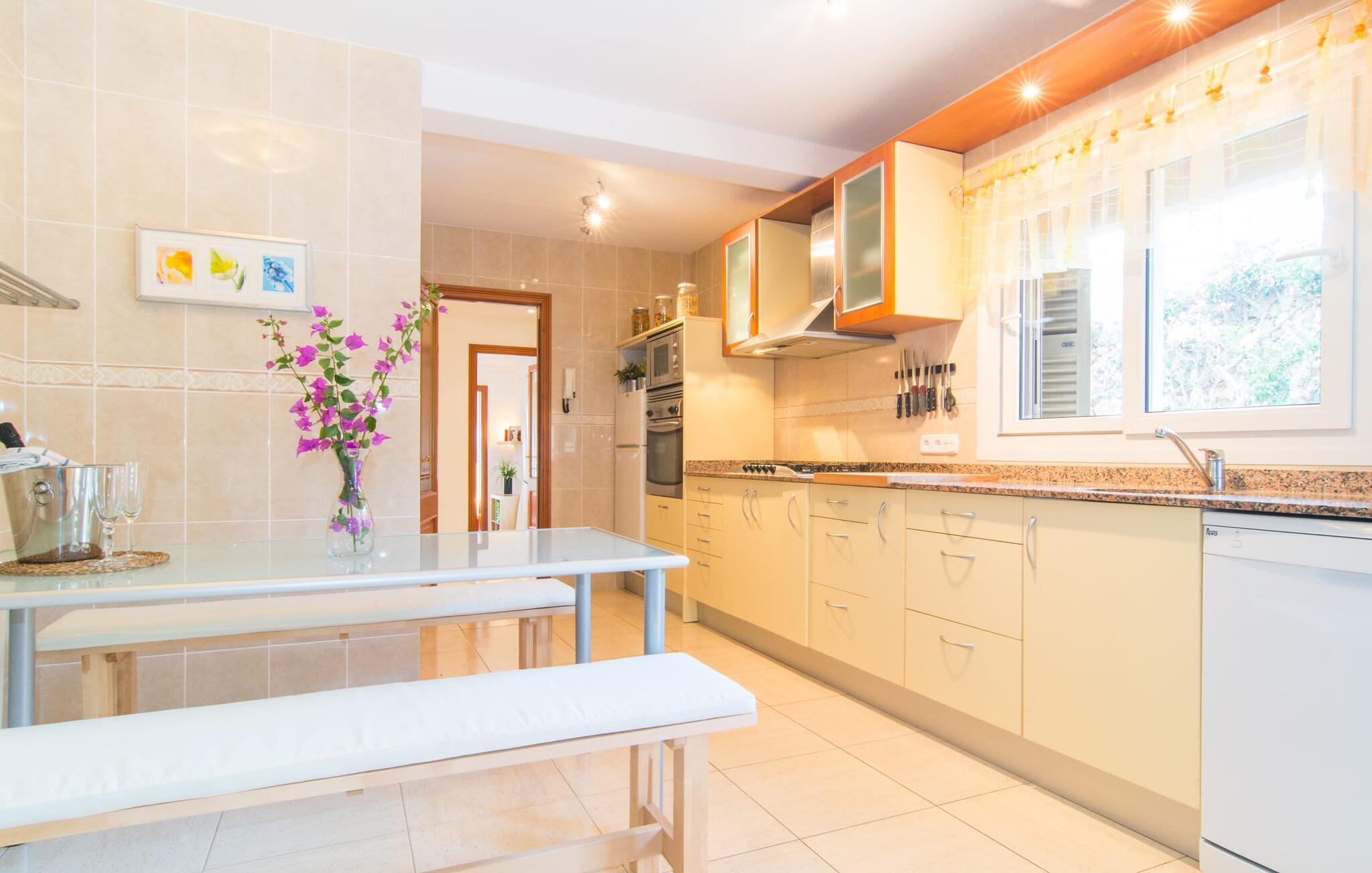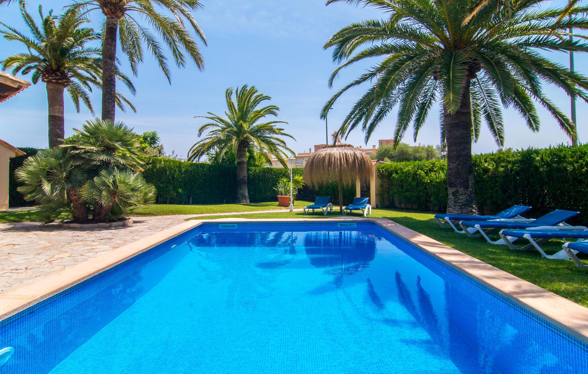 Det er ikke svært at se, hvordan denne villa har fået sit navn: mægtige palmer dominerer denne klart afgrænsede ejendom, dækket af farverig bougainvillea, der giver skygge og privatliv fra nysgerrige øjne. I er måske ikke helt alene i dette boligområde - og gaden er inden for hørevidde - men I kan stadig føle jer ret tryg i jeres eget rum bag den buede port, der stikker ud som en oase af grøn mod stenfacaden på hotellet ved siden af. dør. Sidder I på den overdækkede terrasse eller i haven med et glas rom og kokos, mangler der kun havet for at fuldende den caribiske atmosfære - men måske vil jeres fantasi forvandle den lille pool til et dybblåt hav. Plænen byder på masser af plads til at stille jeres liggestol op på et sted, der passer jer - uanset om I foretrækker, at solen skinner på jeres ansigt eller palmebladene til at blæse jer med kølig luft. I skal heller ikke bekymre jer om røg: Grillen er indbygget i en praktisk station på siden af huset. I kan endda begynde at bide i jeres bøf eller majskolber med det samme, når jeres mund allerede løber i vand for at gøre en stor indsats for at dække bordet. Når I træder ind i huset, er det farverigt, oversvømmet med lys og en smule græsk - nej, I er ikke i det forkerte land, villaen "Palmas" ligger bestemt på Mallorca. I stueetagen giver jordbærrøde cantilever-stole ved pejsen og komfortable lædersofaer rundt om fjernsynet et stærkt farvespring mod hvide voilegardiner. Søjler fungerer som subtile rumdelere, og en stenmosaikvæg danner baggrunden for den indbydende spiseplads. Denne blanding af stilarter emmer af middelhavsild og sikrer samtidig et moderne look. Køkkenet er også fremragende udstyret og moderne: det perfekte sted til jeres morgenkaffe eller til en snak med kokken, mens han/hun rører i gryderne. En indvendig trappe (eller den udvendige trappe for natugler) fører til de tre soveværelser på første sal, nogle med udgang til balkonterrassen. Der er et fjerde soveværelse i stueetagen. I vil blive glad for at vide, at alle soveværelser har deres eget badeværelse. Et ekstra gæstetoilet sikrer størst mulig privatliv. To af soveværelserne har også en ekstra seng, velegnet til børn. Og nu hvor I har set Villa Palmas, når det er bedst, er I klar til at udforske den mørkere side af øen. Regionen omkring Cales de Mallorca er rig på huler, de fleste på øen, og byder på adskillige muligheder for at gå i smuglernes og piraters fodspor; Cova des Pirata, Cova des Pont og de oplyste grotter i Coves dels Hams vil lade jeres børns fantasi løbe løbsk. Østkystens berømte klippebugter og badebugter venter også på at blive erobret; Vær forberedt – adgang er ikke altid let! Og hvis alt dette er for meget for jer, inviterer den charmerende lille havneby Portocolom med sine smalle gader, caféer, fiskerestauranter og en bred allé af plataner jer til at slappe af og slappe af. Selv et langsommere tempo kan være et eventyr! Når I når Manacor, er I næsten der. Sigt efter et punkt halvvejs mellem kystbyerne Portocolom og Porto Cristo, tag mod den lille ferieby Calas (eller Cales) de Mallorca og se efter nogle høje palmer. Så I kan ikke gå glip af “Palmas”-villaen, som ligger på en stille gade nær et hotel. Små sandbugter ligger langs kysten som en perlerække, mens der inde i landet mod Felanitx er en forsmag på det mere stille og mere traditionelle øst for Mallorca.