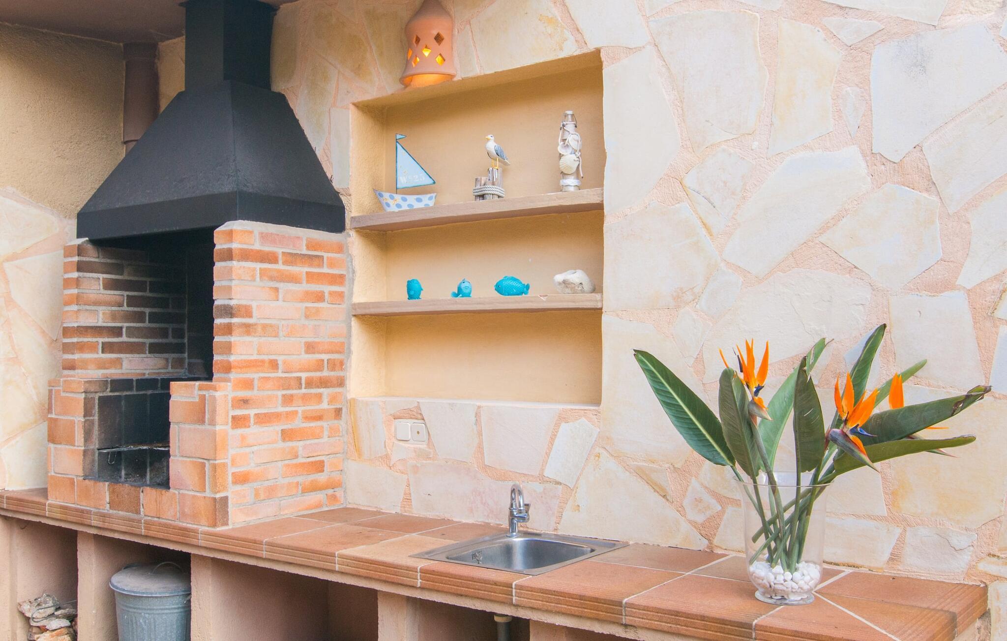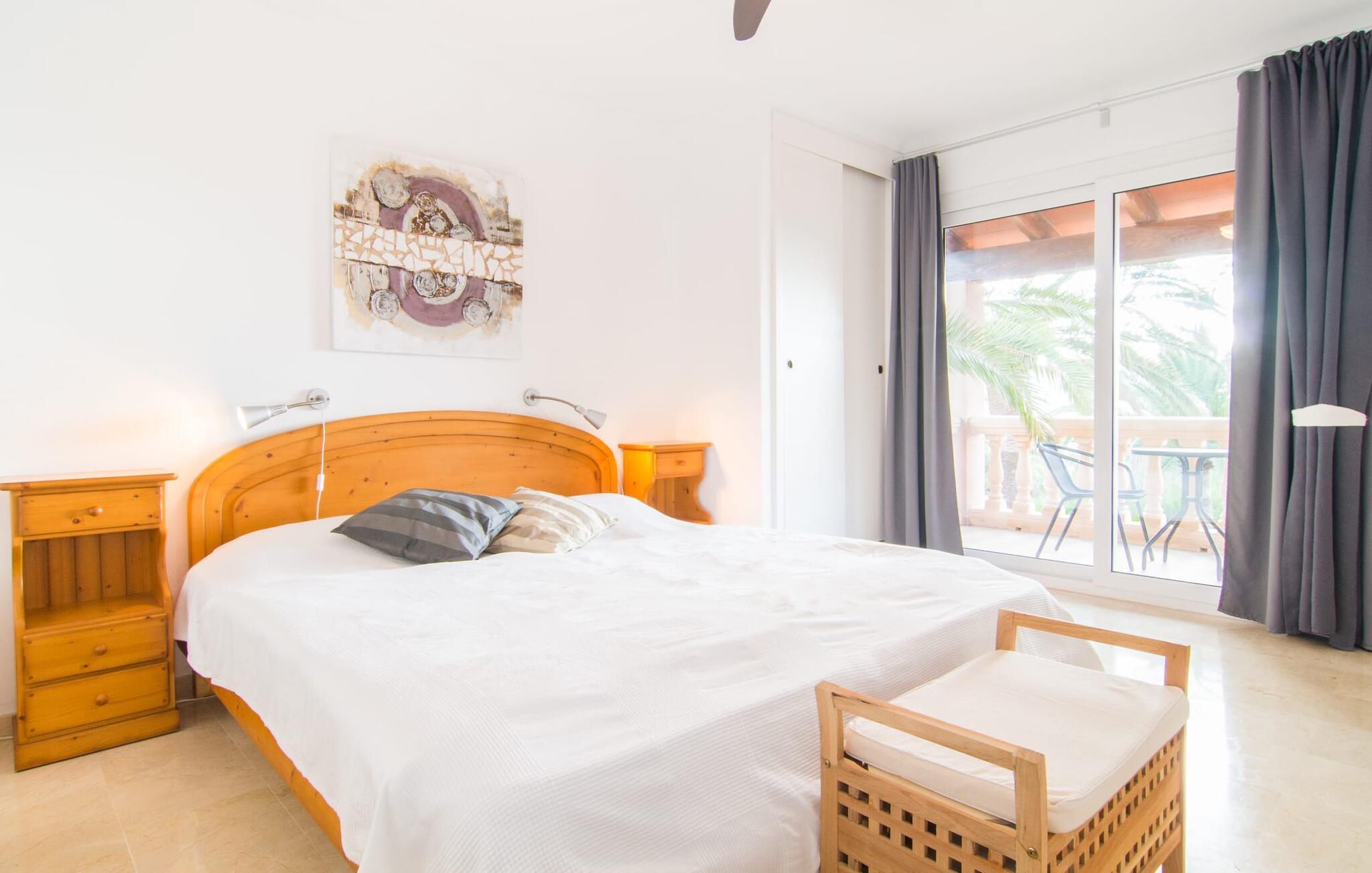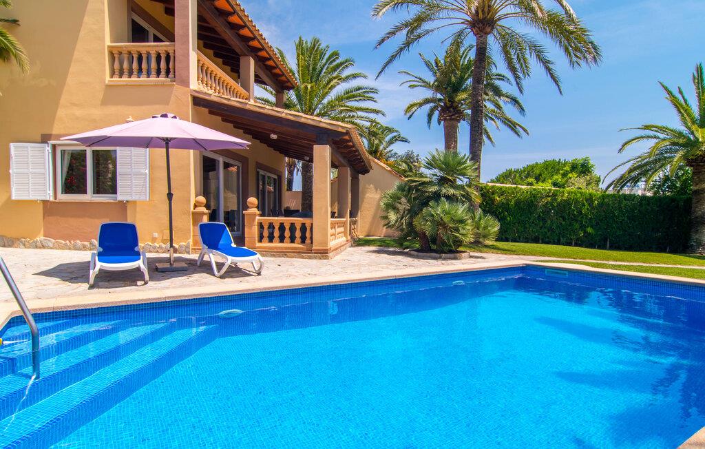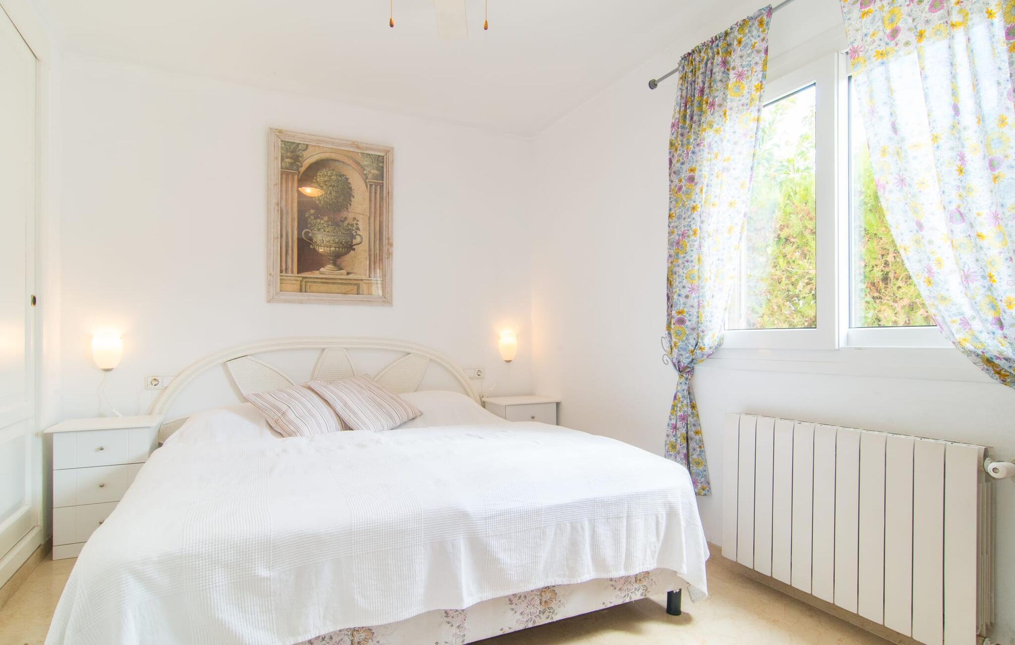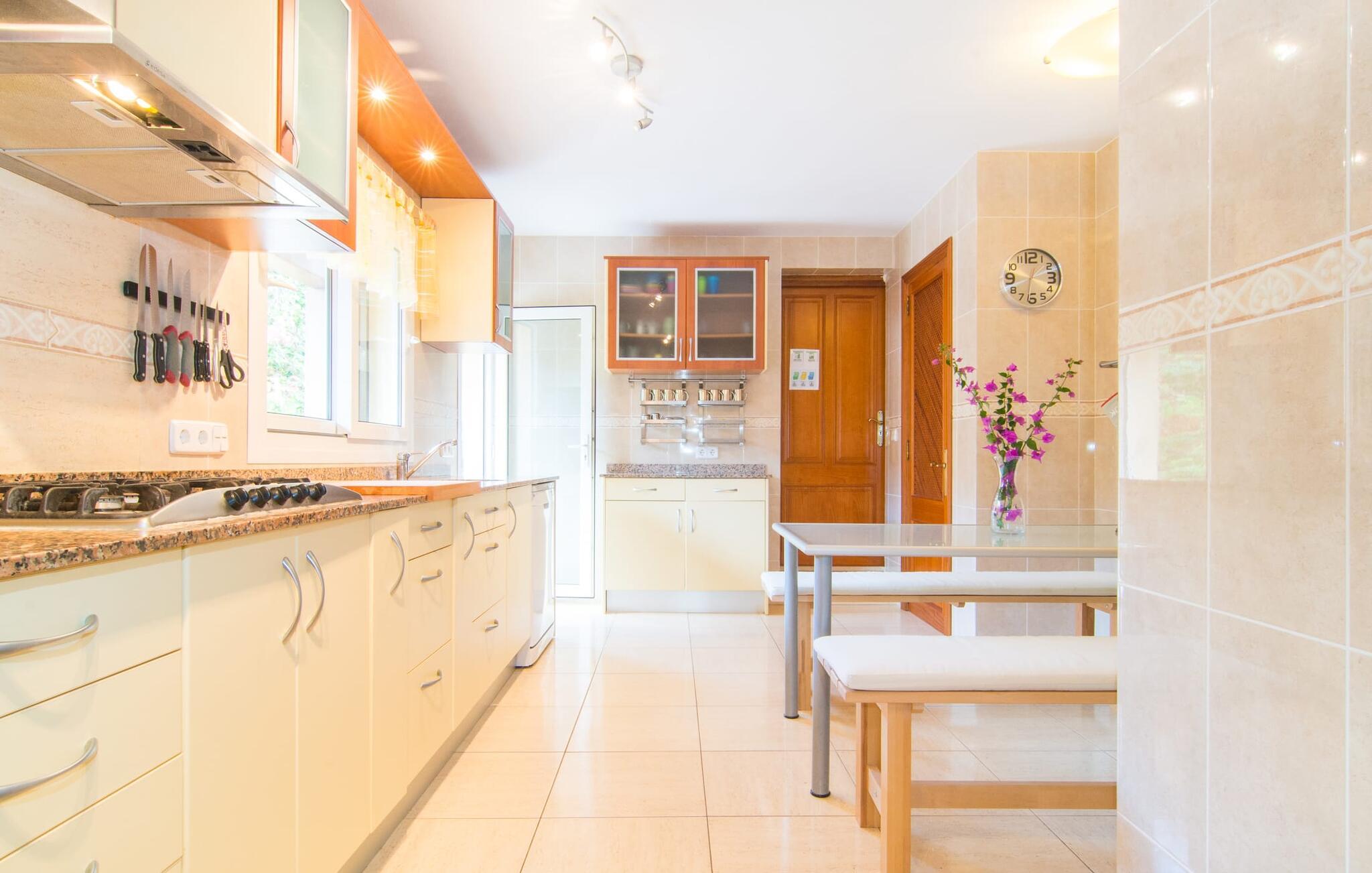 Det er ikke svært at se, hvordan denne villa har fået sit navn: mægtige palmer dominerer denne klart afgrænsede ejendom, dækket af farverig bougainvillea, der giver skygge og privatliv fra nysgerrige øjne. I er måske ikke helt alene i dette boligområde - og gaden er inden for hørevidde - men I kan stadig føle jer ret tryg i jeres eget rum bag den buede port, der stikker ud som en oase af grøn mod stenfacaden på hotellet ved siden af. dør. Sidder I på den overdækkede terrasse eller i haven med et glas rom og kokos, mangler der kun havet for at fuldende den caribiske atmosfære - men måske vil jeres fantasi forvandle den lille pool til et dybblåt hav. Plænen byder på masser af plads til at stille jeres liggestol op på et sted, der passer jer - uanset om I foretrækker, at solen skinner på jeres ansigt eller palmebladene til at blæse jer med kølig luft. I skal heller ikke bekymre jer om røg: Grillen er indbygget i en praktisk station på siden af huset. I kan endda begynde at bide i jeres bøf eller majskolber med det samme, når jeres mund allerede løber i vand for at gøre en stor indsats for at dække bordet. Når I træder ind i huset, er det farverigt, oversvømmet med lys og en smule græsk - nej, I er ikke i det forkerte land, villaen "Palmas" ligger bestemt på Mallorca. I stueetagen giver jordbærrøde cantilever-stole ved pejsen og komfortable lædersofaer rundt om fjernsynet et stærkt farvespring mod hvide voilegardiner. Søjler fungerer som subtile rumdelere, og en stenmosaikvæg danner baggrunden for den indbydende spiseplads. Denne blanding af stilarter emmer af middelhavsild og sikrer samtidig et moderne look. Køkkenet er også fremragende udstyret og moderne: det perfekte sted til jeres morgenkaffe eller til en snak med kokken, mens han/hun rører i gryderne. En indvendig trappe (eller den udvendige trappe for natugler) fører til de tre soveværelser på første sal, nogle med udgang til balkonterrassen. Der er et fjerde soveværelse i stueetagen. I vil blive glad for at vide, at alle soveværelser har deres eget badeværelse. Et ekstra gæstetoilet sikrer størst mulig privatliv. To af soveværelserne har også en ekstra seng, velegnet til børn. Og nu hvor I har set Villa Palmas, når det er bedst, er I klar til at udforske den mørkere side af øen. Regionen omkring Cales de Mallorca er rig på huler, de fleste på øen, og byder på adskillige muligheder for at gå i smuglernes og piraters fodspor; Cova des Pirata, Cova des Pont og de oplyste grotter i Coves dels Hams vil lade jeres børns fantasi løbe løbsk. Østkystens berømte klippebugter og badebugter venter også på at blive erobret; Vær forberedt – adgang er ikke altid let! Og hvis alt dette er for meget for jer, inviterer den charmerende lille havneby Portocolom med sine smalle gader, caféer, fiskerestauranter og en bred allé af plataner jer til at slappe af og slappe af. Selv et langsommere tempo kan være et eventyr! Når I når Manacor, er I næsten der. Sigt efter et punkt halvvejs mellem kystbyerne Portocolom og Porto Cristo, tag mod den lille ferieby Calas (eller Cales) de Mallorca og se efter nogle høje palmer. Så I kan ikke gå glip af “Palmas”-villaen, som ligger på en stille gade nær et hotel. Små sandbugter ligger langs kysten som en perlerække, mens der inde i landet mod Felanitx er en forsmag på det mere stille og mere traditionelle øst for Mallorca.