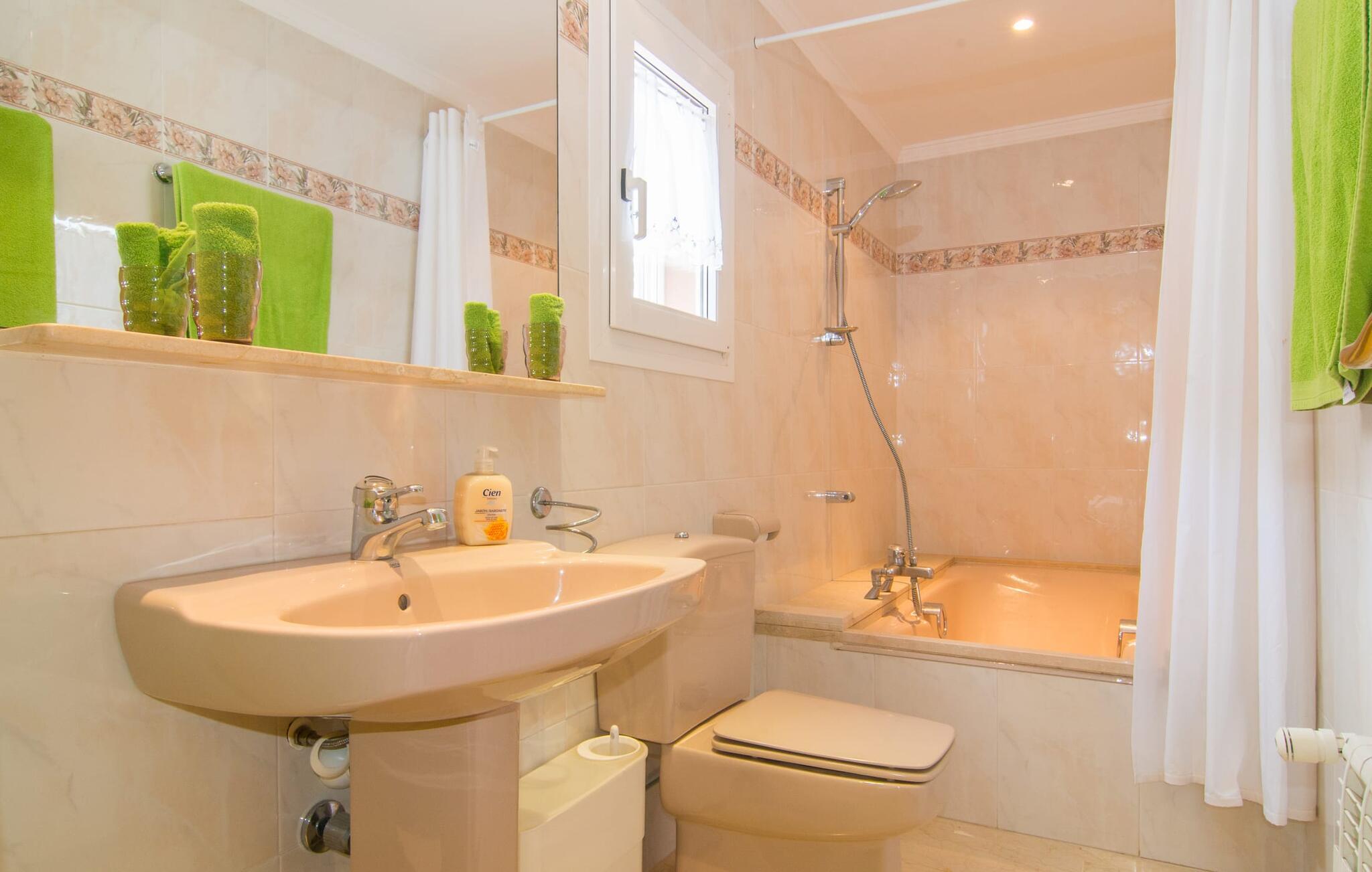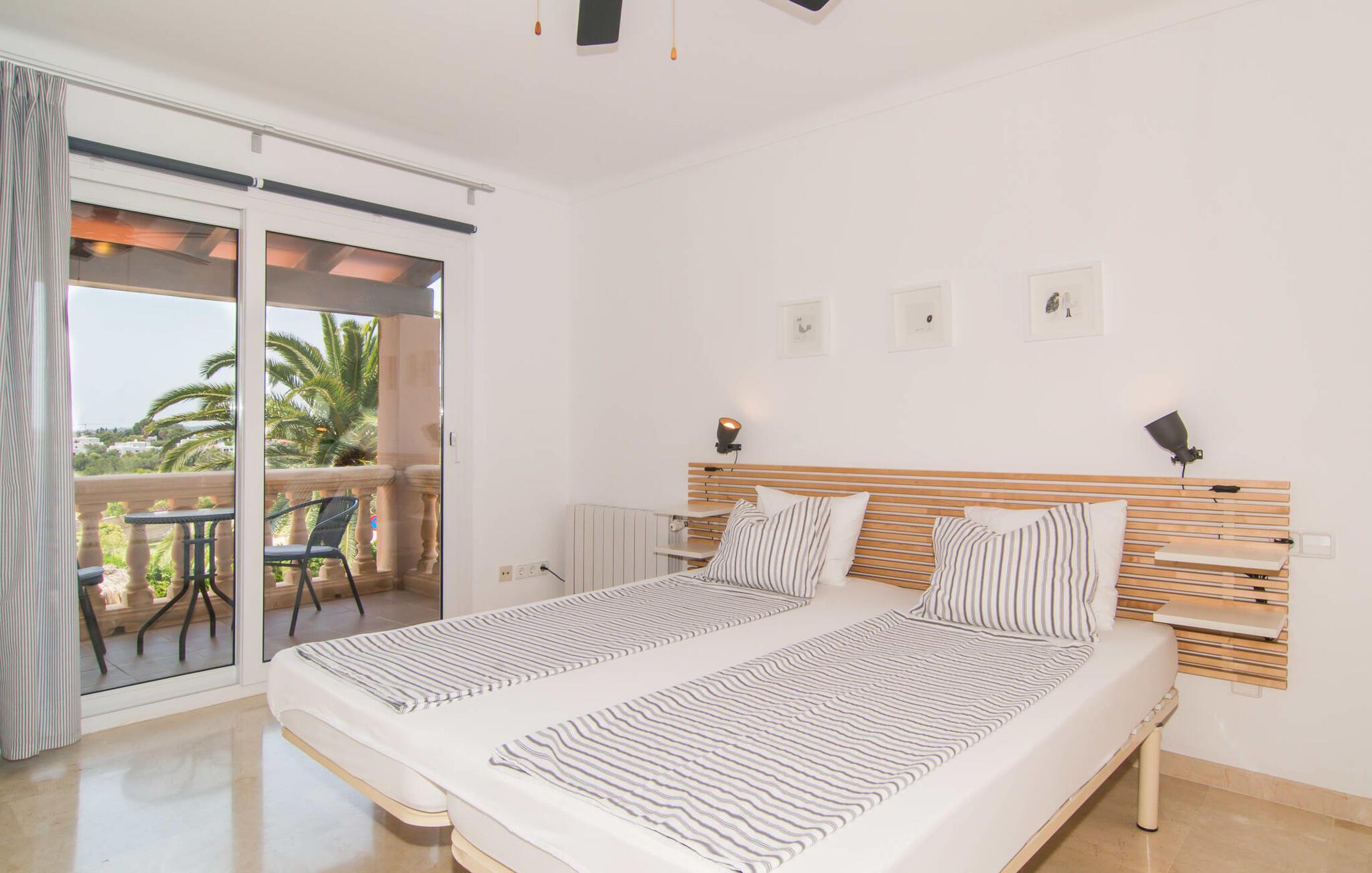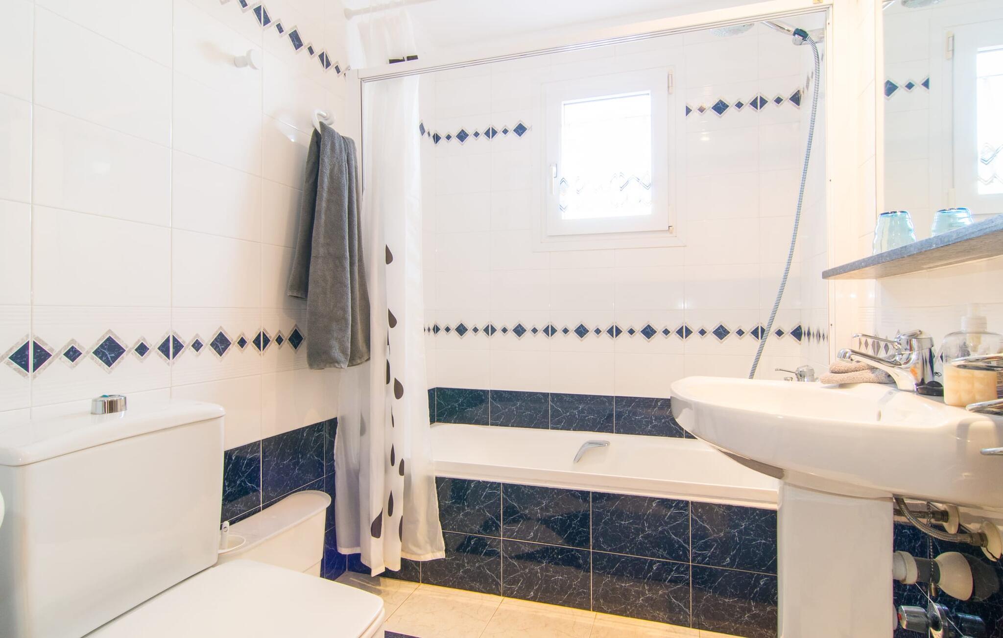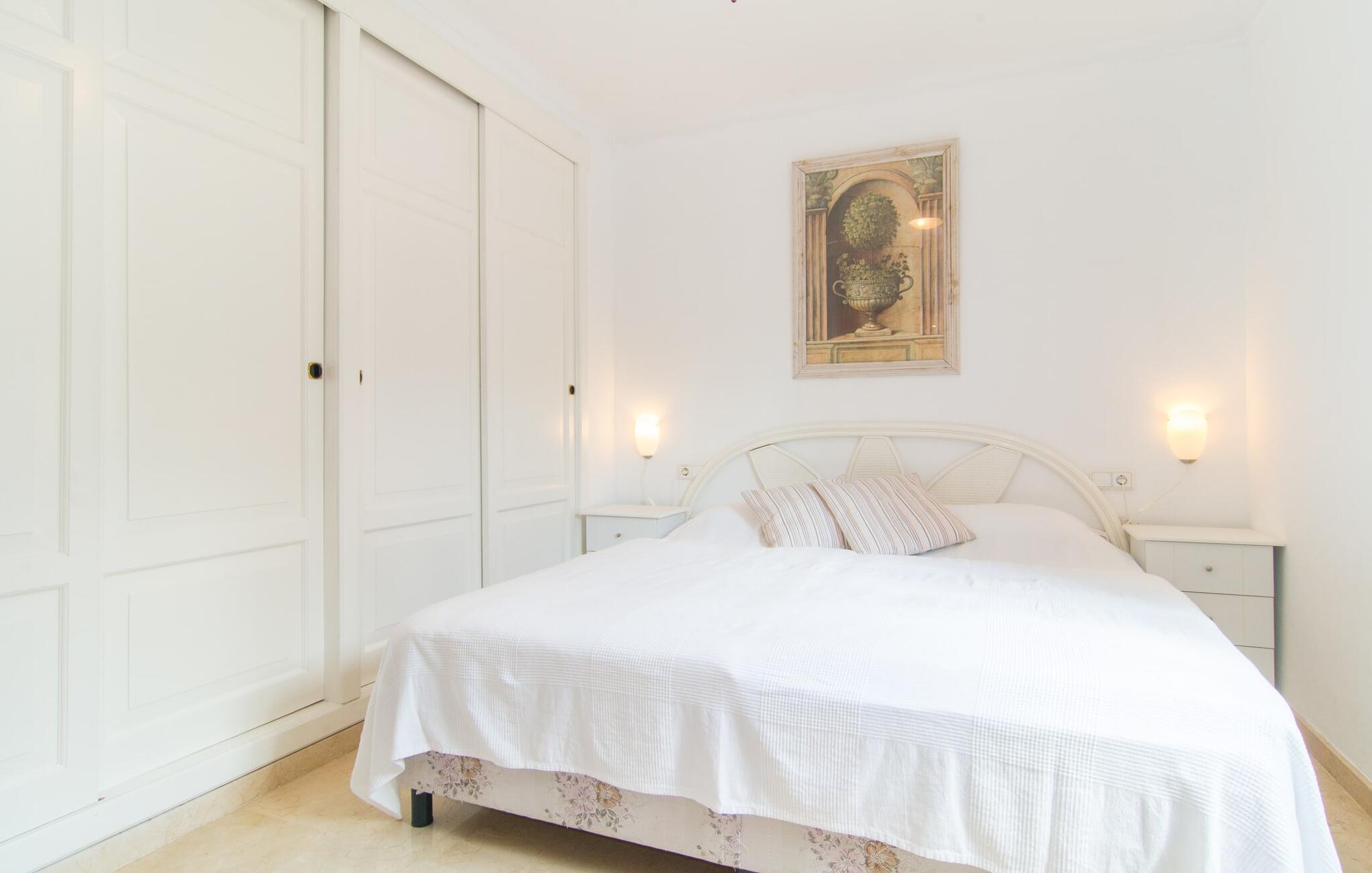 Det er ikke svært at se, hvordan denne villa har fået sit navn: mægtige palmer dominerer denne klart afgrænsede ejendom, dækket af farverig bougainvillea, der giver skygge og privatliv fra nysgerrige øjne. I er måske ikke helt alene i dette boligområde - og gaden er inden for hørevidde - men I kan stadig føle jer ret tryg i jeres eget rum bag den buede port, der stikker ud som en oase af grøn mod stenfacaden på hotellet ved siden af. dør. Sidder I på den overdækkede terrasse eller i haven med et glas rom og kokos, mangler der kun havet for at fuldende den caribiske atmosfære - men måske vil jeres fantasi forvandle den lille pool til et dybblåt hav. Plænen byder på masser af plads til at stille jeres liggestol op på et sted, der passer jer - uanset om I foretrækker, at solen skinner på jeres ansigt eller palmebladene til at blæse jer med kølig luft. I skal heller ikke bekymre jer om røg: Grillen er indbygget i en praktisk station på siden af huset. I kan endda begynde at bide i jeres bøf eller majskolber med det samme, når jeres mund allerede løber i vand for at gøre en stor indsats for at dække bordet. Når I træder ind i huset, er det farverigt, oversvømmet med lys og en smule græsk - nej, I er ikke i det forkerte land, villaen "Palmas" ligger bestemt på Mallorca. I stueetagen giver jordbærrøde cantilever-stole ved pejsen og komfortable lædersofaer rundt om fjernsynet et stærkt farvespring mod hvide voilegardiner. Søjler fungerer som subtile rumdelere, og en stenmosaikvæg danner baggrunden for den indbydende spiseplads. Denne blanding af stilarter emmer af middelhavsild og sikrer samtidig et moderne look. Køkkenet er også fremragende udstyret og moderne: det perfekte sted til jeres morgenkaffe eller til en snak med kokken, mens han/hun rører i gryderne. En indvendig trappe (eller den udvendige trappe for natugler) fører til de tre soveværelser på første sal, nogle med udgang til balkonterrassen. Der er et fjerde soveværelse i stueetagen. I vil blive glad for at vide, at alle soveværelser har deres eget badeværelse. Et ekstra gæstetoilet sikrer størst mulig privatliv. To af soveværelserne har også en ekstra seng, velegnet til børn. Og nu hvor I har set Villa Palmas, når det er bedst, er I klar til at udforske den mørkere side af øen. Regionen omkring Cales de Mallorca er rig på huler, de fleste på øen, og byder på adskillige muligheder for at gå i smuglernes og piraters fodspor; Cova des Pirata, Cova des Pont og de oplyste grotter i Coves dels Hams vil lade jeres børns fantasi løbe løbsk. Østkystens berømte klippebugter og badebugter venter også på at blive erobret; Vær forberedt – adgang er ikke altid let! Og hvis alt dette er for meget for jer, inviterer den charmerende lille havneby Portocolom med sine smalle gader, caféer, fiskerestauranter og en bred allé af plataner jer til at slappe af og slappe af. Selv et langsommere tempo kan være et eventyr! Når I når Manacor, er I næsten der. Sigt efter et punkt halvvejs mellem kystbyerne Portocolom og Porto Cristo, tag mod den lille ferieby Calas (eller Cales) de Mallorca og se efter nogle høje palmer. Så I kan ikke gå glip af “Palmas”-villaen, som ligger på en stille gade nær et hotel. Små sandbugter ligger langs kysten som en perlerække, mens der inde i landet mod Felanitx er en forsmag på det mere stille og mere traditionelle øst for Mallorca.